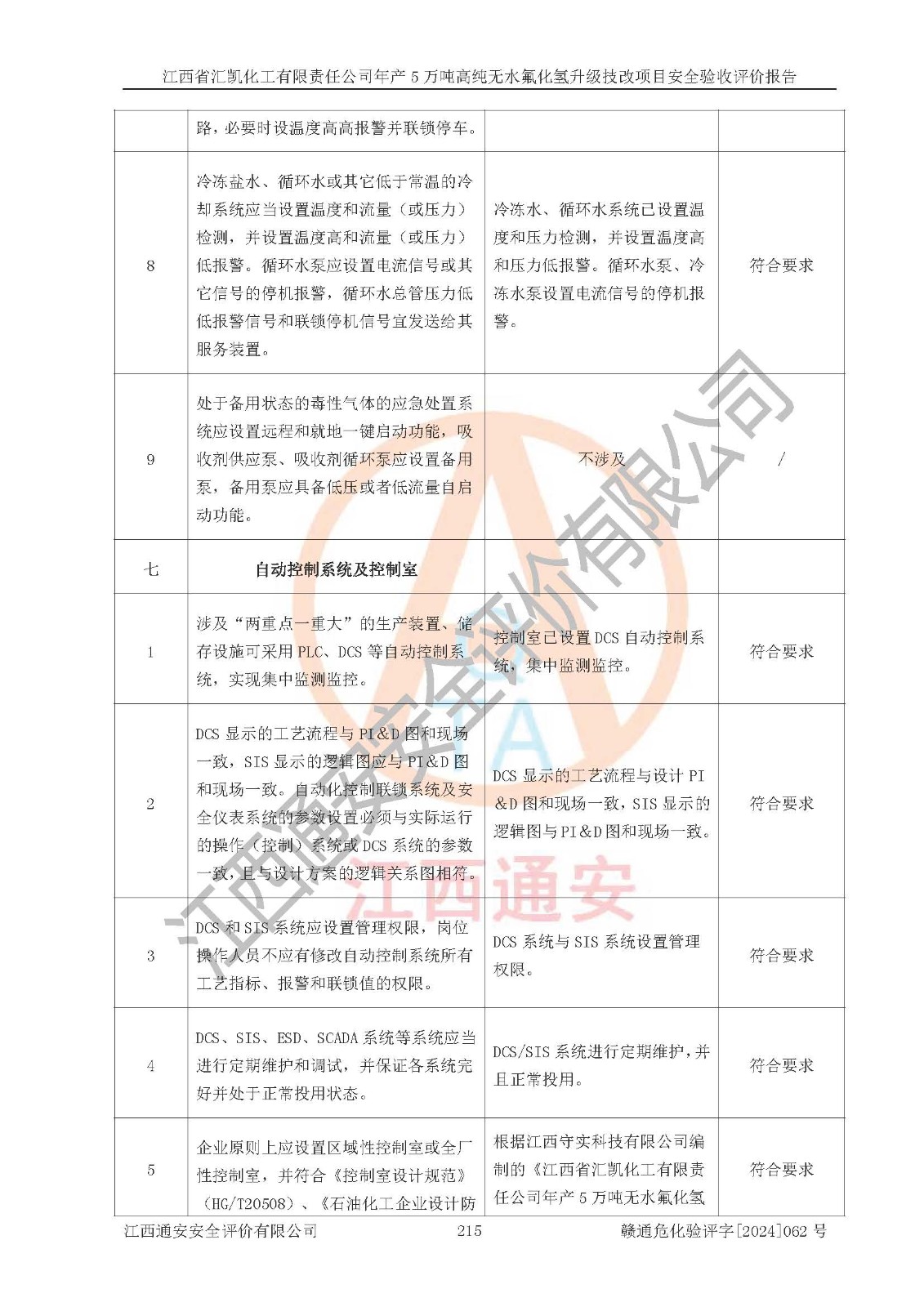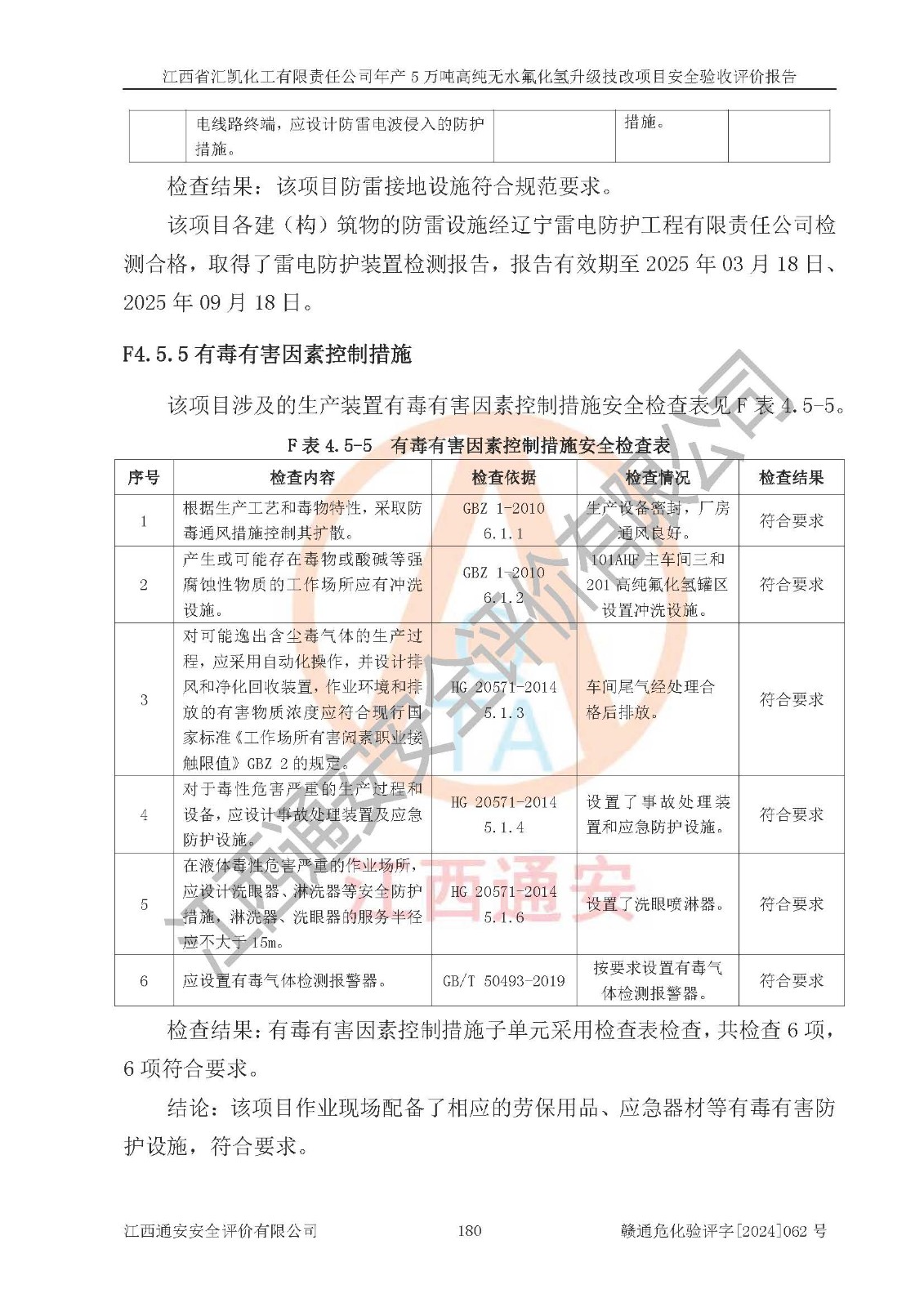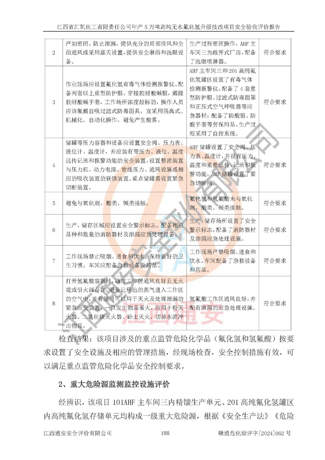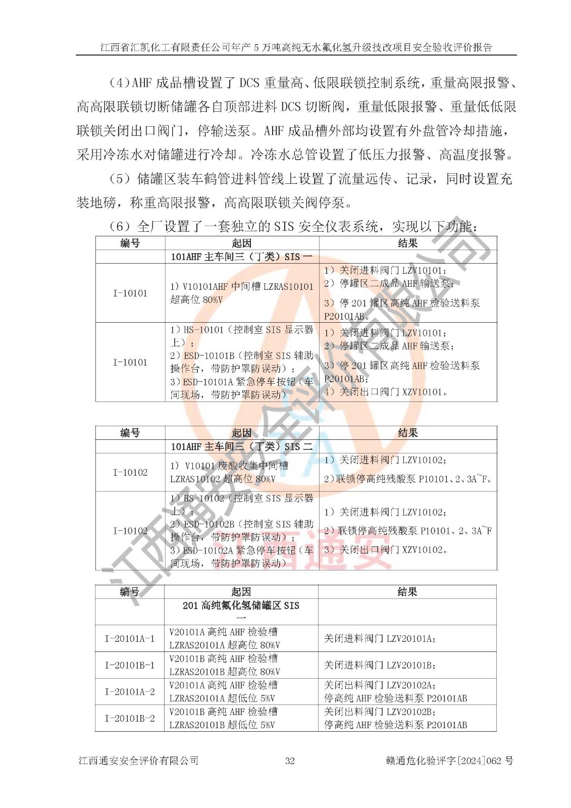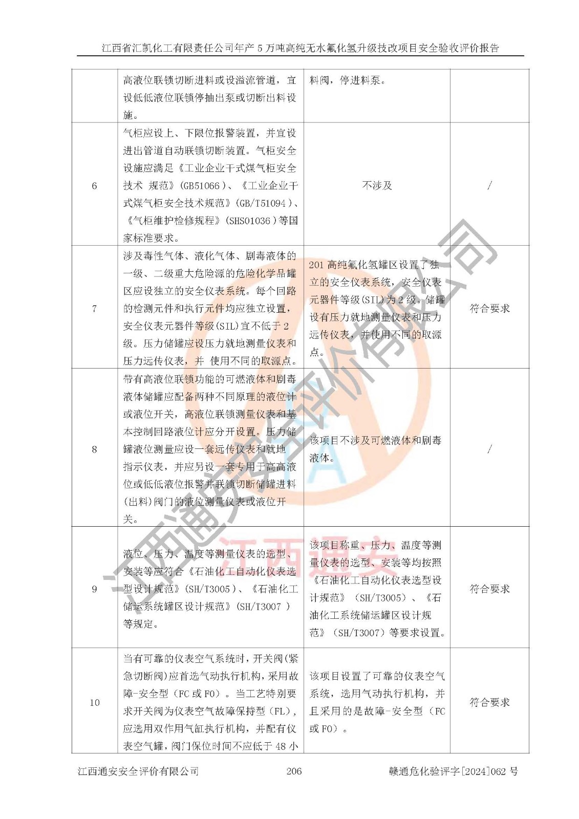 评价结论 | 江西省汇凯化工有限责任公司年产5万吨高纯无水氟化氢升级技改项目现场情况与设计图纸一致,DCS系统和SIS系统符合设计要求、运行正常,主要负责人、安全管理人员等有关从业人员资质符合《江西省危险化学品安全专项整治三年行动实施方案》要求,安全设施及安全管理符合**及有关部门关于安全生产法律、法规、标准的要求,该项目试生产以来,工艺设备运行正常,安全设施和采取的安全技术措施符合设计要求并达到预期结果,可以满足建设项目安全生产的要求,安全生产管理**,具备了安全设施竣工验收条件。 | ||||||