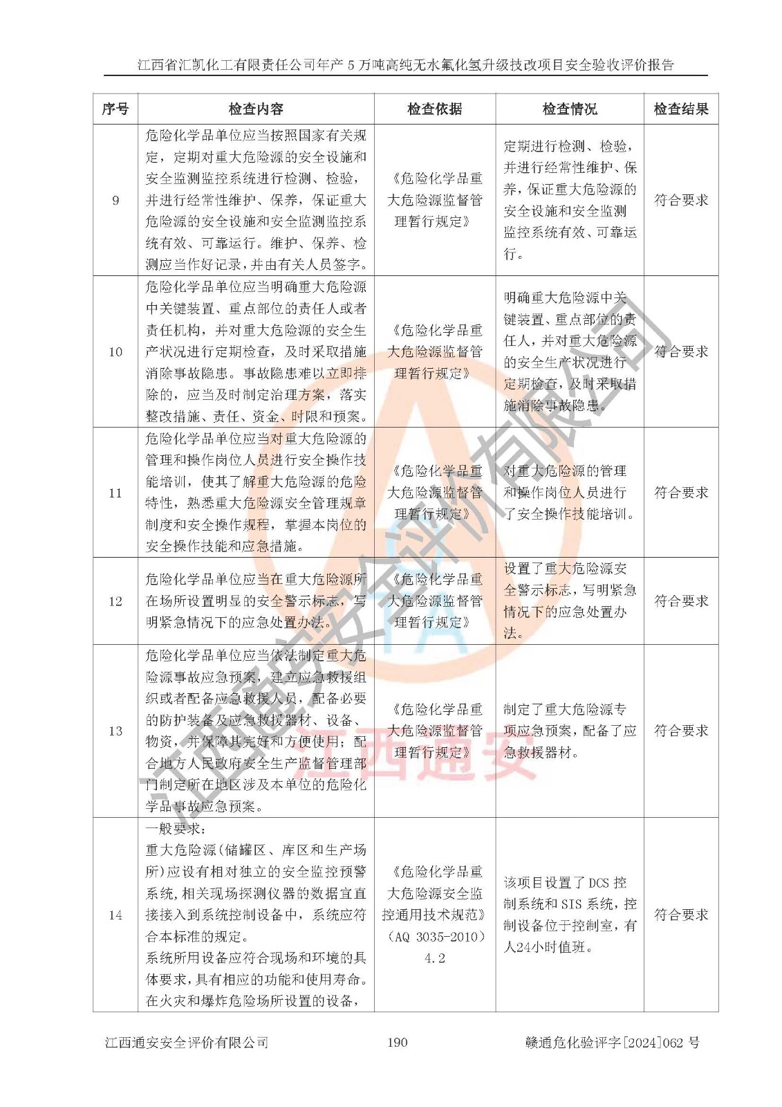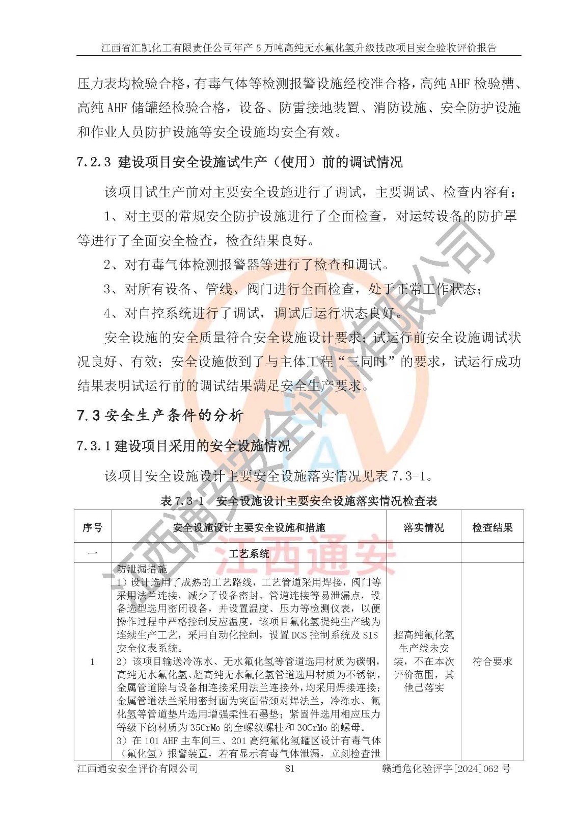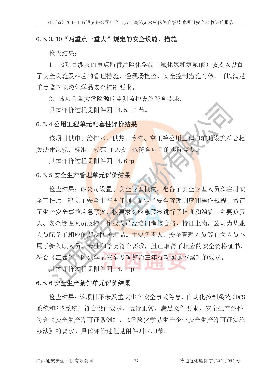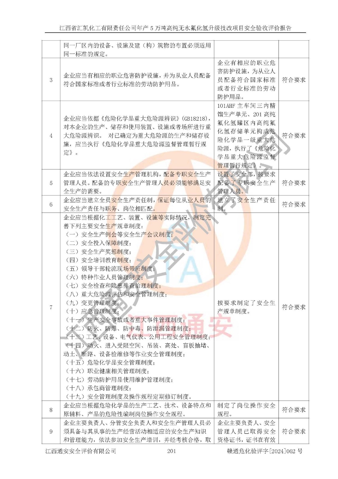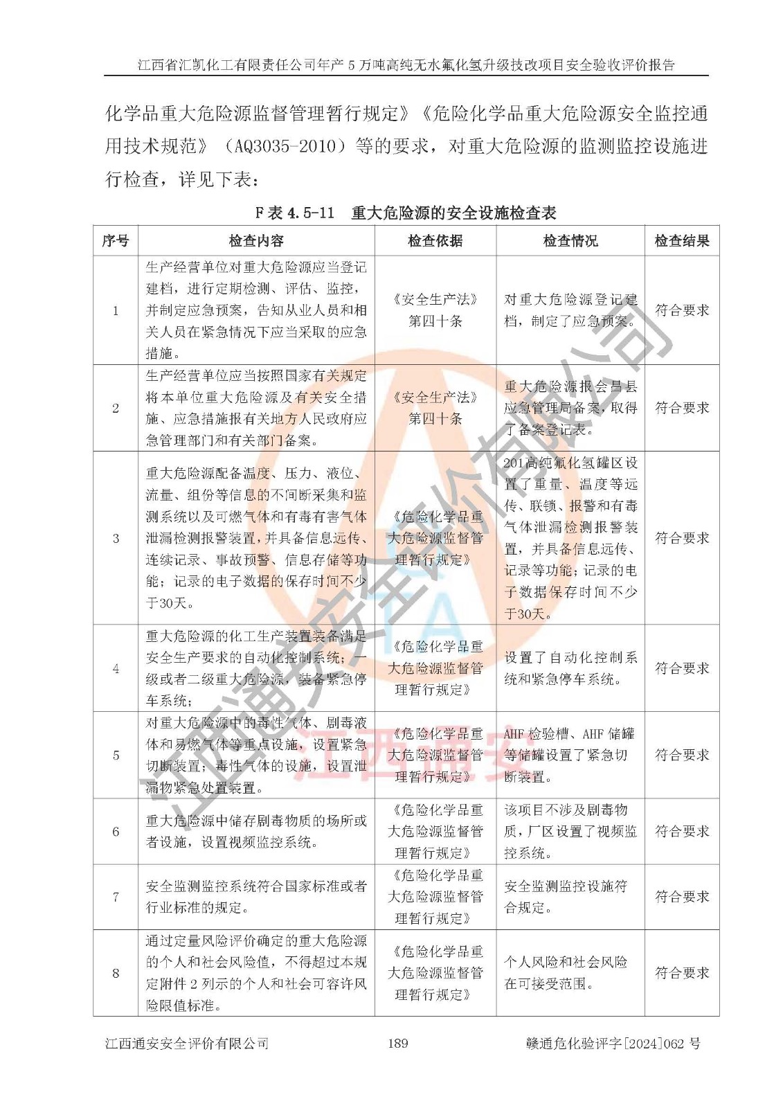 评价结论 | 江西省汇凯化工有限责任公司年产5万吨高纯无水氟化氢升级技改项目现场情况与设计图纸一致,DCS系统和SIS系统符合设计要求、运行正常,主要负责人、安全管理人员等有关从业人员资质符合《江西省危险化学品安全专项整治三年行动实施方案》要求,安全设施及安全管理符合**及有关部门关于安全生产法律、法规、标准的要求,该项目试生产以来,工艺设备运行正常,安全设施和采取的安全技术措施符合设计要求并达到预期结果,可以满足建设项目安全生产的要求,安全生产管理**,具备了安全设施竣工验收条件。 | ||||||