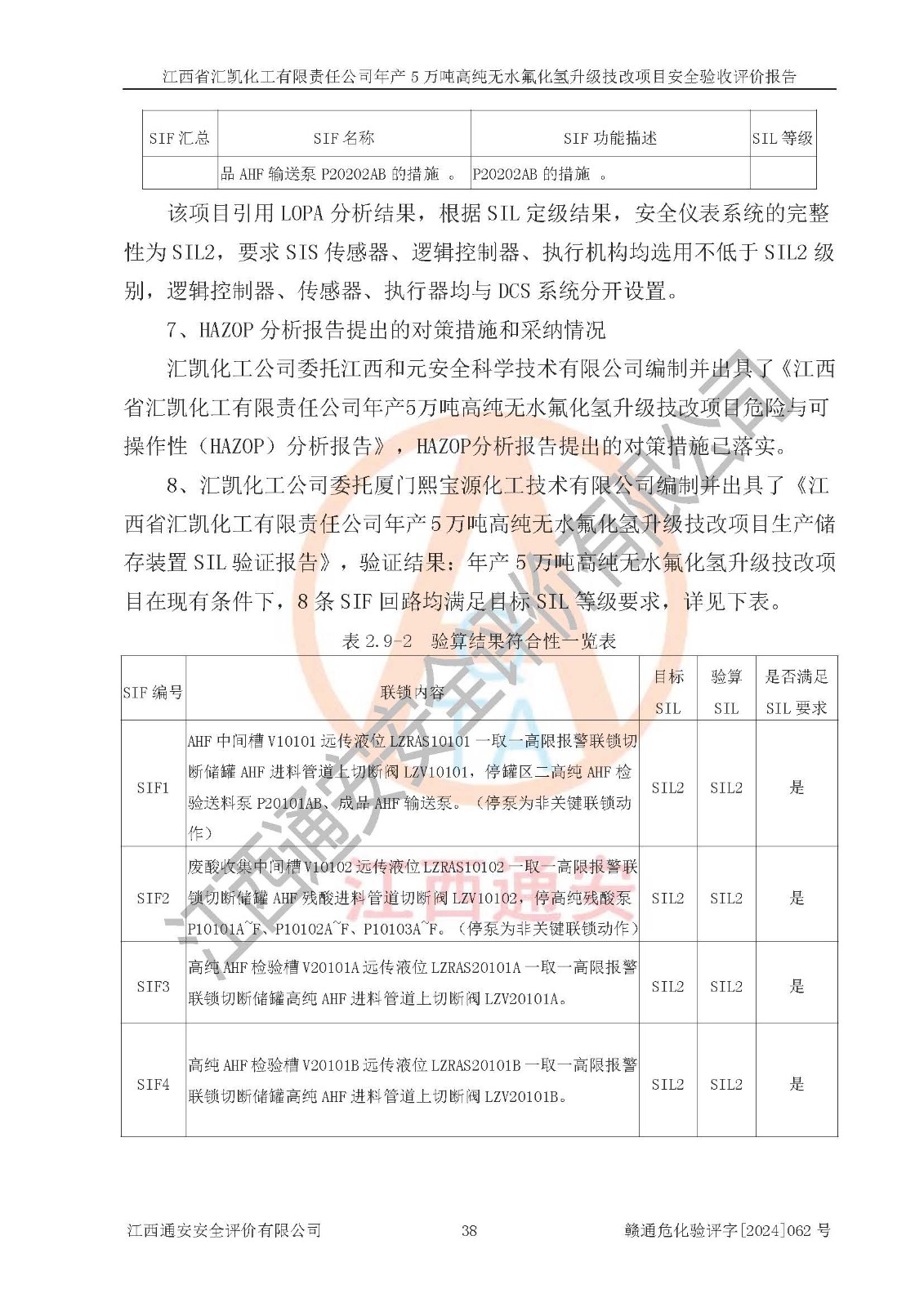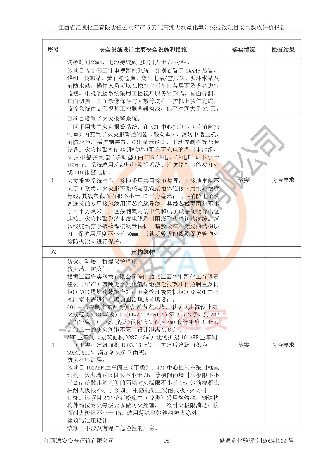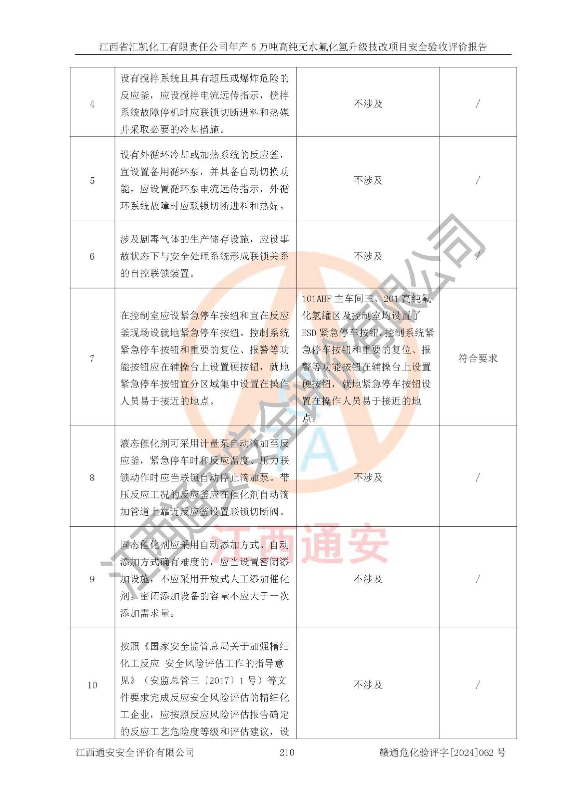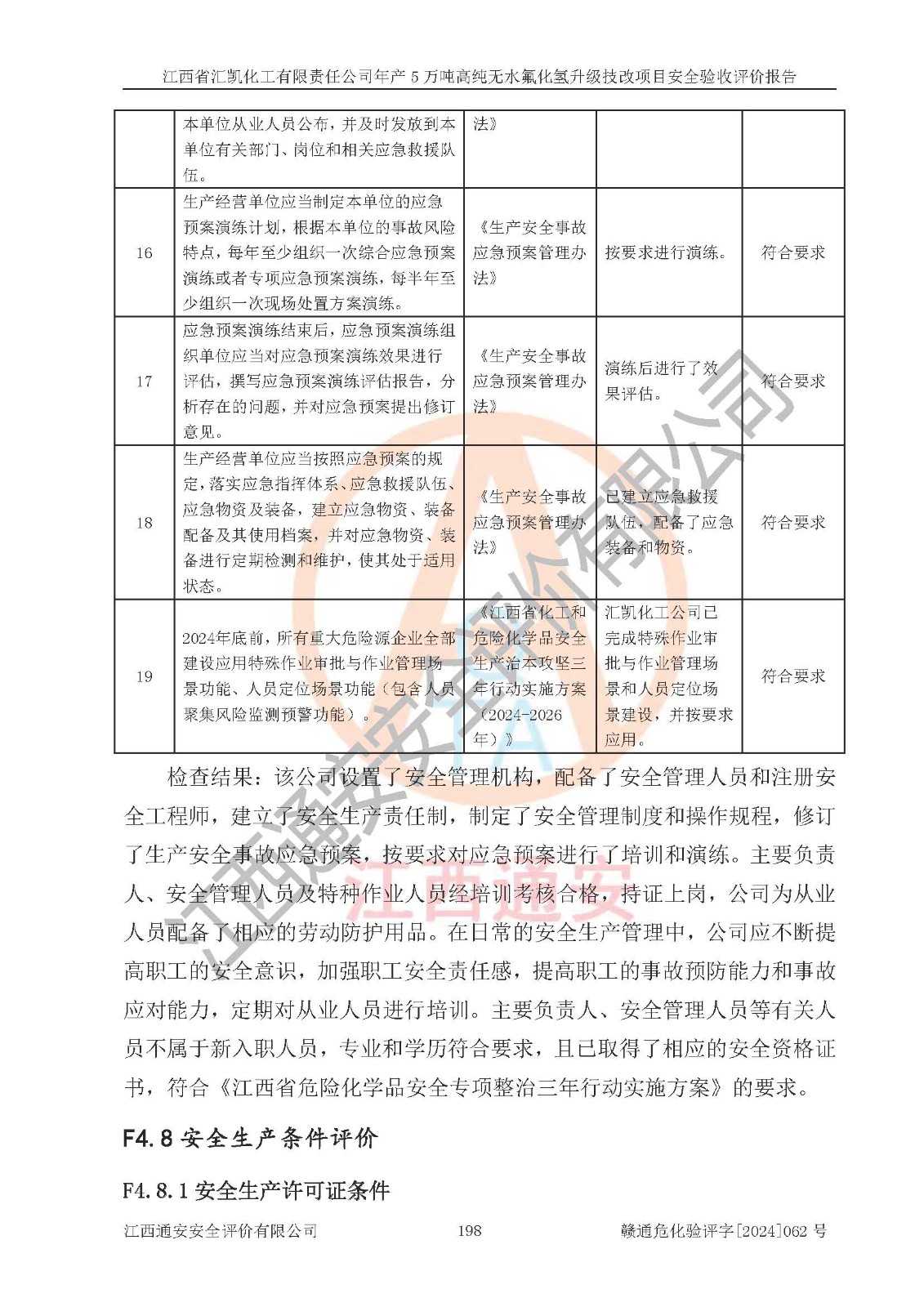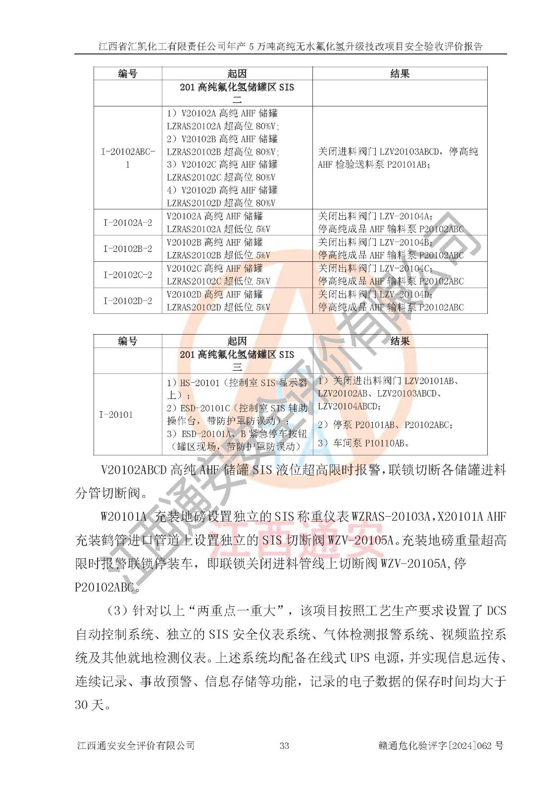 评价结论 | 江西省汇凯化工有限责任公司年产5万吨高纯无水氟化氢升级技改项目现场情况与设计图纸一致,DCS系统和SIS系统符合设计要求、运行正常,主要负责人、安全管理人员等有关从业人员资质符合《江西省危险化学品安全专项整治三年行动实施方案》要求,安全设施及安全管理符合**及有关部门关于安全生产法律、法规、标准的要求,该项目试生产以来,工艺设备运行正常,安全设施和采取的安全技术措施符合设计要求并达到预期结果,可以满足建设项目安全生产的要求,安全生产管理**,具备了安全设施竣工验收条件。 | ||||||