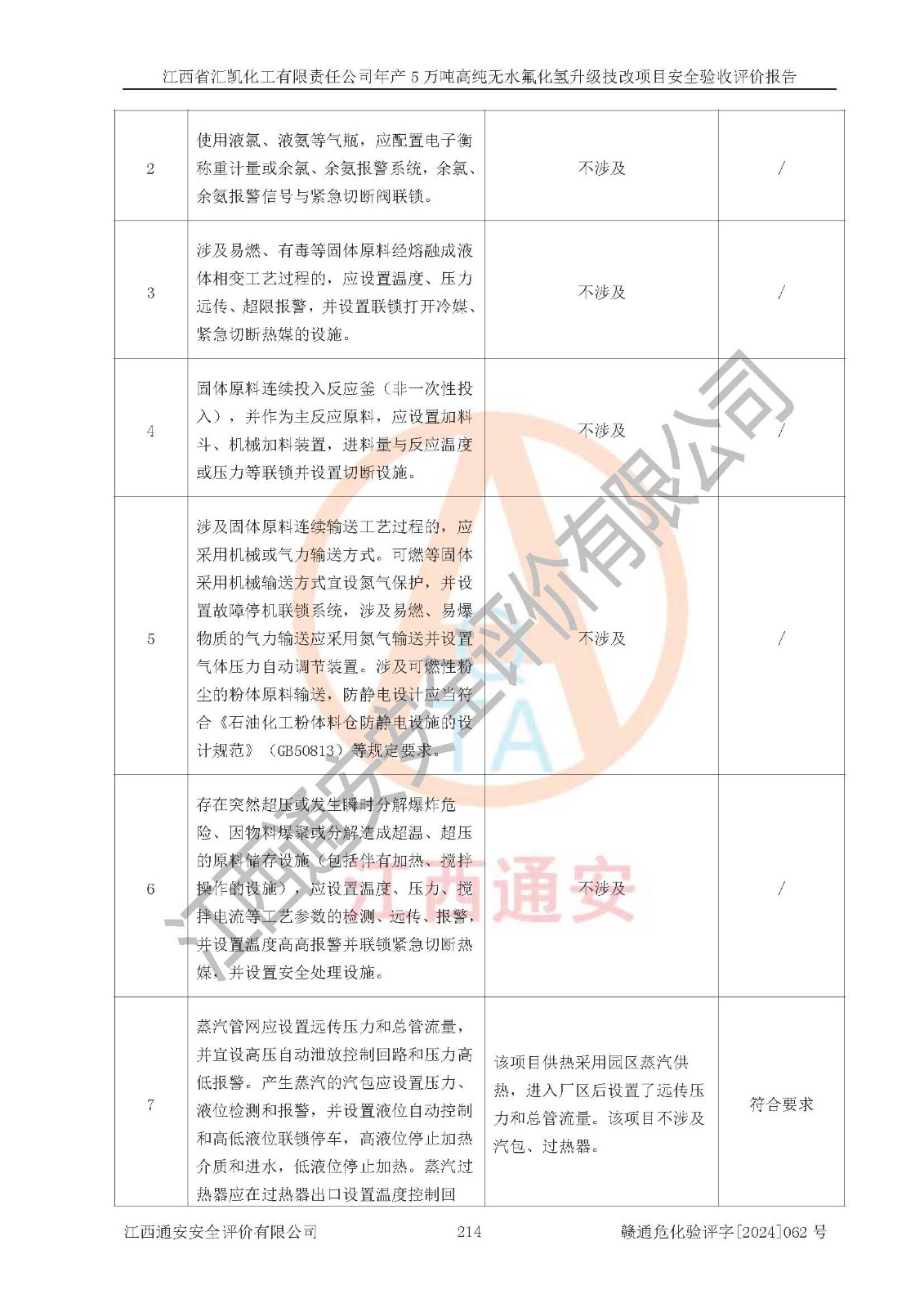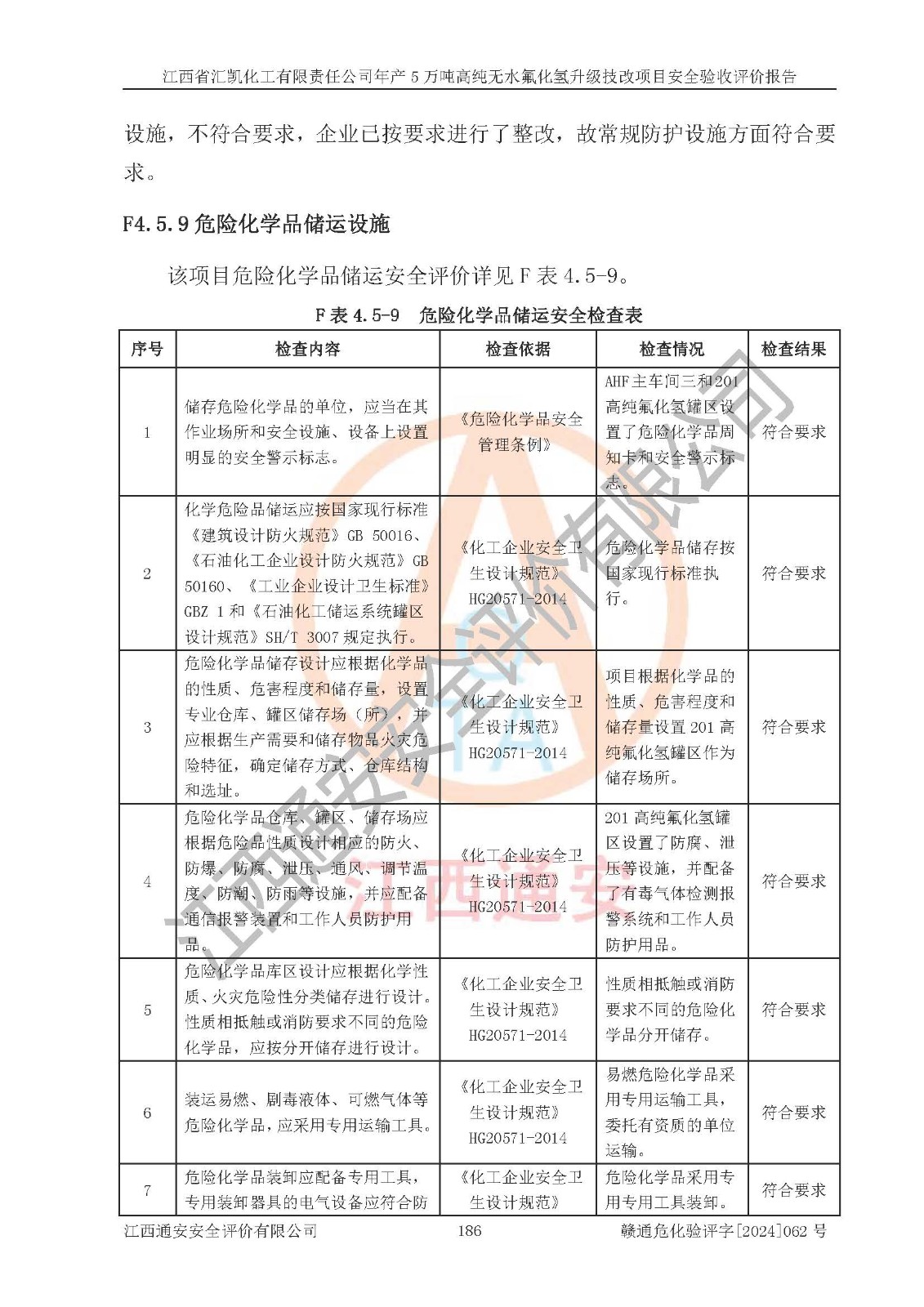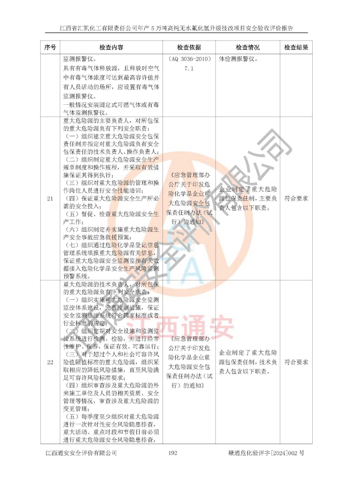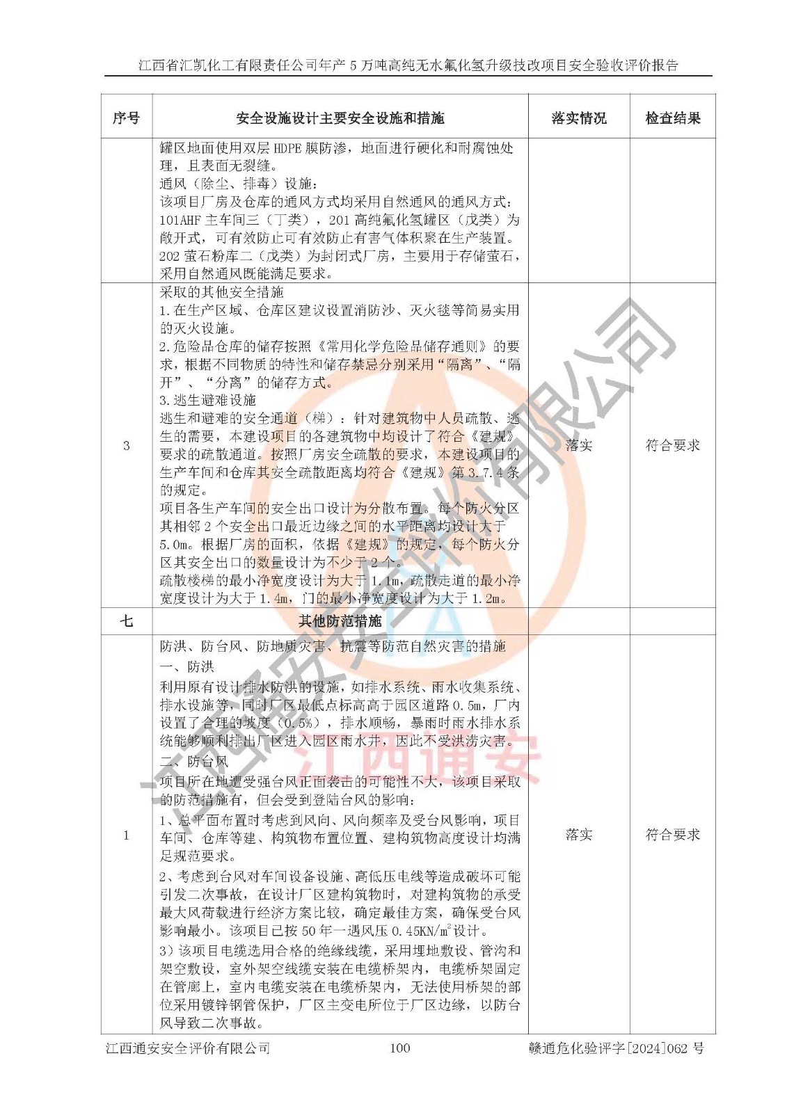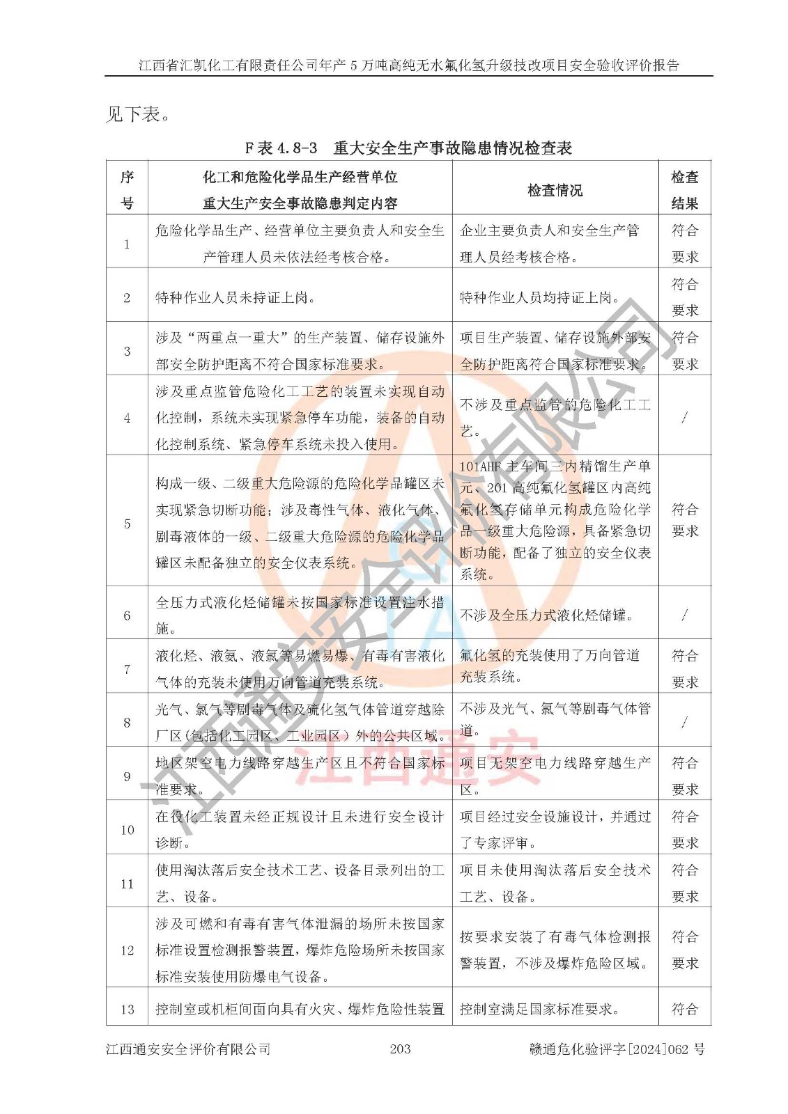 评价结论 | 江西省汇凯化工有限责任公司年产5万吨高纯无水氟化氢升级技改项目现场情况与设计图纸一致,DCS系统和SIS系统符合设计要求、运行正常,主要负责人、安全管理人员等有关从业人员资质符合《江西省危险化学品安全专项整治三年行动实施方案》要求,安全设施及安全管理符合**及有关部门关于安全生产法律、法规、标准的要求,该项目试生产以来,工艺设备运行正常,安全设施和采取的安全技术措施符合设计要求并达到预期结果,可以满足建设项目安全生产的要求,安全生产管理**,具备了安全设施竣工验收条件。 | ||||||
