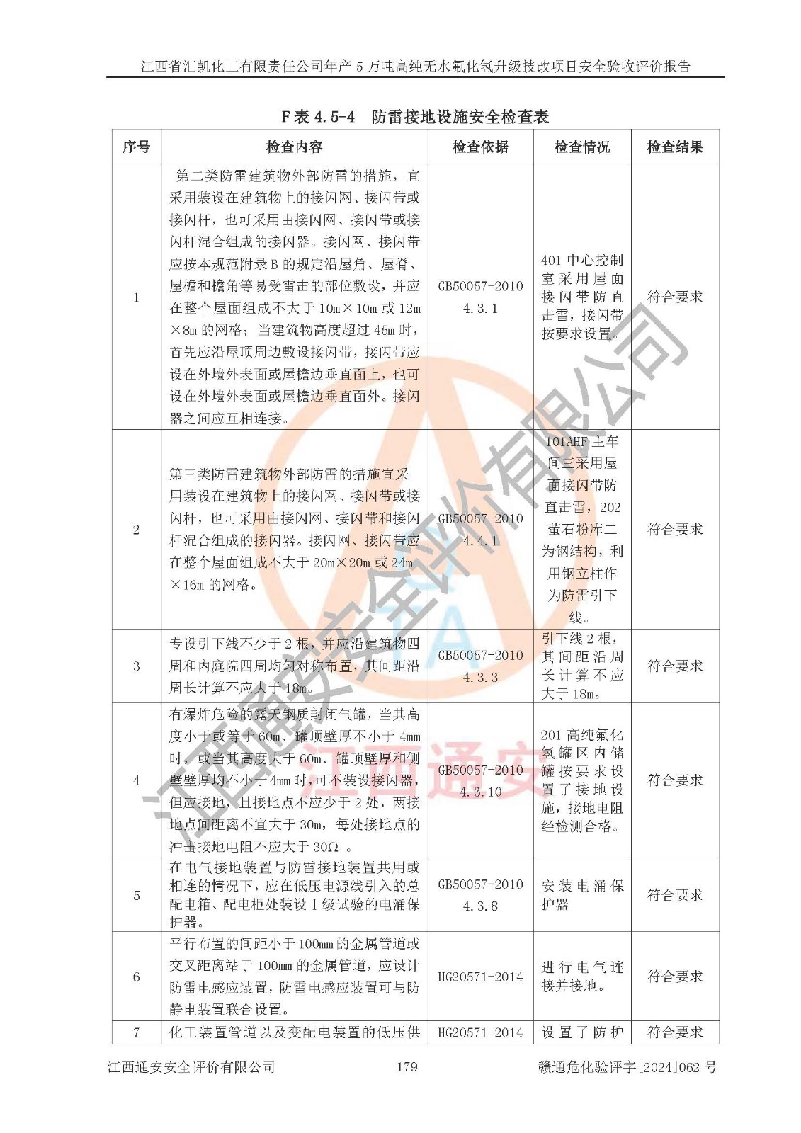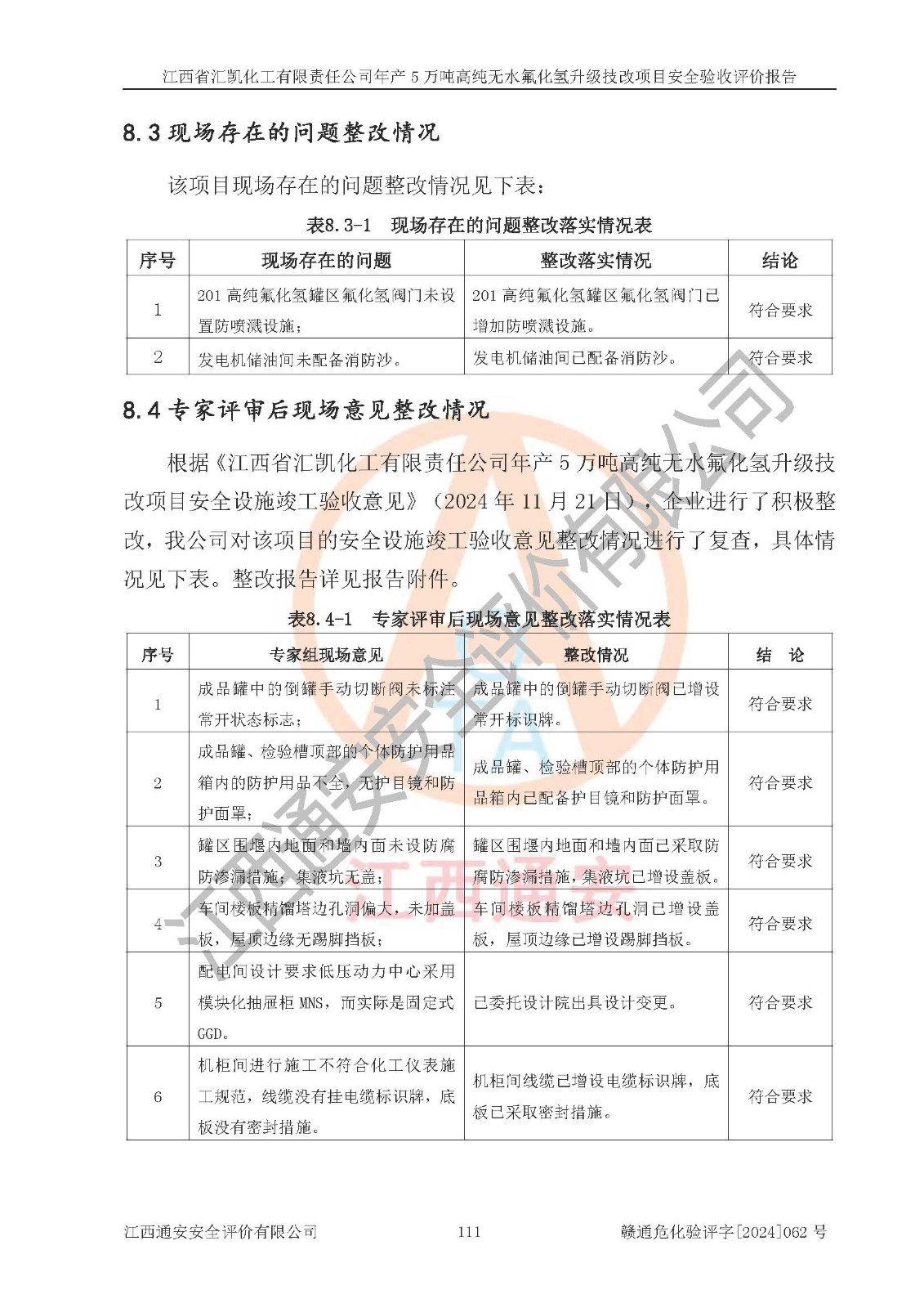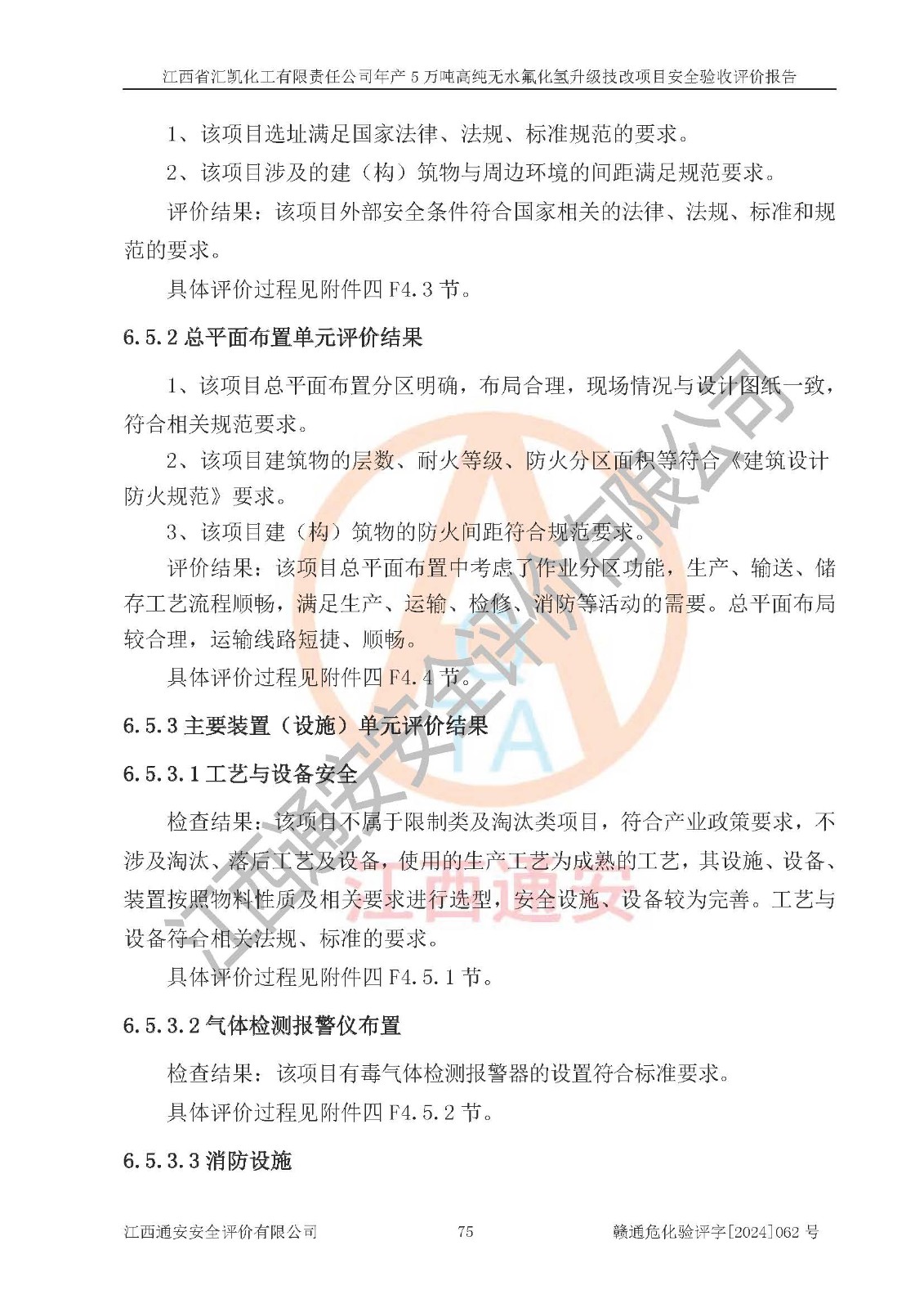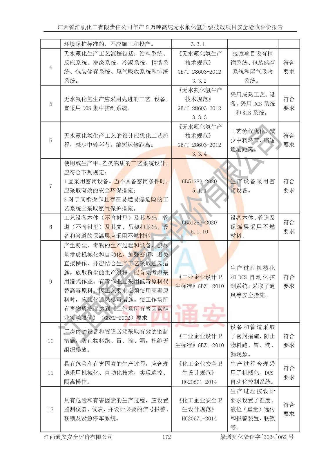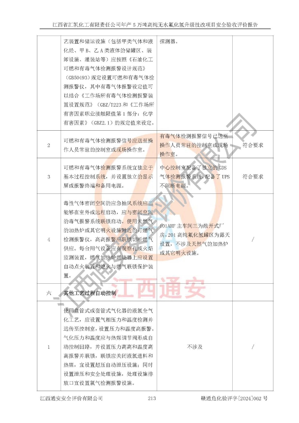 评价结论 | 江西省汇凯化工有限责任公司年产5万吨高纯无水氟化氢升级技改项目现场情况与设计图纸一致,DCS系统和SIS系统符合设计要求、运行正常,主要负责人、安全管理人员等有关从业人员资质符合《江西省危险化学品安全专项整治三年行动实施方案》要求,安全设施及安全管理符合**及有关部门关于安全生产法律、法规、标准的要求,该项目试生产以来,工艺设备运行正常,安全设施和采取的安全技术措施符合设计要求并达到预期结果,可以满足建设项目安全生产的要求,安全生产管理**,具备了安全设施竣工验收条件。 | ||||||