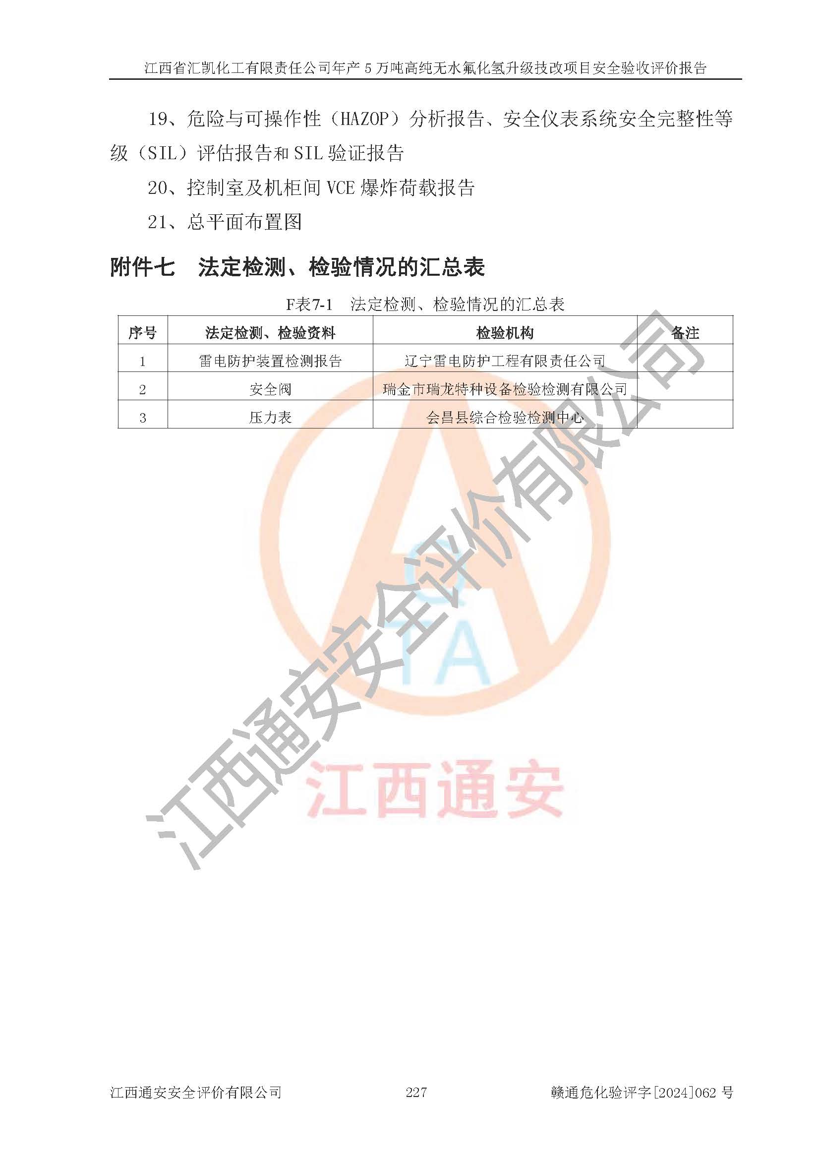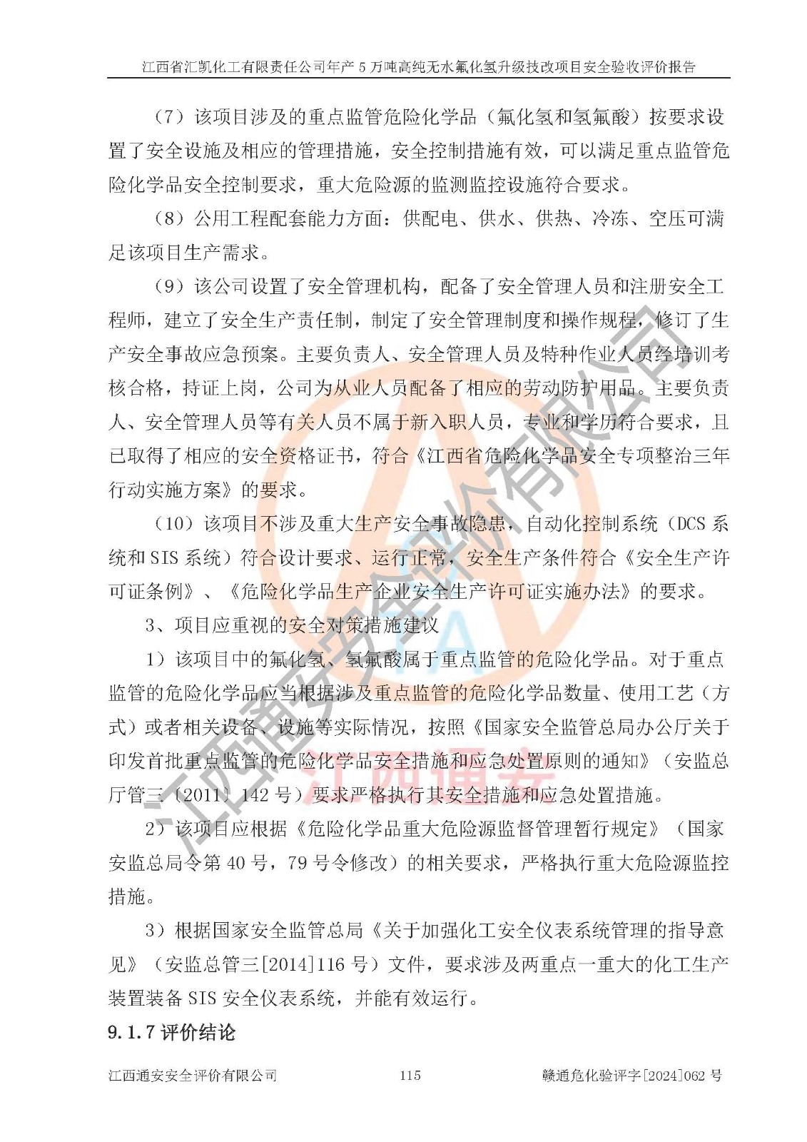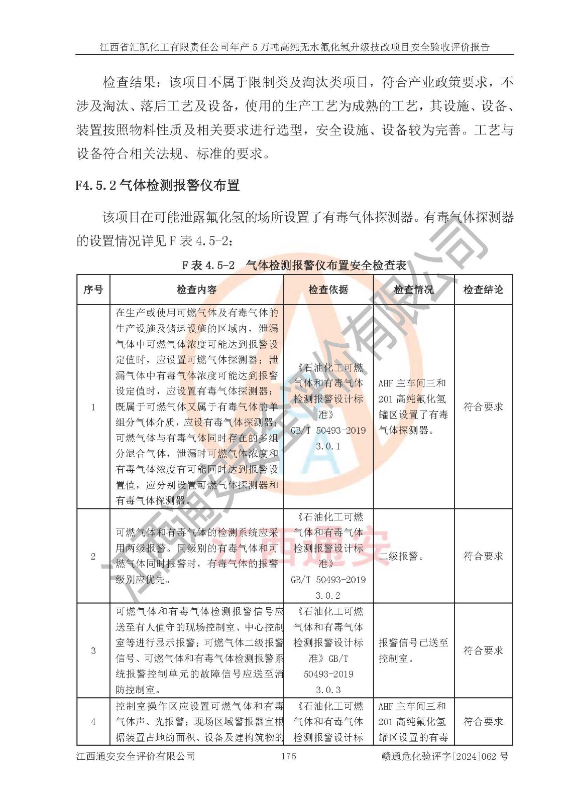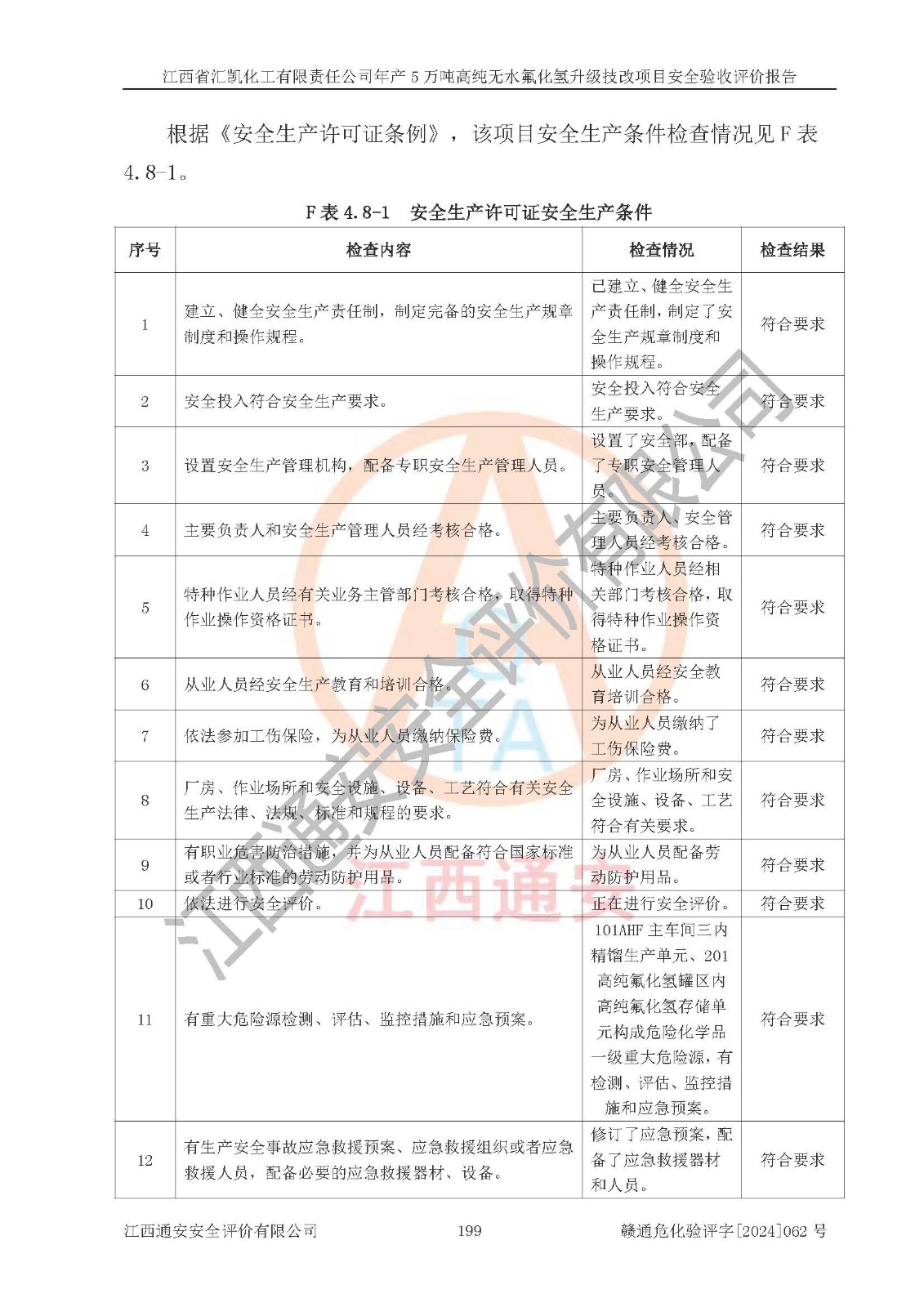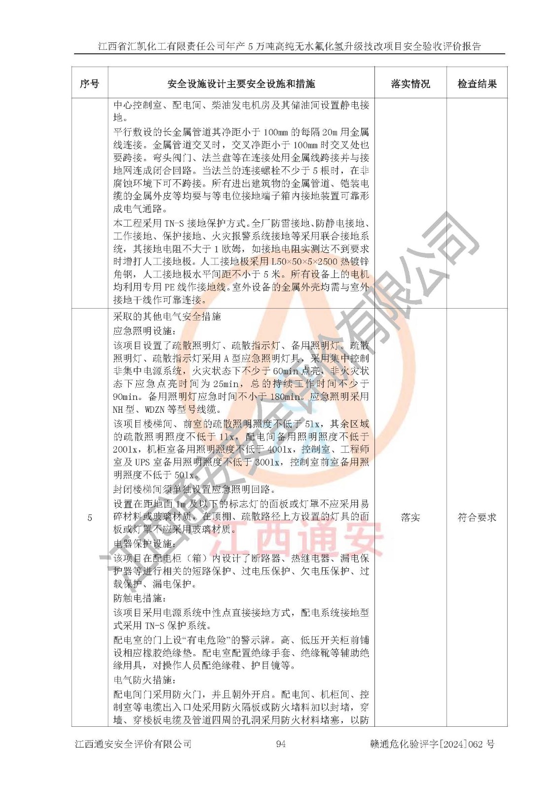 评价结论 | 江西省汇凯化工有限责任公司年产5万吨高纯无水氟化氢升级技改项目现场情况与设计图纸一致,DCS系统和SIS系统符合设计要求、运行正常,主要负责人、安全管理人员等有关从业人员资质符合《江西省危险化学品安全专项整治三年行动实施方案》要求,安全设施及安全管理符合**及有关部门关于安全生产法律、法规、标准的要求,该项目试生产以来,工艺设备运行正常,安全设施和采取的安全技术措施符合设计要求并达到预期结果,可以满足建设项目安全生产的要求,安全生产管理**,具备了安全设施竣工验收条件。 | ||||||