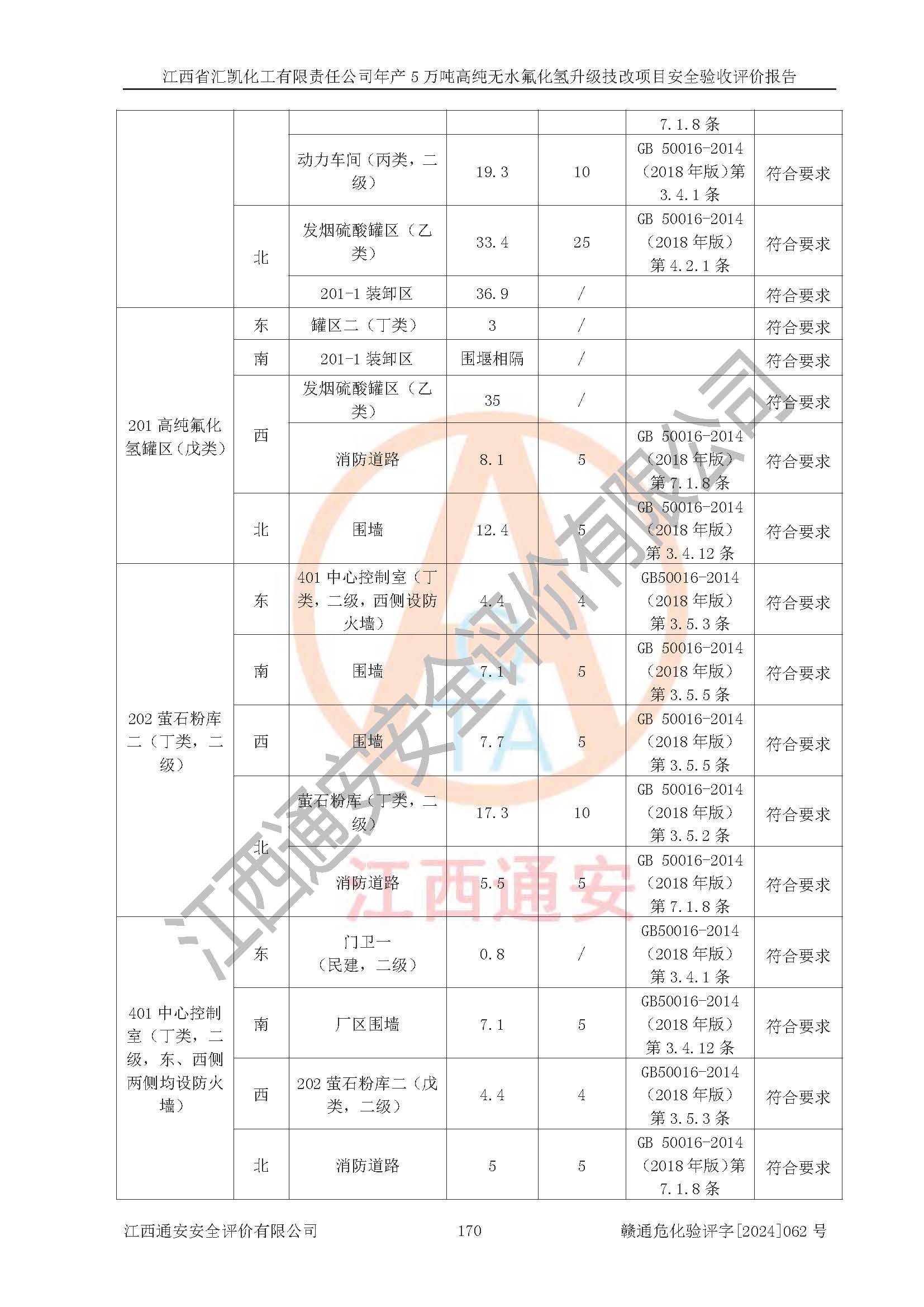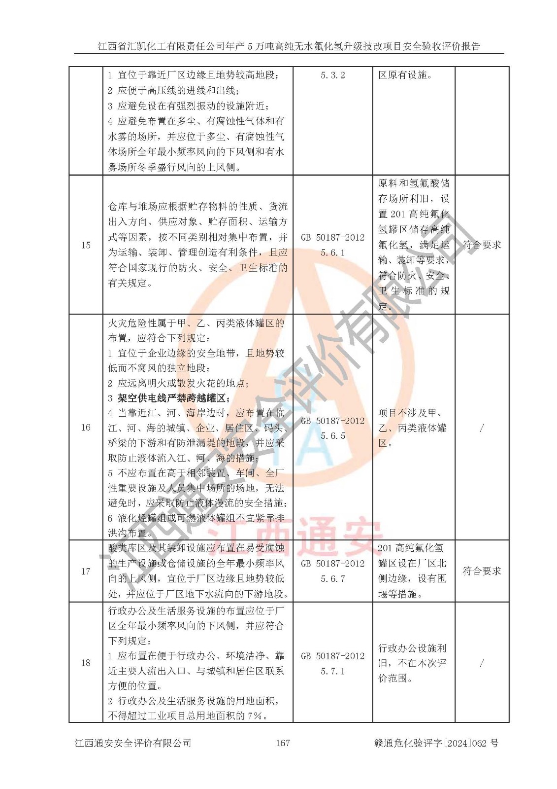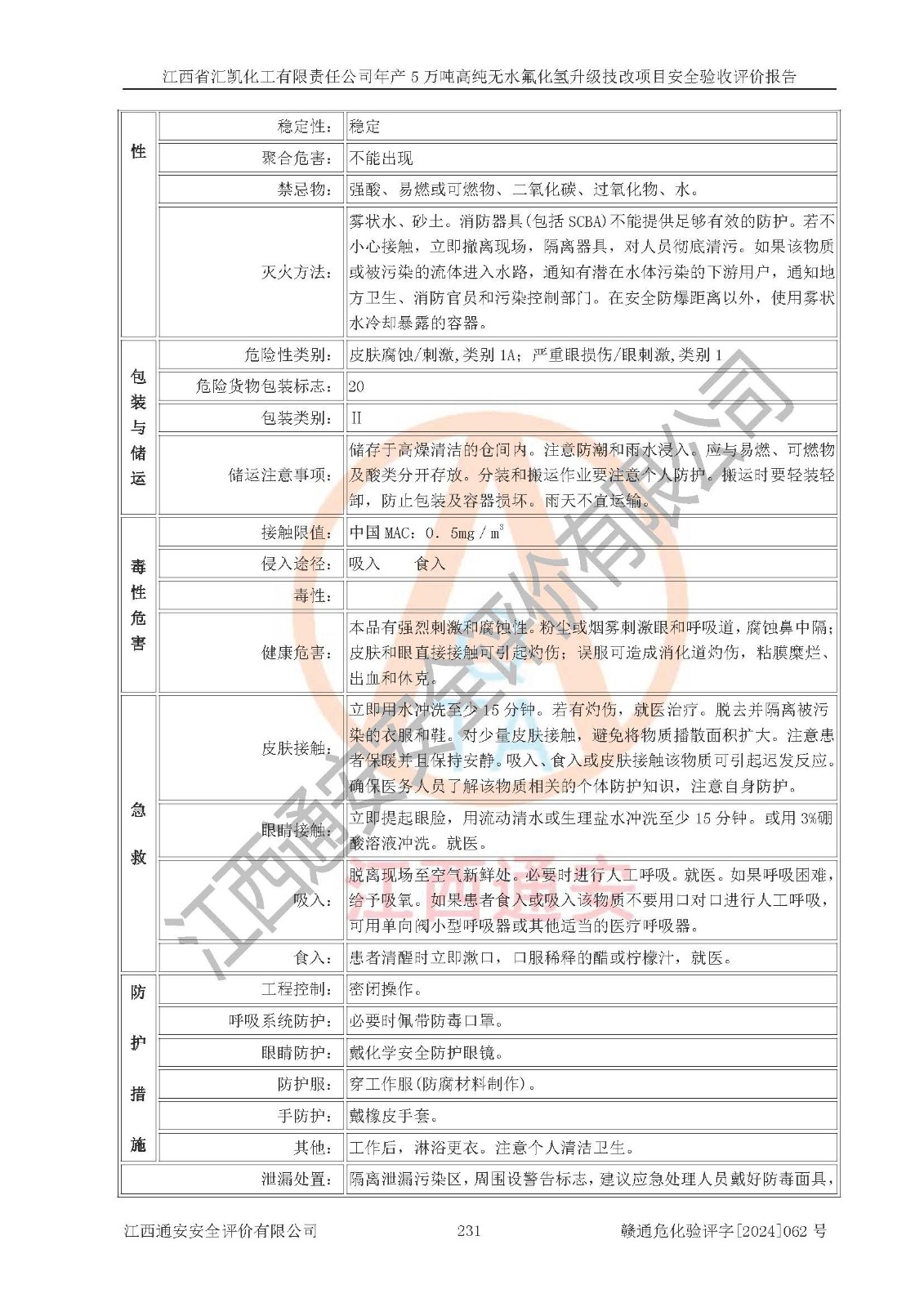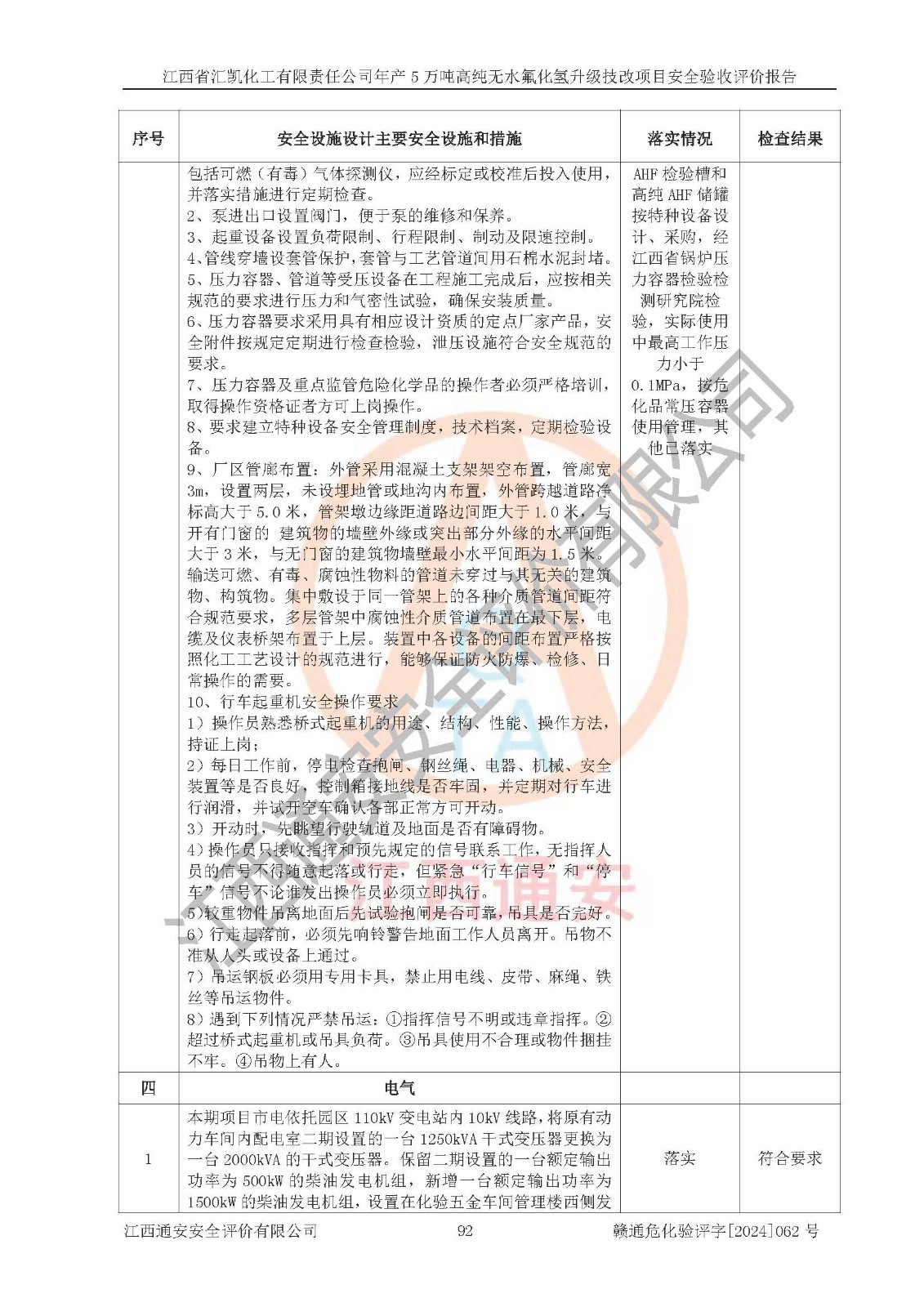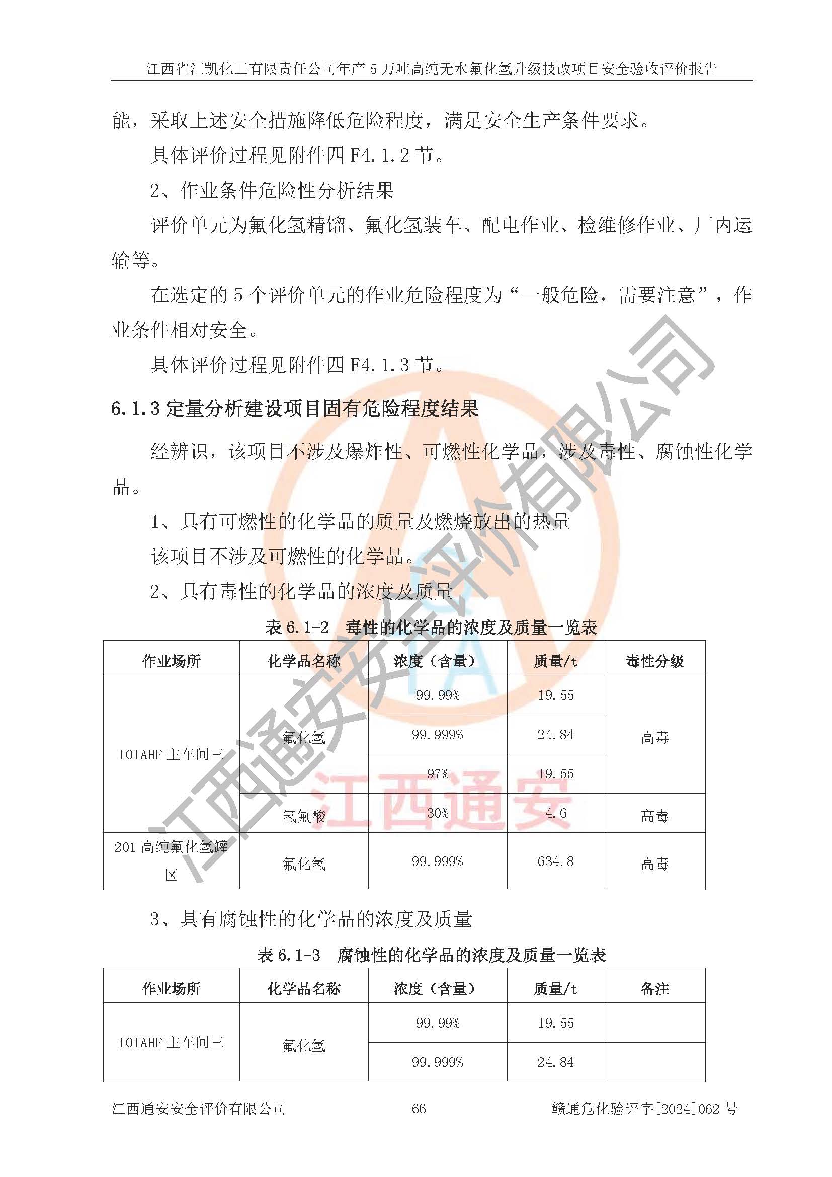 评价结论 | 江西省汇凯化工有限责任公司年产5万吨高纯无水氟化氢升级技改项目现场情况与设计图纸一致,DCS系统和SIS系统符合设计要求、运行正常,主要负责人、安全管理人员等有关从业人员资质符合《江西省危险化学品安全专项整治三年行动实施方案》要求,安全设施及安全管理符合**及有关部门关于安全生产法律、法规、标准的要求,该项目试生产以来,工艺设备运行正常,安全设施和采取的安全技术措施符合设计要求并达到预期结果,可以满足建设项目安全生产的要求,安全生产管理**,具备了安全设施竣工验收条件。 | ||||||