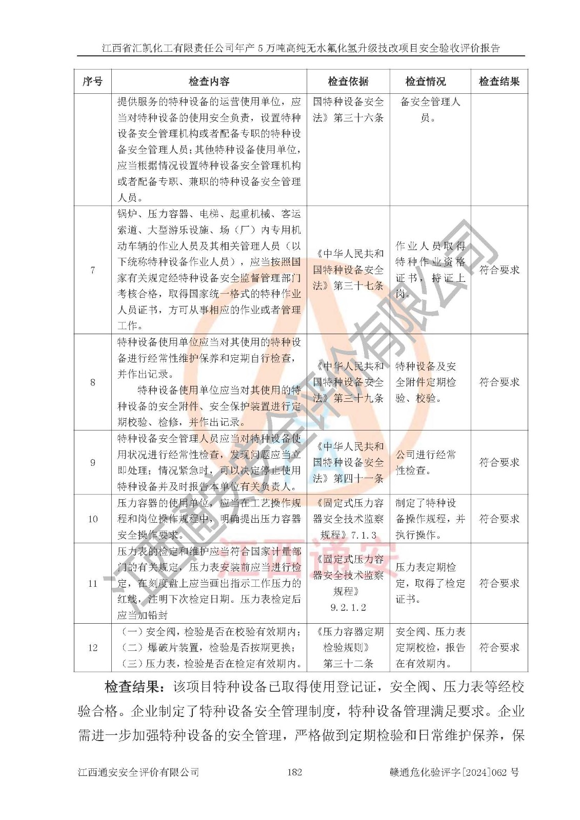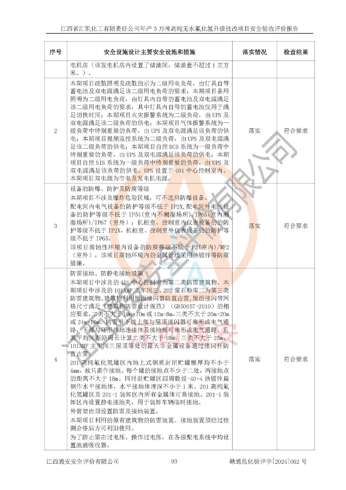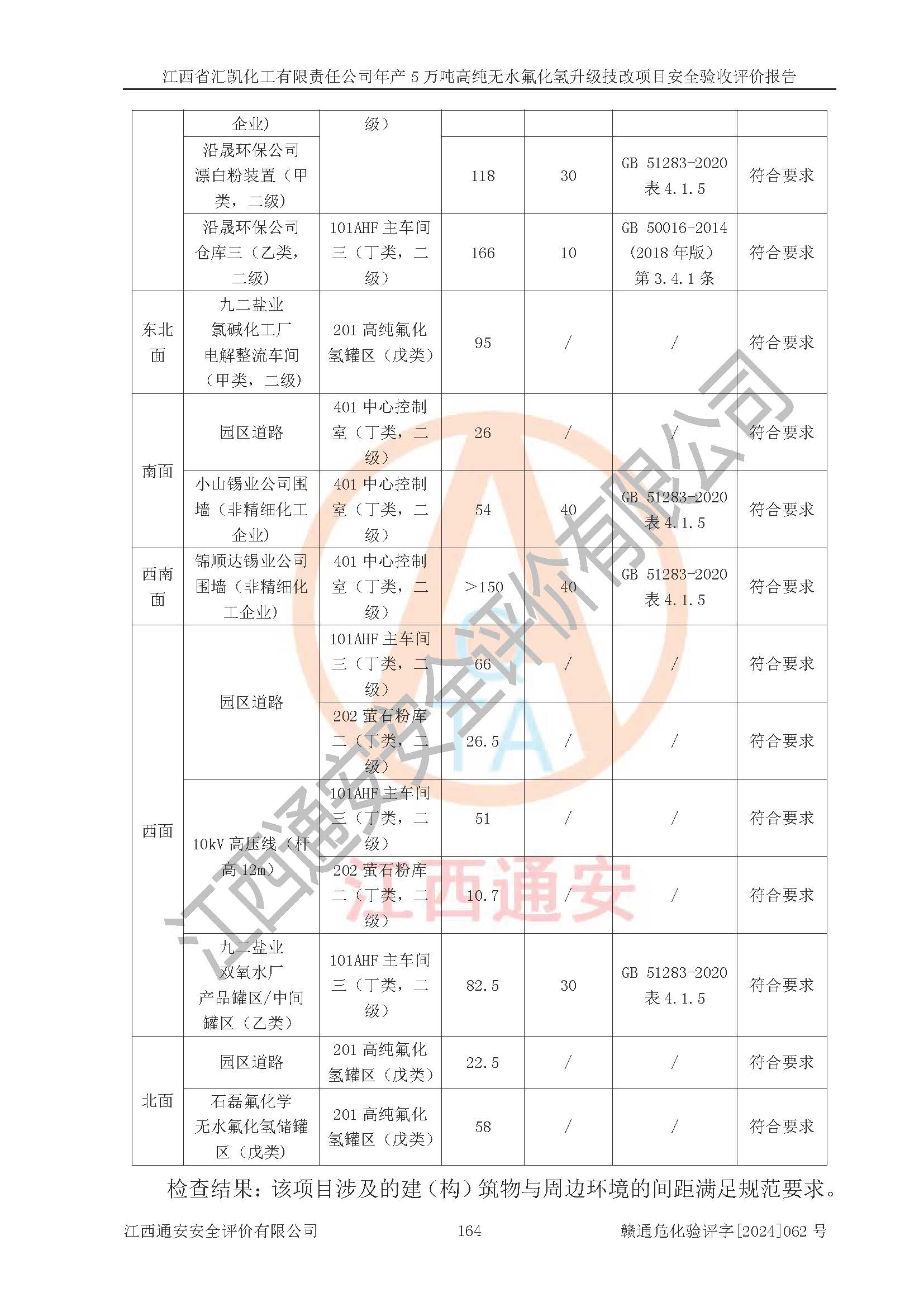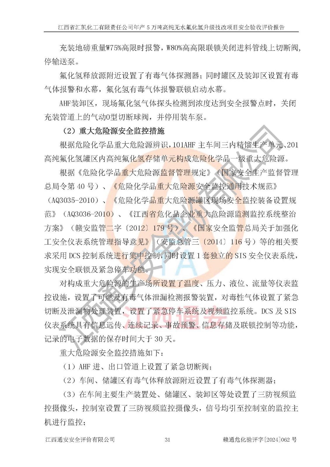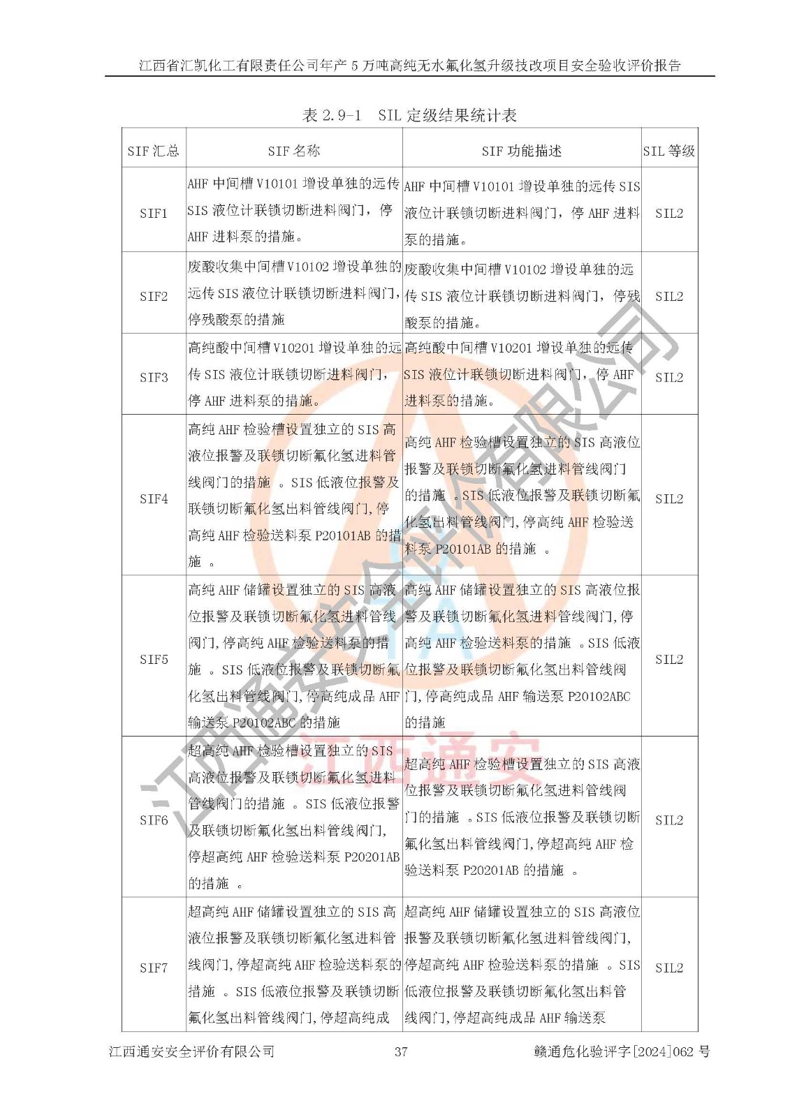 评价结论 | 江西省汇凯化工有限责任公司年产5万吨高纯无水氟化氢升级技改项目现场情况与设计图纸一致,DCS系统和SIS系统符合设计要求、运行正常,主要负责人、安全管理人员等有关从业人员资质符合《江西省危险化学品安全专项整治三年行动实施方案》要求,安全设施及安全管理符合**及有关部门关于安全生产法律、法规、标准的要求,该项目试生产以来,工艺设备运行正常,安全设施和采取的安全技术措施符合设计要求并达到预期结果,可以满足建设项目安全生产的要求,安全生产管理**,具备了安全设施竣工验收条件。 | ||||||