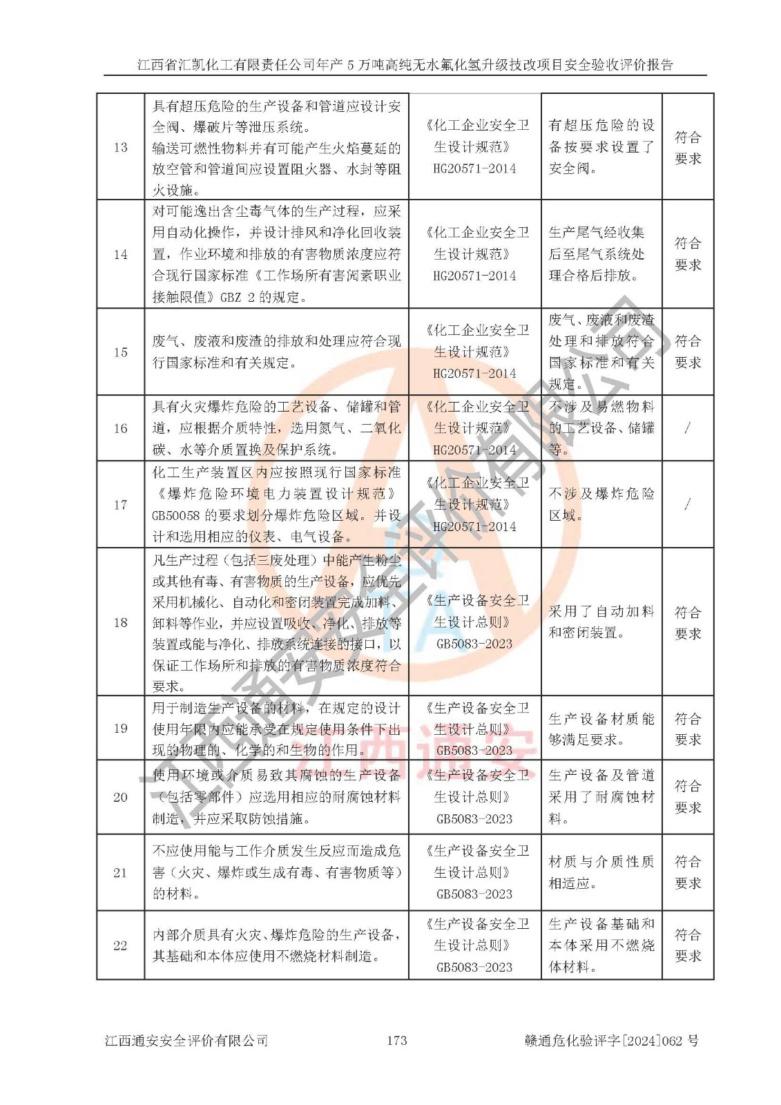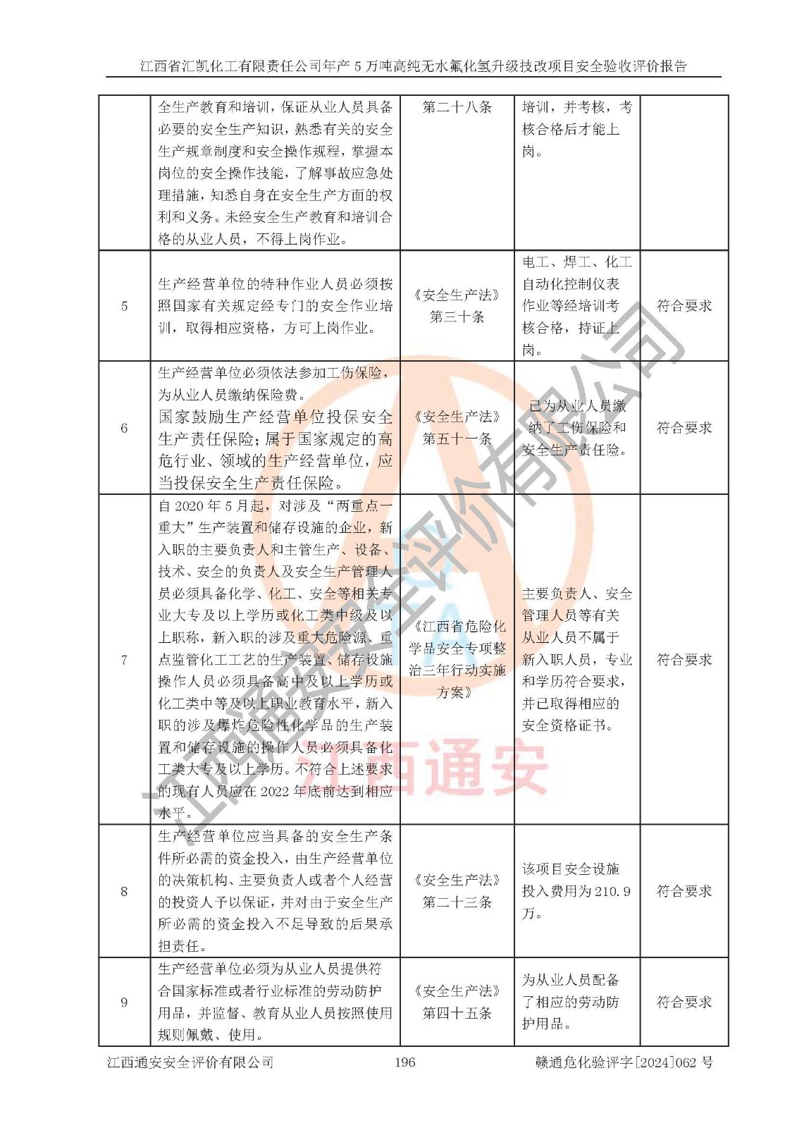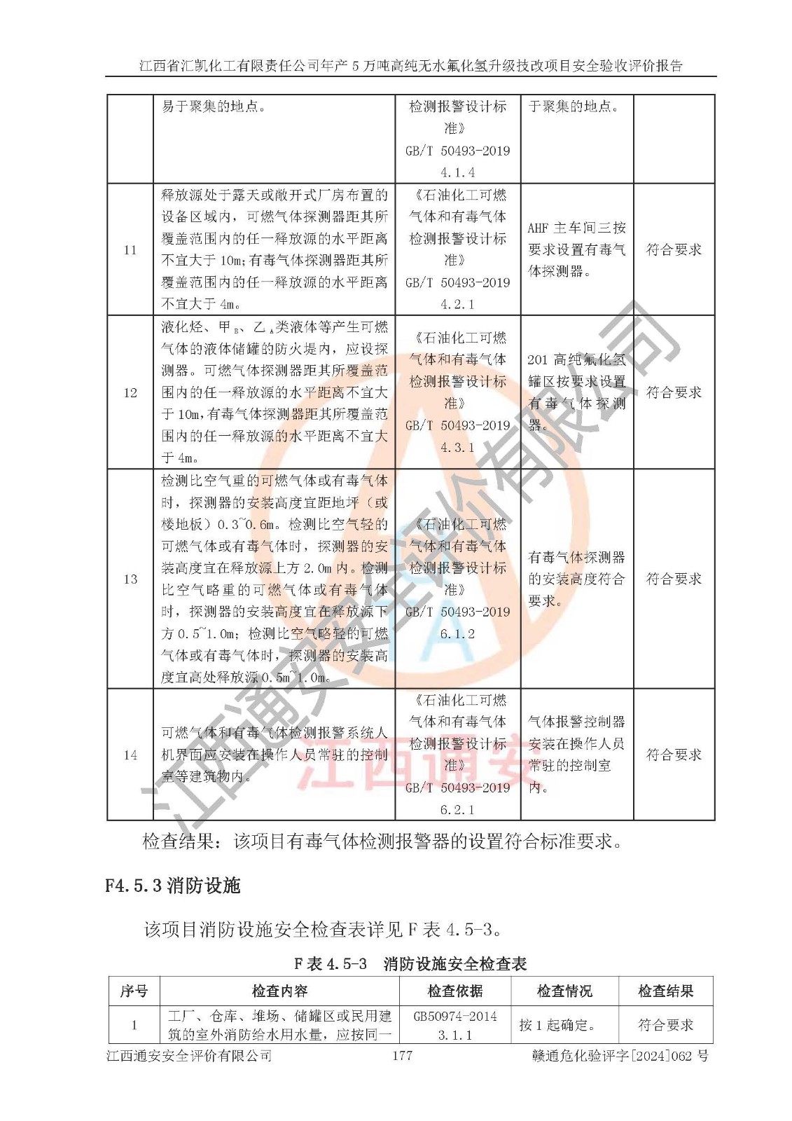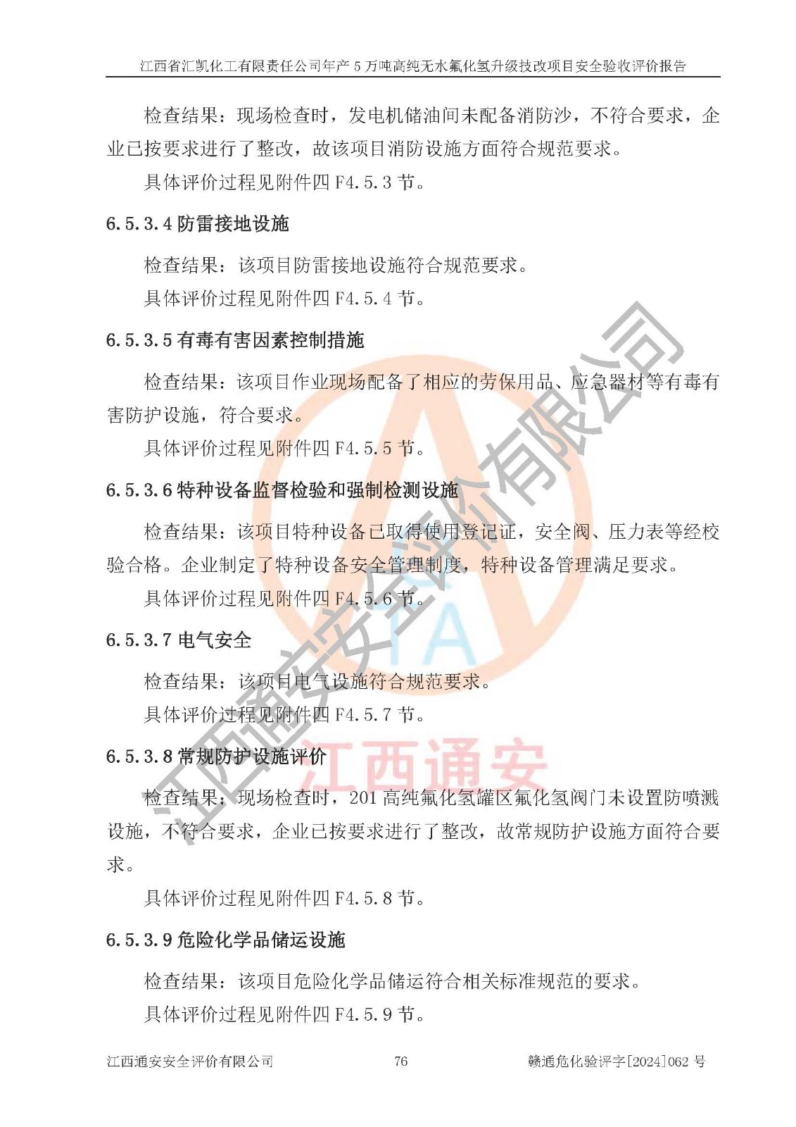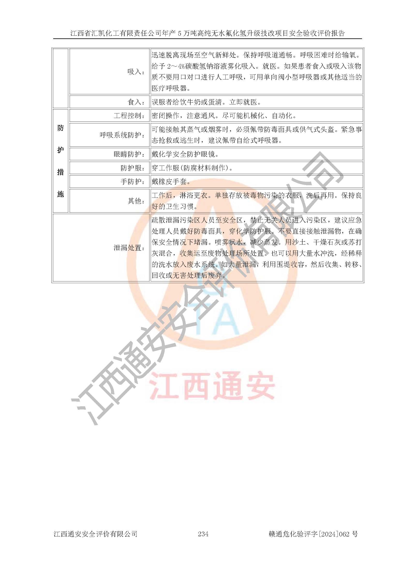 评价结论 | 江西省汇凯化工有限责任公司年产5万吨高纯无水氟化氢升级技改项目现场情况与设计图纸一致,DCS系统和SIS系统符合设计要求、运行正常,主要负责人、安全管理人员等有关从业人员资质符合《江西省危险化学品安全专项整治三年行动实施方案》要求,安全设施及安全管理符合**及有关部门关于安全生产法律、法规、标准的要求,该项目试生产以来,工艺设备运行正常,安全设施和采取的安全技术措施符合设计要求并达到预期结果,可以满足建设项目安全生产的要求,安全生产管理**,具备了安全设施竣工验收条件。 | ||||||