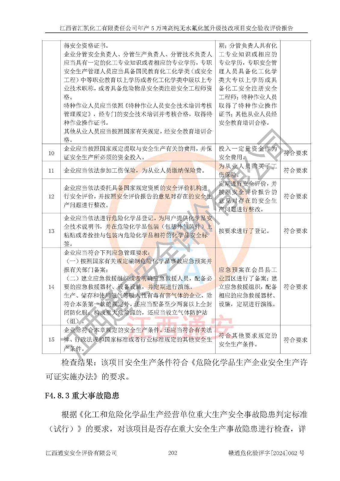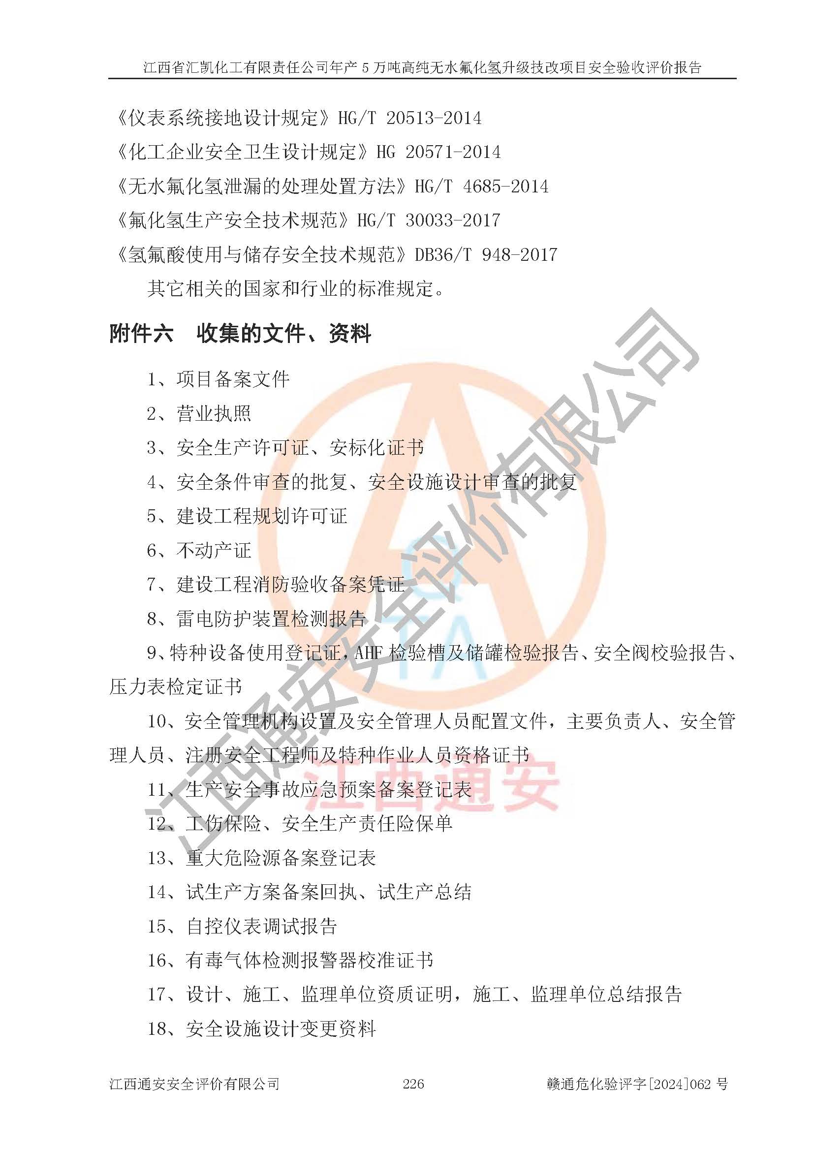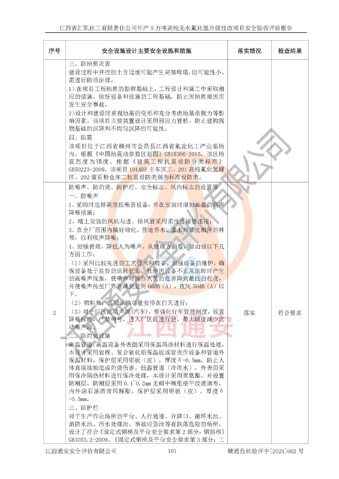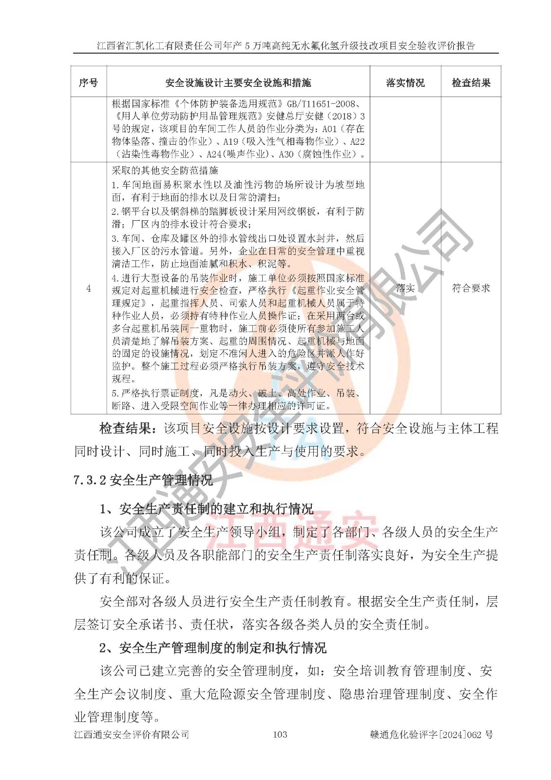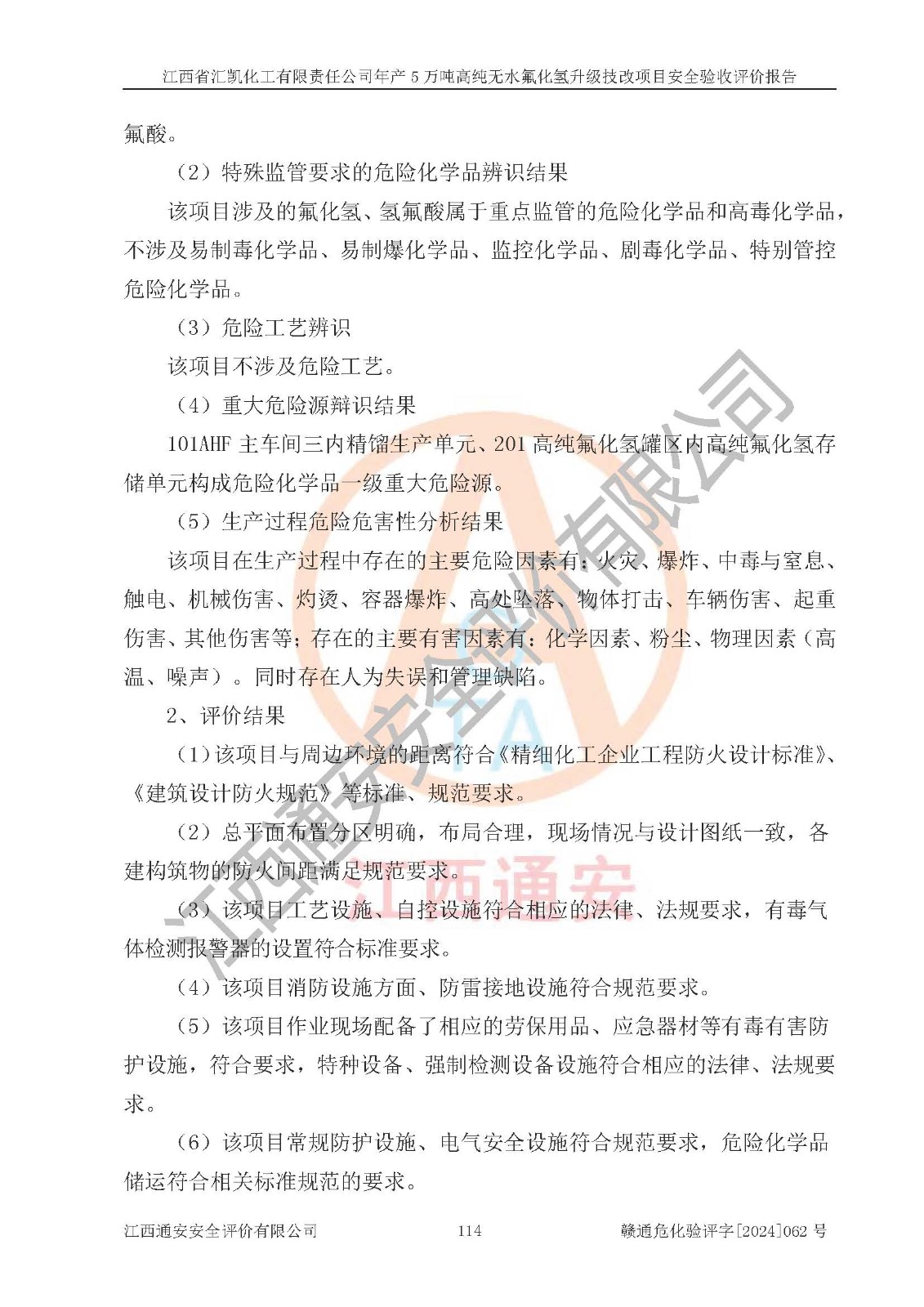 评价结论 | 江西省汇凯化工有限责任公司年产5万吨高纯无水氟化氢升级技改项目现场情况与设计图纸一致,DCS系统和SIS系统符合设计要求、运行正常,主要负责人、安全管理人员等有关从业人员资质符合《江西省危险化学品安全专项整治三年行动实施方案》要求,安全设施及安全管理符合**及有关部门关于安全生产法律、法规、标准的要求,该项目试生产以来,工艺设备运行正常,安全设施和采取的安全技术措施符合设计要求并达到预期结果,可以满足建设项目安全生产的要求,安全生产管理**,具备了安全设施竣工验收条件。 | ||||||