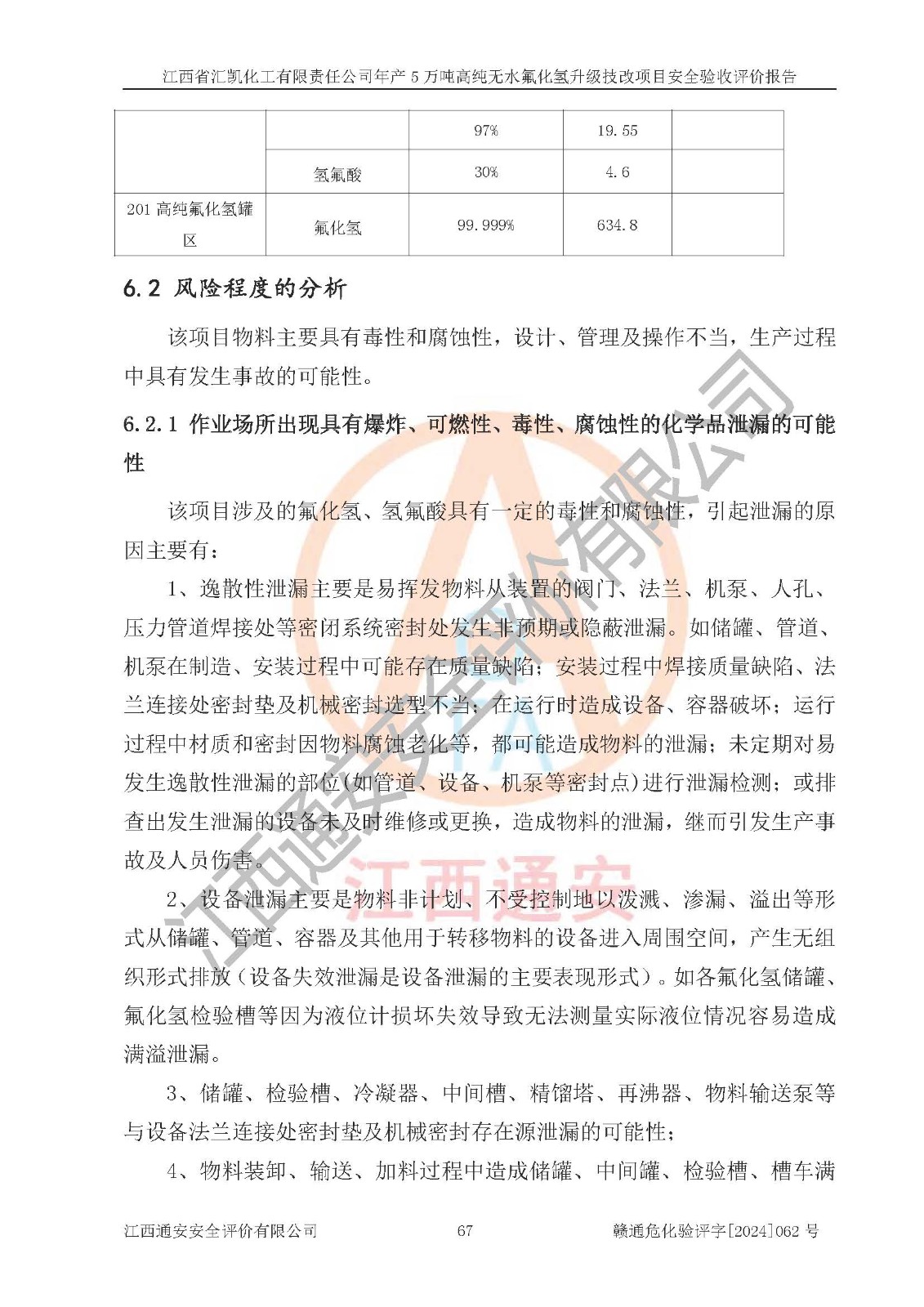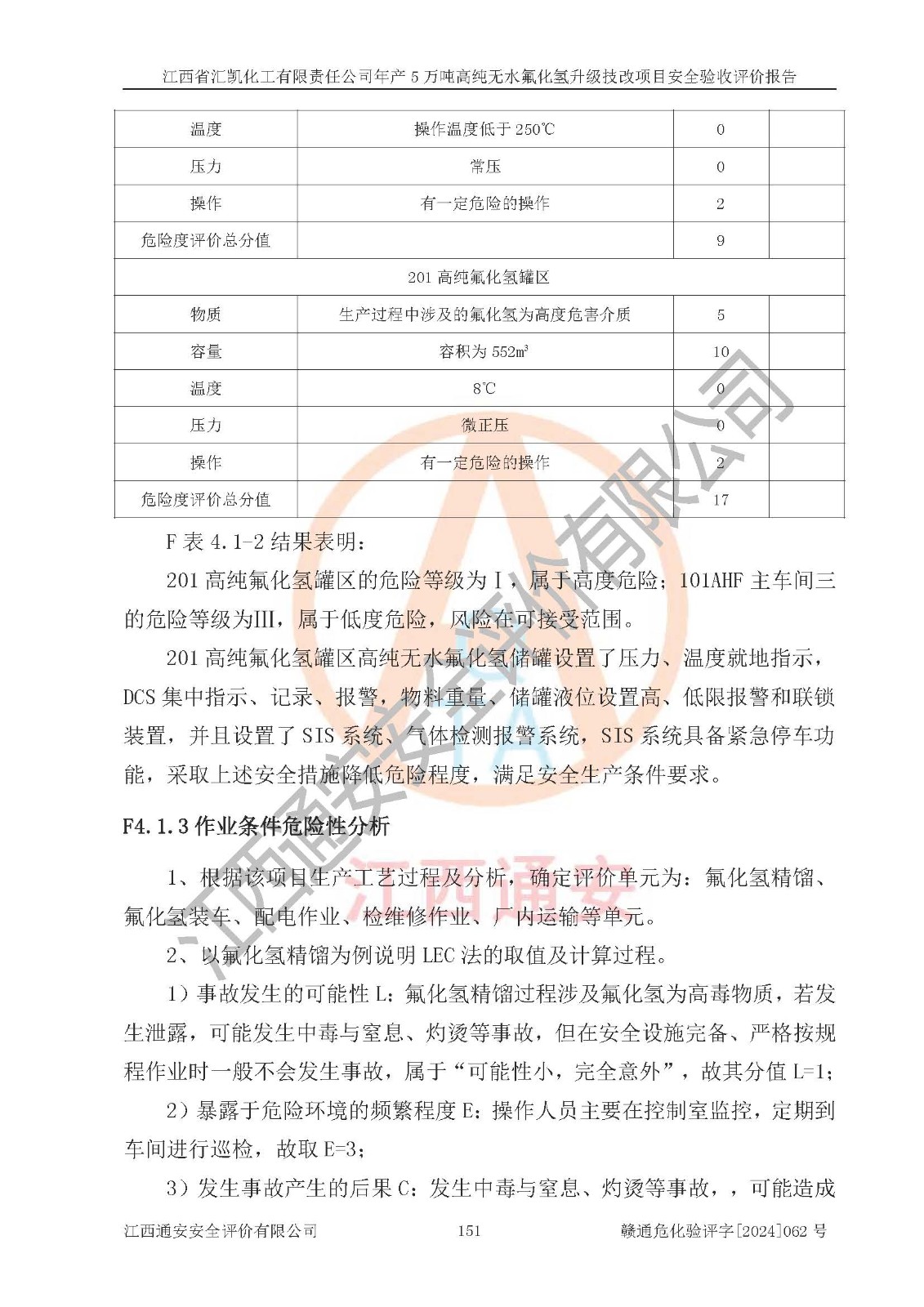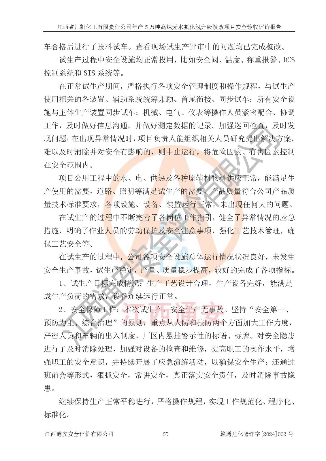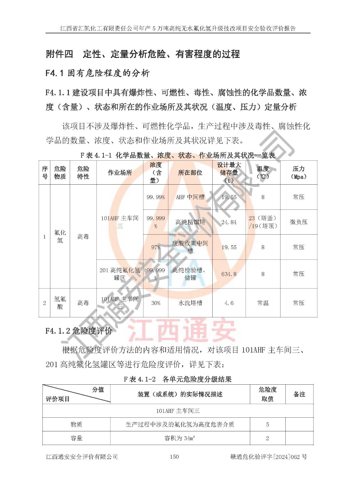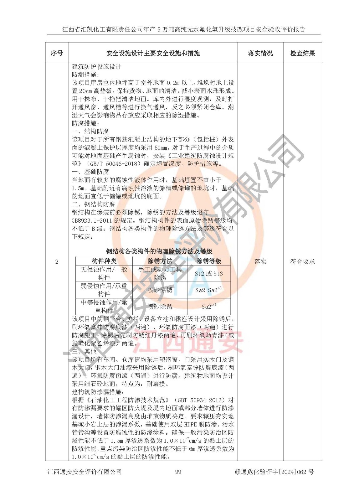评价结论 | 江西省汇凯化工有限责任公司年产5万吨高纯无水氟化氢升级技改项目现场情况与设计图纸一致,DCS系统和SIS系统符合设计要求、运行正常,主要负责人、安全管理人员等有关从业人员资质符合《江西省危险化学品安全专项整治三年行动实施方案》要求,安全设施及安全管理符合**及有关部门关于安全生产法律、法规、标准的要求,该项目试生产以来,工艺设备运行正常,安全设施和采取的安全技术措施符合设计要求并达到预期结果,可以满足建设项目安全生产的要求,安全生产管理**,具备了安全设施竣工验收条件。 | ||||||
