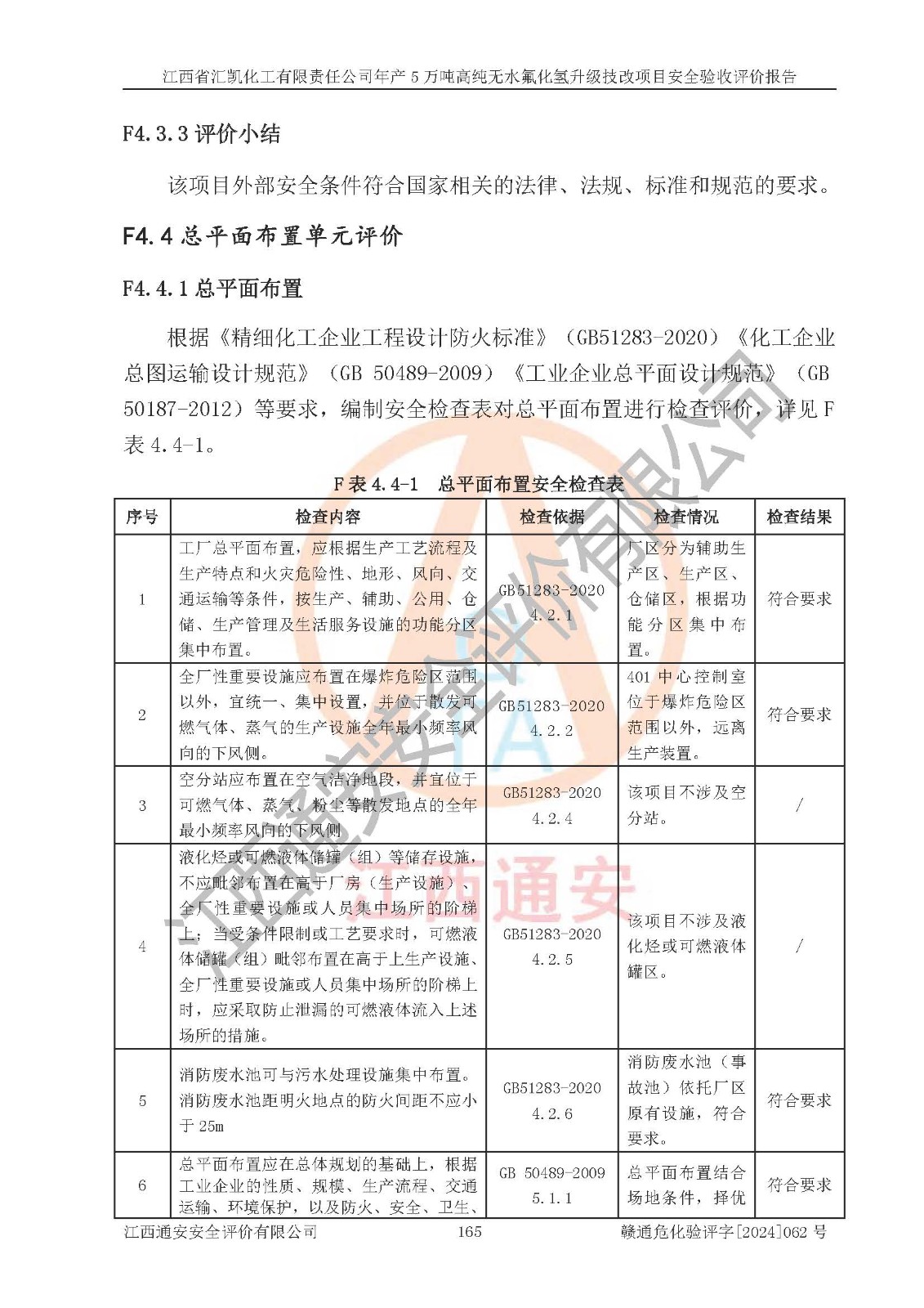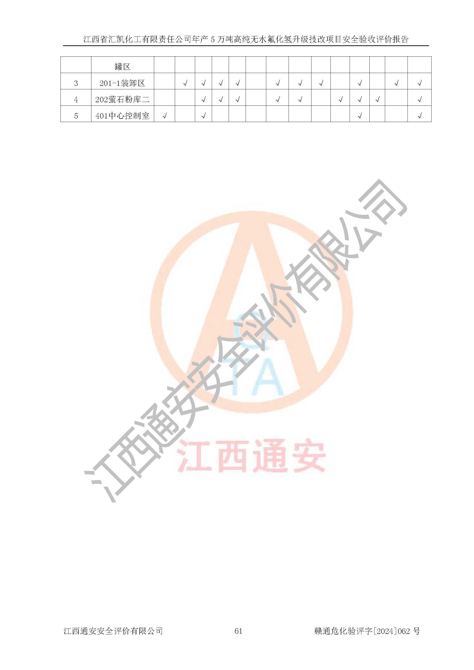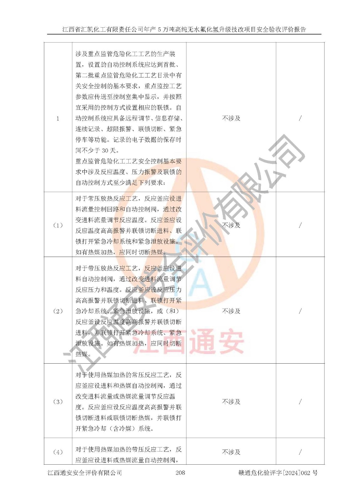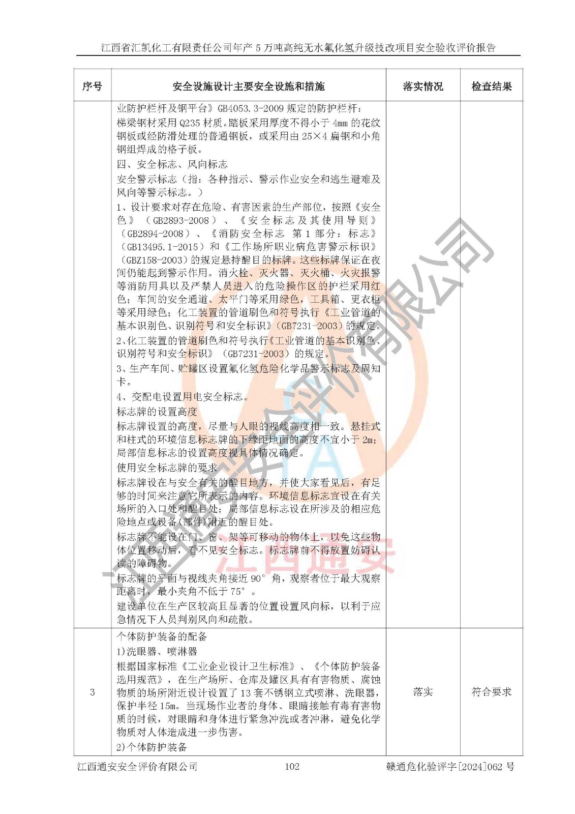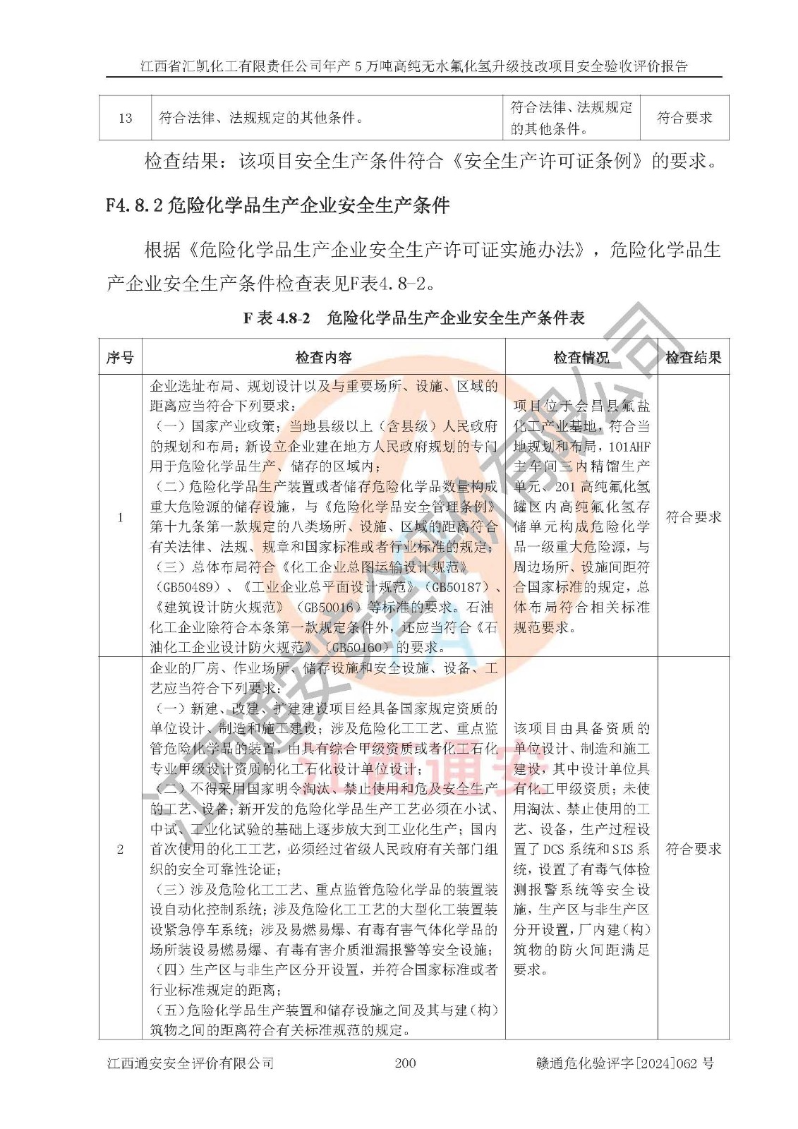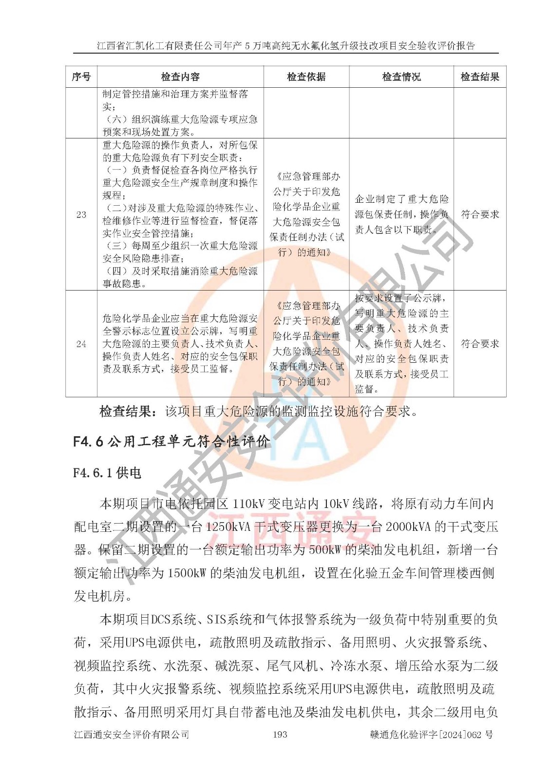 评价结论 | 江西省汇凯化工有限责任公司年产5万吨高纯无水氟化氢升级技改项目现场情况与设计图纸一致,DCS系统和SIS系统符合设计要求、运行正常,主要负责人、安全管理人员等有关从业人员资质符合《江西省危险化学品安全专项整治三年行动实施方案》要求,安全设施及安全管理符合**及有关部门关于安全生产法律、法规、标准的要求,该项目试生产以来,工艺设备运行正常,安全设施和采取的安全技术措施符合设计要求并达到预期结果,可以满足建设项目安全生产的要求,安全生产管理**,具备了安全设施竣工验收条件。 | ||||||
