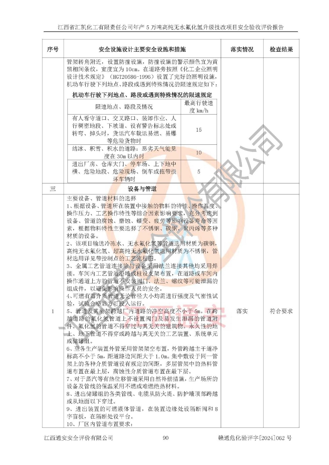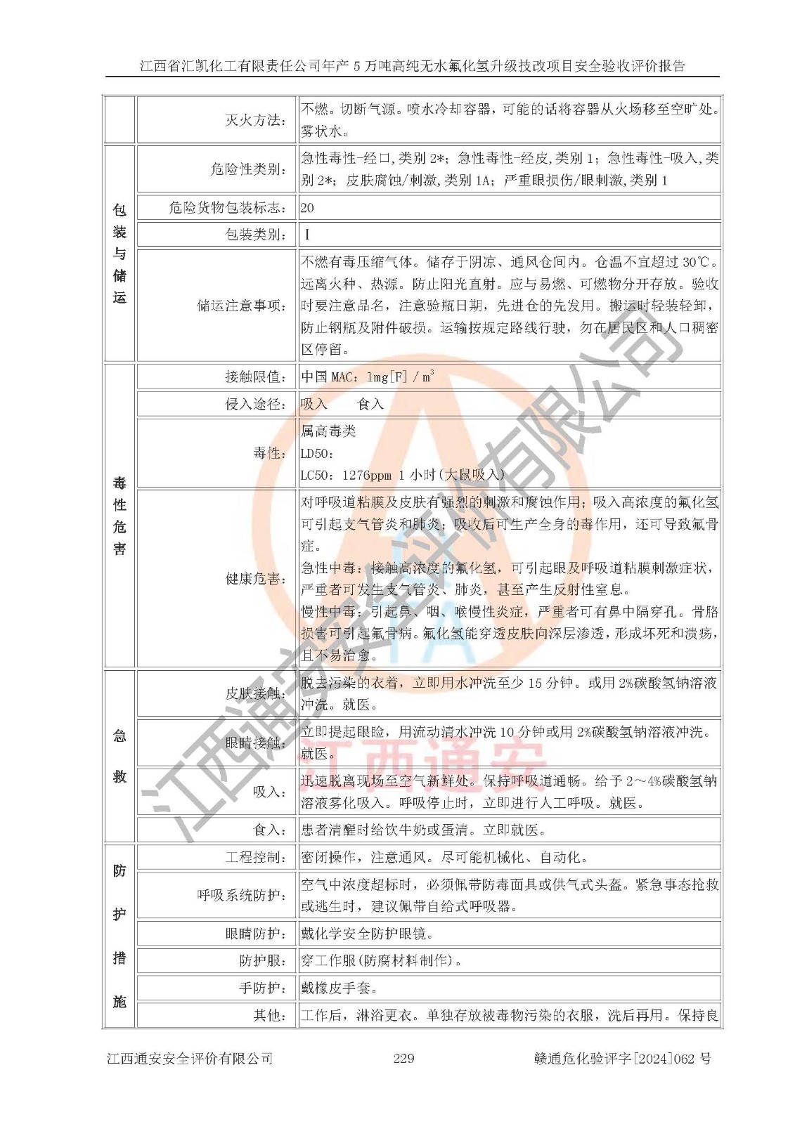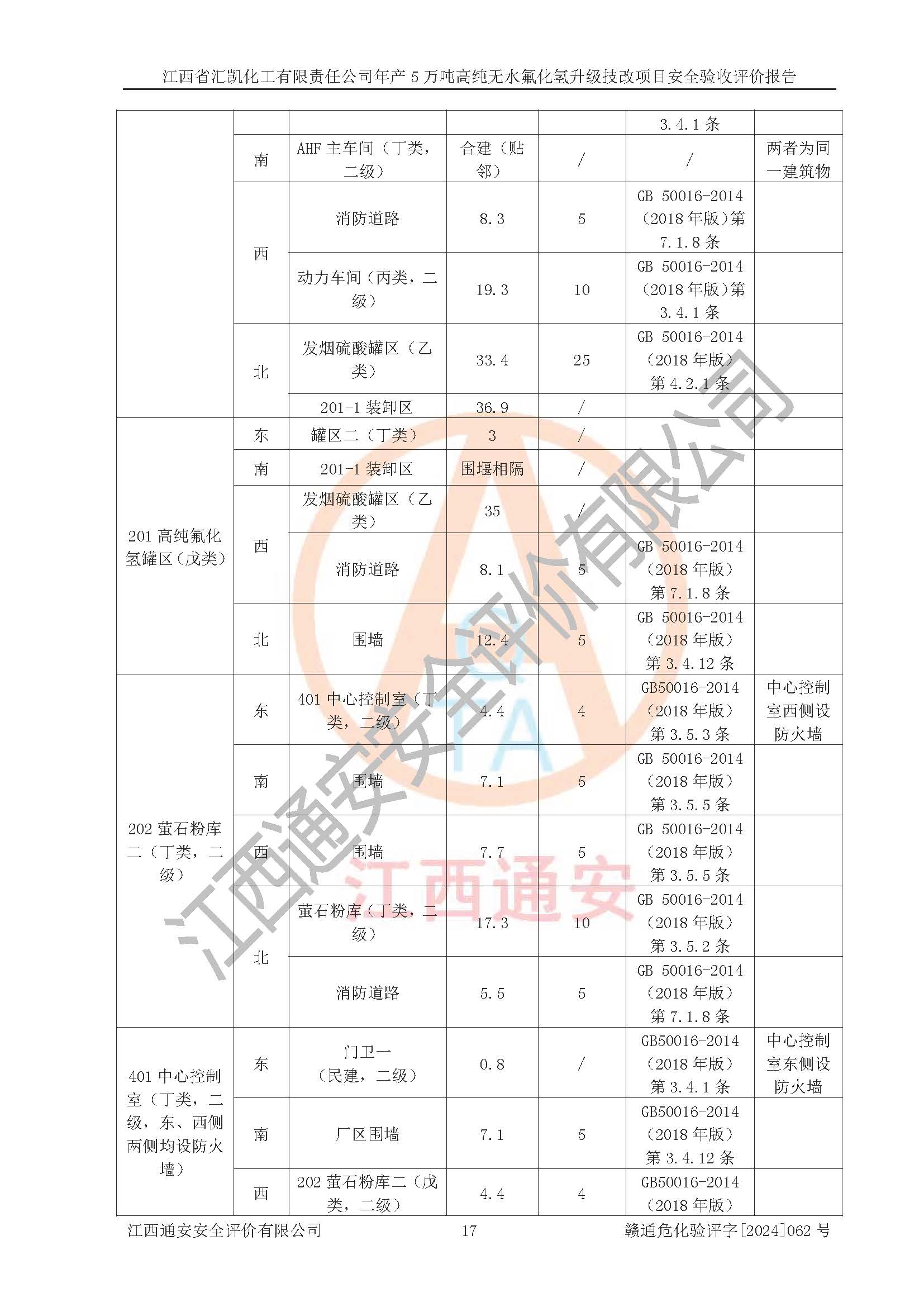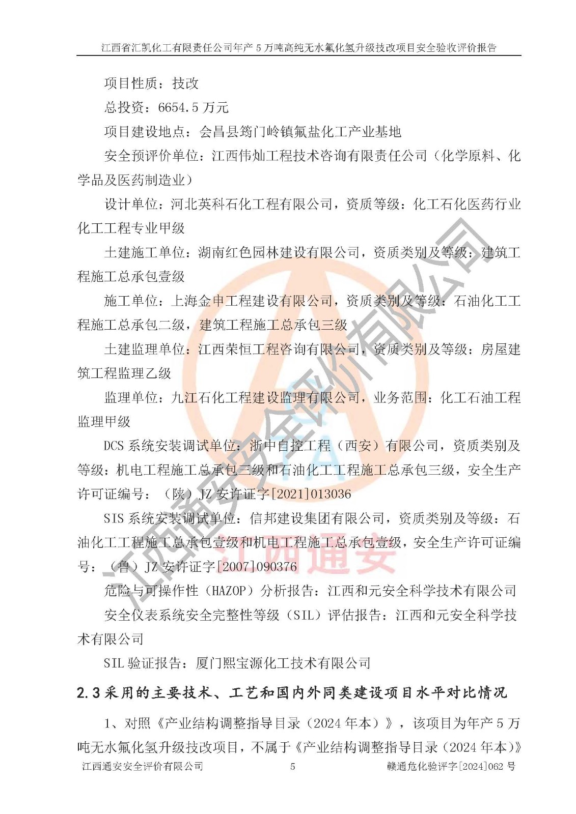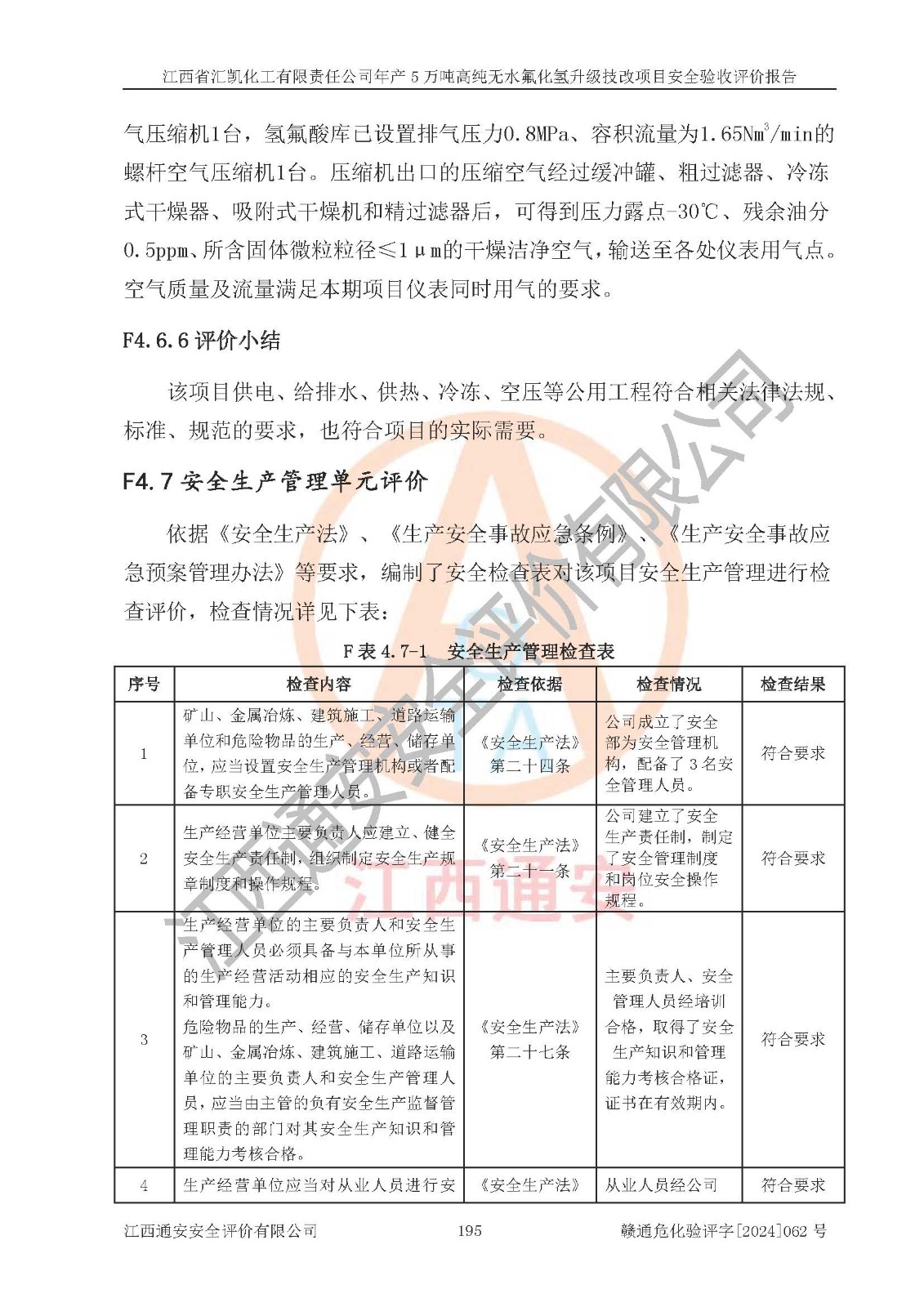评价结论 | 江西省汇凯化工有限责任公司年产5万吨高纯无水氟化氢升级技改项目现场情况与设计图纸一致,DCS系统和SIS系统符合设计要求、运行正常,主要负责人、安全管理人员等有关从业人员资质符合《江西省危险化学品安全专项整治三年行动实施方案》要求,安全设施及安全管理符合**及有关部门关于安全生产法律、法规、标准的要求,该项目试生产以来,工艺设备运行正常,安全设施和采取的安全技术措施符合设计要求并达到预期结果,可以满足建设项目安全生产的要求,安全生产管理**,具备了安全设施竣工验收条件。 | ||||||