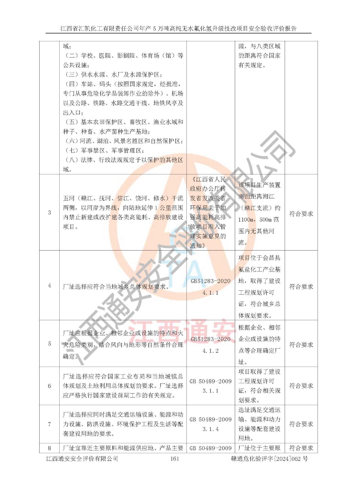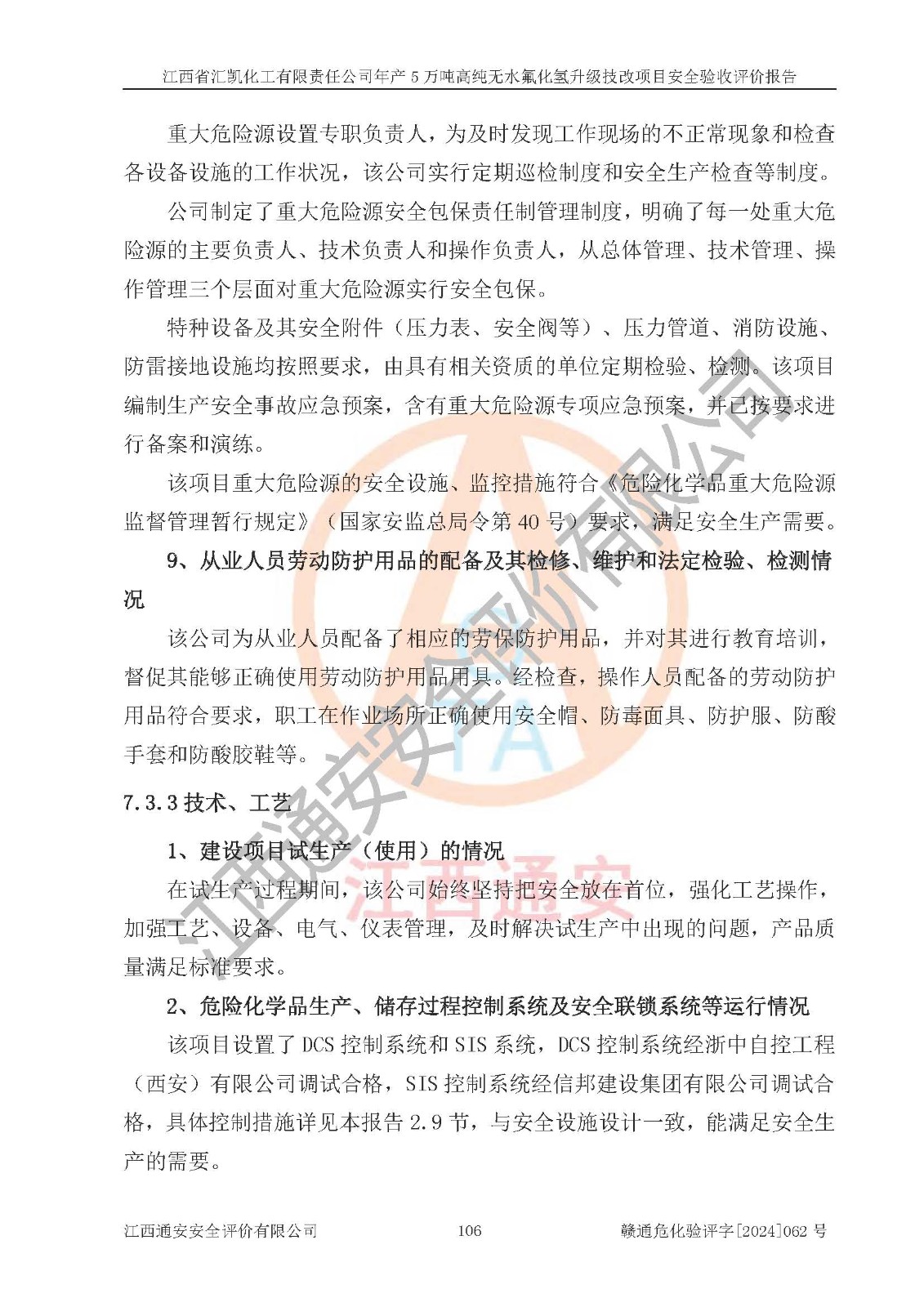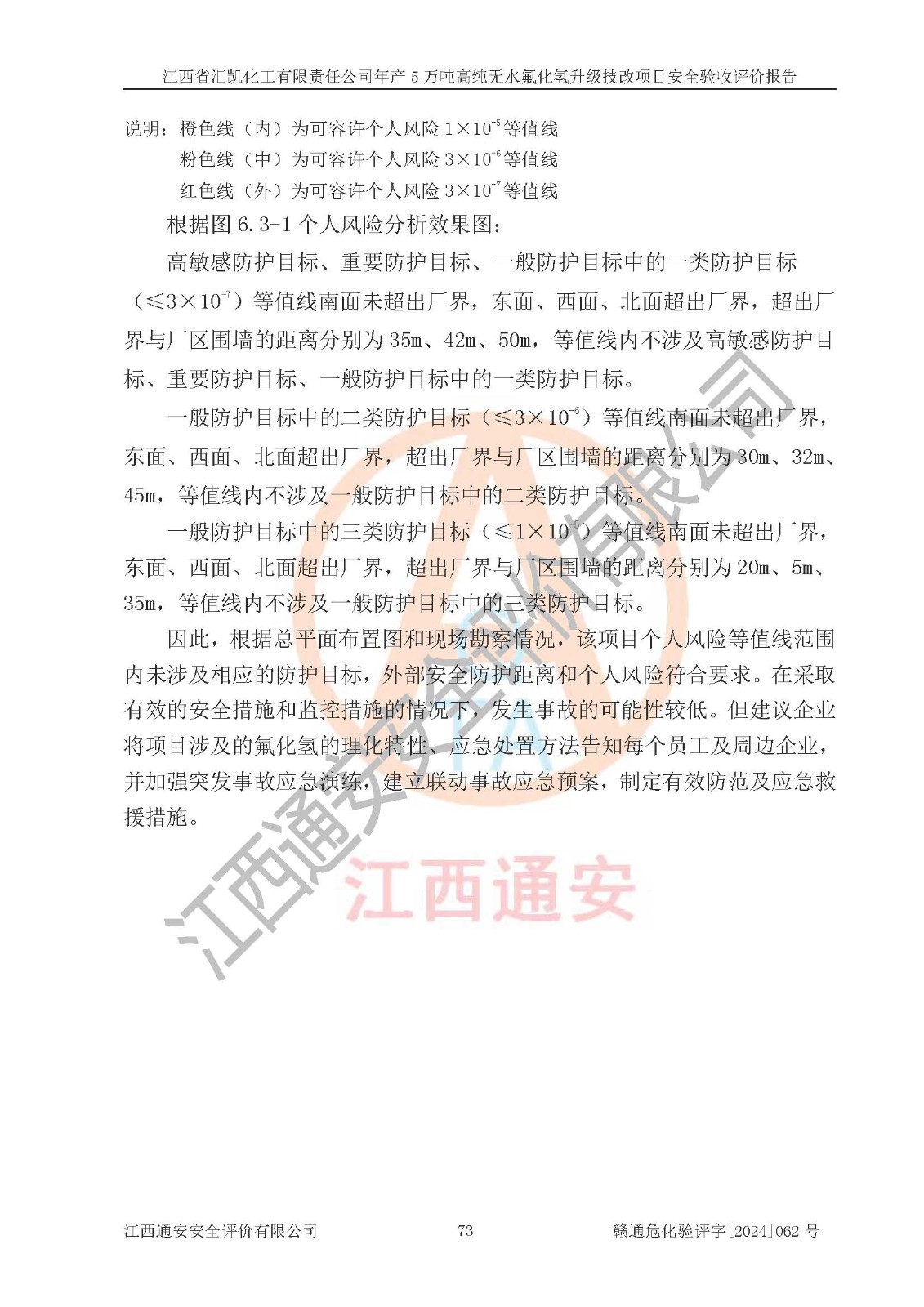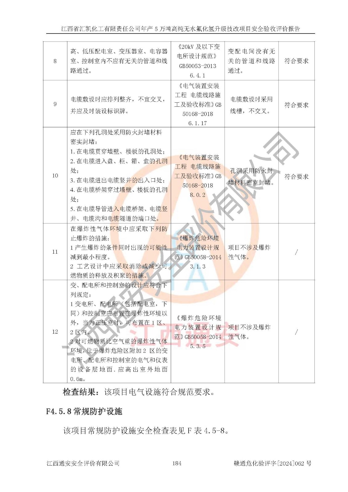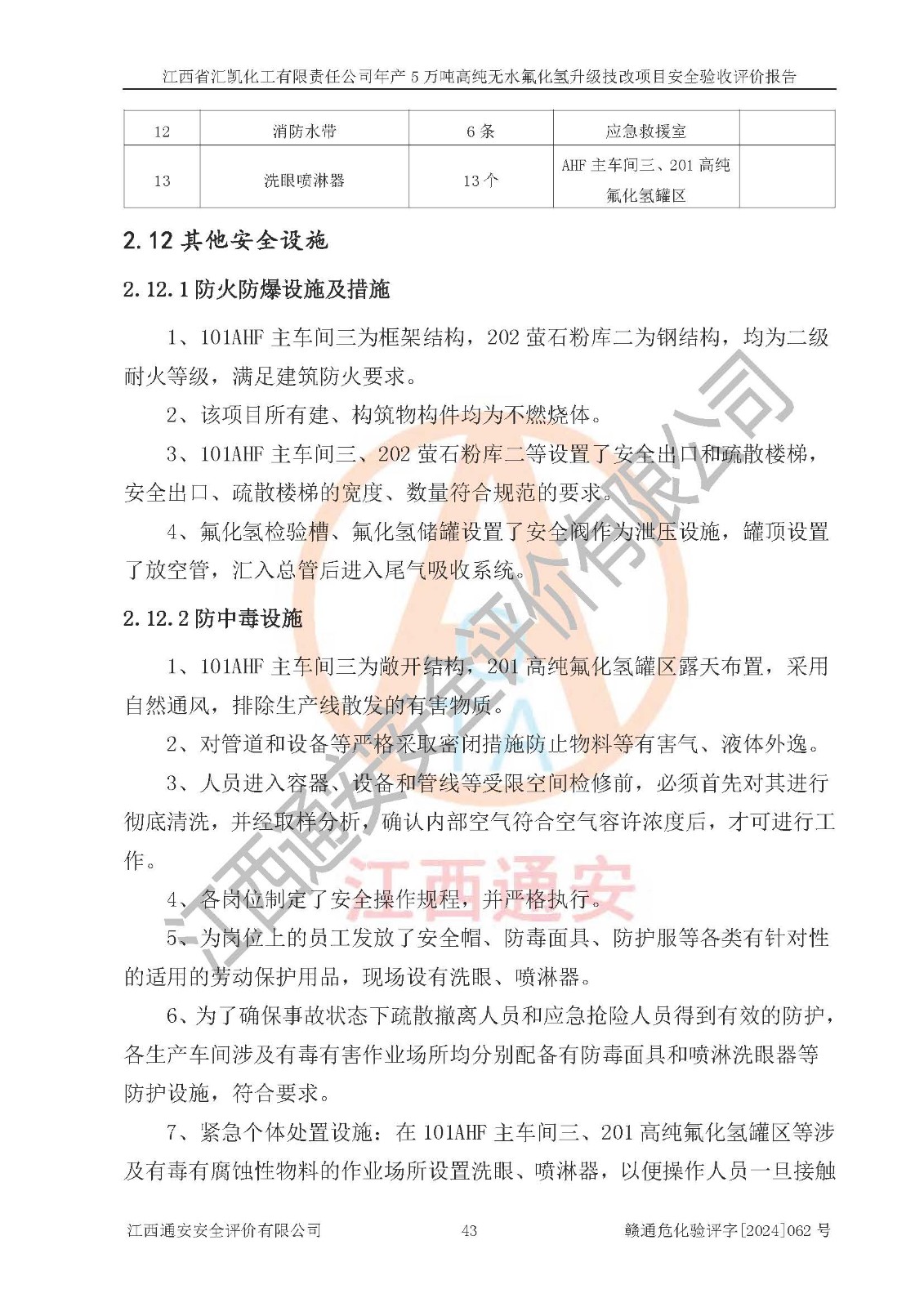评价结论 | 江西省汇凯化工有限责任公司年产5万吨高纯无水氟化氢升级技改项目现场情况与设计图纸一致,DCS系统和SIS系统符合设计要求、运行正常,主要负责人、安全管理人员等有关从业人员资质符合《江西省危险化学品安全专项整治三年行动实施方案》要求,安全设施及安全管理符合**及有关部门关于安全生产法律、法规、标准的要求,该项目试生产以来,工艺设备运行正常,安全设施和采取的安全技术措施符合设计要求并达到预期结果,可以满足建设项目安全生产的要求,安全生产管理**,具备了安全设施竣工验收条件。 | ||||||