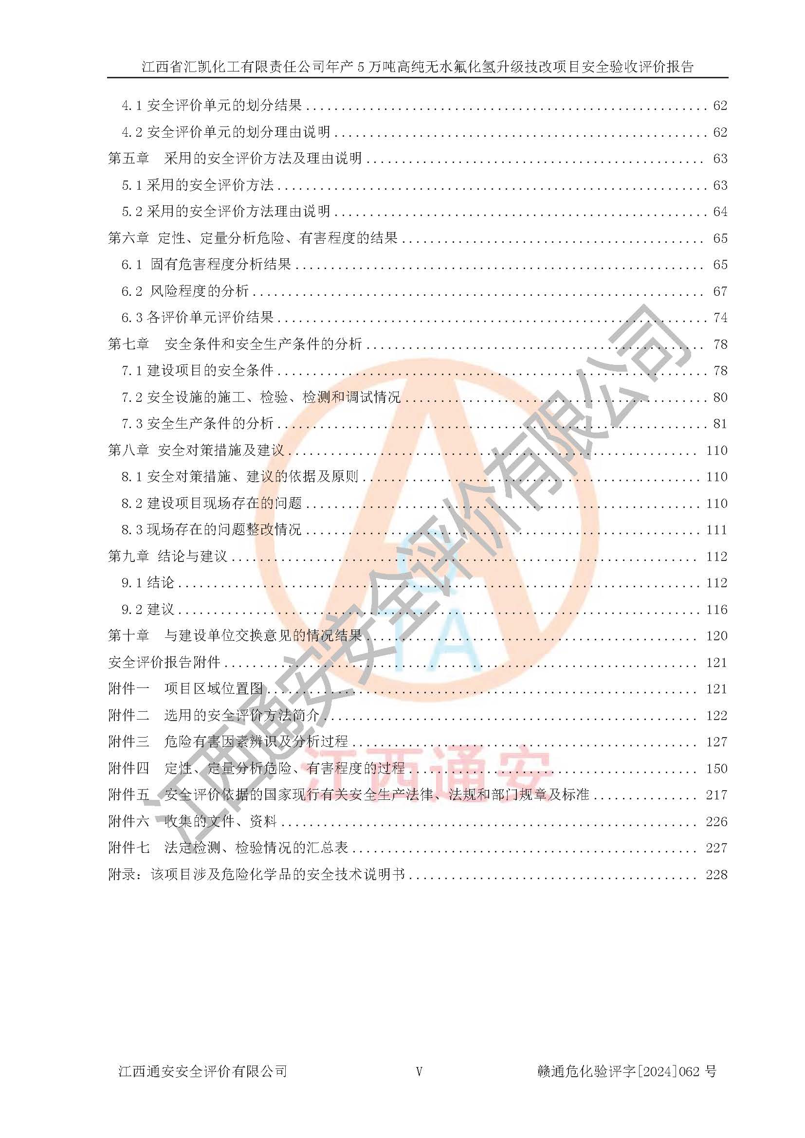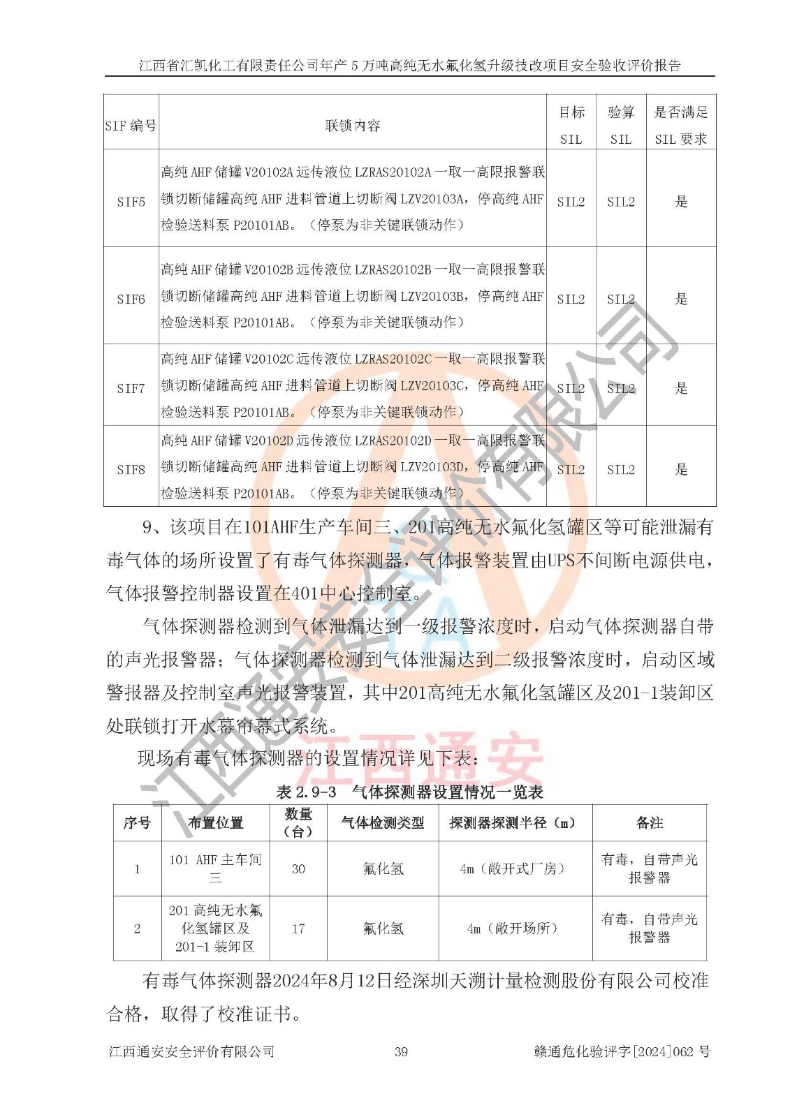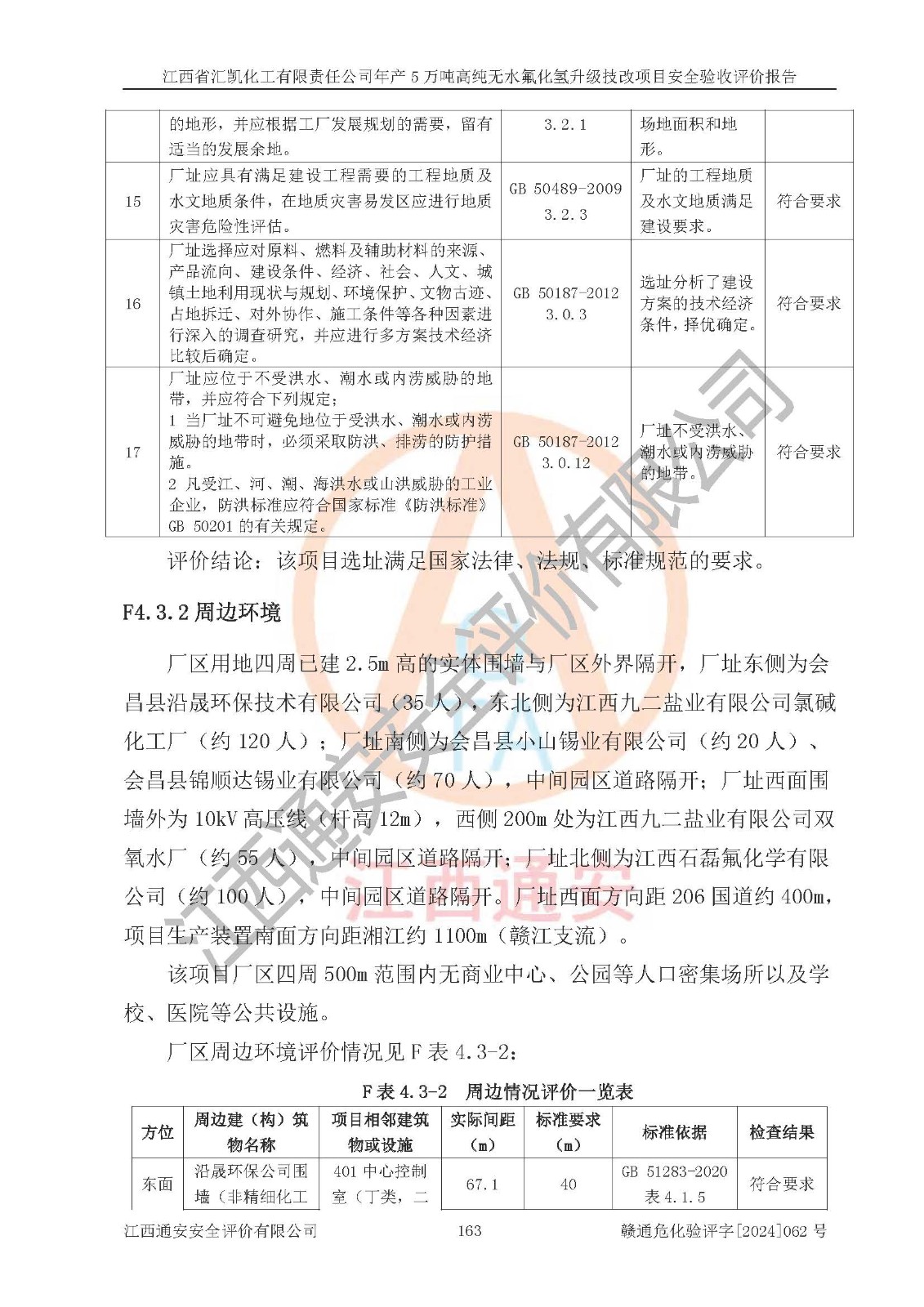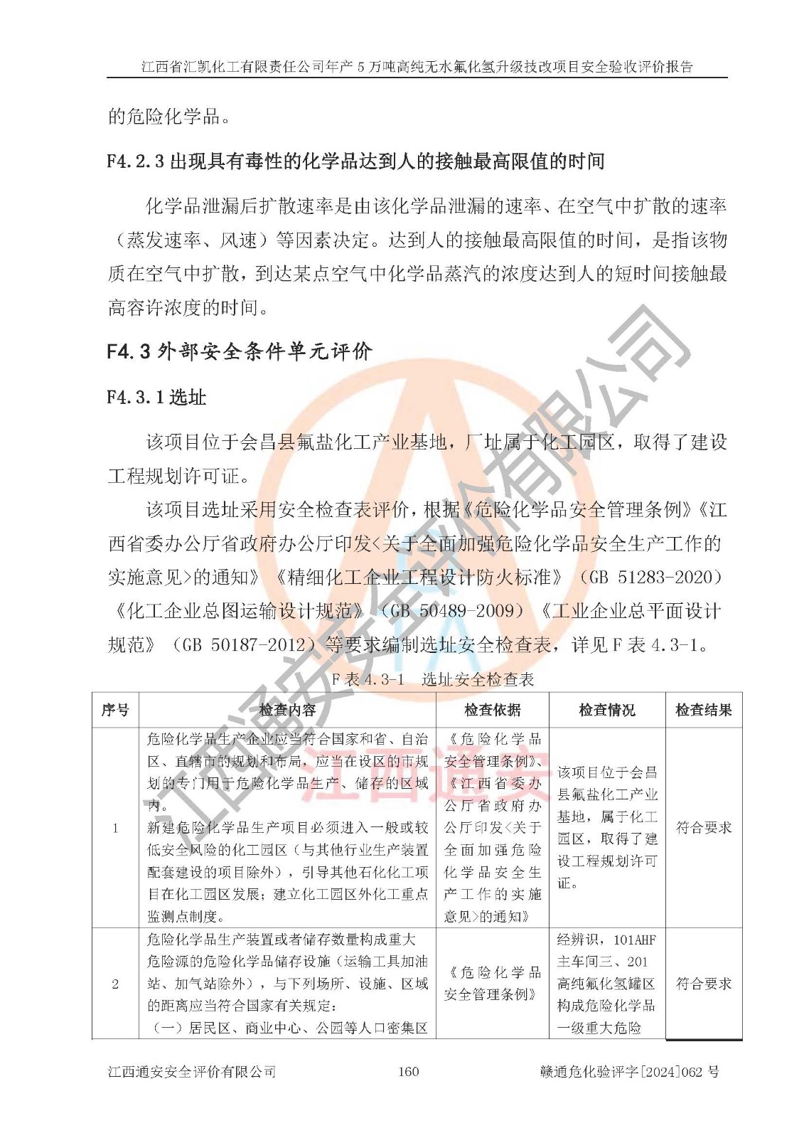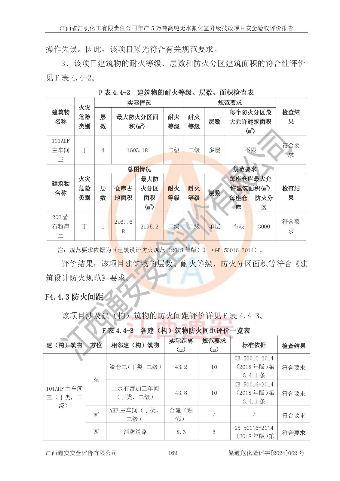 评价结论 | 江西省汇凯化工有限责任公司年产5万吨高纯无水氟化氢升级技改项目现场情况与设计图纸一致,DCS系统和SIS系统符合设计要求、运行正常,主要负责人、安全管理人员等有关从业人员资质符合《江西省危险化学品安全专项整治三年行动实施方案》要求,安全设施及安全管理符合**及有关部门关于安全生产法律、法规、标准的要求,该项目试生产以来,工艺设备运行正常,安全设施和采取的安全技术措施符合设计要求并达到预期结果,可以满足建设项目安全生产的要求,安全生产管理**,具备了安全设施竣工验收条件。 | ||||||