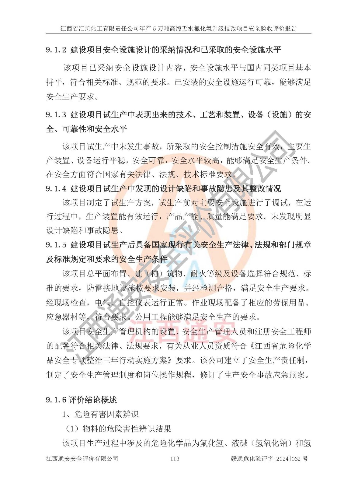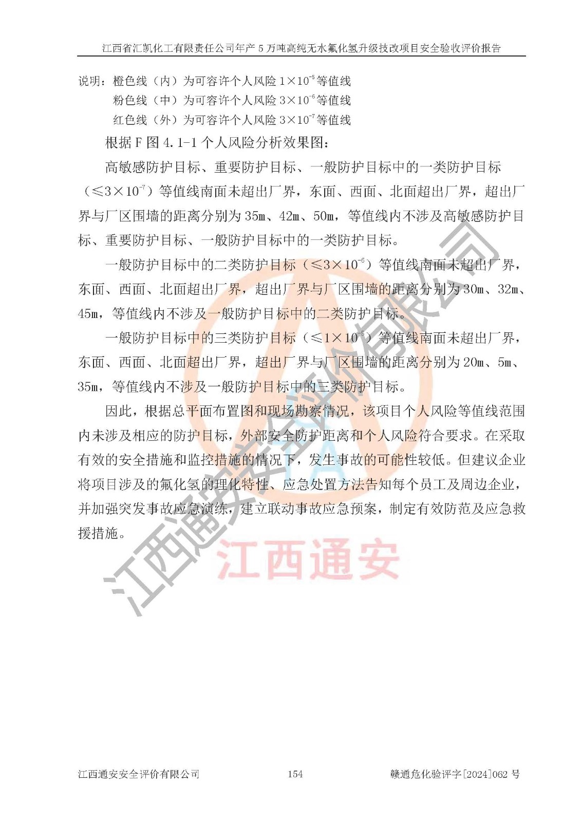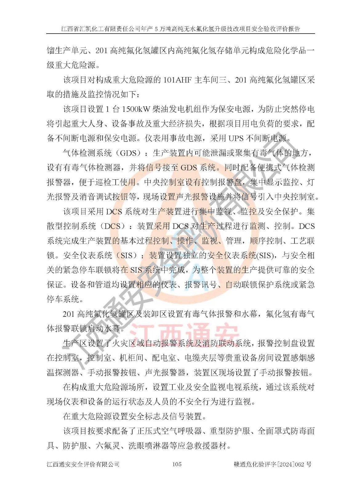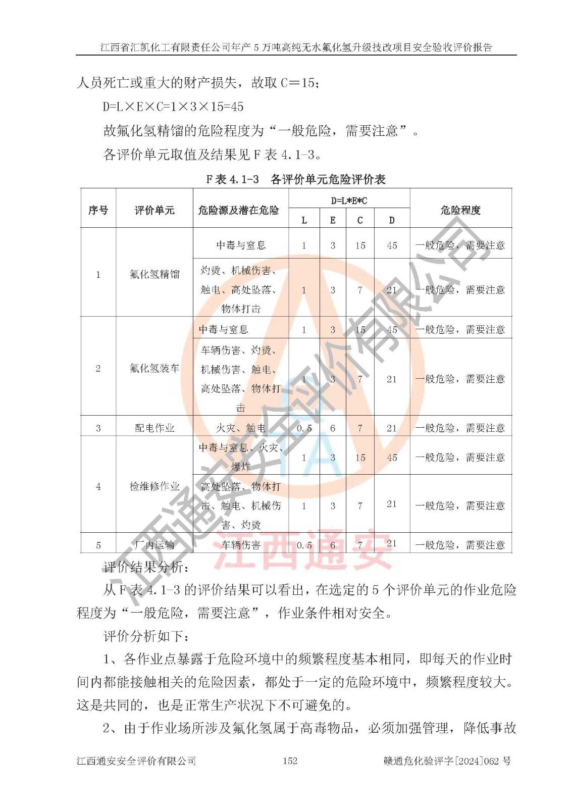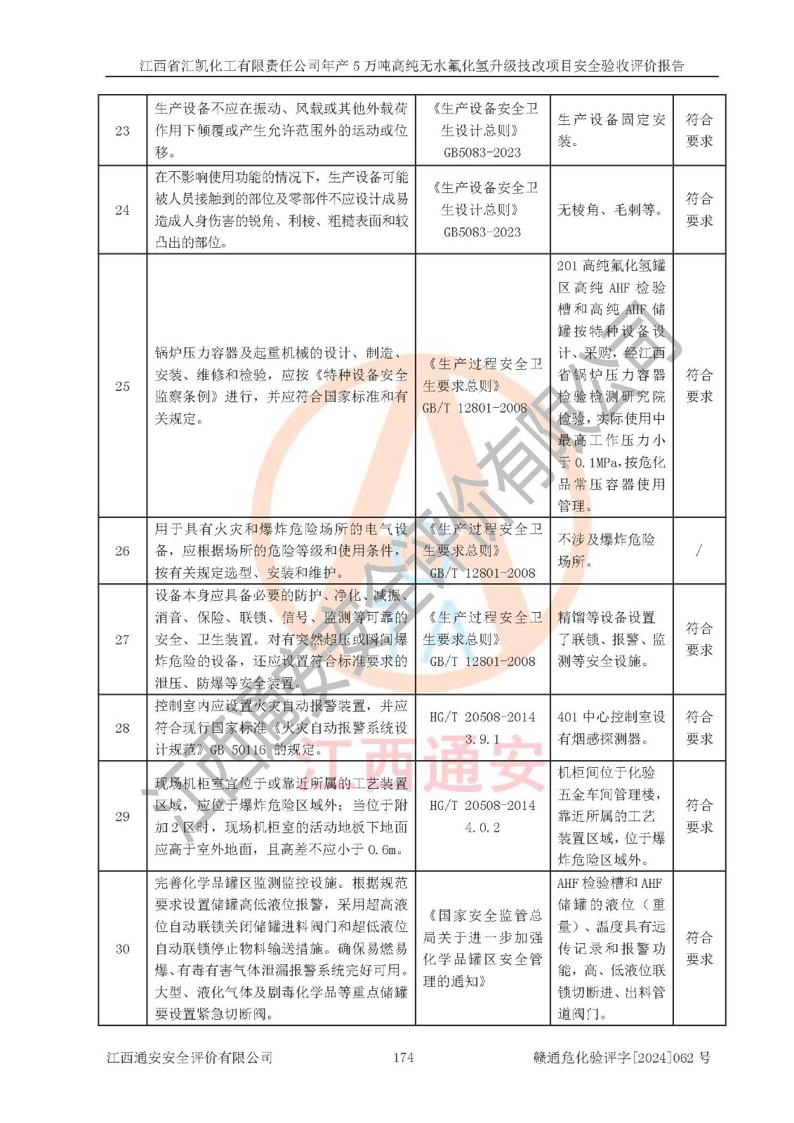 评价结论 | 江西省汇凯化工有限责任公司年产5万吨高纯无水氟化氢升级技改项目现场情况与设计图纸一致,DCS系统和SIS系统符合设计要求、运行正常,主要负责人、安全管理人员等有关从业人员资质符合《江西省危险化学品安全专项整治三年行动实施方案》要求,安全设施及安全管理符合**及有关部门关于安全生产法律、法规、标准的要求,该项目试生产以来,工艺设备运行正常,安全设施和采取的安全技术措施符合设计要求并达到预期结果,可以满足建设项目安全生产的要求,安全生产管理**,具备了安全设施竣工验收条件。 | ||||||