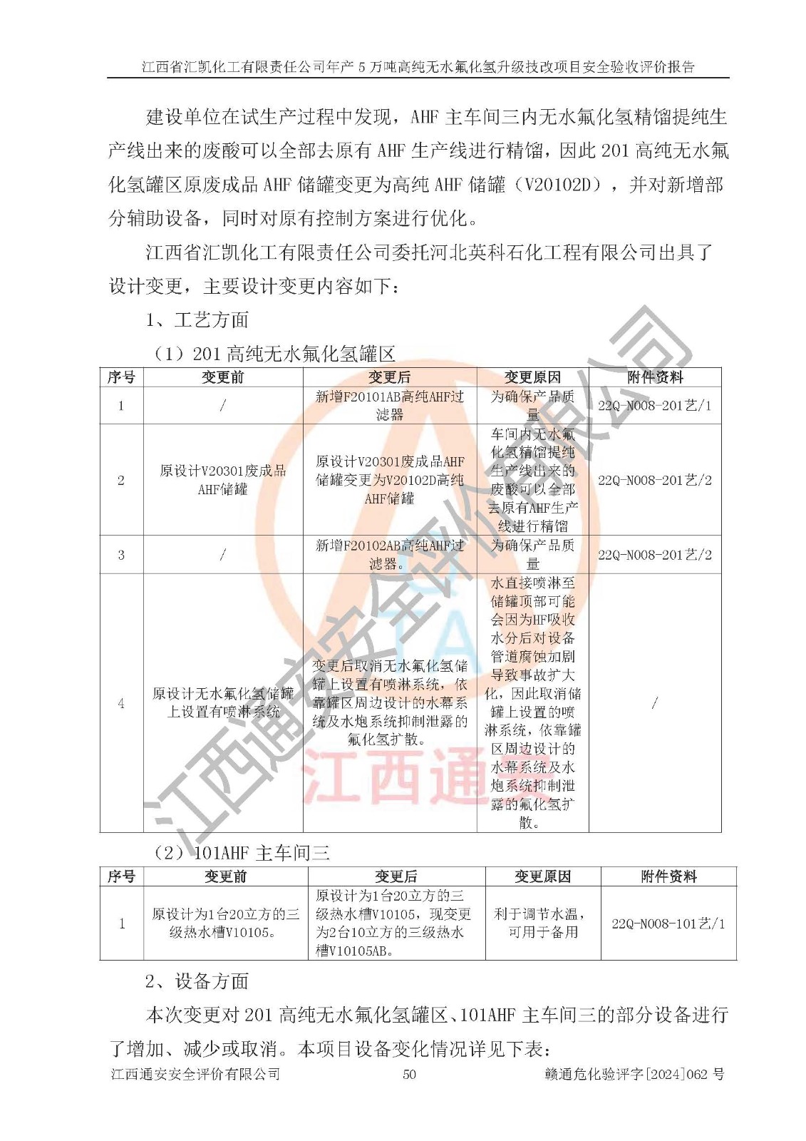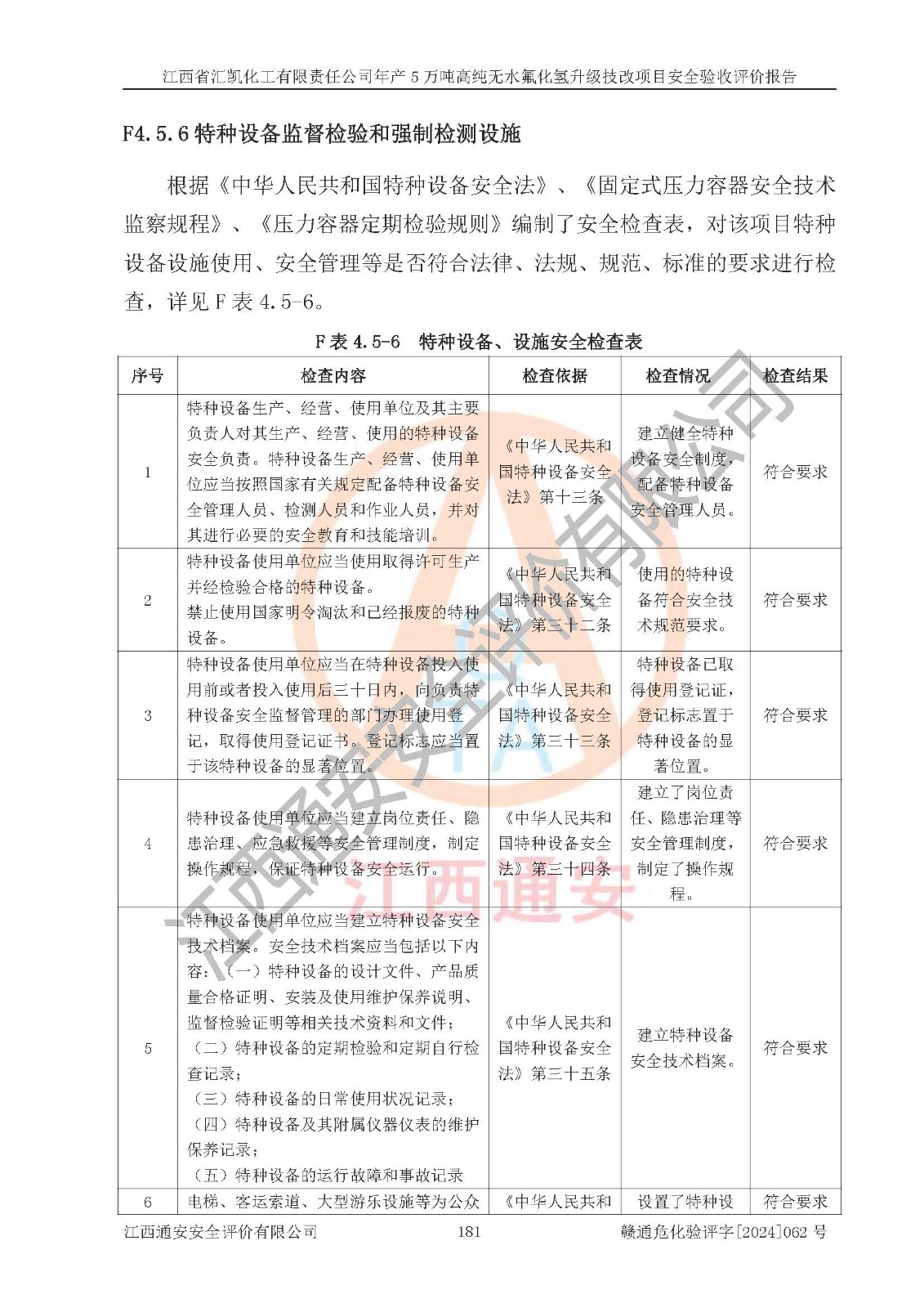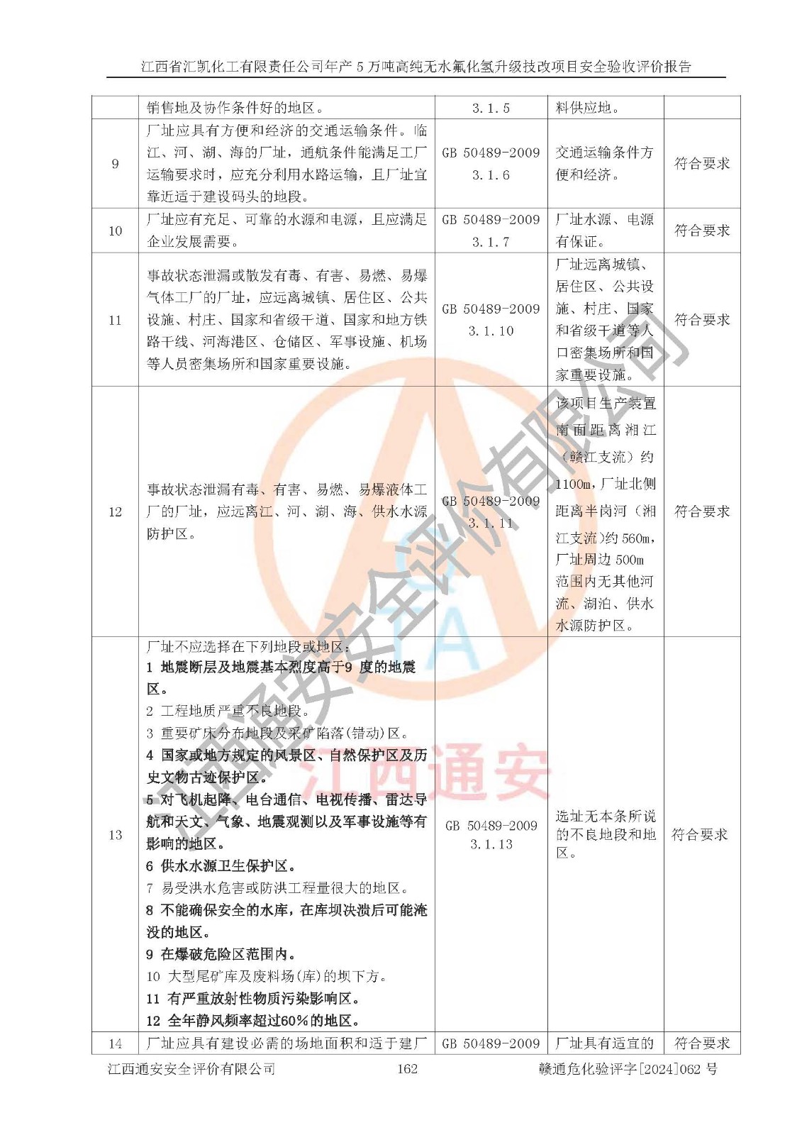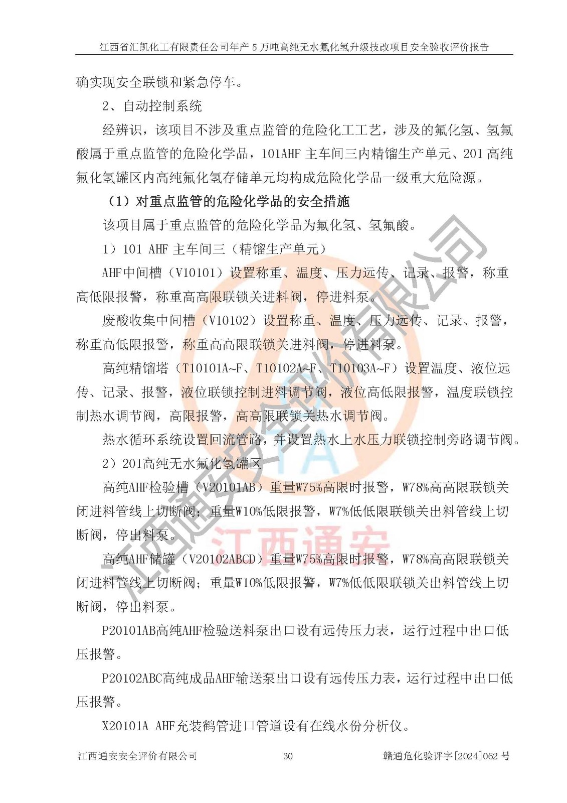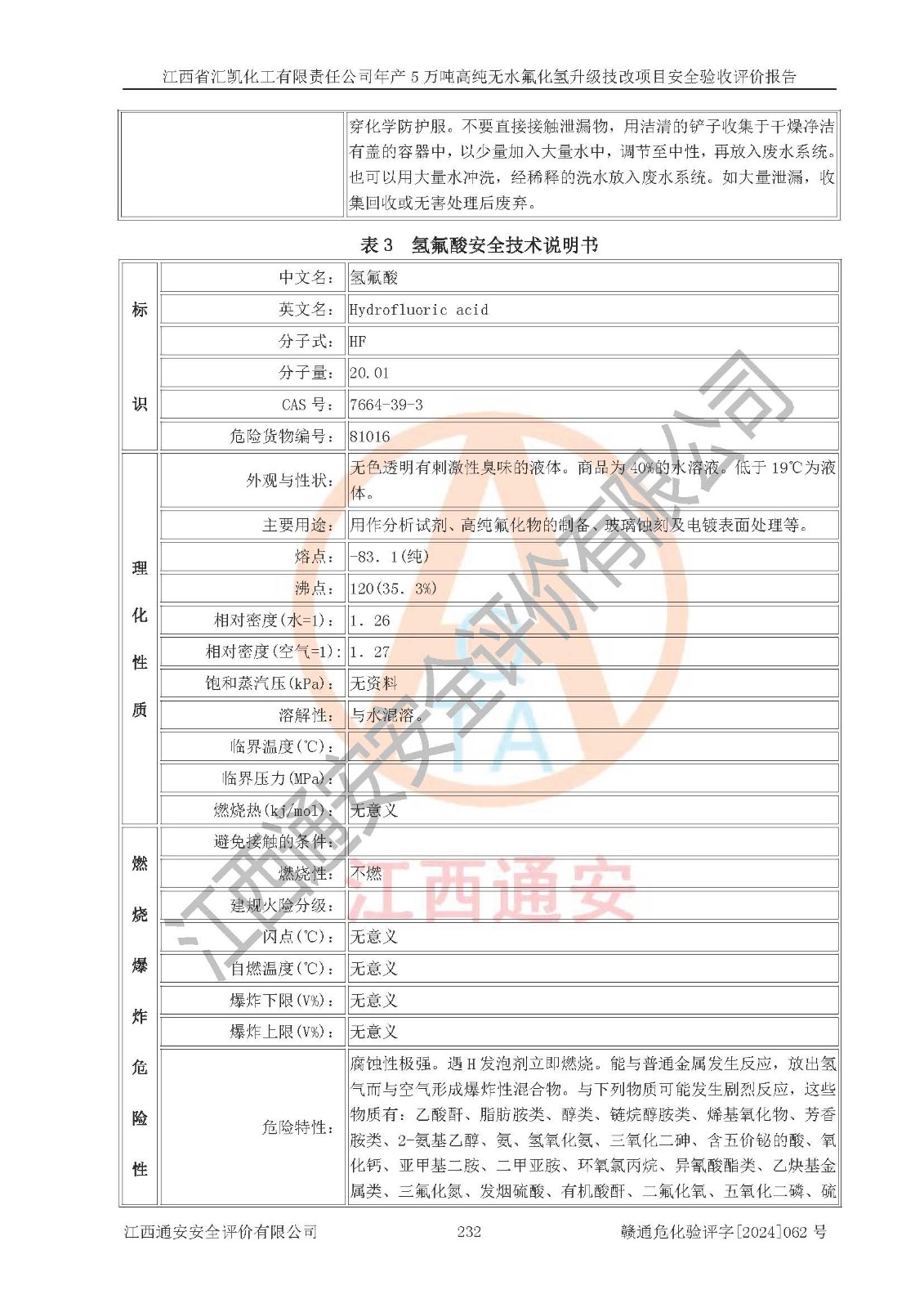 评价结论 | 江西省汇凯化工有限责任公司年产5万吨高纯无水氟化氢升级技改项目现场情况与设计图纸一致,DCS系统和SIS系统符合设计要求、运行正常,主要负责人、安全管理人员等有关从业人员资质符合《江西省危险化学品安全专项整治三年行动实施方案》要求,安全设施及安全管理符合**及有关部门关于安全生产法律、法规、标准的要求,该项目试生产以来,工艺设备运行正常,安全设施和采取的安全技术措施符合设计要求并达到预期结果,可以满足建设项目安全生产的要求,安全生产管理**,具备了安全设施竣工验收条件。 | ||||||