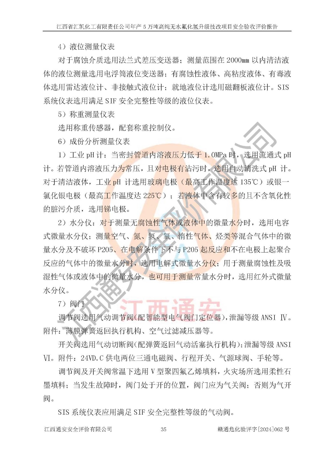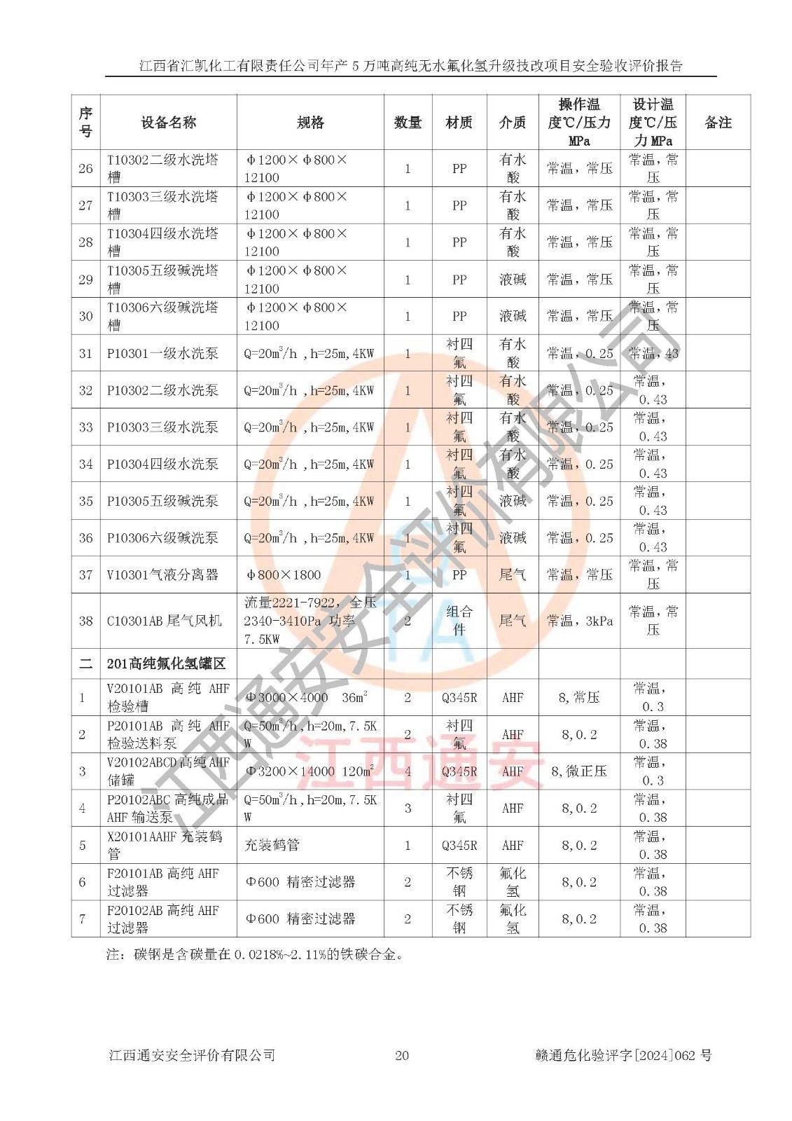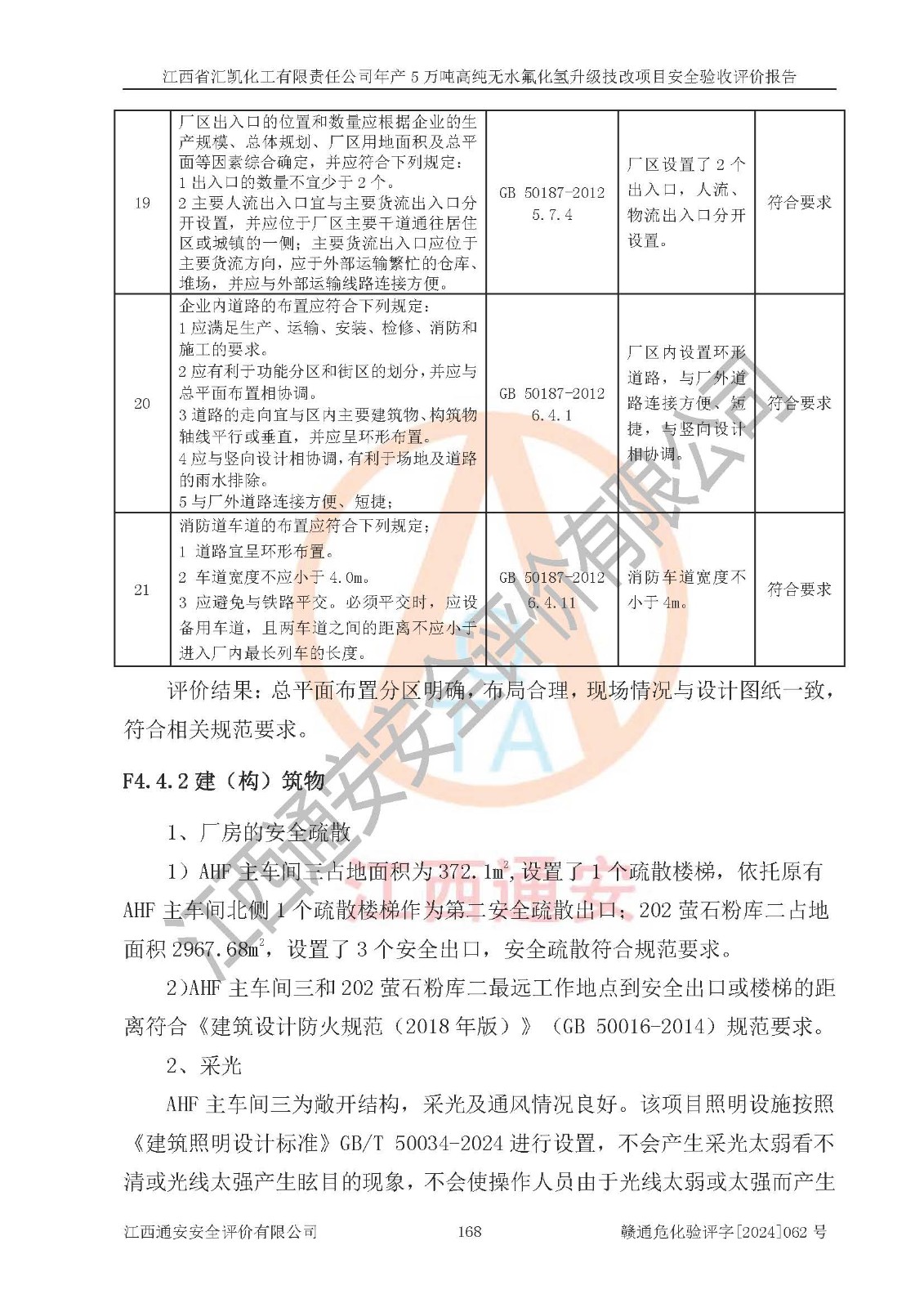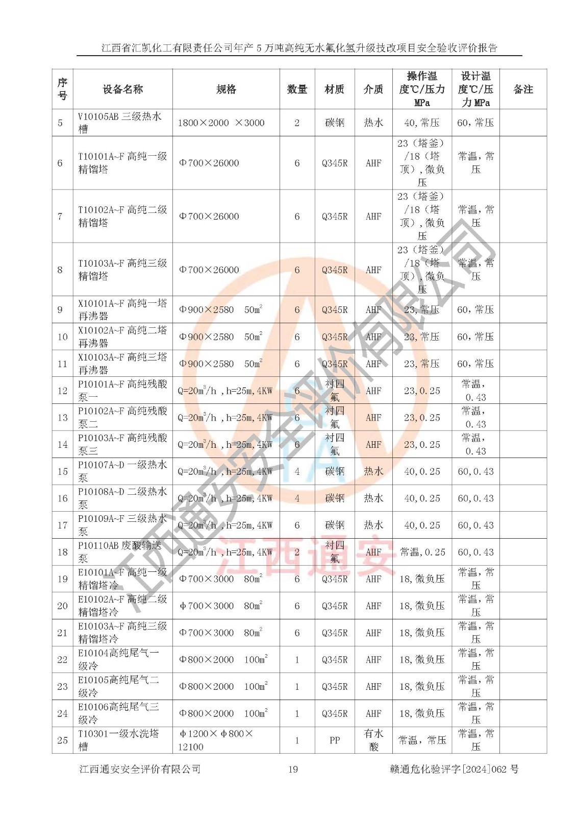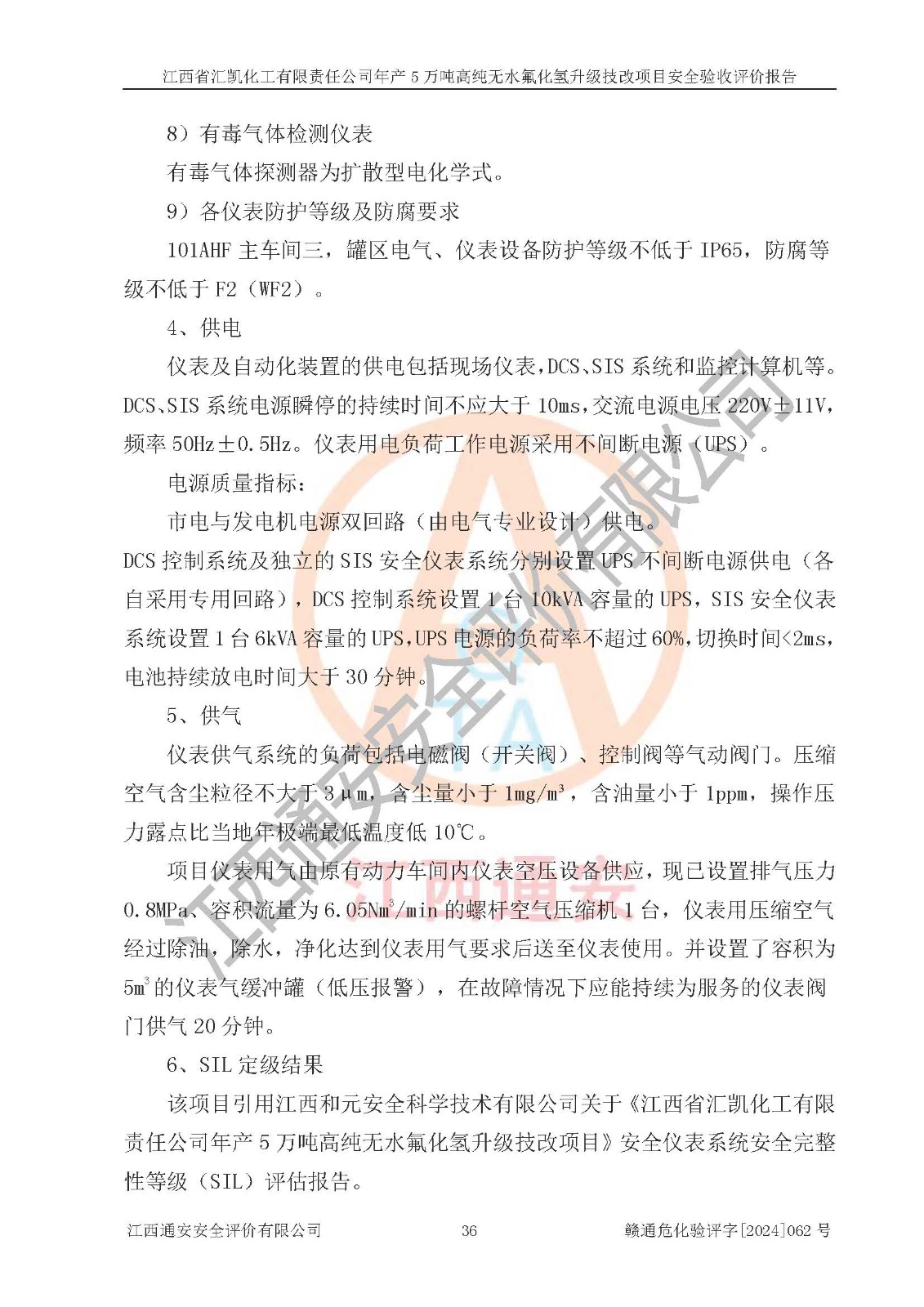 评价结论 | 江西省汇凯化工有限责任公司年产5万吨高纯无水氟化氢升级技改项目现场情况与设计图纸一致,DCS系统和SIS系统符合设计要求、运行正常,主要负责人、安全管理人员等有关从业人员资质符合《江西省危险化学品安全专项整治三年行动实施方案》要求,安全设施及安全管理符合**及有关部门关于安全生产法律、法规、标准的要求,该项目试生产以来,工艺设备运行正常,安全设施和采取的安全技术措施符合设计要求并达到预期结果,可以满足建设项目安全生产的要求,安全生产管理**,具备了安全设施竣工验收条件。 | ||||||