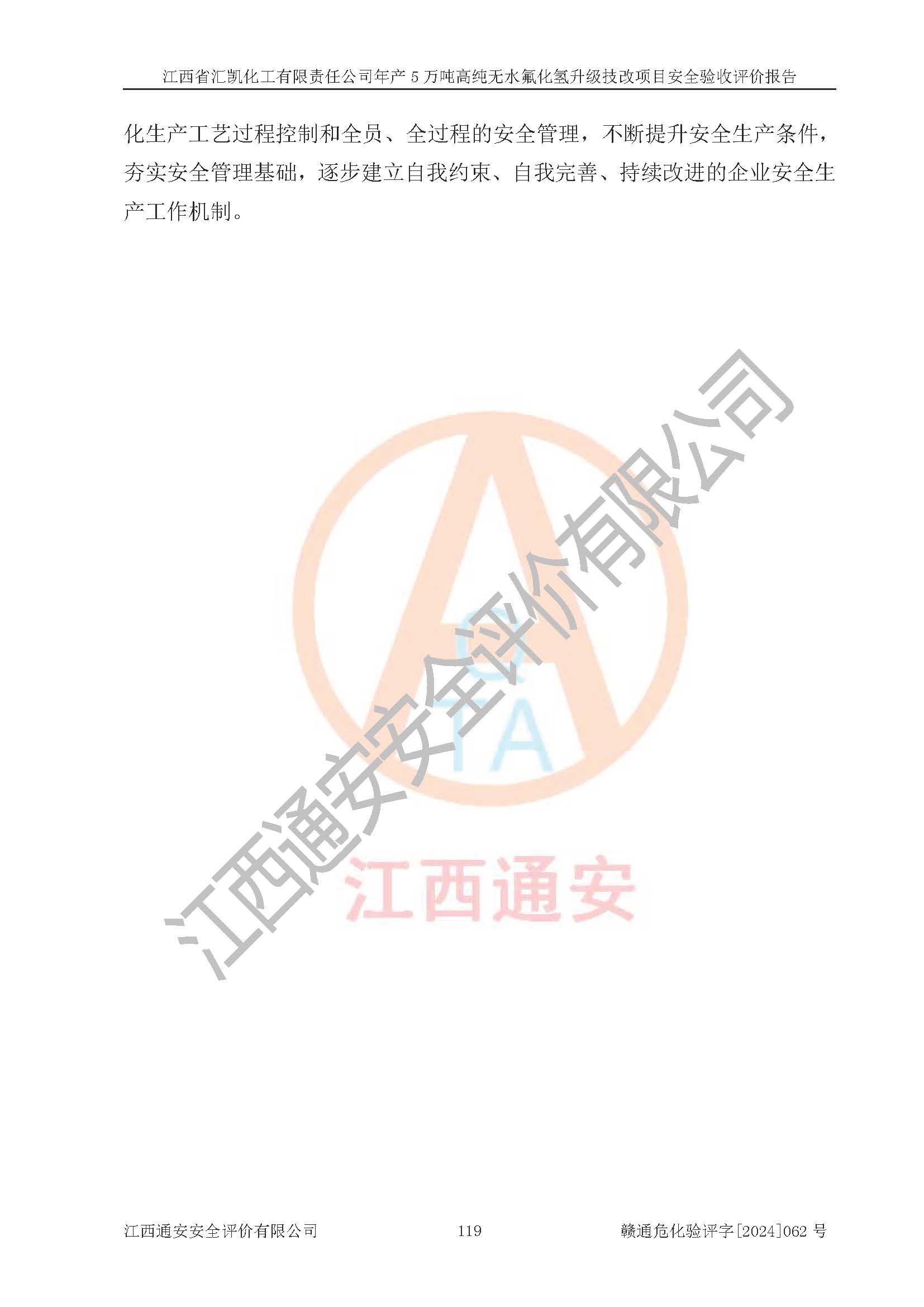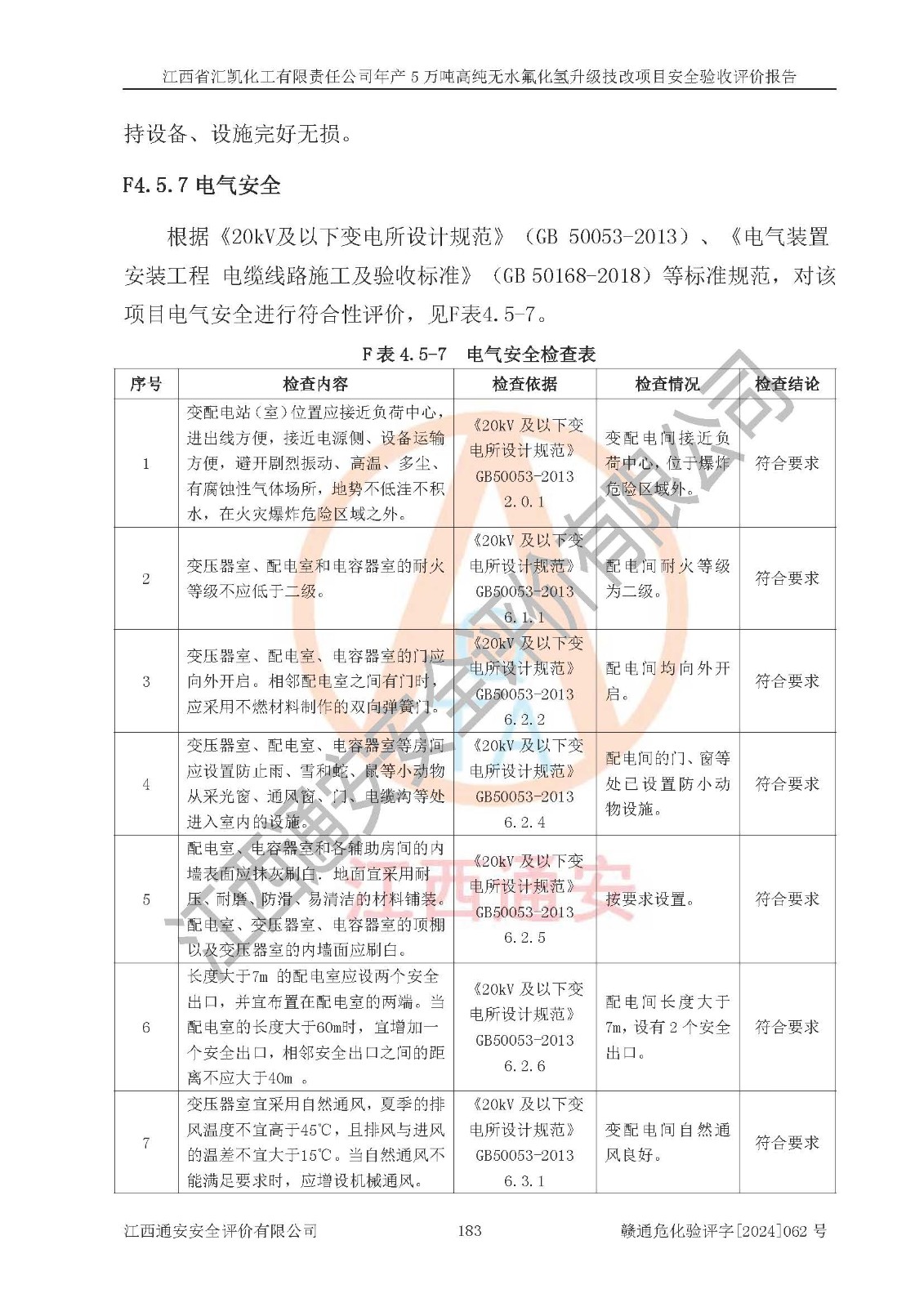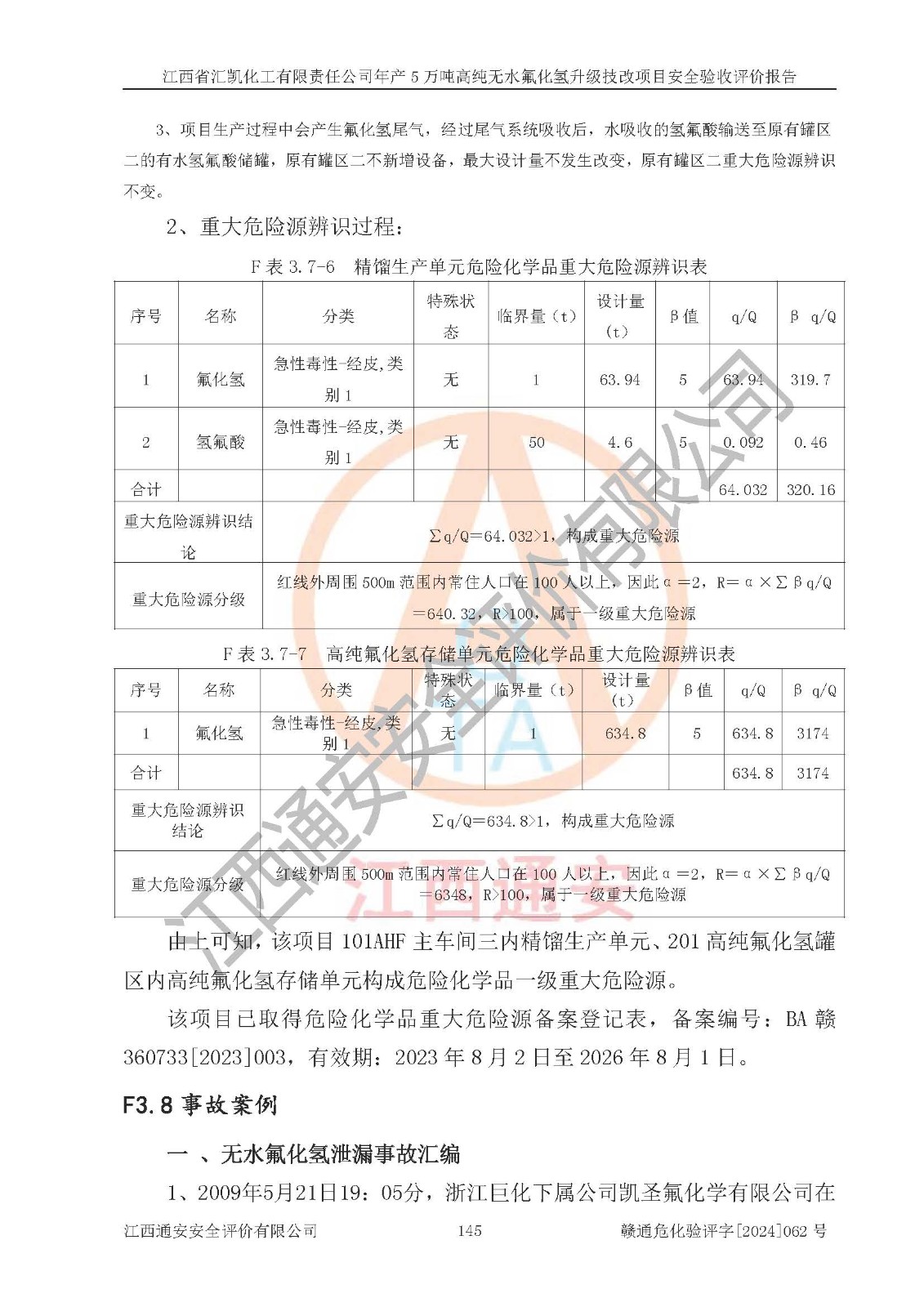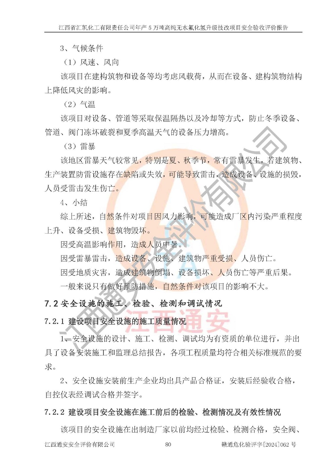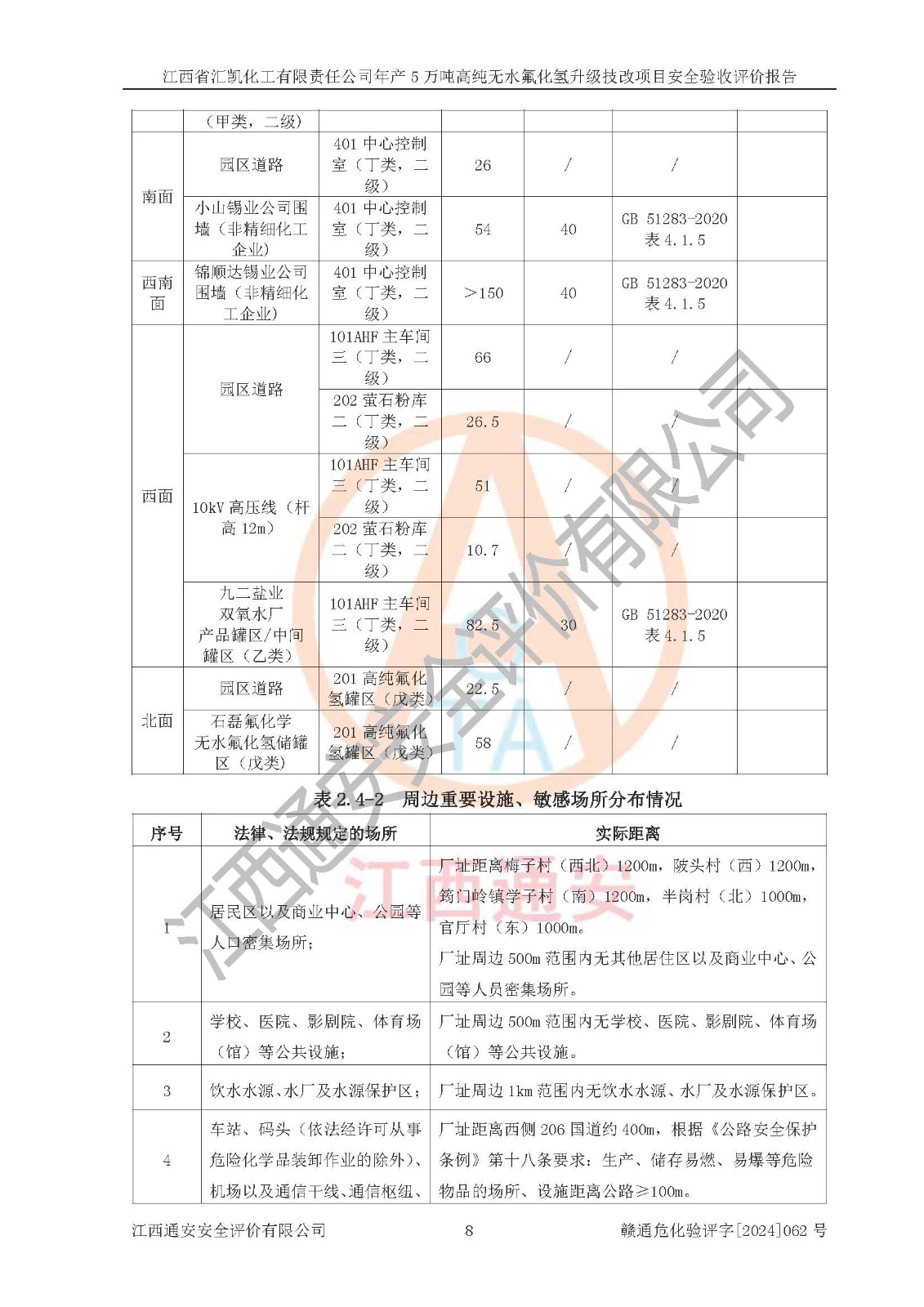 评价结论 | 江西省汇凯化工有限责任公司年产5万吨高纯无水氟化氢升级技改项目现场情况与设计图纸一致,DCS系统和SIS系统符合设计要求、运行正常,主要负责人、安全管理人员等有关从业人员资质符合《江西省危险化学品安全专项整治三年行动实施方案》要求,安全设施及安全管理符合**及有关部门关于安全生产法律、法规、标准的要求,该项目试生产以来,工艺设备运行正常,安全设施和采取的安全技术措施符合设计要求并达到预期结果,可以满足建设项目安全生产的要求,安全生产管理**,具备了安全设施竣工验收条件。 | ||||||