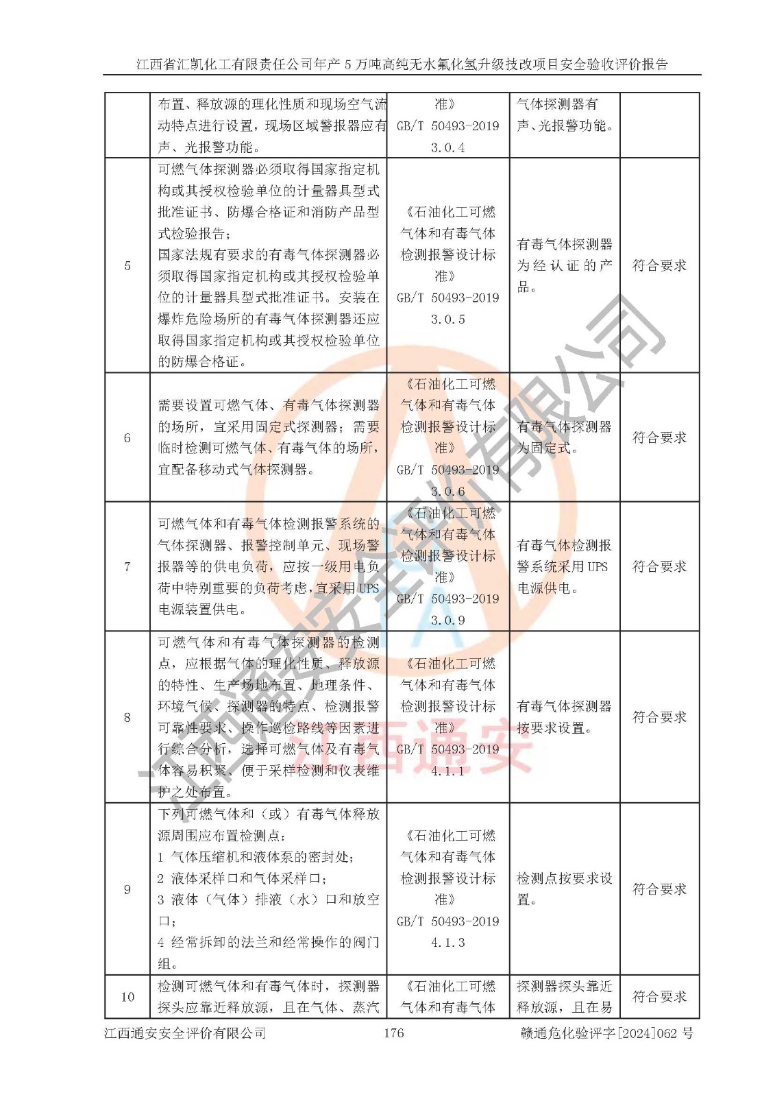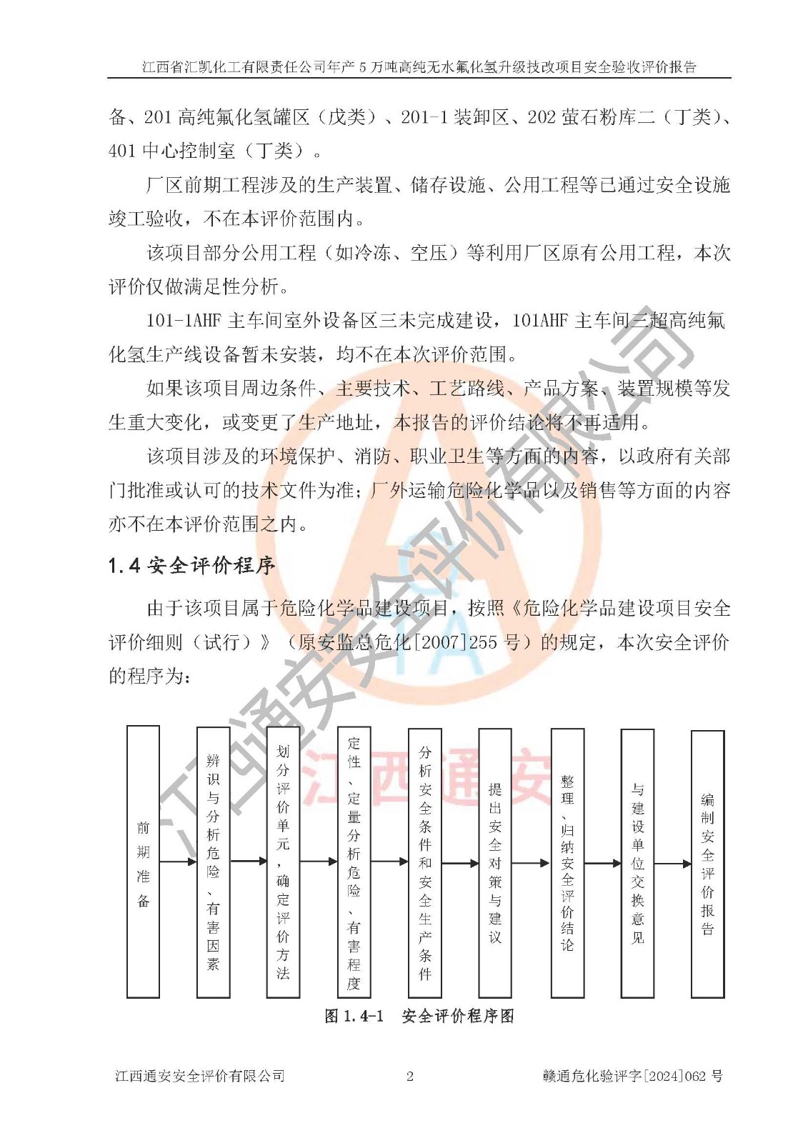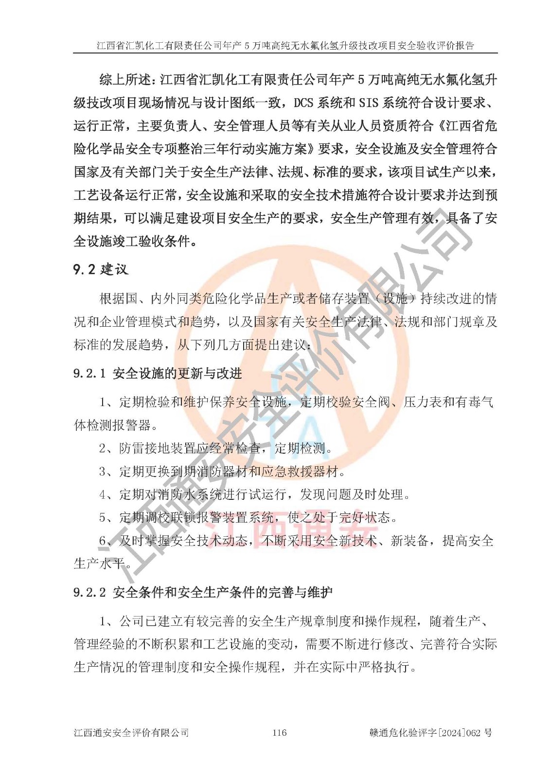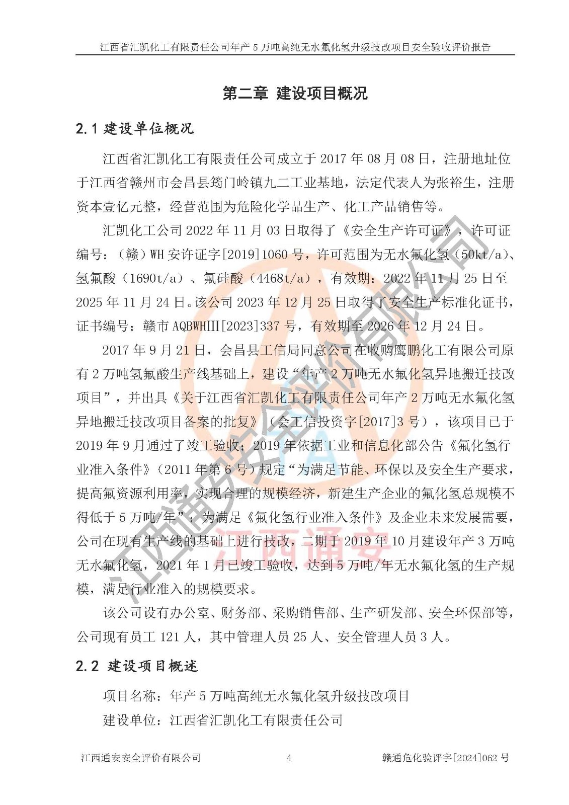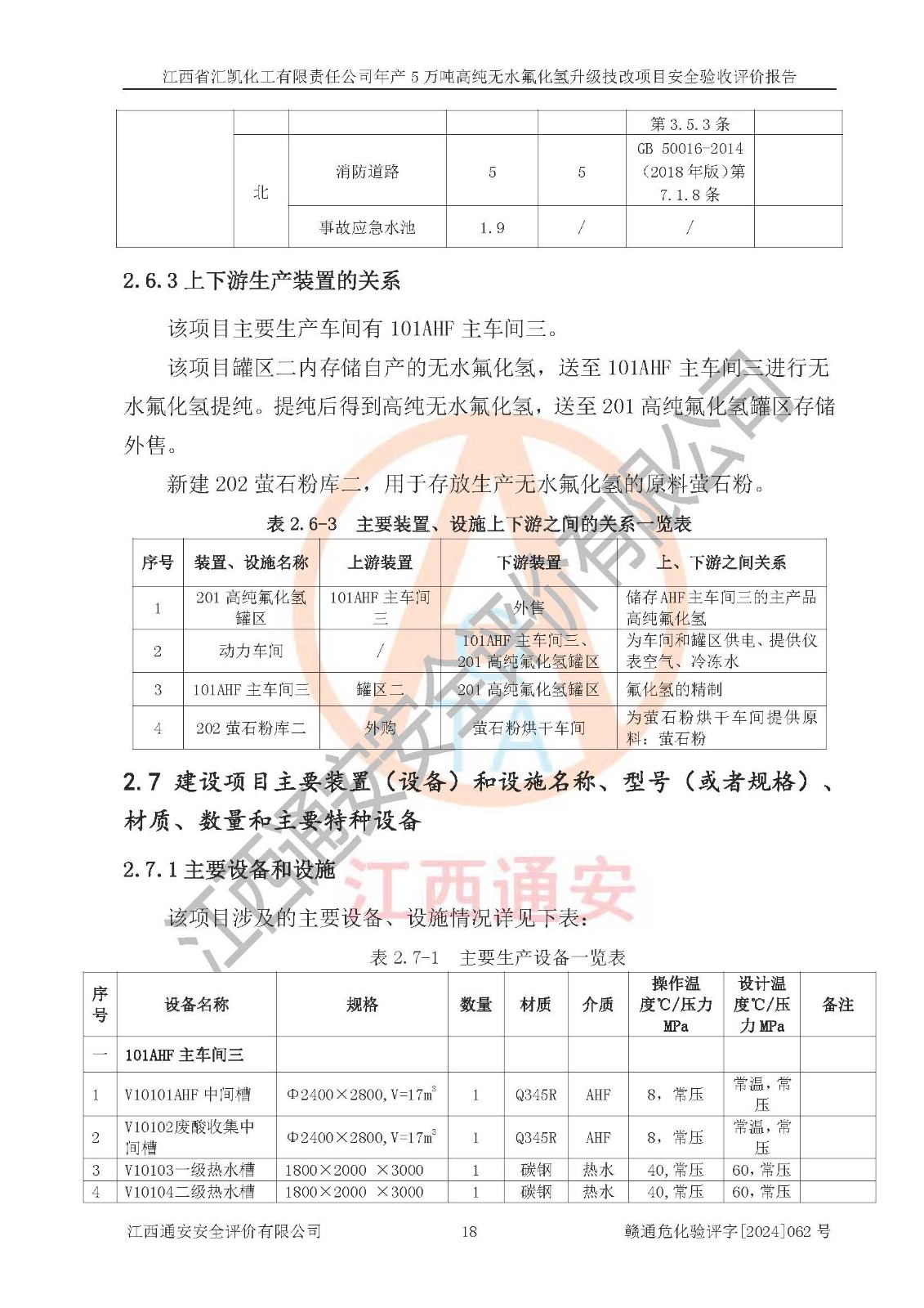 评价结论 | 江西省汇凯化工有限责任公司年产5万吨高纯无水氟化氢升级技改项目现场情况与设计图纸一致,DCS系统和SIS系统符合设计要求、运行正常,主要负责人、安全管理人员等有关从业人员资质符合《江西省危险化学品安全专项整治三年行动实施方案》要求,安全设施及安全管理符合**及有关部门关于安全生产法律、法规、标准的要求,该项目试生产以来,工艺设备运行正常,安全设施和采取的安全技术措施符合设计要求并达到预期结果,可以满足建设项目安全生产的要求,安全生产管理**,具备了安全设施竣工验收条件。 | ||||||