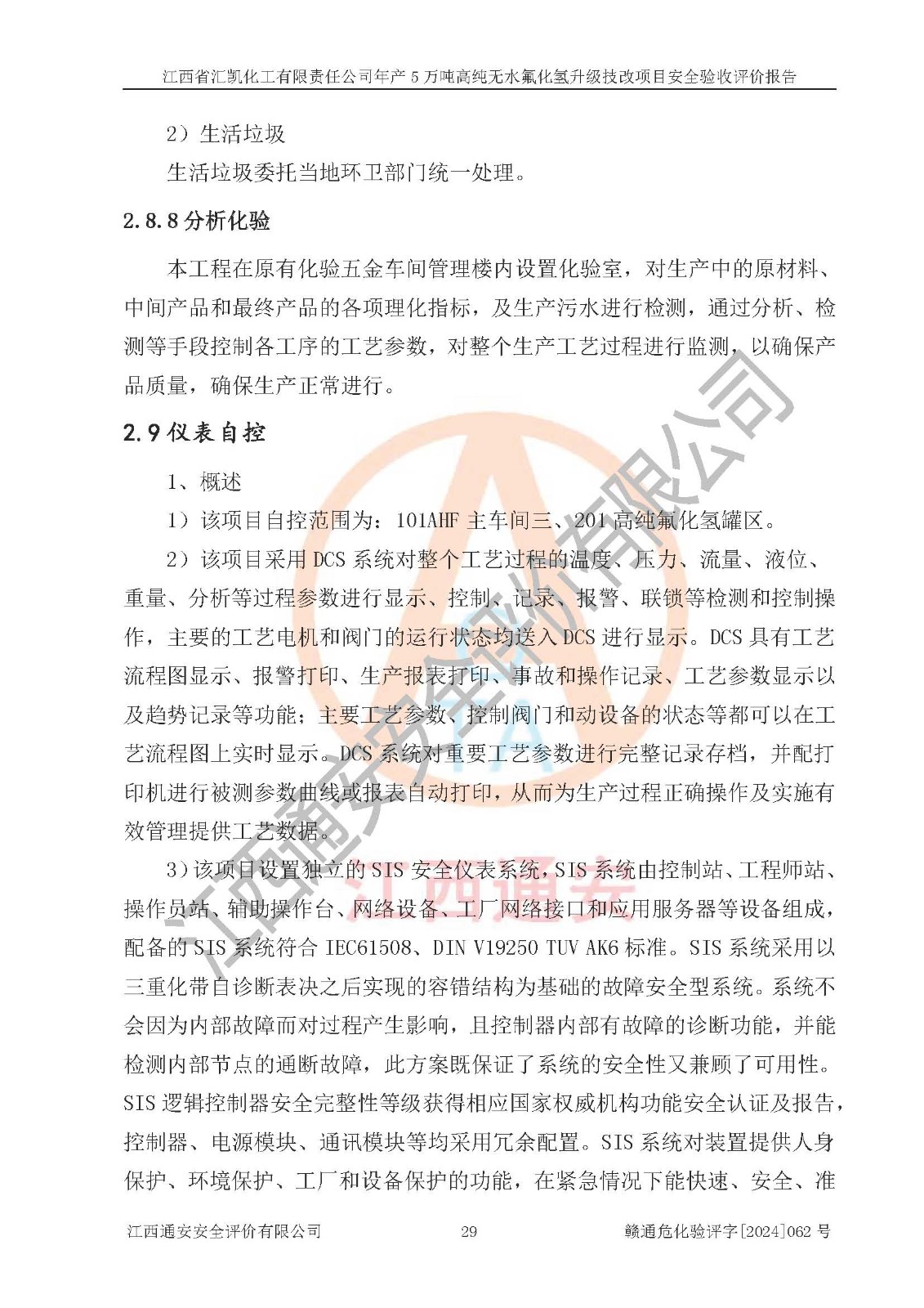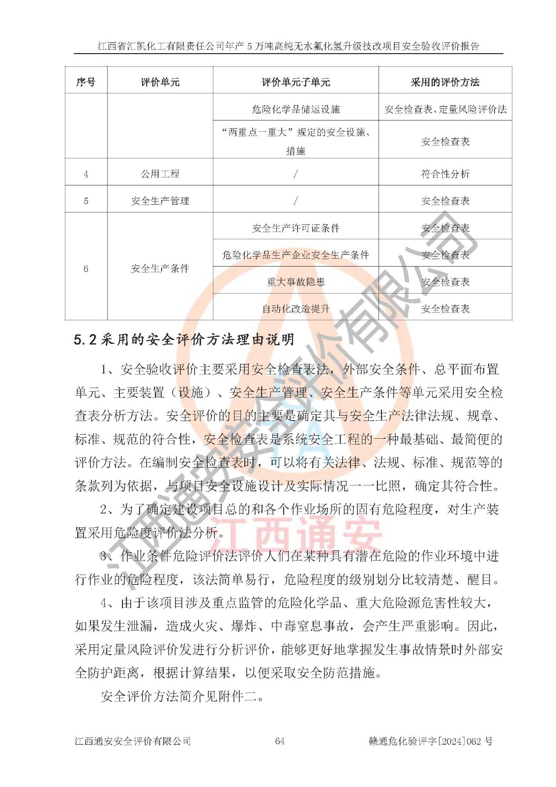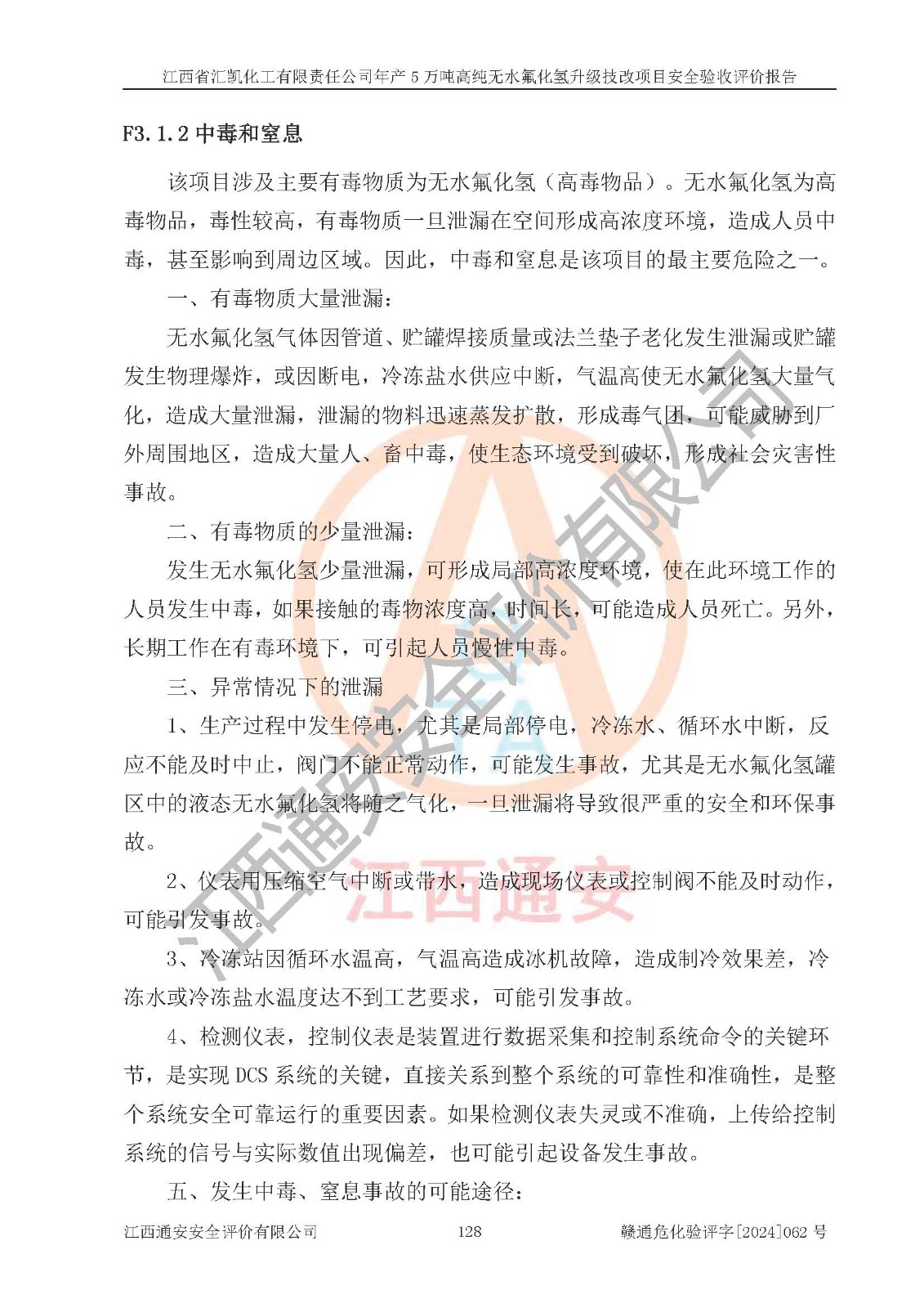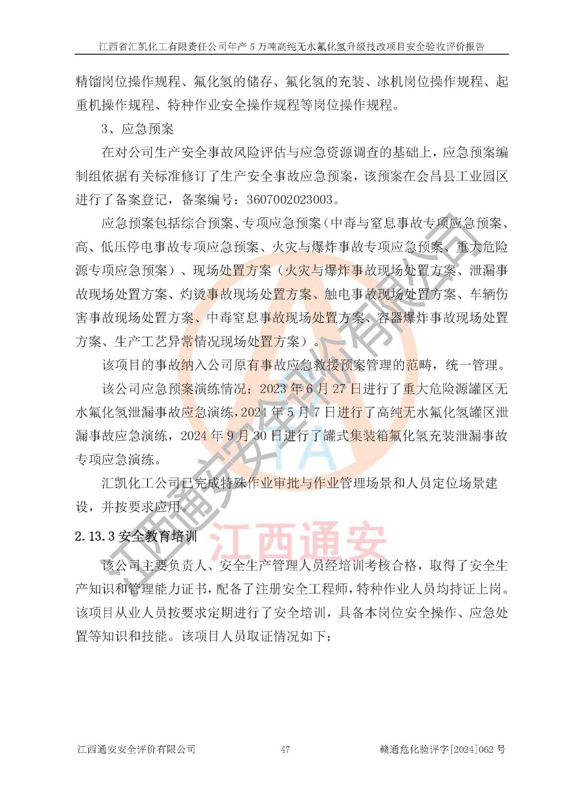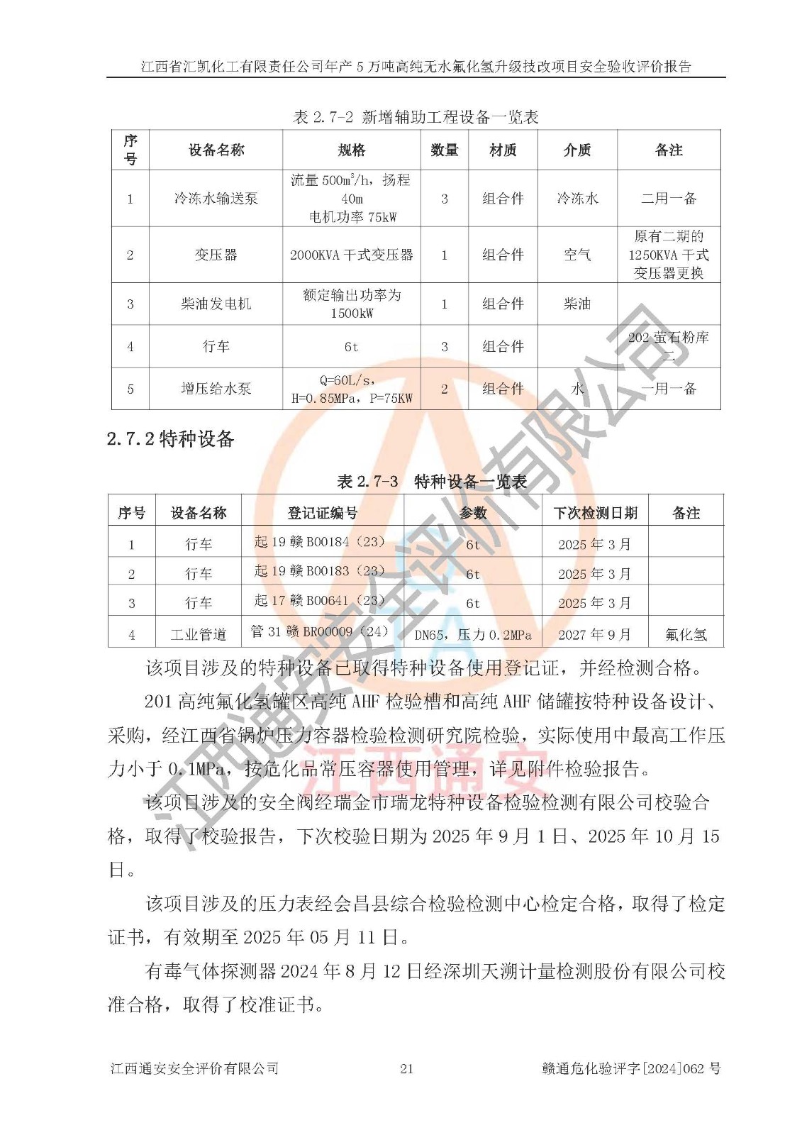 评价结论 | 江西省汇凯化工有限责任公司年产5万吨高纯无水氟化氢升级技改项目现场情况与设计图纸一致,DCS系统和SIS系统符合设计要求、运行正常,主要负责人、安全管理人员等有关从业人员资质符合《江西省危险化学品安全专项整治三年行动实施方案》要求,安全设施及安全管理符合**及有关部门关于安全生产法律、法规、标准的要求,该项目试生产以来,工艺设备运行正常,安全设施和采取的安全技术措施符合设计要求并达到预期结果,可以满足建设项目安全生产的要求,安全生产管理**,具备了安全设施竣工验收条件。 | ||||||