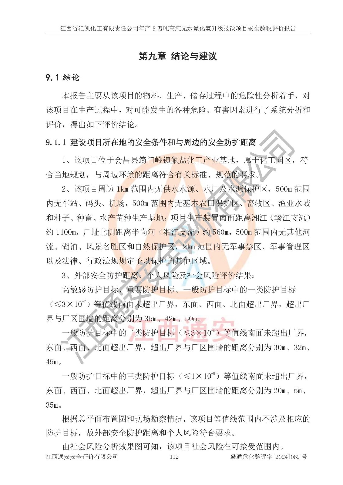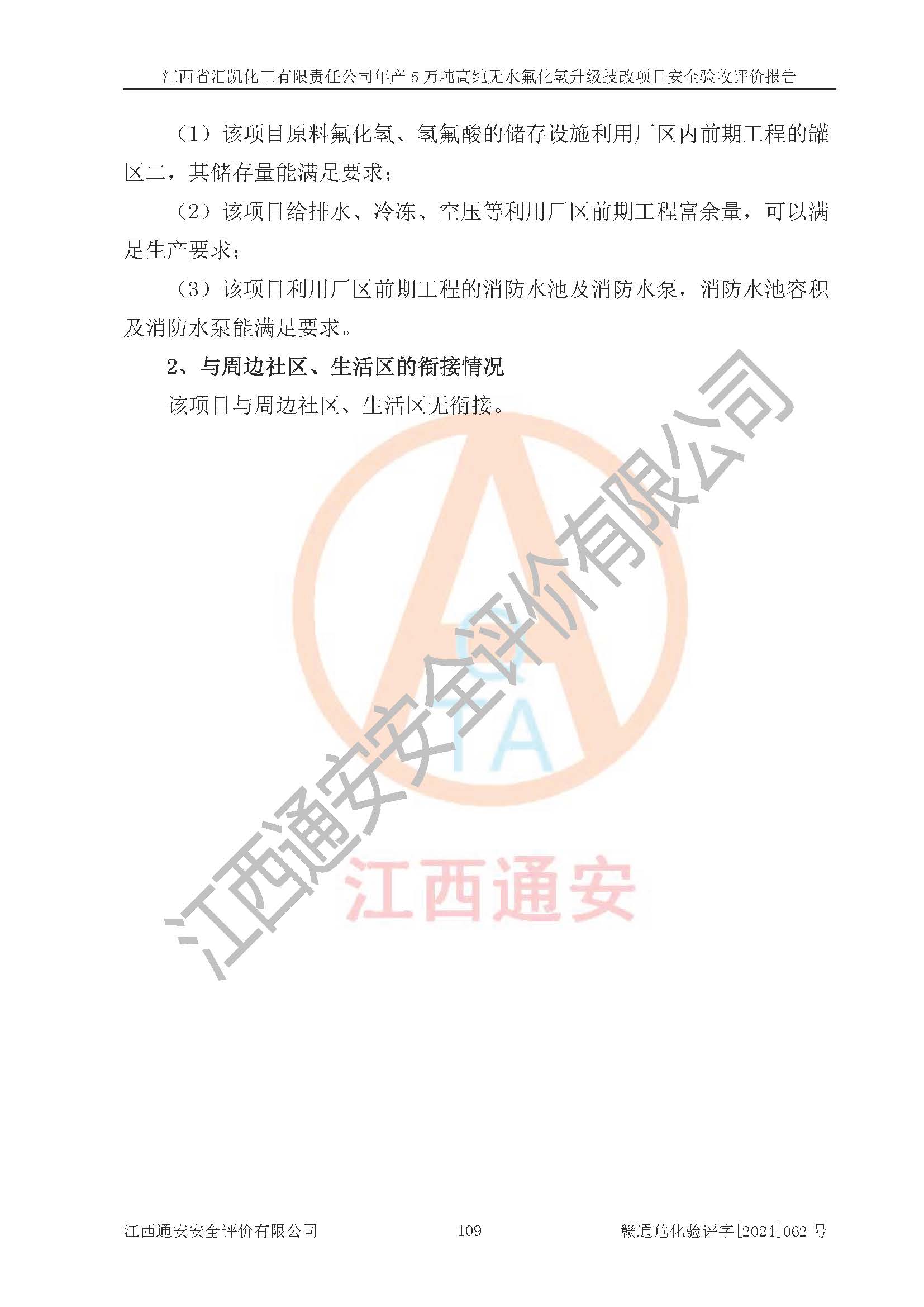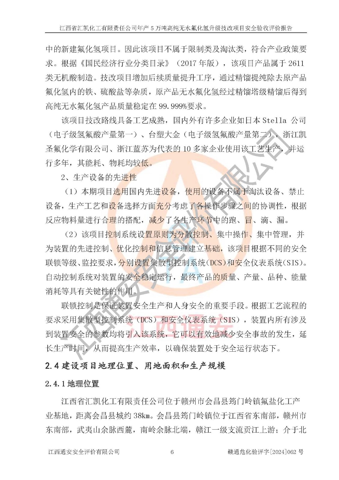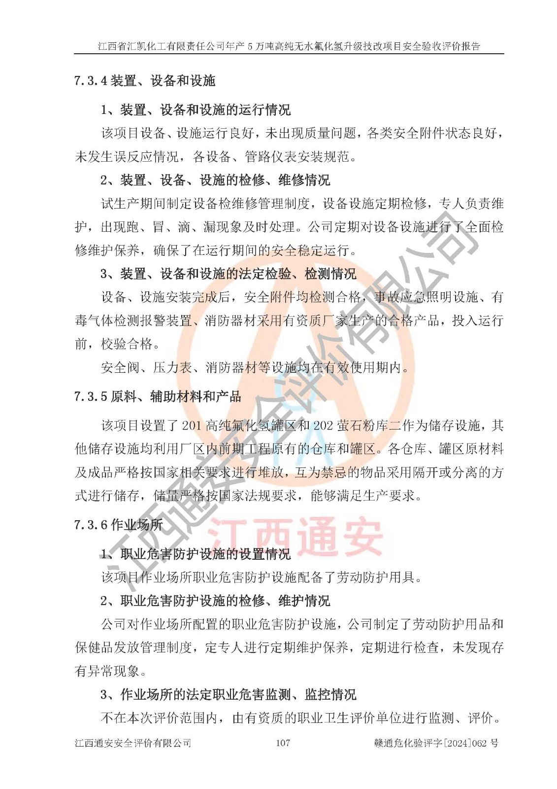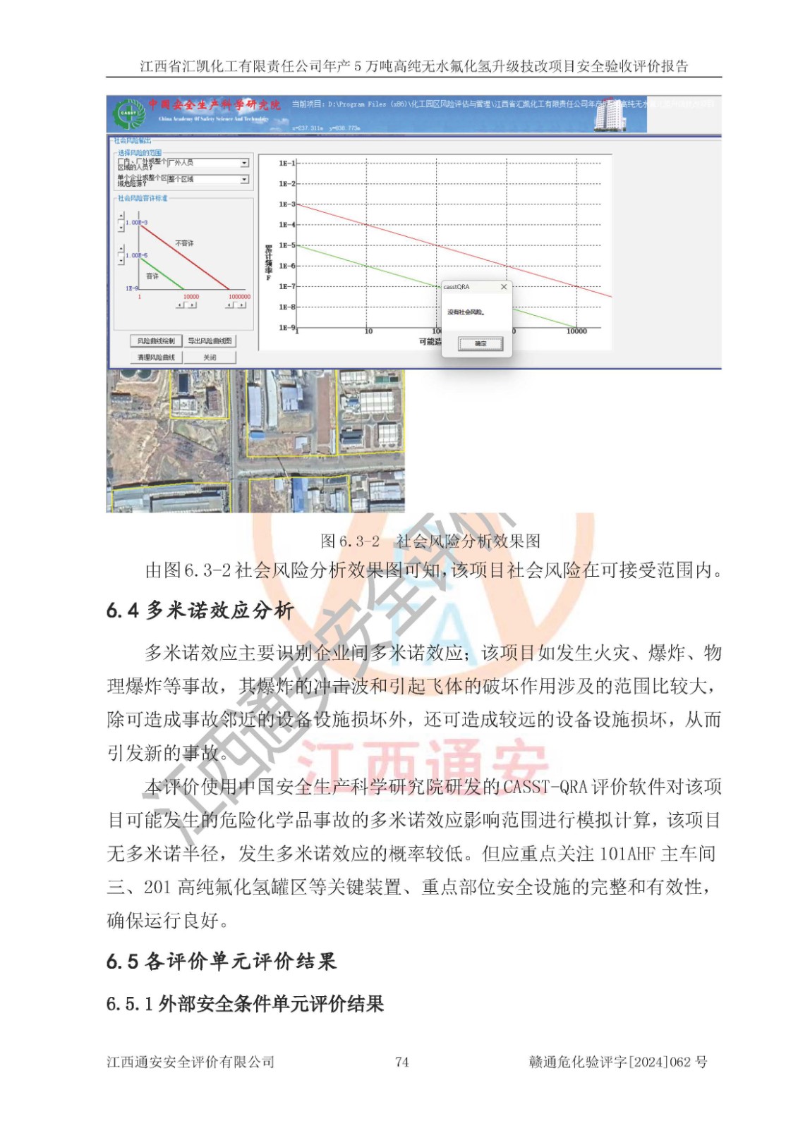 评价结论 | 江西省汇凯化工有限责任公司年产5万吨高纯无水氟化氢升级技改项目现场情况与设计图纸一致,DCS系统和SIS系统符合设计要求、运行正常,主要负责人、安全管理人员等有关从业人员资质符合《江西省危险化学品安全专项整治三年行动实施方案》要求,安全设施及安全管理符合**及有关部门关于安全生产法律、法规、标准的要求,该项目试生产以来,工艺设备运行正常,安全设施和采取的安全技术措施符合设计要求并达到预期结果,可以满足建设项目安全生产的要求,安全生产管理**,具备了安全设施竣工验收条件。 | ||||||