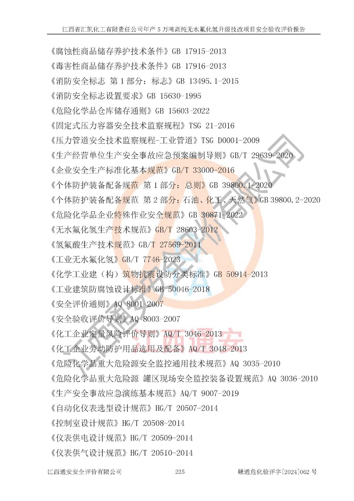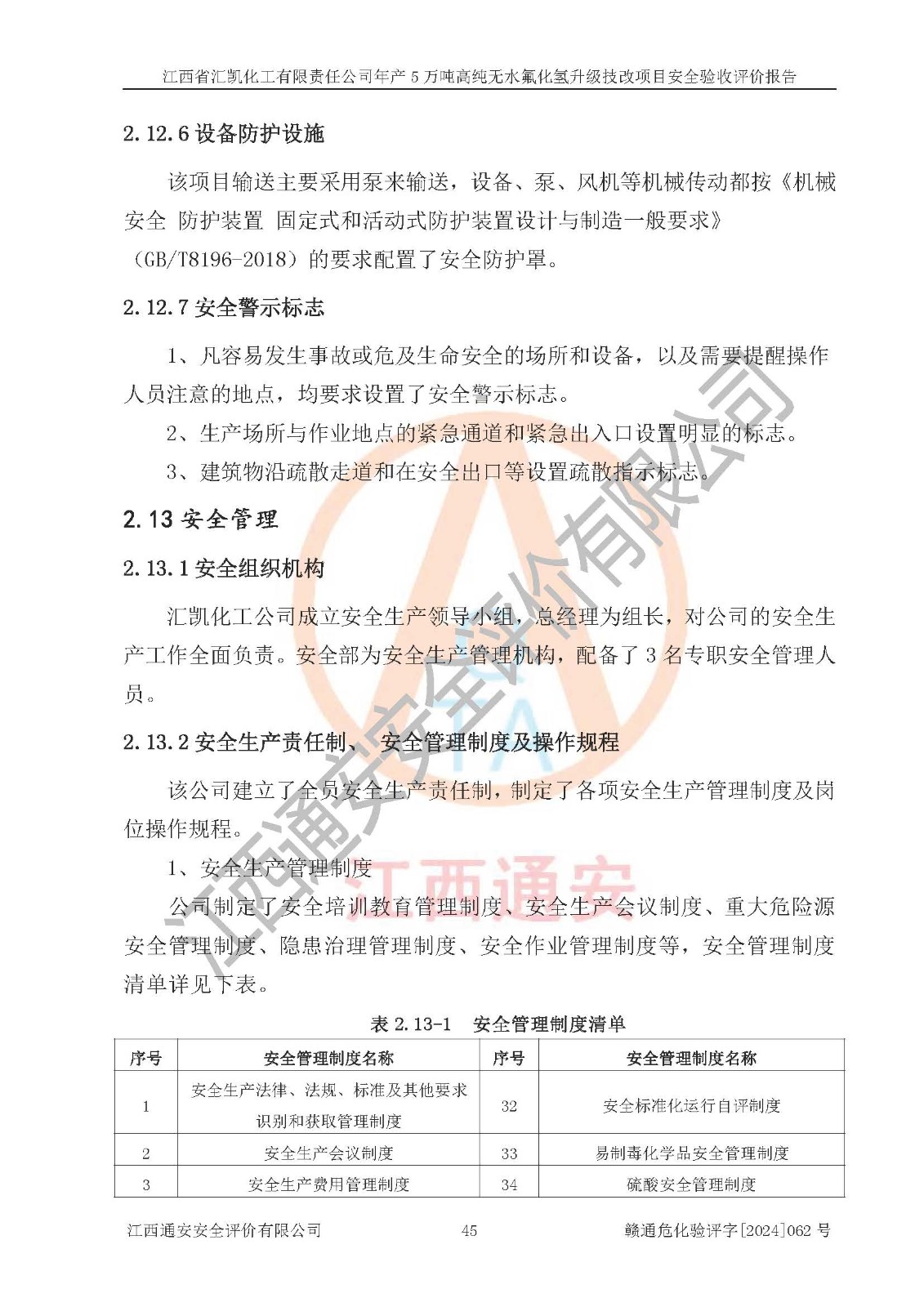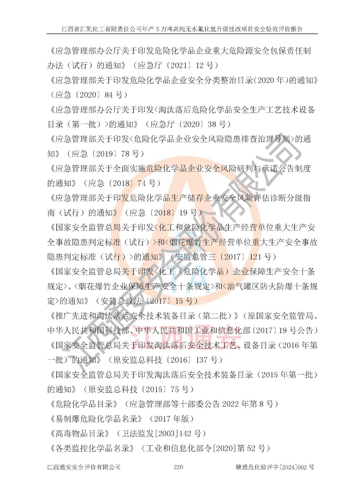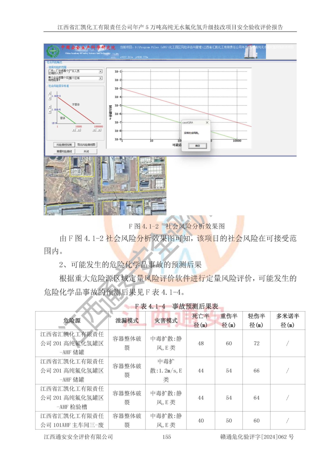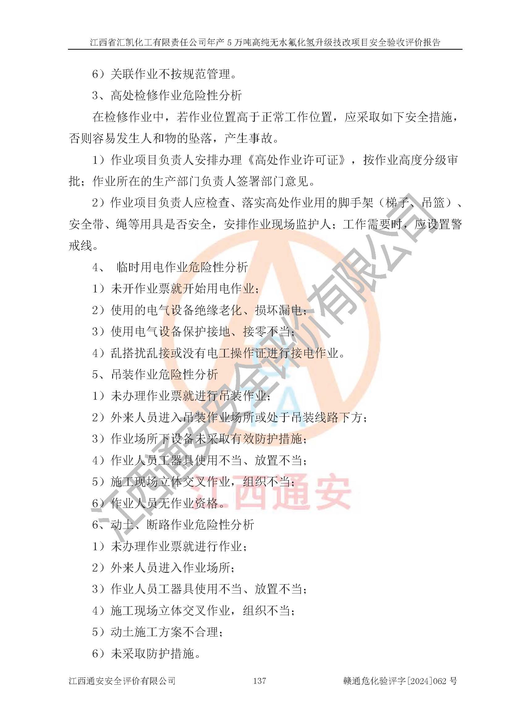 评价结论 | 江西省汇凯化工有限责任公司年产5万吨高纯无水氟化氢升级技改项目现场情况与设计图纸一致,DCS系统和SIS系统符合设计要求、运行正常,主要负责人、安全管理人员等有关从业人员资质符合《江西省危险化学品安全专项整治三年行动实施方案》要求,安全设施及安全管理符合**及有关部门关于安全生产法律、法规、标准的要求,该项目试生产以来,工艺设备运行正常,安全设施和采取的安全技术措施符合设计要求并达到预期结果,可以满足建设项目安全生产的要求,安全生产管理**,具备了安全设施竣工验收条件。 | ||||||
