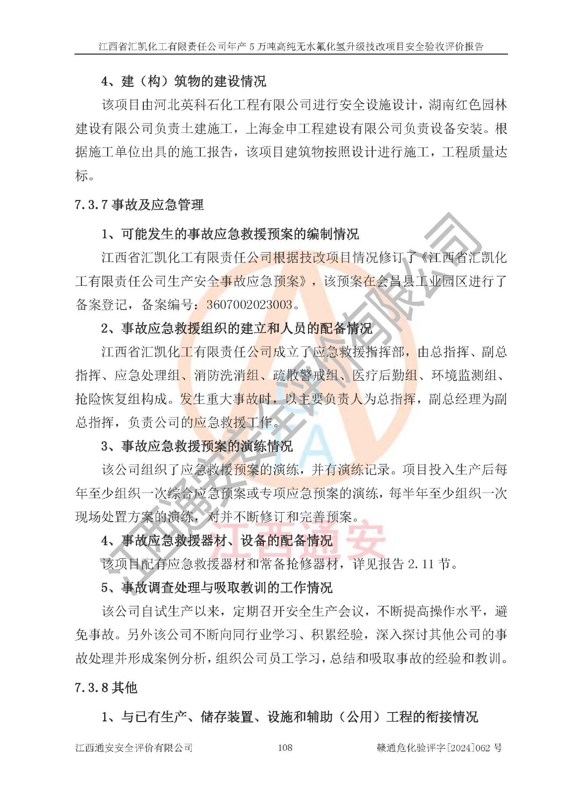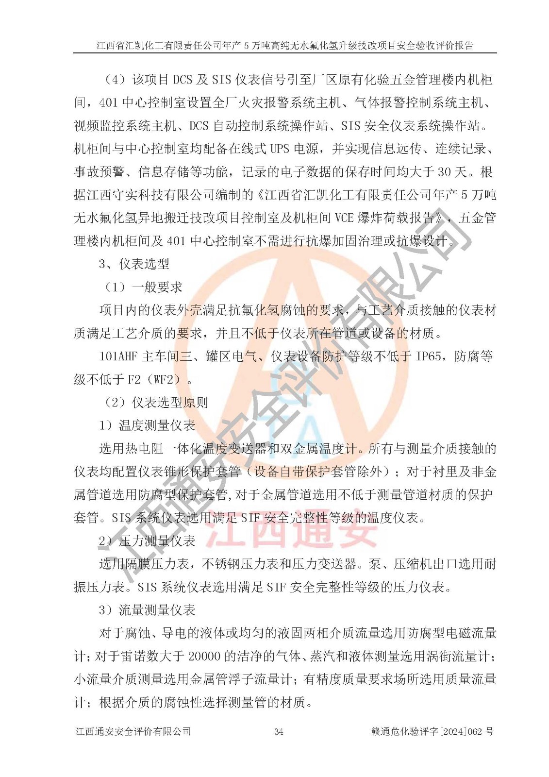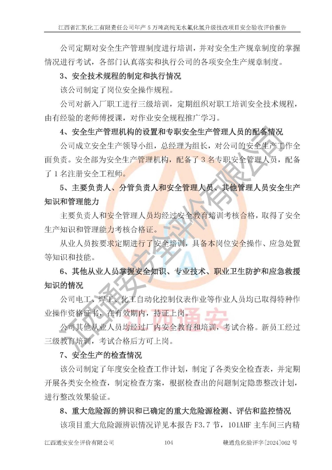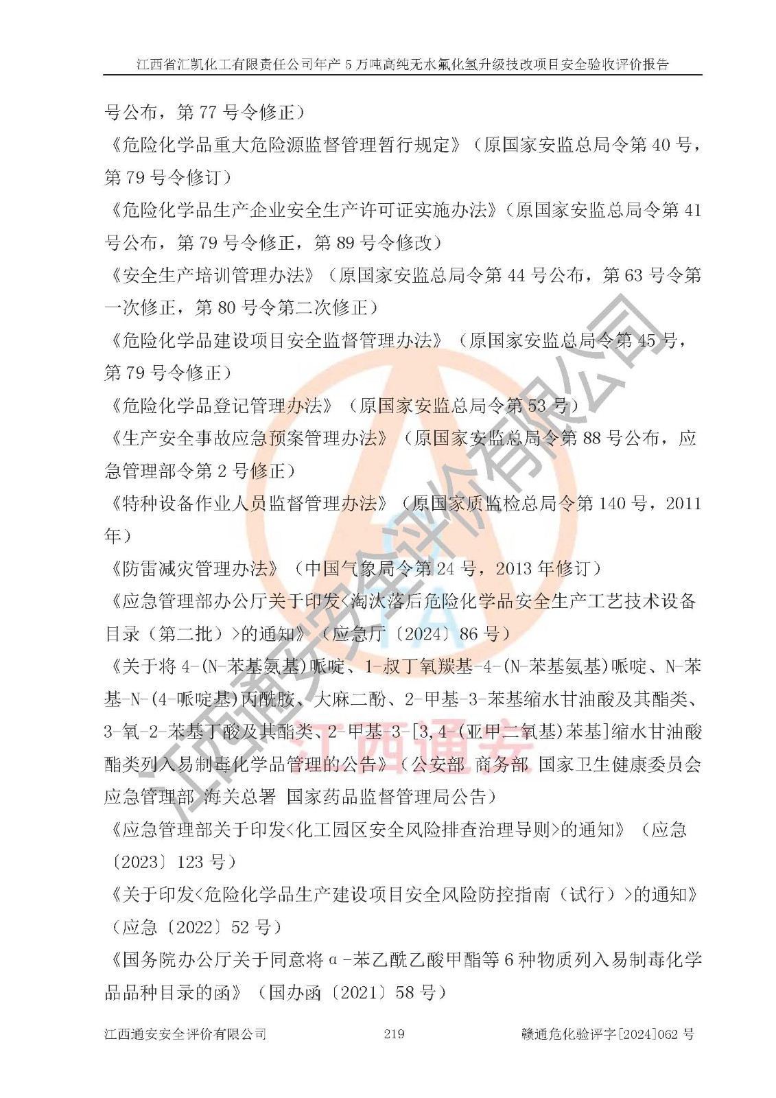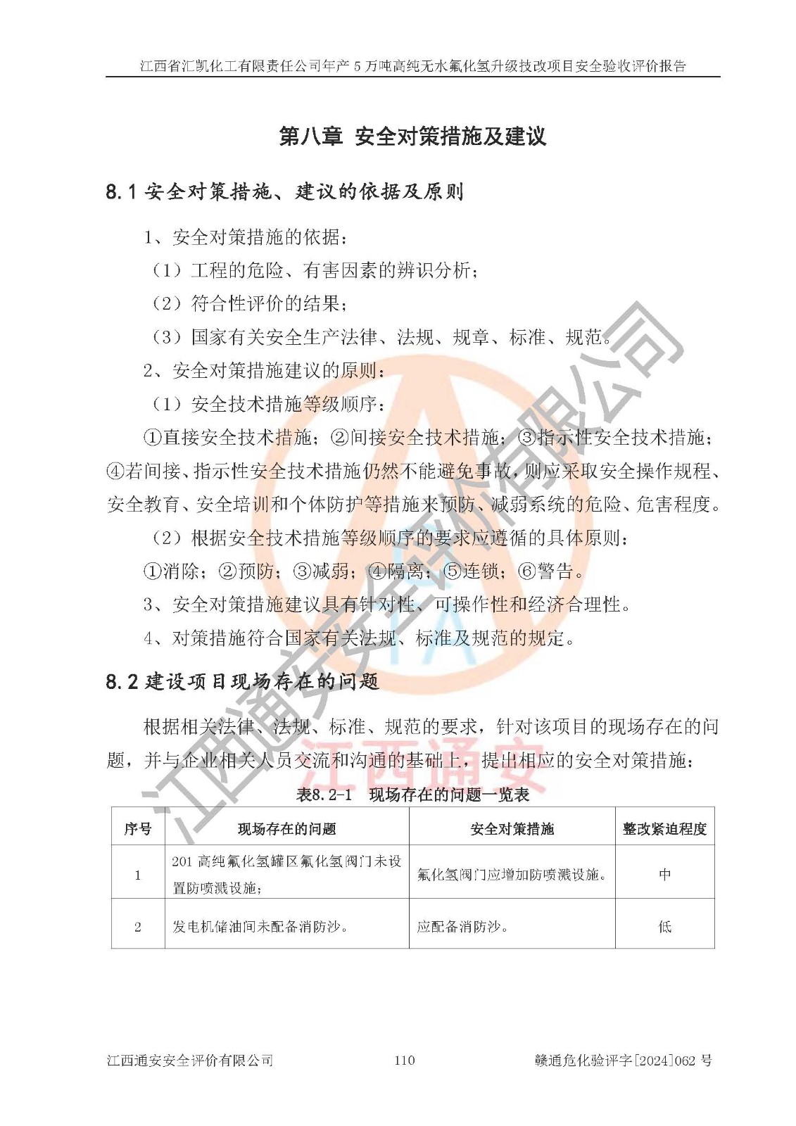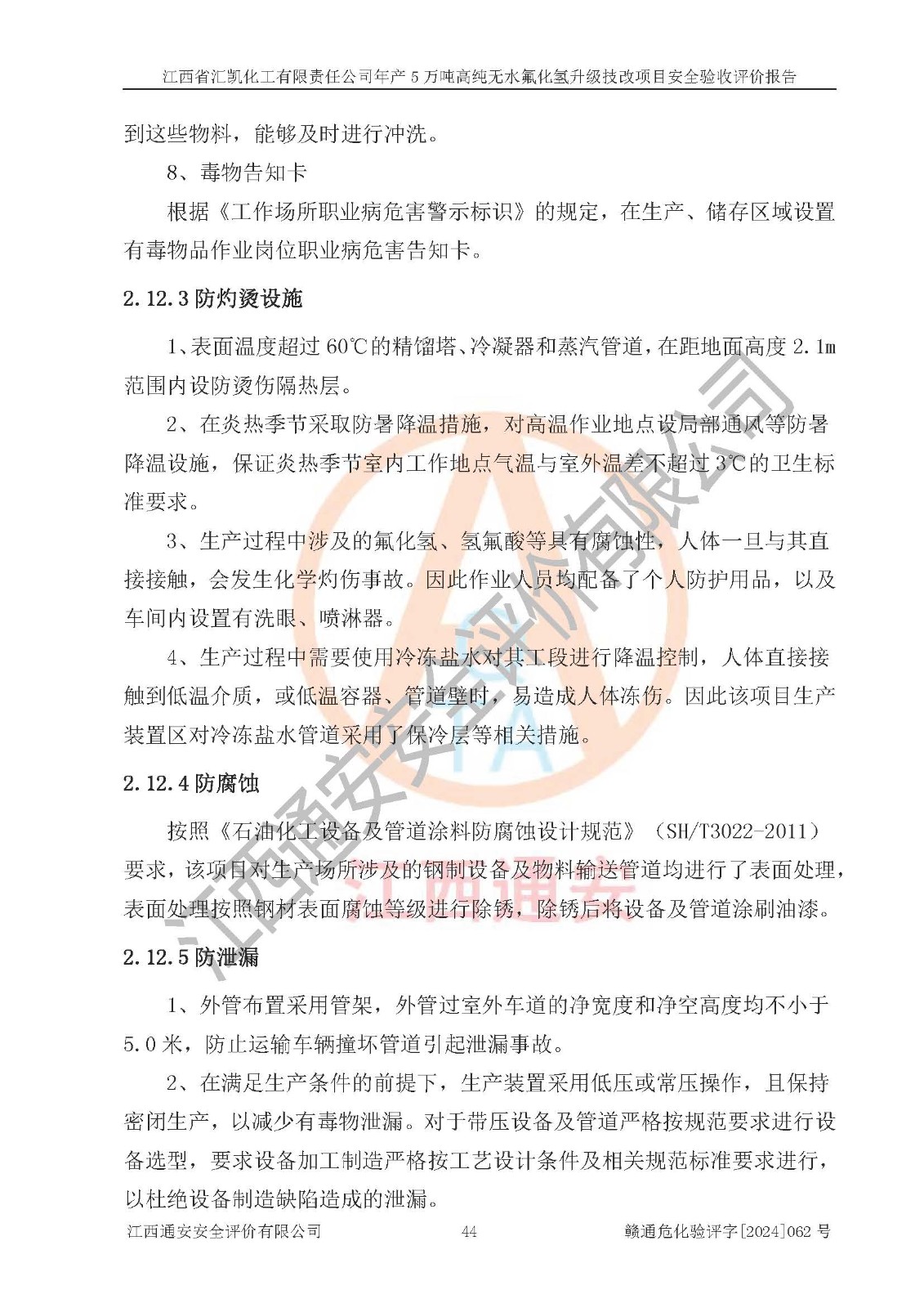 评价结论 | 江西省汇凯化工有限责任公司年产5万吨高纯无水氟化氢升级技改项目现场情况与设计图纸一致,DCS系统和SIS系统符合设计要求、运行正常,主要负责人、安全管理人员等有关从业人员资质符合《江西省危险化学品安全专项整治三年行动实施方案》要求,安全设施及安全管理符合**及有关部门关于安全生产法律、法规、标准的要求,该项目试生产以来,工艺设备运行正常,安全设施和采取的安全技术措施符合设计要求并达到预期结果,可以满足建设项目安全生产的要求,安全生产管理**,具备了安全设施竣工验收条件。 | ||||||