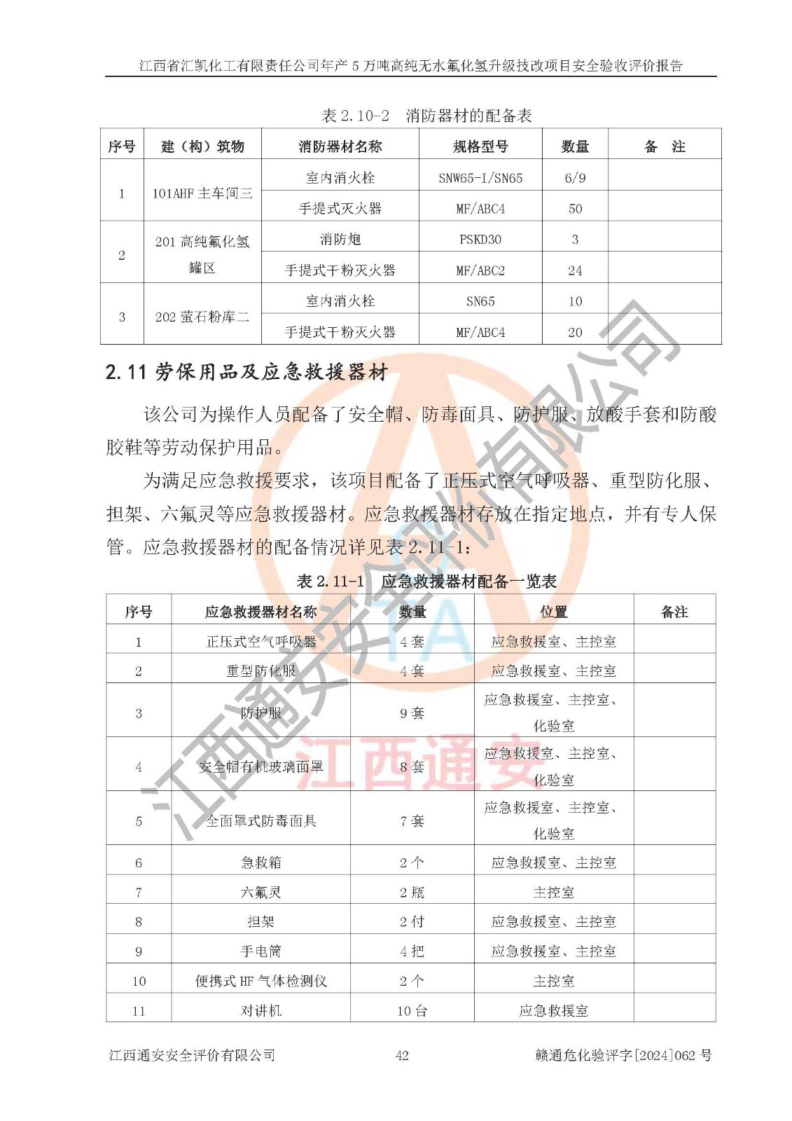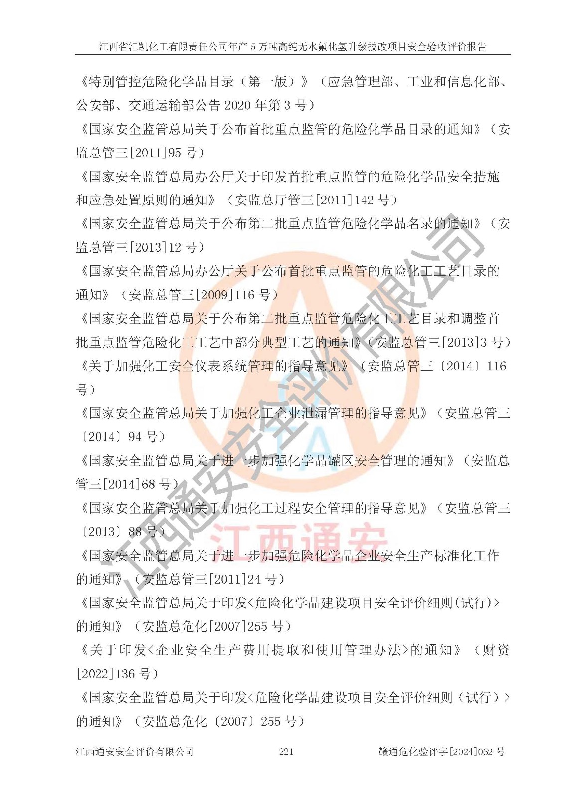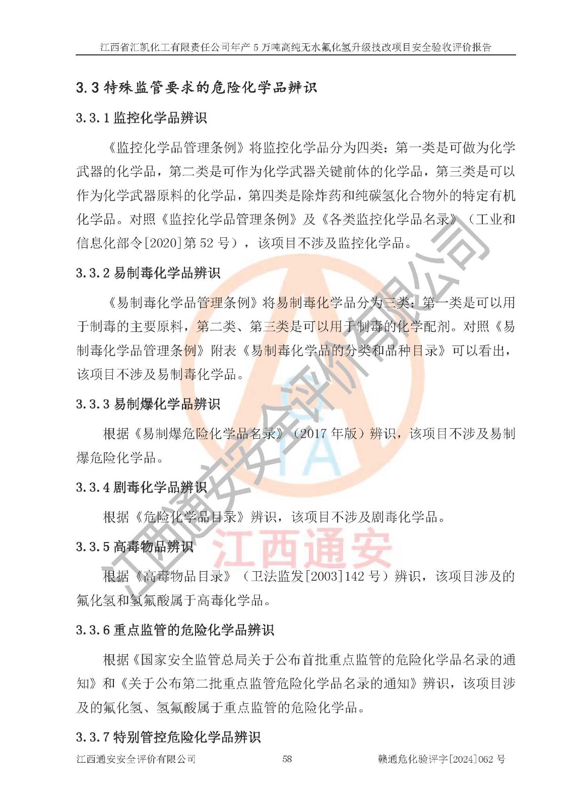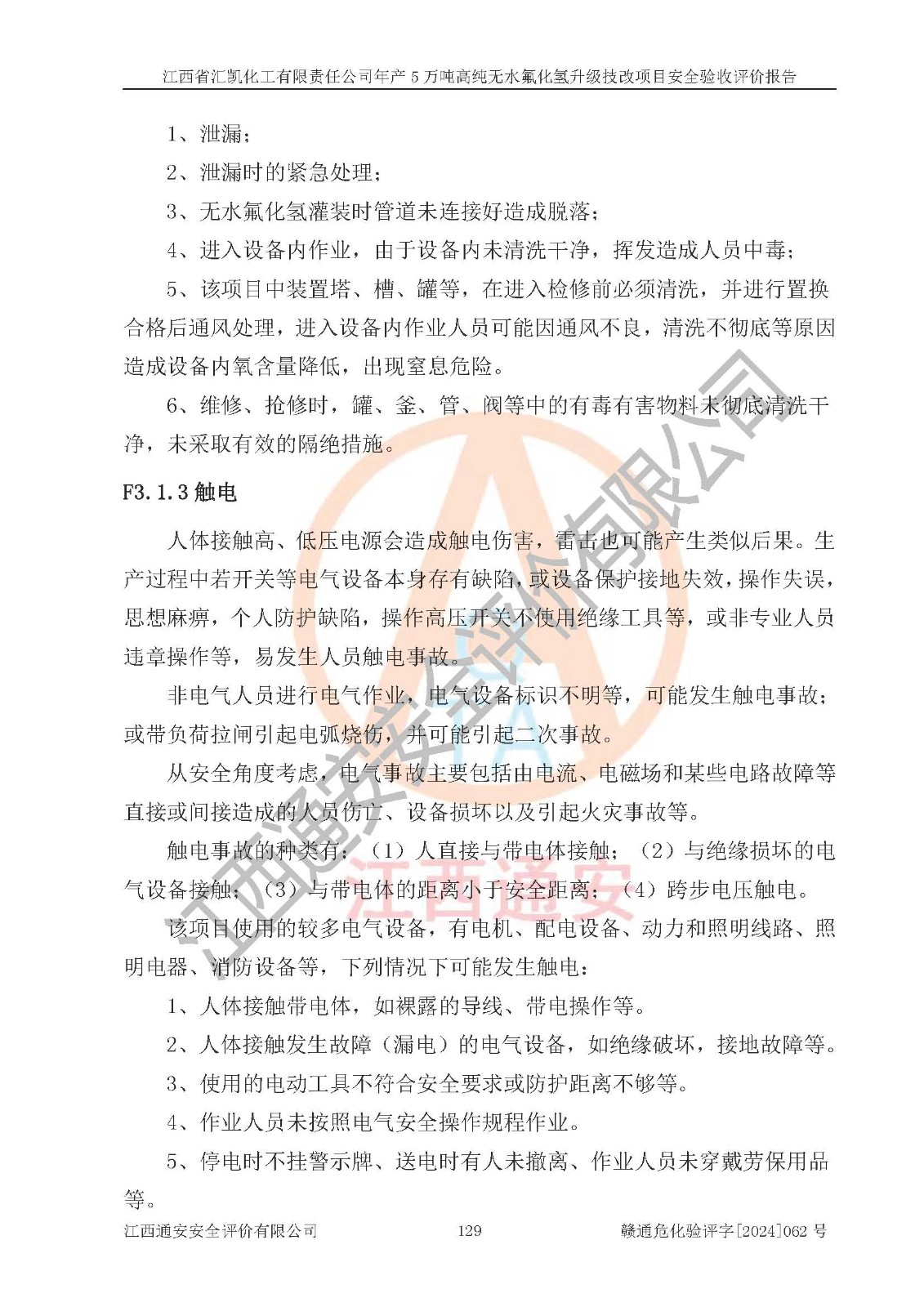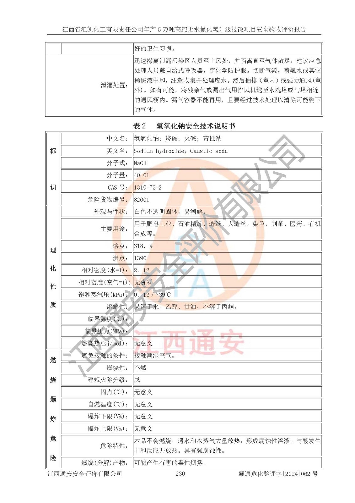 评价结论 | 江西省汇凯化工有限责任公司年产5万吨高纯无水氟化氢升级技改项目现场情况与设计图纸一致,DCS系统和SIS系统符合设计要求、运行正常,主要负责人、安全管理人员等有关从业人员资质符合《江西省危险化学品安全专项整治三年行动实施方案》要求,安全设施及安全管理符合**及有关部门关于安全生产法律、法规、标准的要求,该项目试生产以来,工艺设备运行正常,安全设施和采取的安全技术措施符合设计要求并达到预期结果,可以满足建设项目安全生产的要求,安全生产管理**,具备了安全设施竣工验收条件。 | ||||||