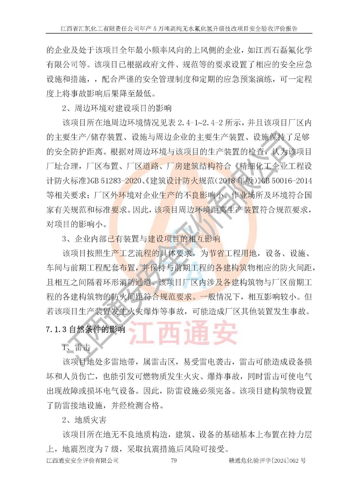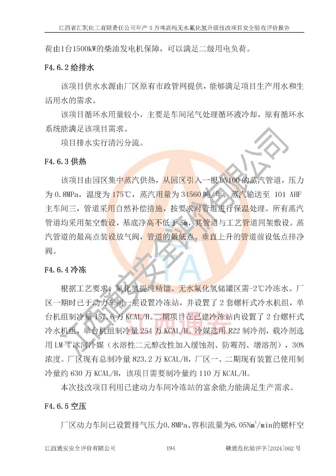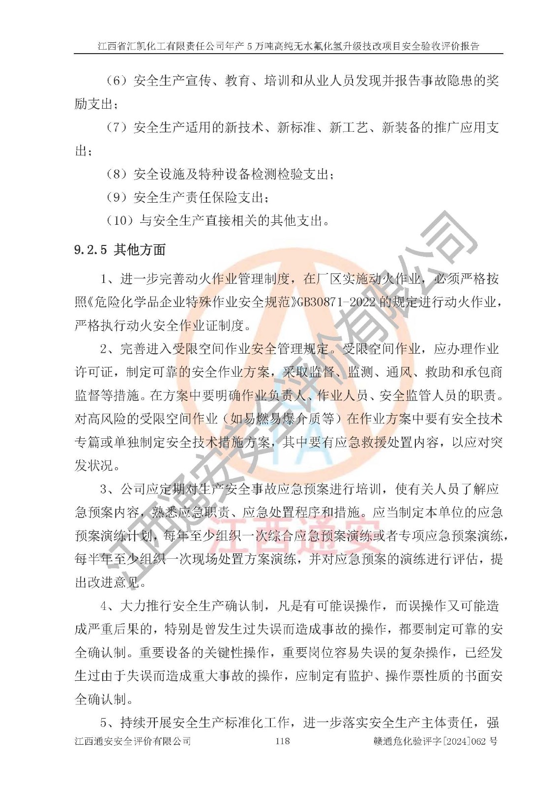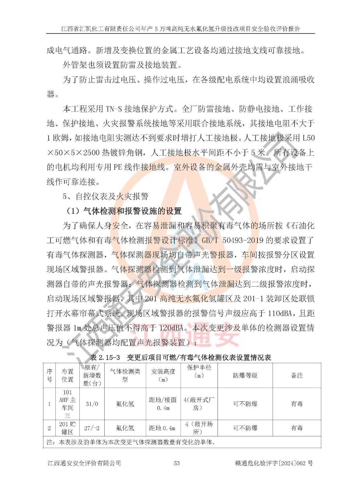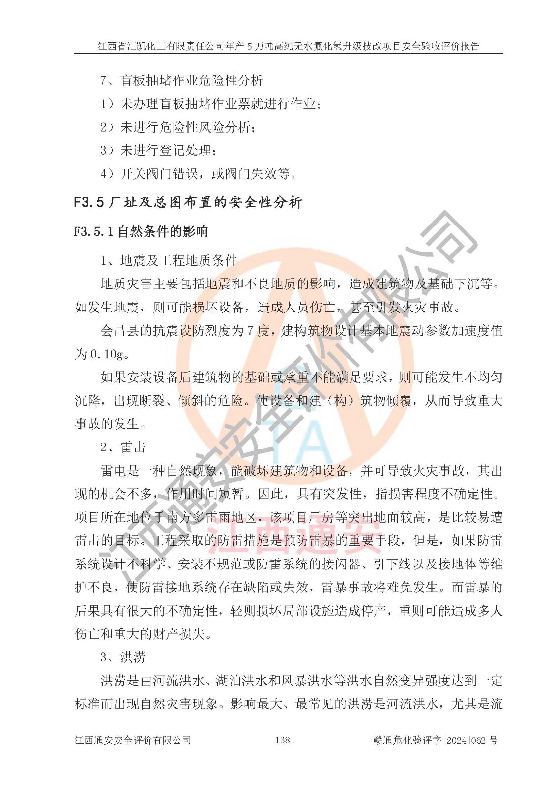 评价结论 | 江西省汇凯化工有限责任公司年产5万吨高纯无水氟化氢升级技改项目现场情况与设计图纸一致,DCS系统和SIS系统符合设计要求、运行正常,主要负责人、安全管理人员等有关从业人员资质符合《江西省危险化学品安全专项整治三年行动实施方案》要求,安全设施及安全管理符合**及有关部门关于安全生产法律、法规、标准的要求,该项目试生产以来,工艺设备运行正常,安全设施和采取的安全技术措施符合设计要求并达到预期结果,可以满足建设项目安全生产的要求,安全生产管理**,具备了安全设施竣工验收条件。 | ||||||
