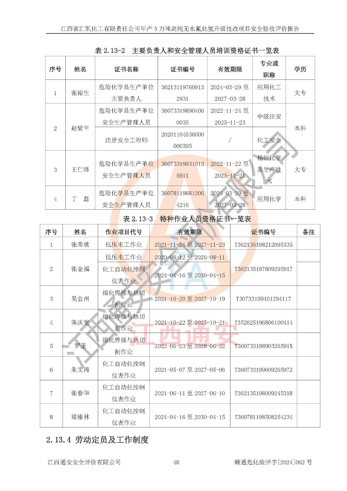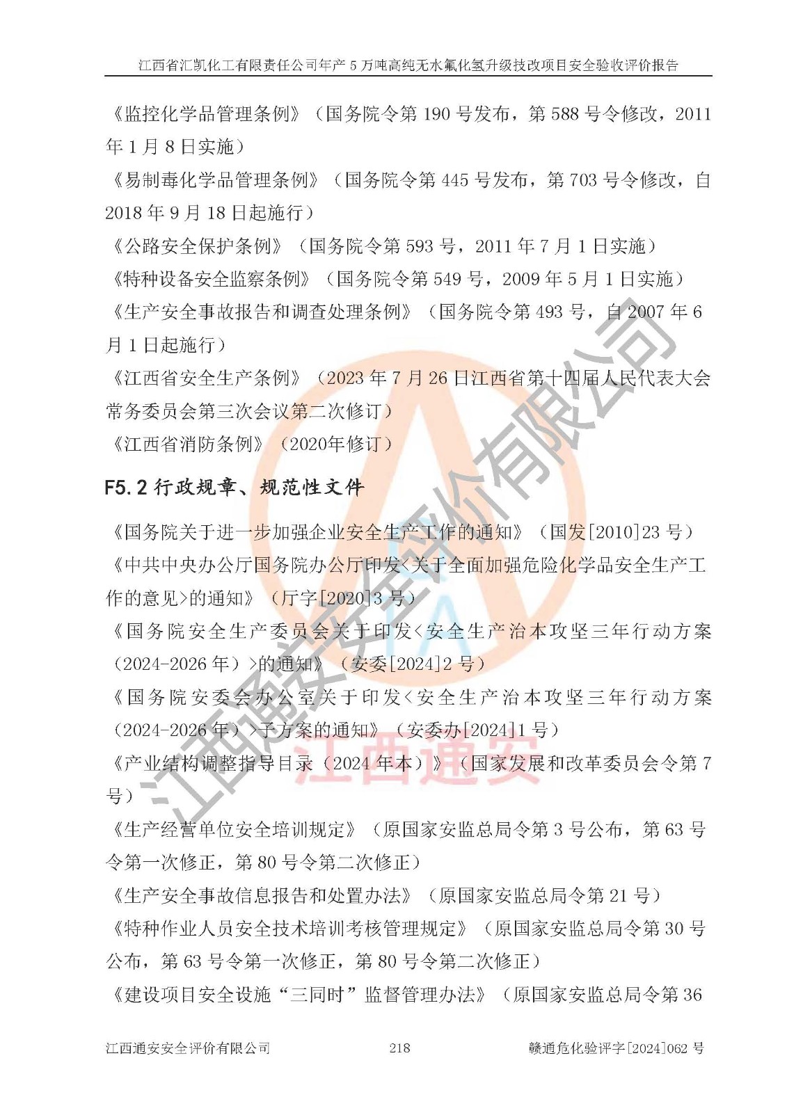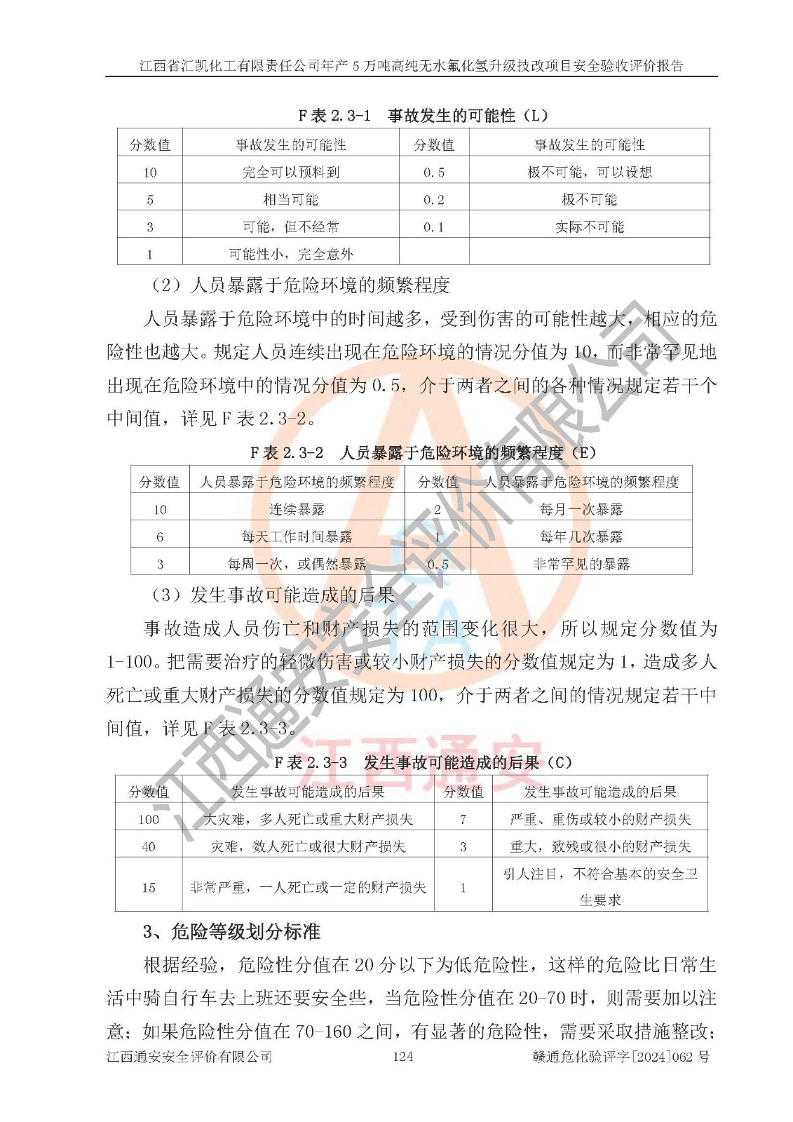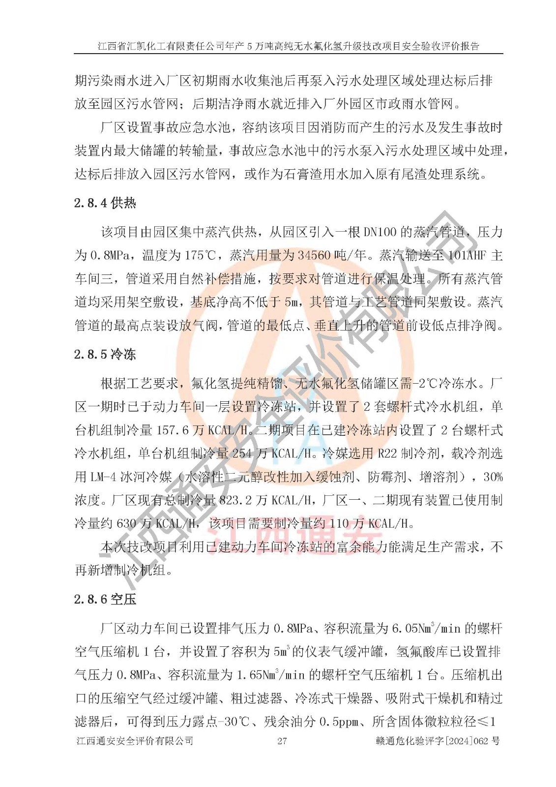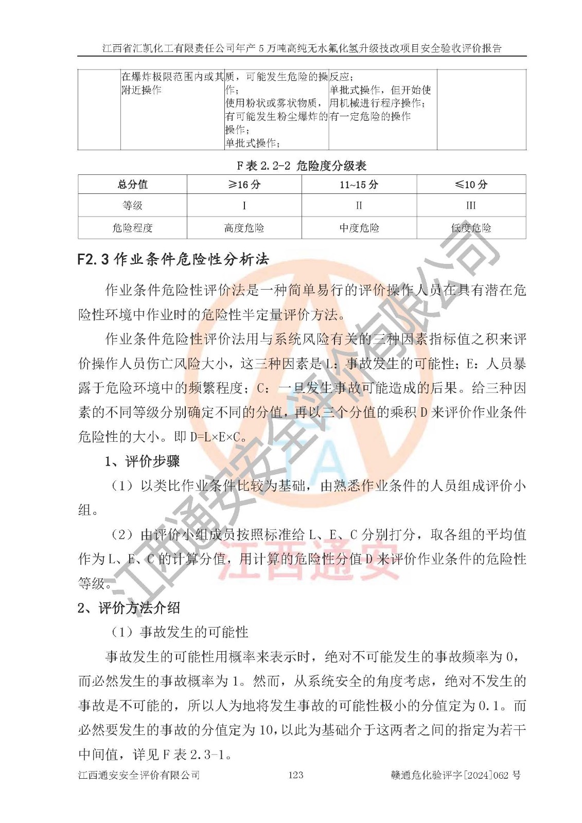评价结论 | 江西省汇凯化工有限责任公司年产5万吨高纯无水氟化氢升级技改项目现场情况与设计图纸一致,DCS系统和SIS系统符合设计要求、运行正常,主要负责人、安全管理人员等有关从业人员资质符合《江西省危险化学品安全专项整治三年行动实施方案》要求,安全设施及安全管理符合**及有关部门关于安全生产法律、法规、标准的要求,该项目试生产以来,工艺设备运行正常,安全设施和采取的安全技术措施符合设计要求并达到预期结果,可以满足建设项目安全生产的要求,安全生产管理**,具备了安全设施竣工验收条件。 | ||||||