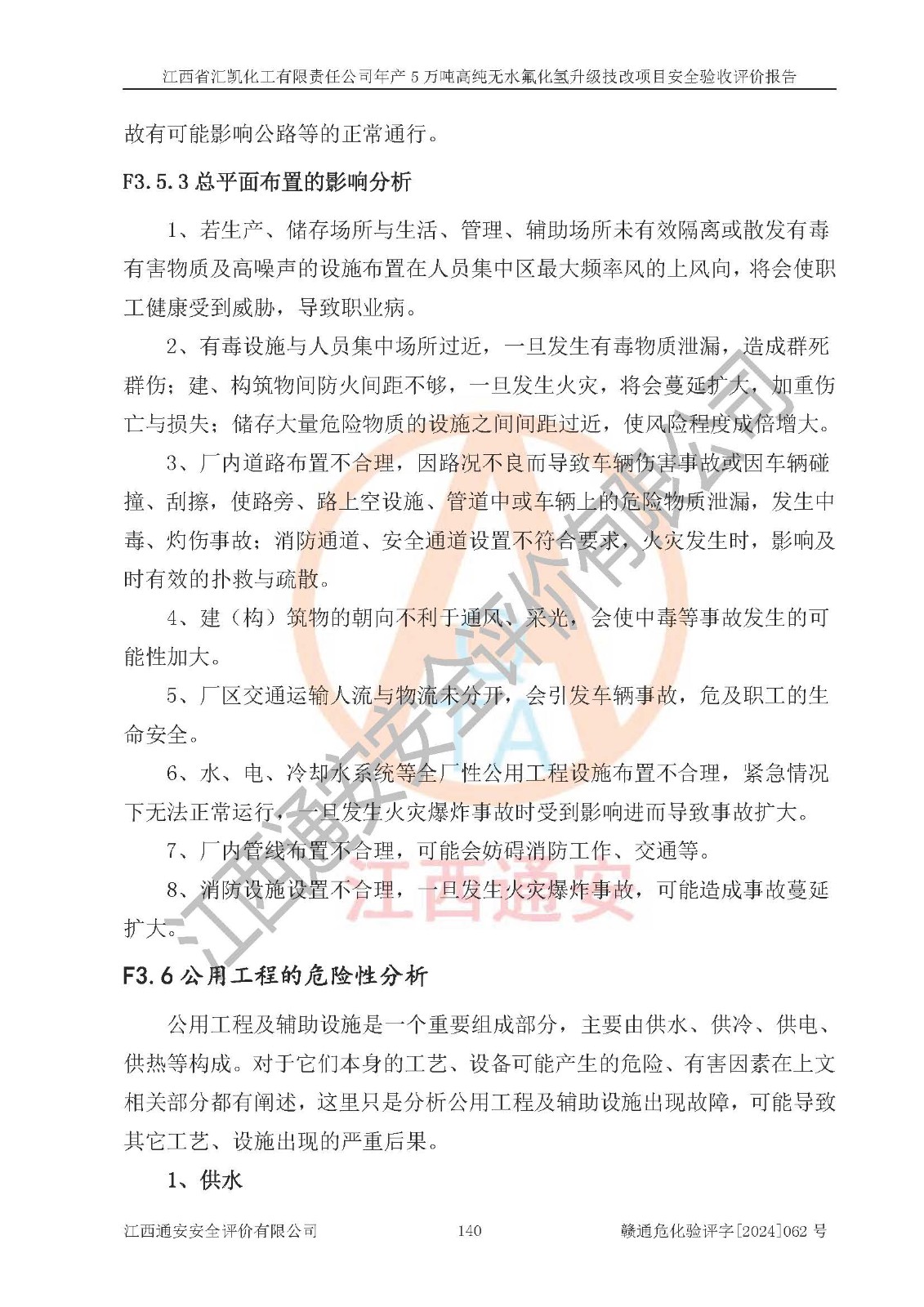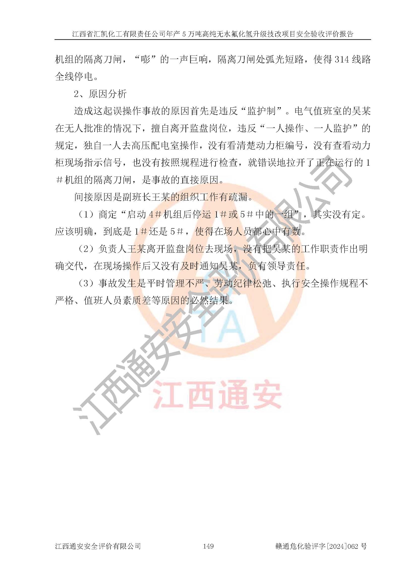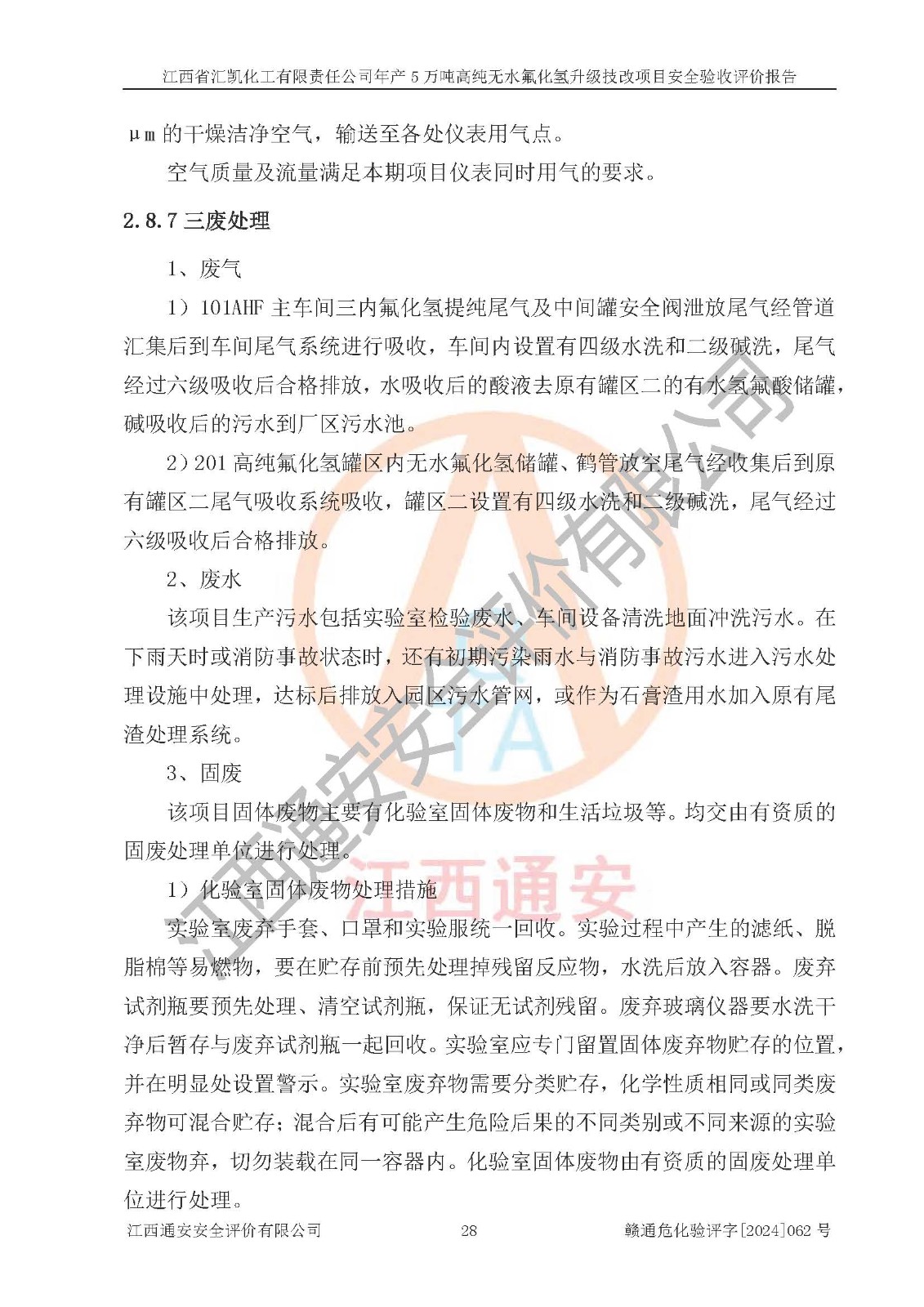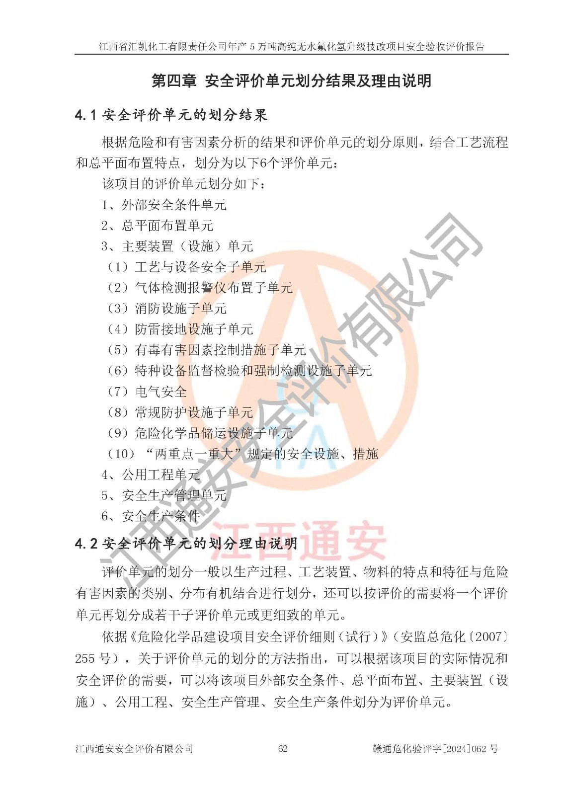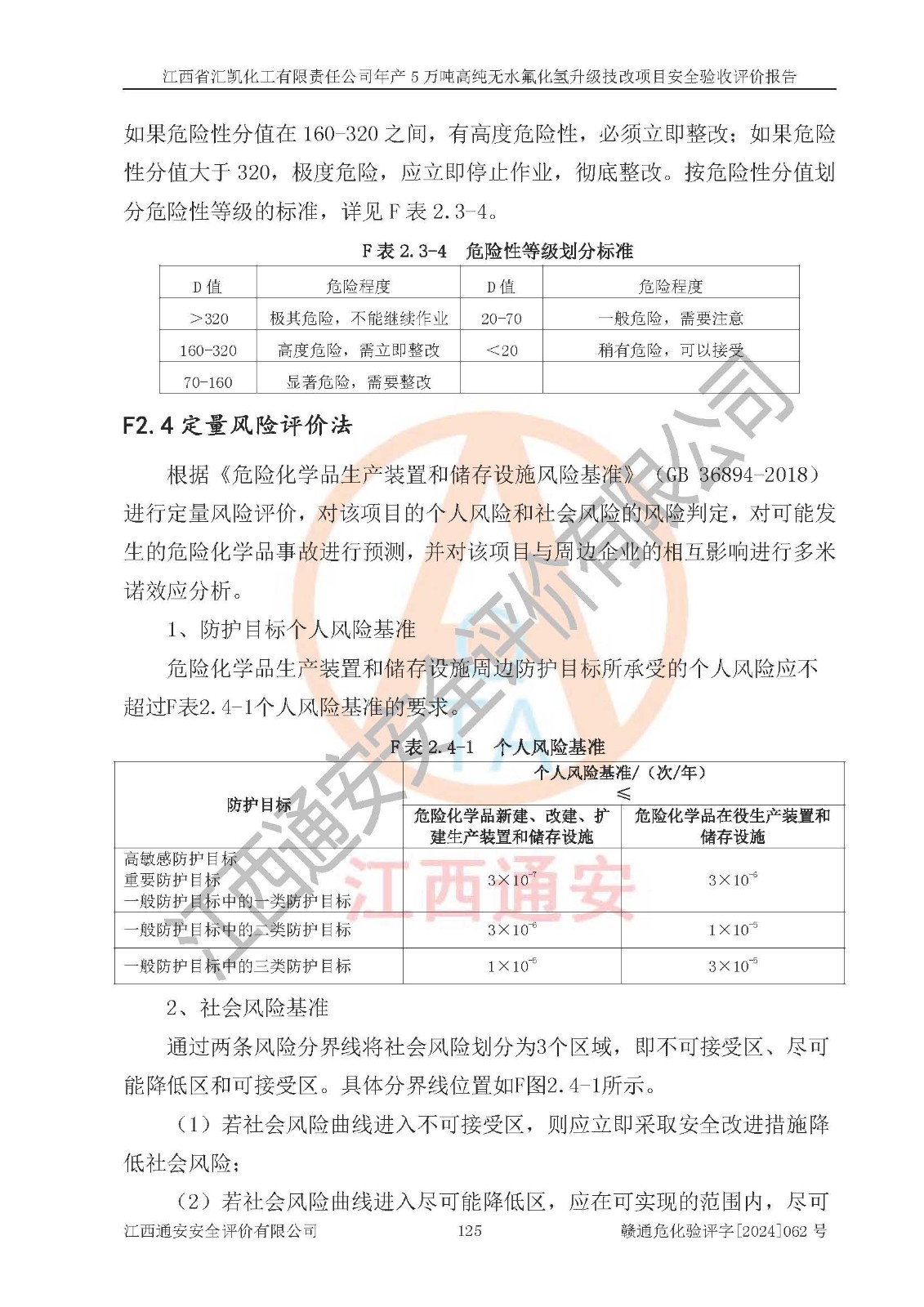 评价结论 | 江西省汇凯化工有限责任公司年产5万吨高纯无水氟化氢升级技改项目现场情况与设计图纸一致,DCS系统和SIS系统符合设计要求、运行正常,主要负责人、安全管理人员等有关从业人员资质符合《江西省危险化学品安全专项整治三年行动实施方案》要求,安全设施及安全管理符合**及有关部门关于安全生产法律、法规、标准的要求,该项目试生产以来,工艺设备运行正常,安全设施和采取的安全技术措施符合设计要求并达到预期结果,可以满足建设项目安全生产的要求,安全生产管理**,具备了安全设施竣工验收条件。 | ||||||
