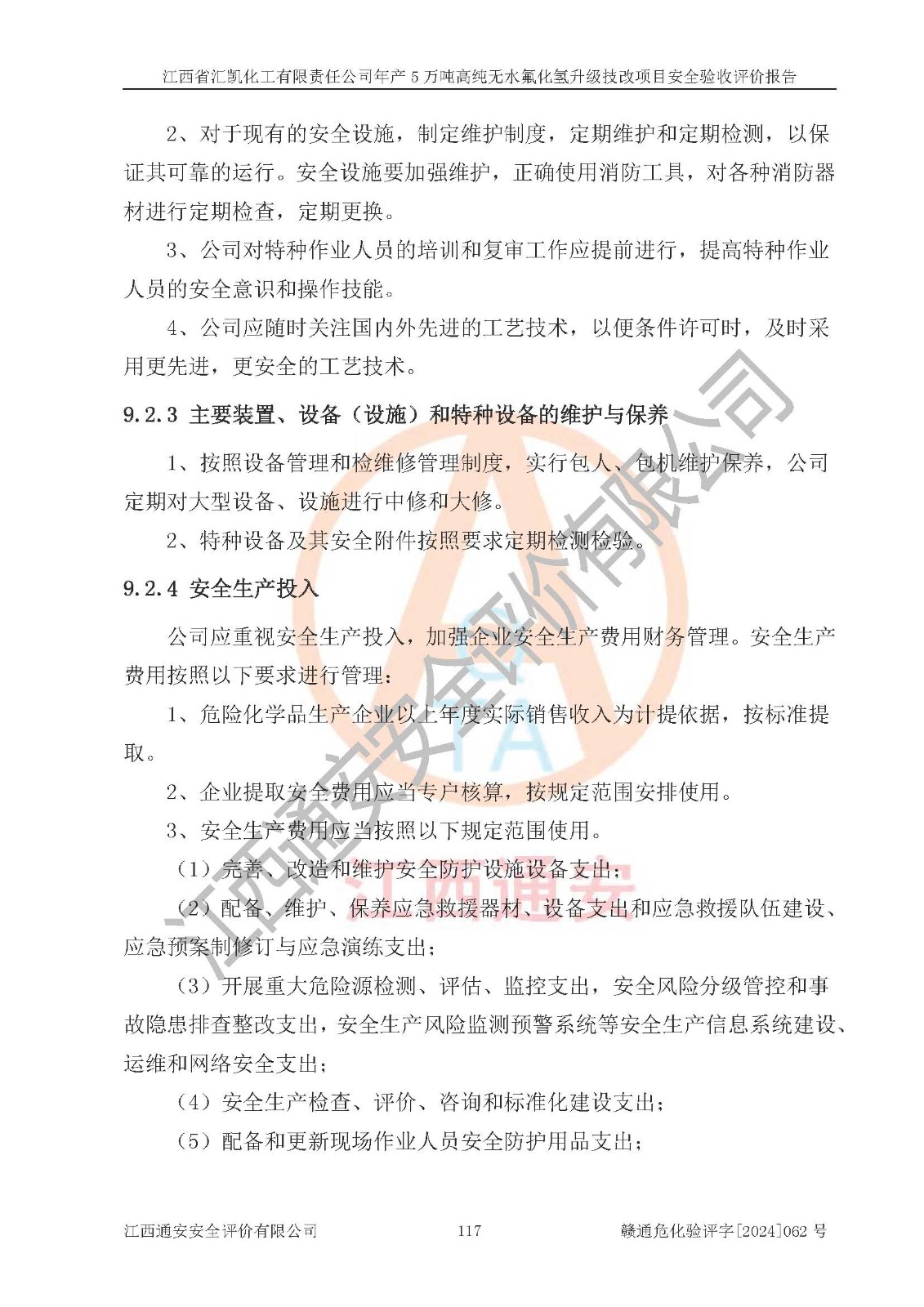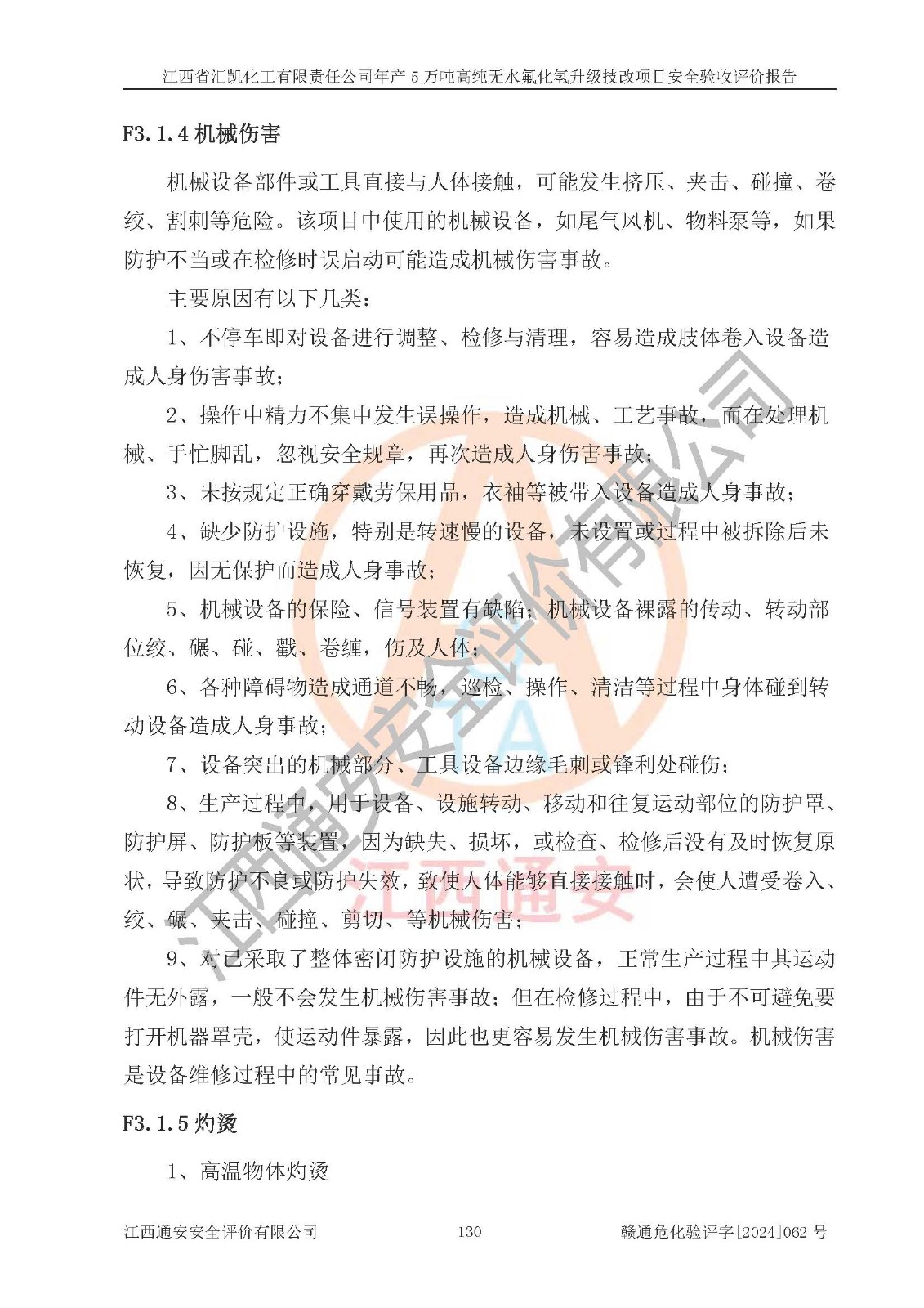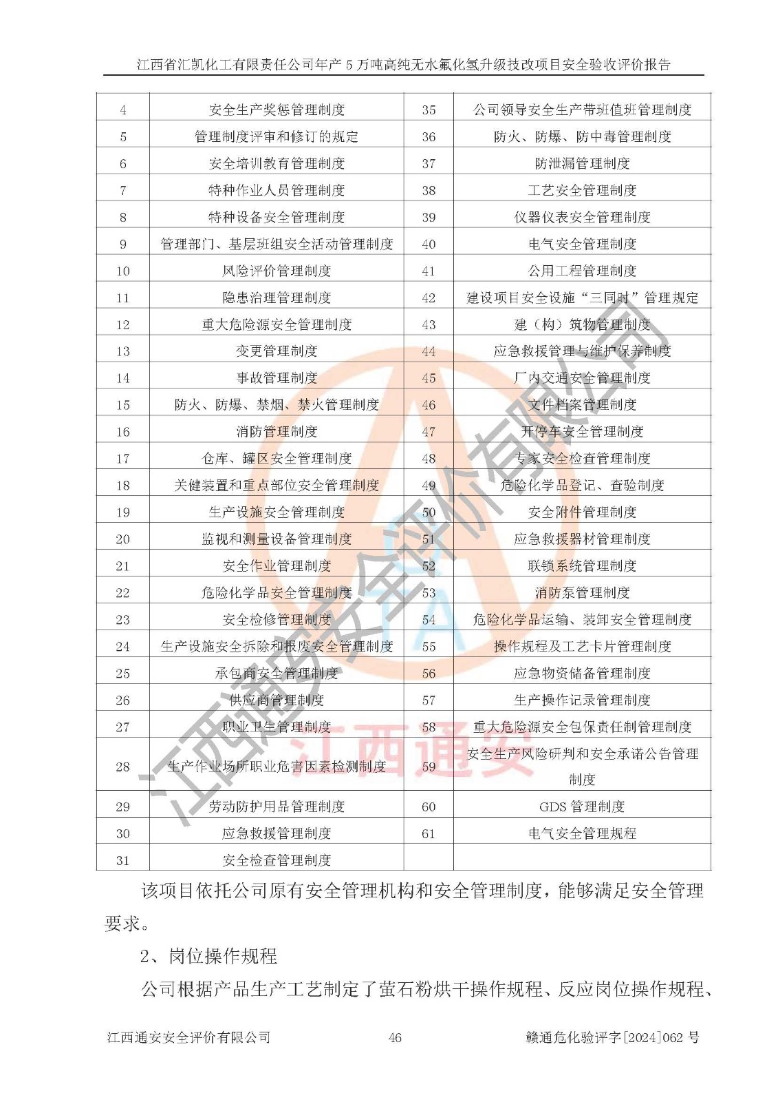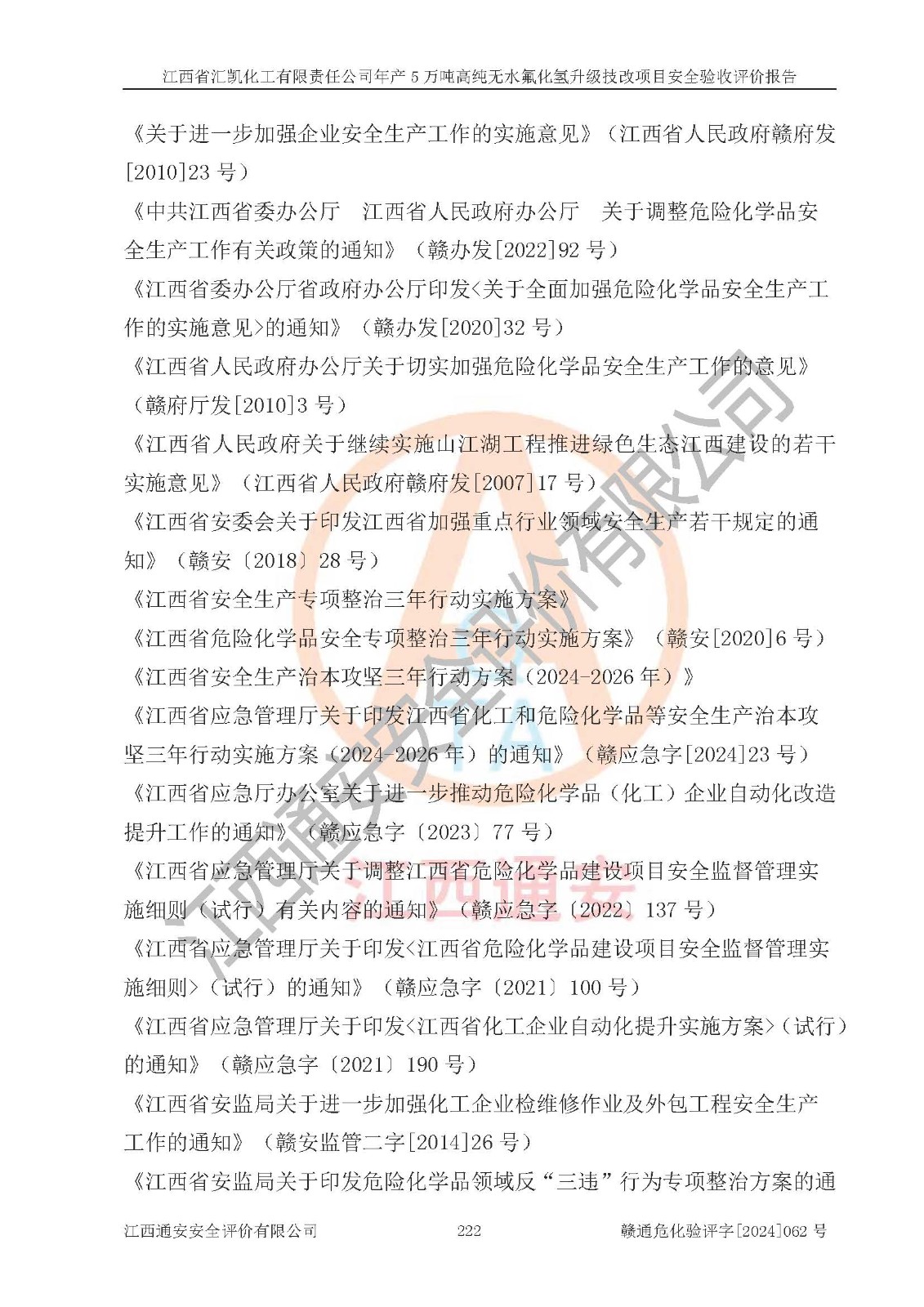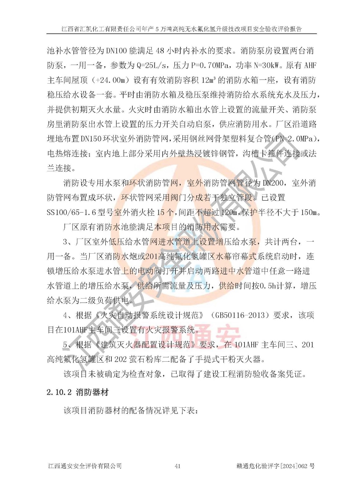 评价结论 | 江西省汇凯化工有限责任公司年产5万吨高纯无水氟化氢升级技改项目现场情况与设计图纸一致,DCS系统和SIS系统符合设计要求、运行正常,主要负责人、安全管理人员等有关从业人员资质符合《江西省危险化学品安全专项整治三年行动实施方案》要求,安全设施及安全管理符合**及有关部门关于安全生产法律、法规、标准的要求,该项目试生产以来,工艺设备运行正常,安全设施和采取的安全技术措施符合设计要求并达到预期结果,可以满足建设项目安全生产的要求,安全生产管理**,具备了安全设施竣工验收条件。 | ||||||