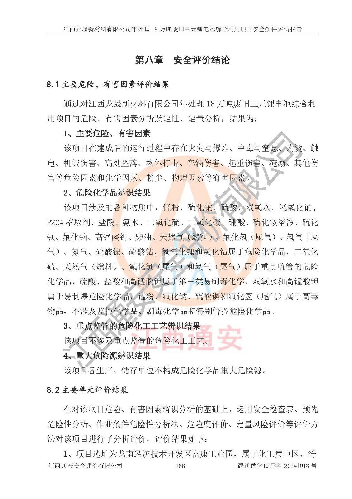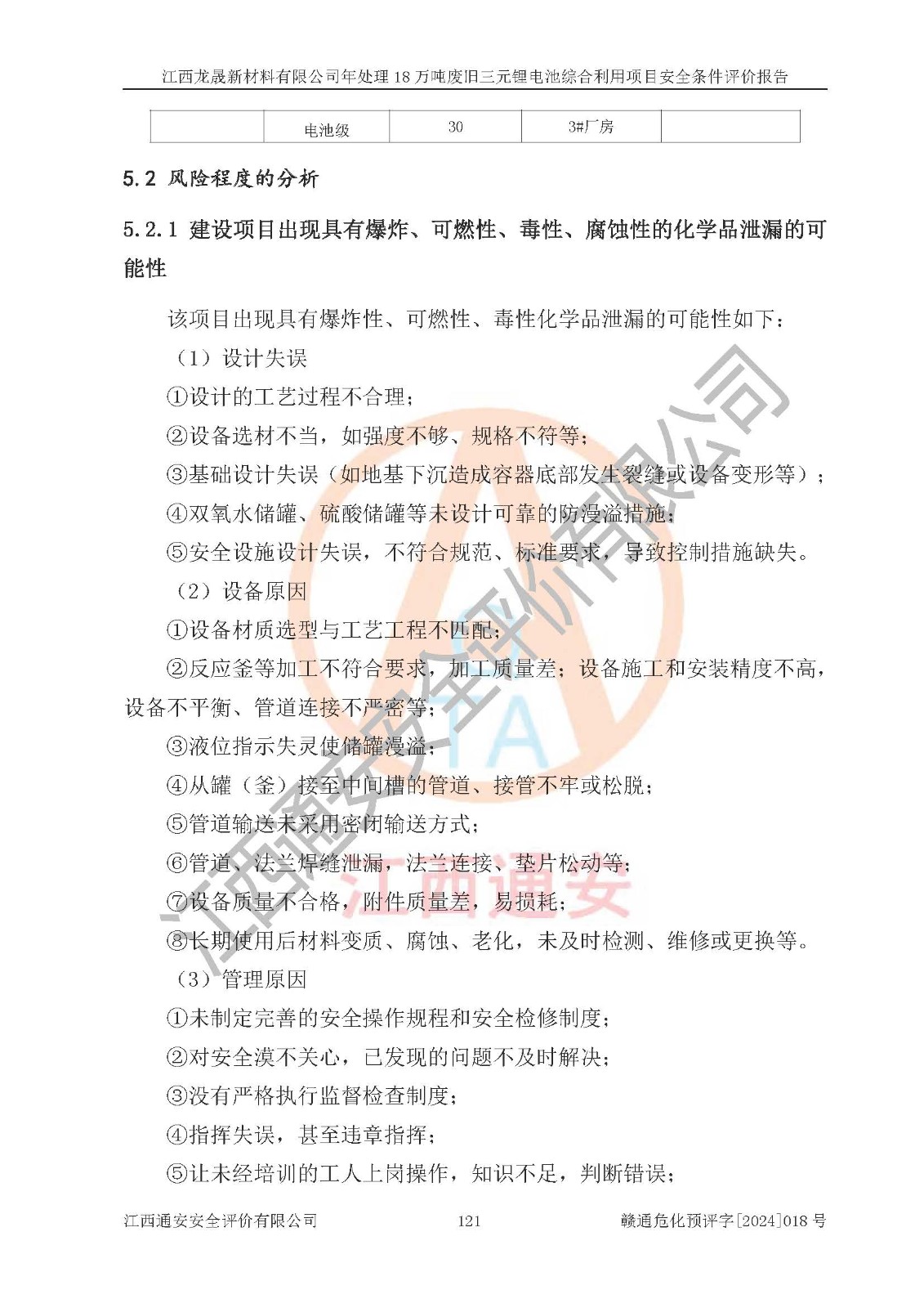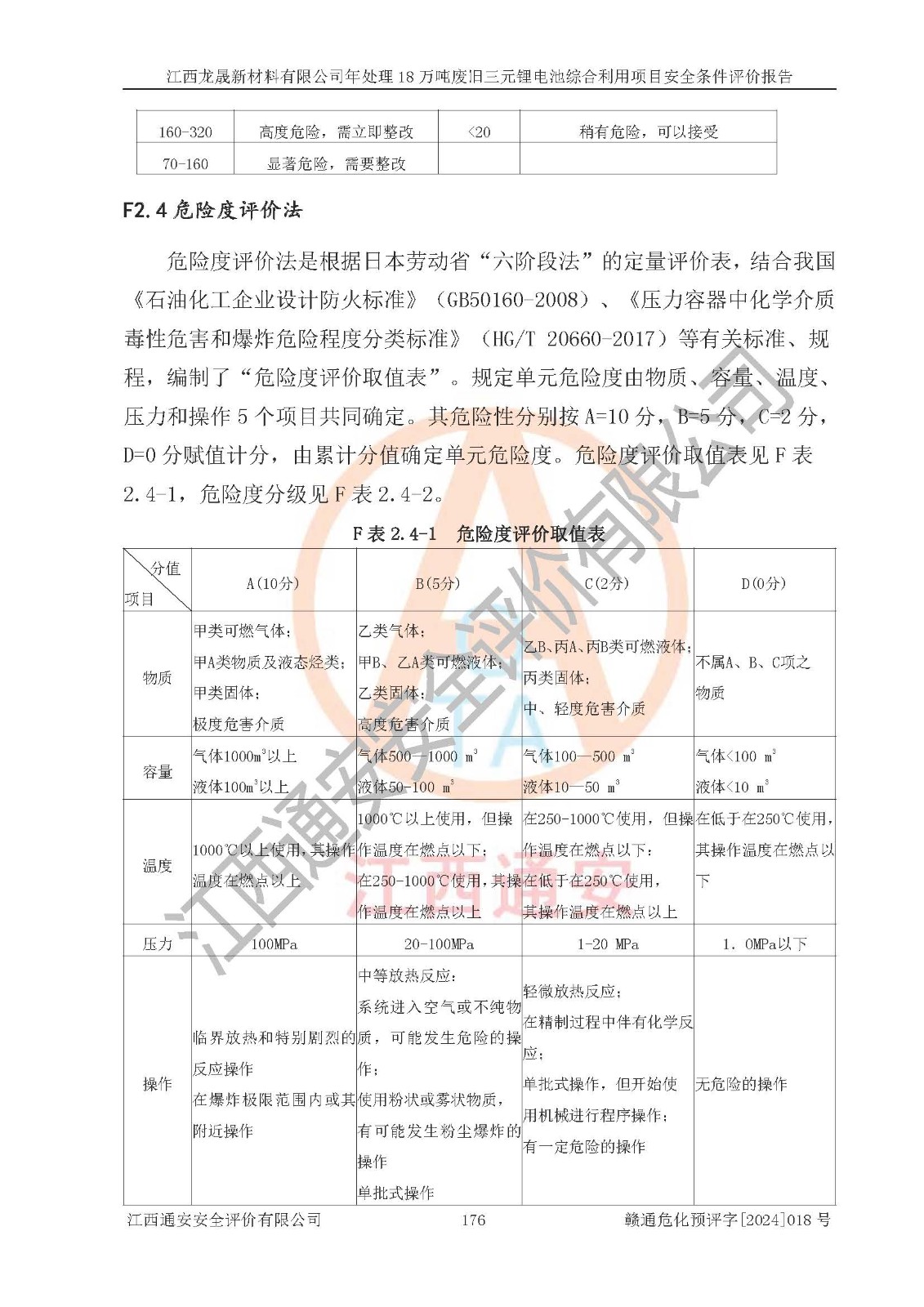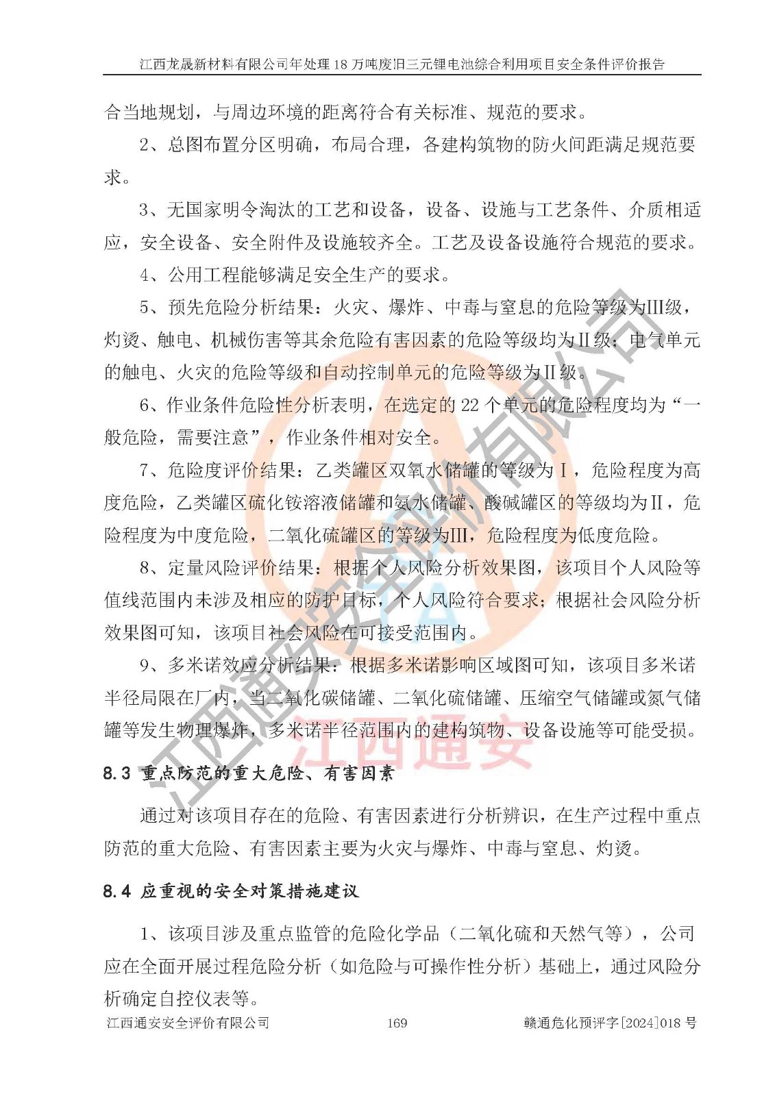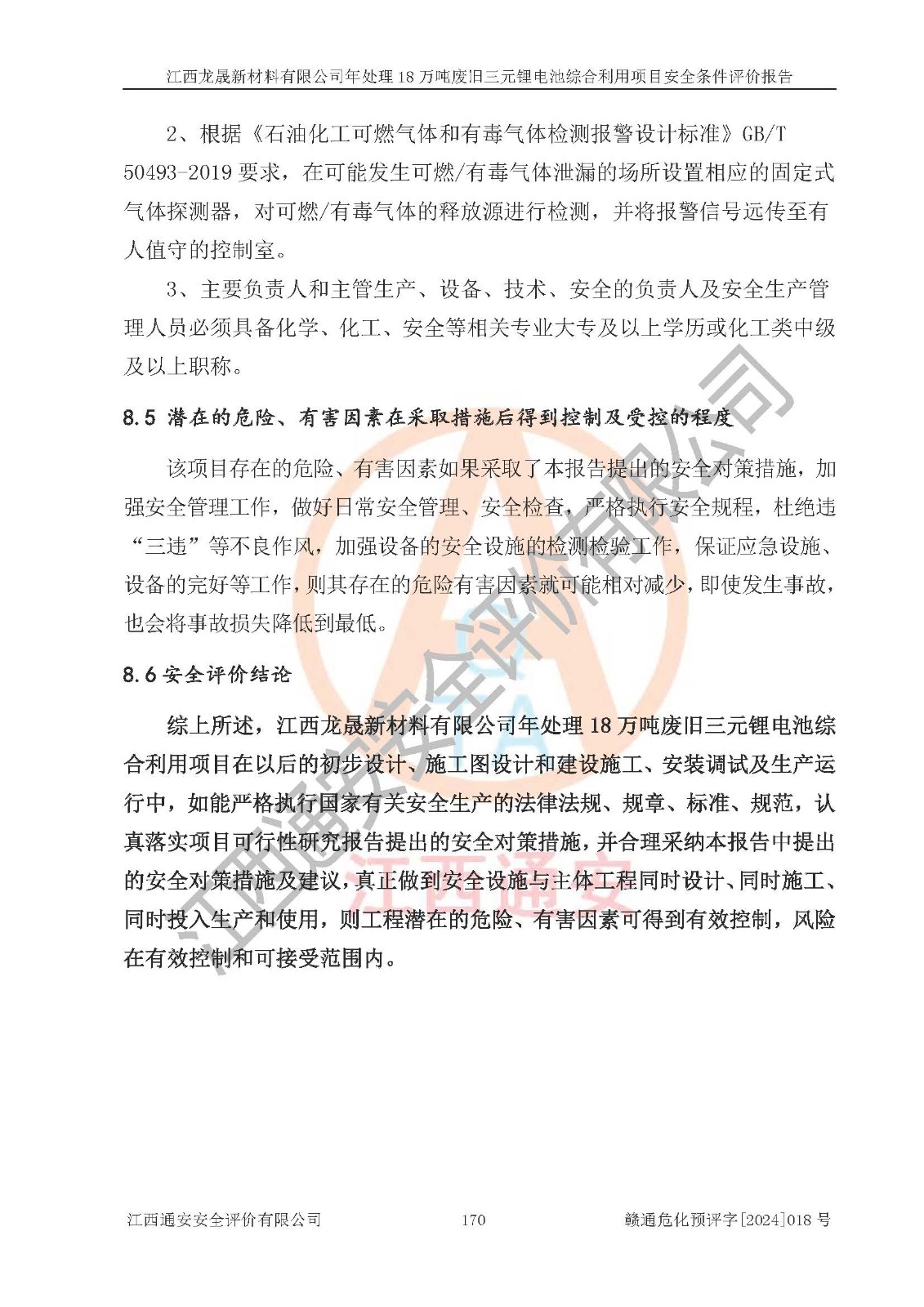评价结论 | 江西龙晟新材料有限公司年处理18万吨废旧三元锂电池综合利用项目在以后的初步设计、施工图设计和建设施工、安装调试及生产运行中,如能严格执行**有关安全生产的法律法规、规章、标准、规范,认真落实项目可行性研究报告提出的安全对策措施,并合理采纳本报告中提出的安全对策措施及建议,真正做到安全设施与主体工程同时设计、同时施工、同时投入生产和使用,则工程潜在的危险、有害因素可得到**控制,风险在**控制和可接受范围内。 | |||