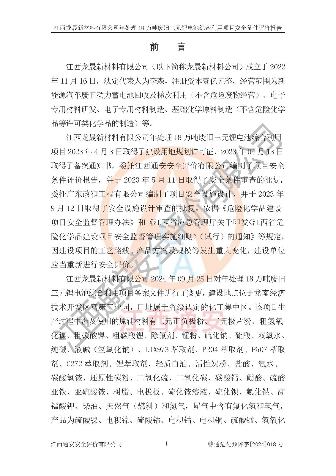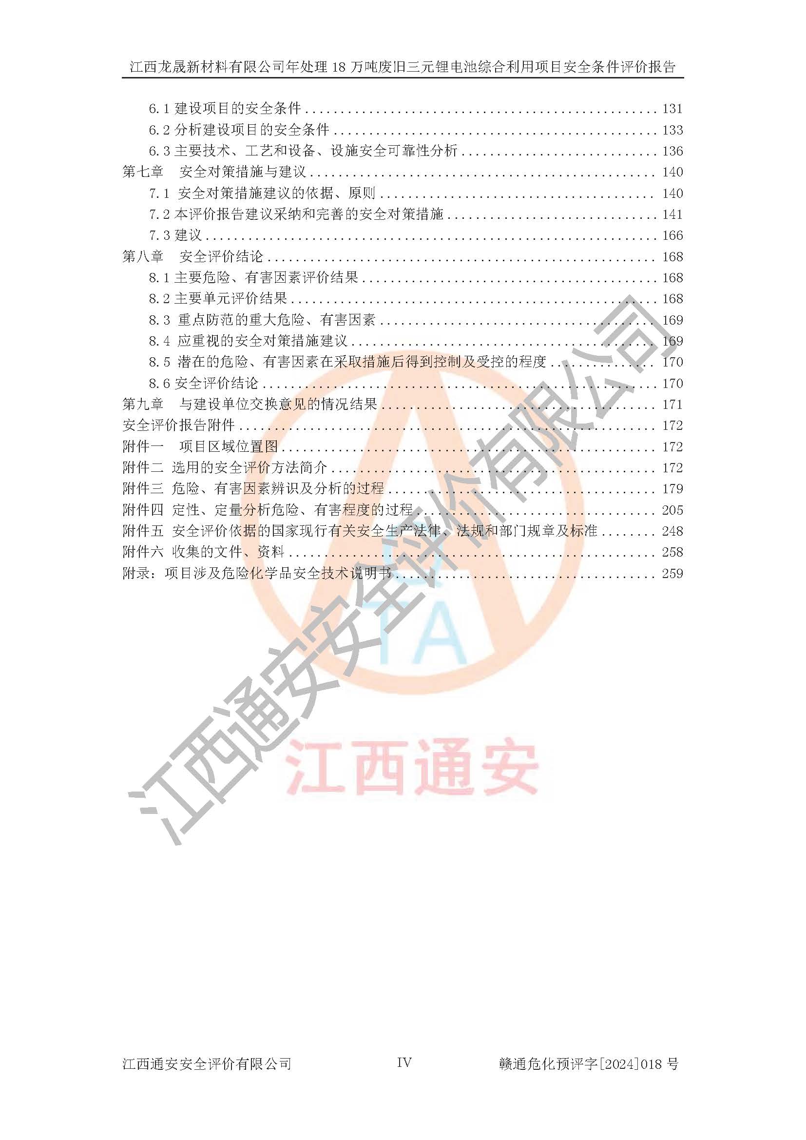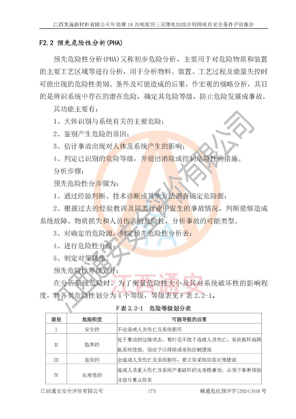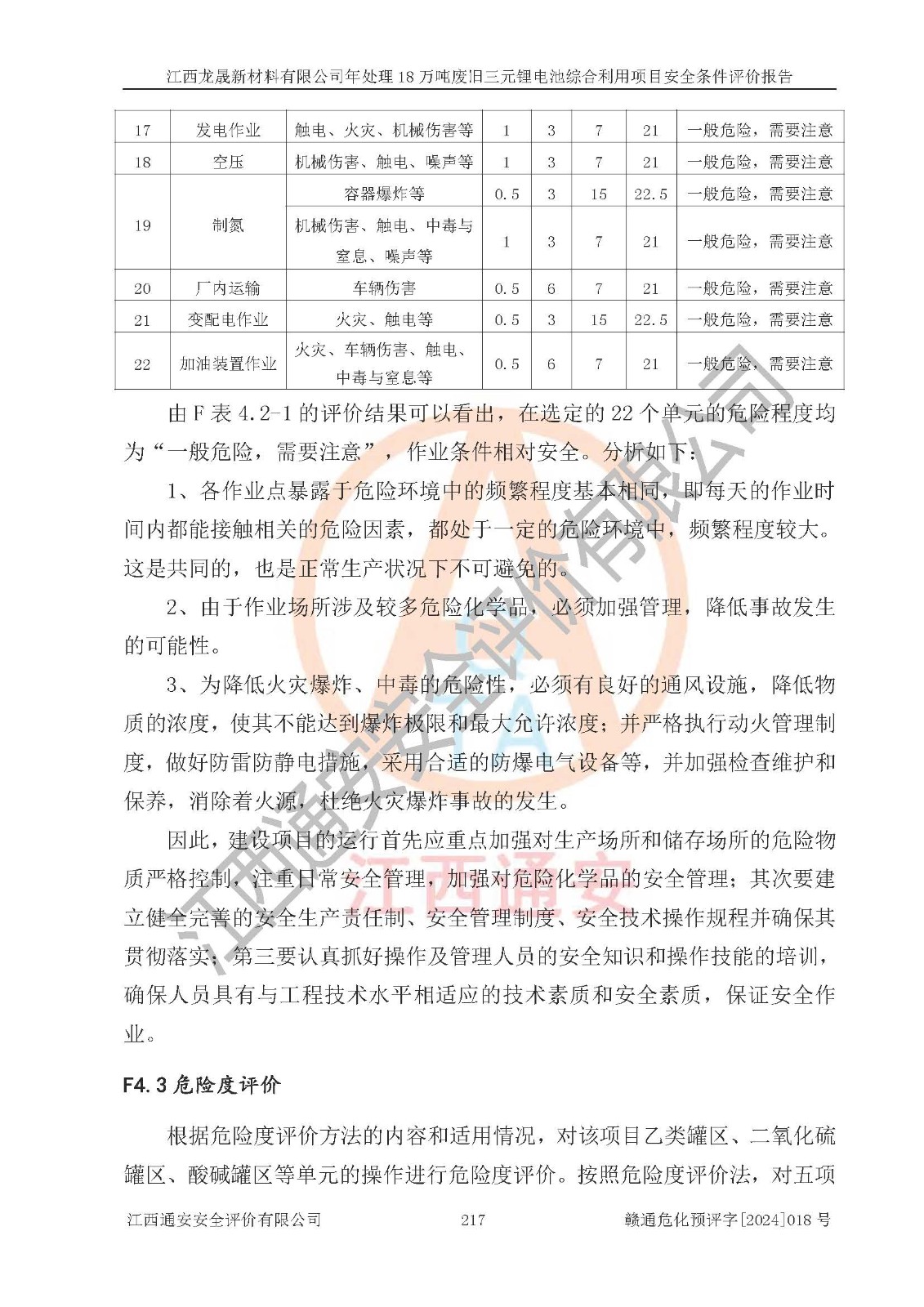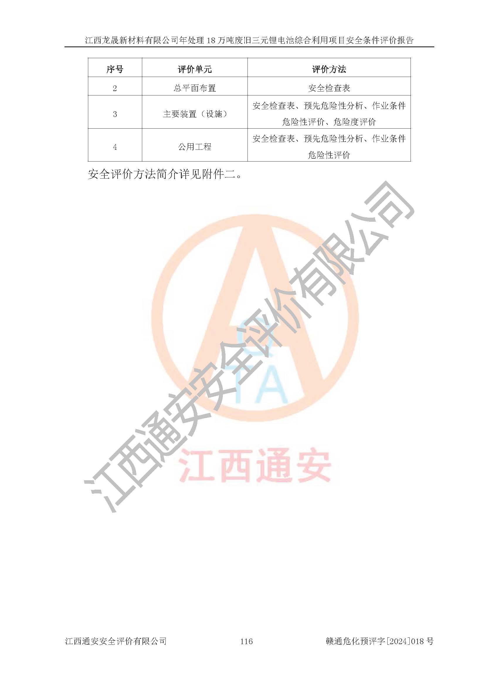 评价结论 | 江西龙晟新材料有限公司年处理18万吨废旧三元锂电池综合利用项目在以后的初步设计、施工图设计和建设施工、安装调试及生产运行中,如能严格执行**有关安全生产的法律法规、规章、标准、规范,认真落实项目可行性研究报告提出的安全对策措施,并合理采纳本报告中提出的安全对策措施及建议,真正做到安全设施与主体工程同时设计、同时施工、同时投入生产和使用,则工程潜在的危险、有害因素可得到**控制,风险在**控制和可接受范围内。 | |||