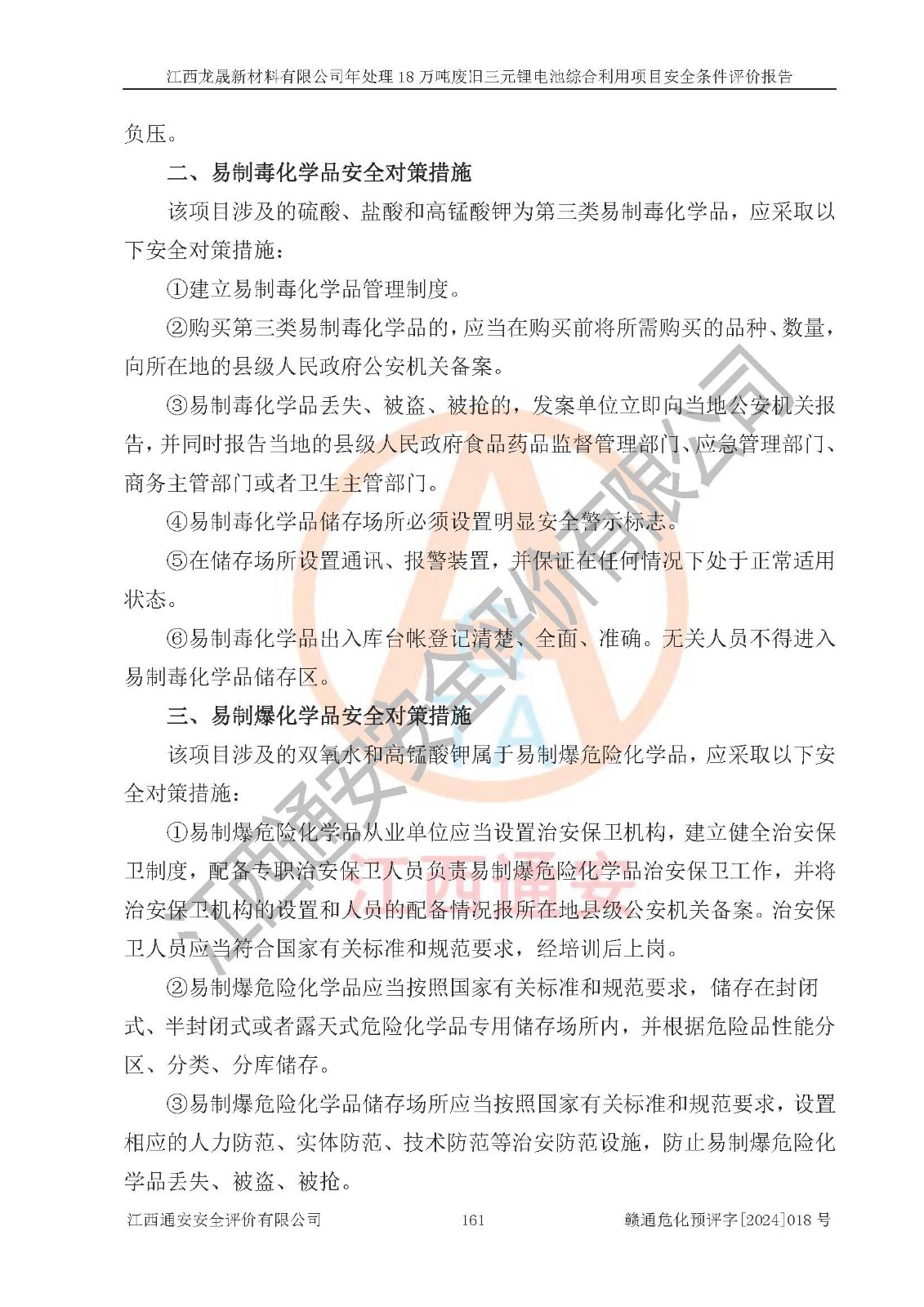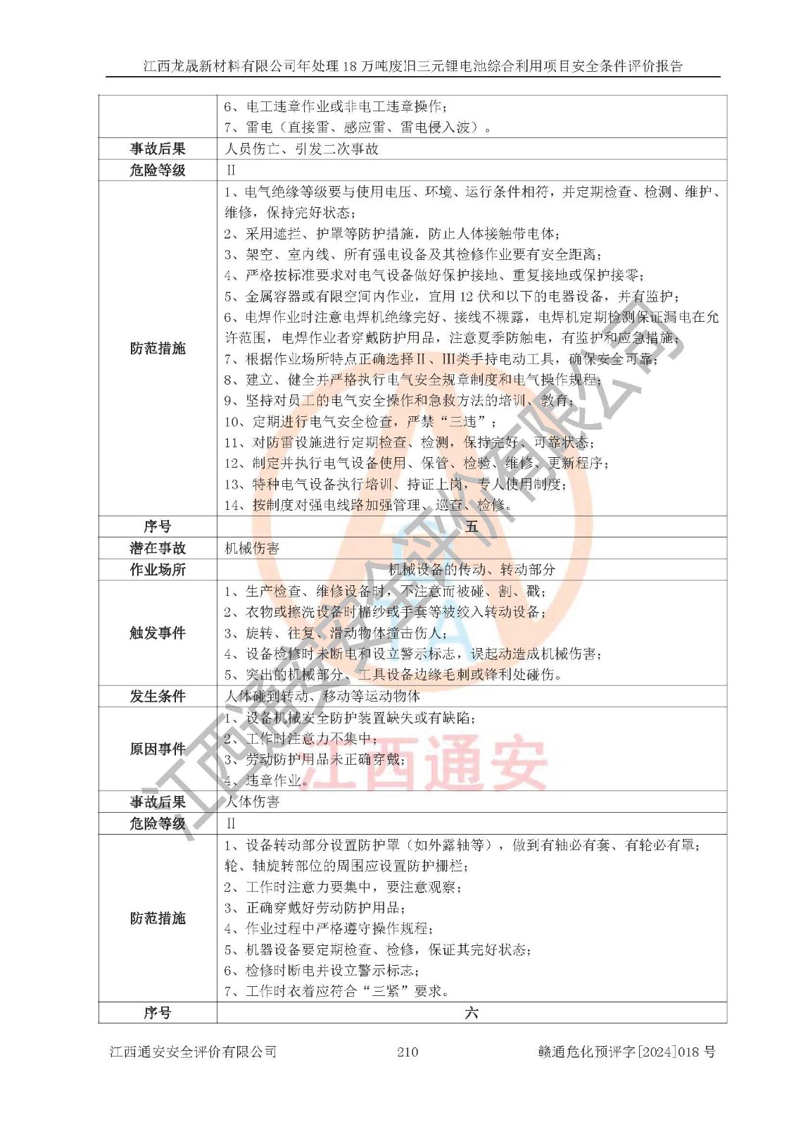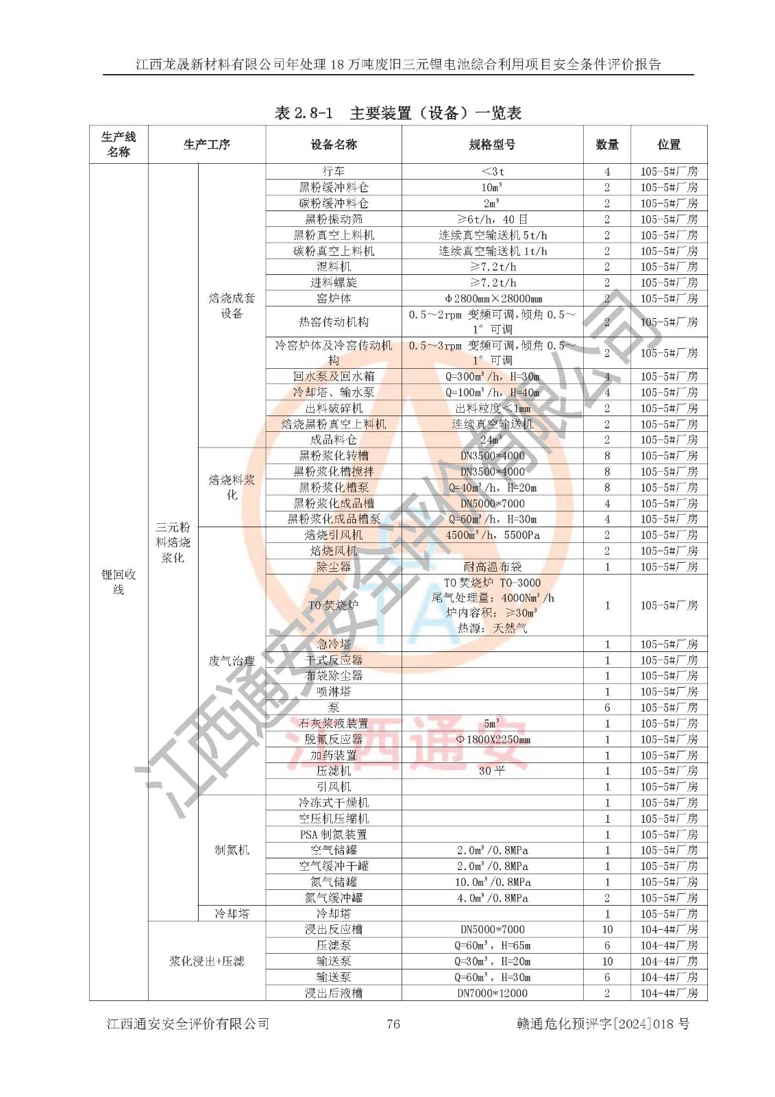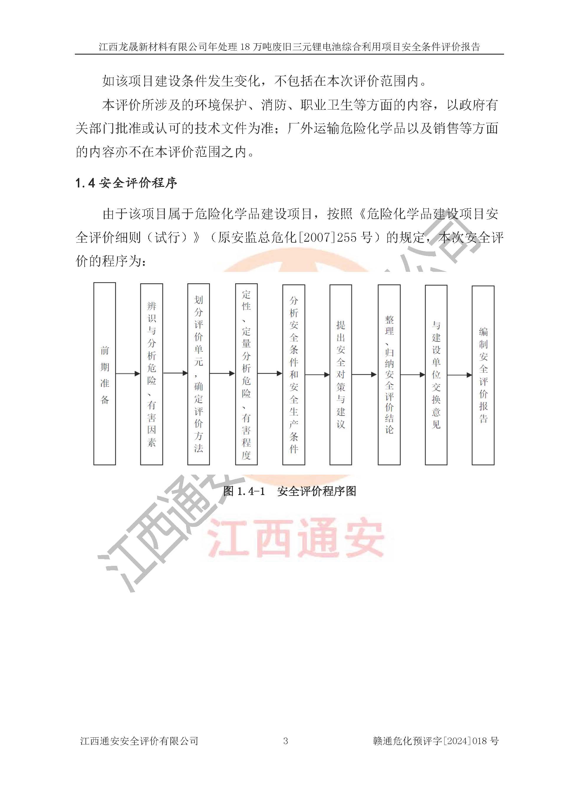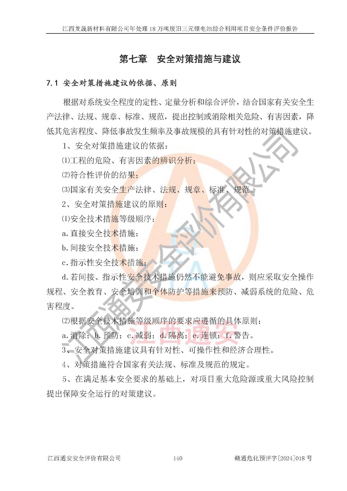 评价结论 | 江西龙晟新材料有限公司年处理18万吨废旧三元锂电池综合利用项目在以后的初步设计、施工图设计和建设施工、安装调试及生产运行中,如能严格执行**有关安全生产的法律法规、规章、标准、规范,认真落实项目可行性研究报告提出的安全对策措施,并合理采纳本报告中提出的安全对策措施及建议,真正做到安全设施与主体工程同时设计、同时施工、同时投入生产和使用,则工程潜在的危险、有害因素可得到**控制,风险在**控制和可接受范围内。 | |||
