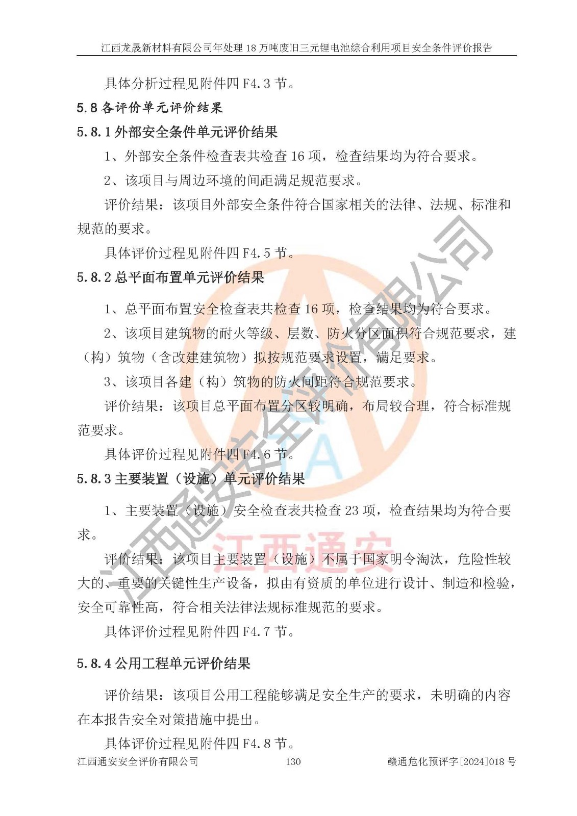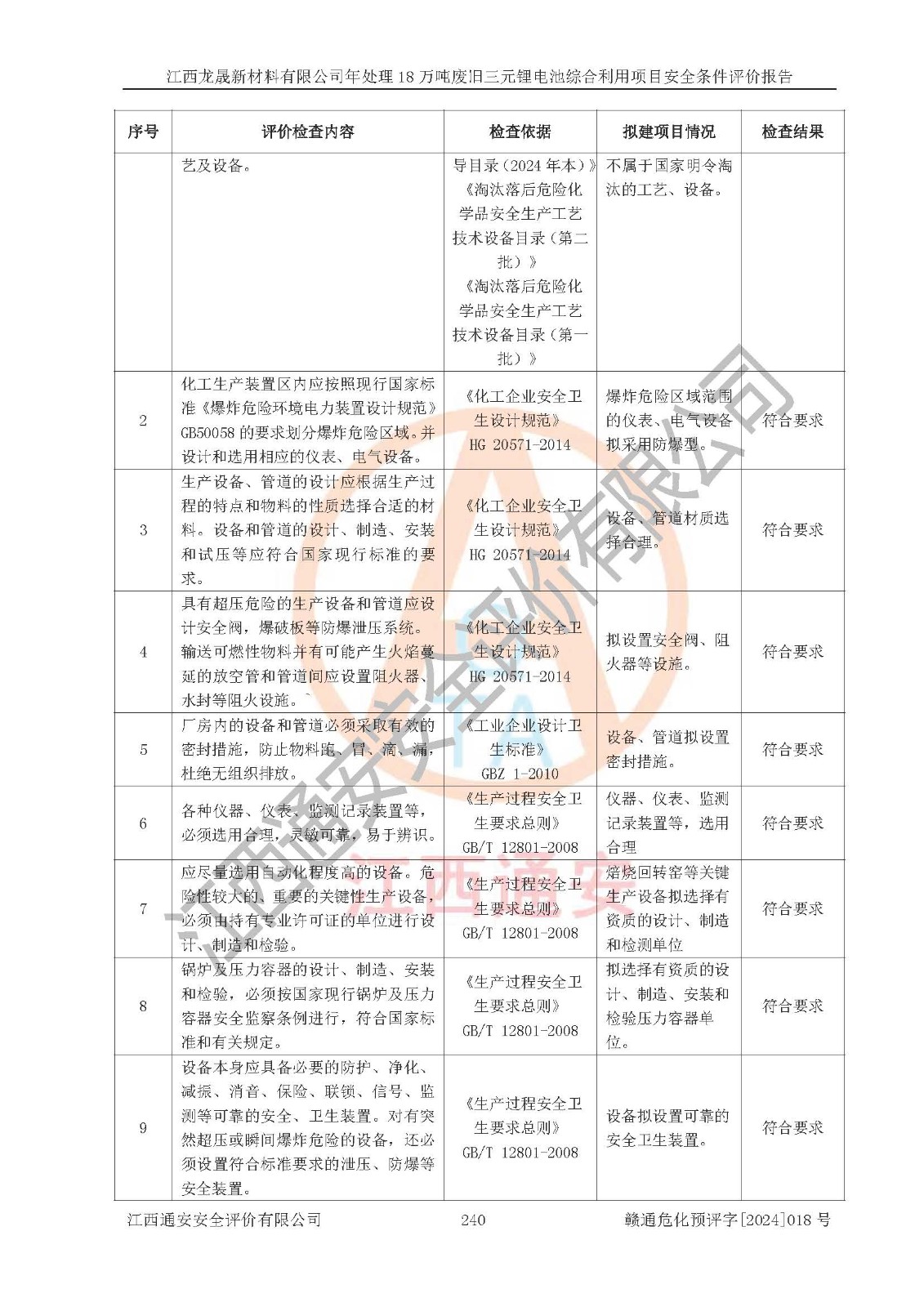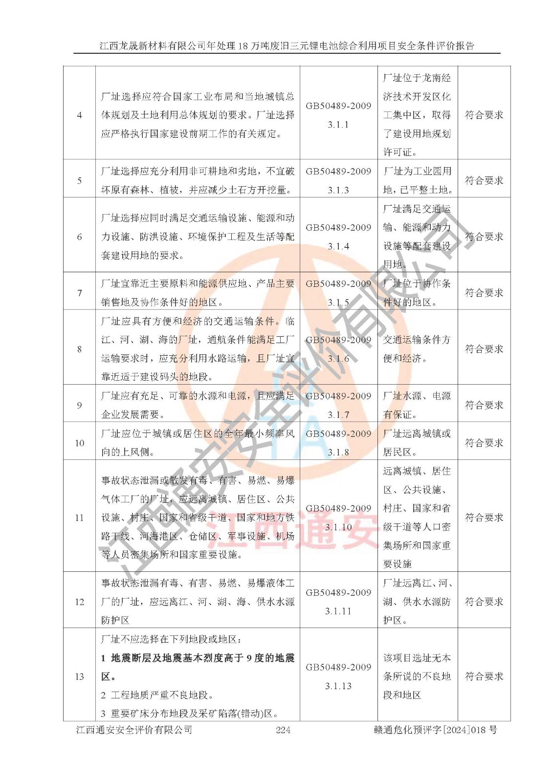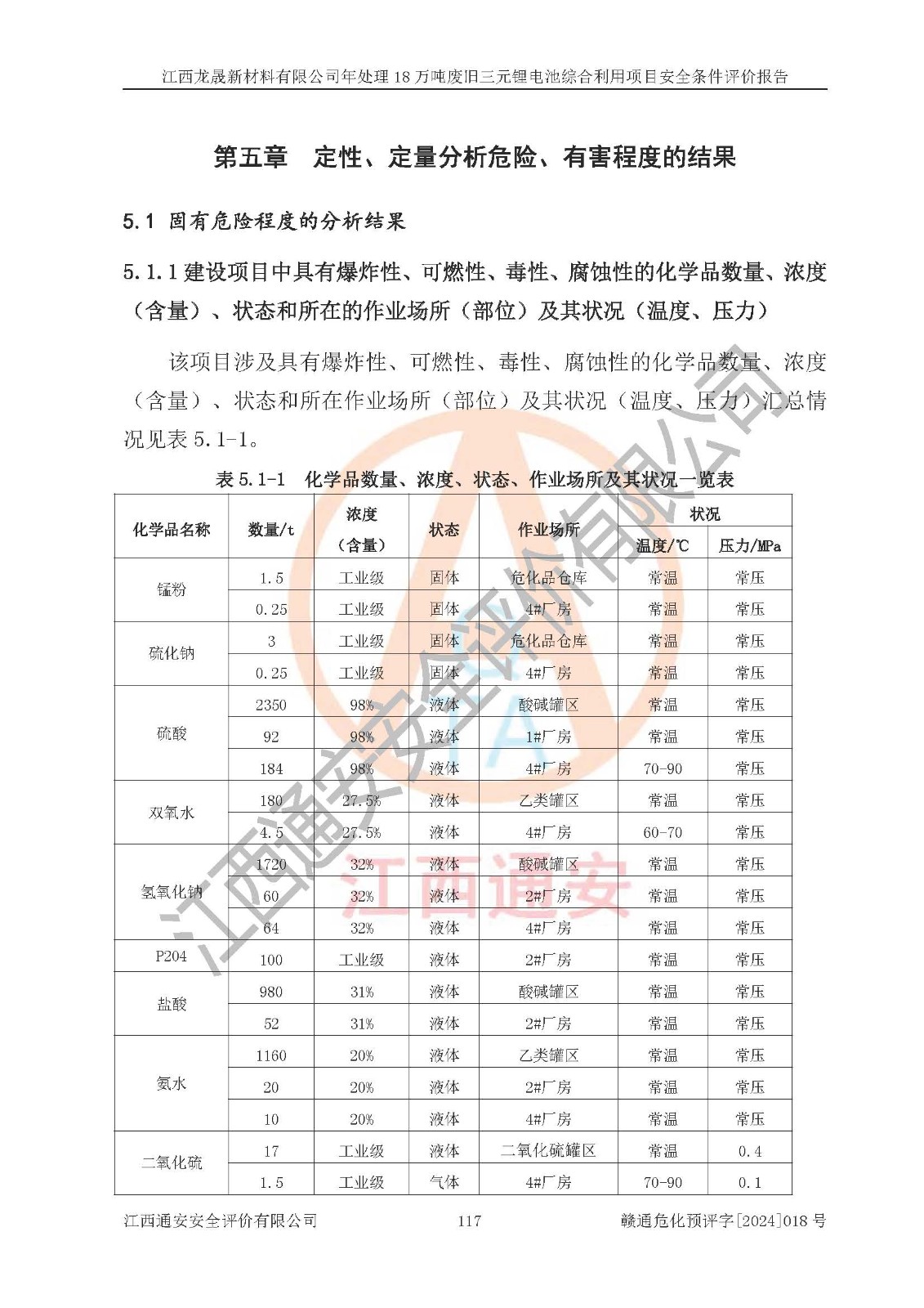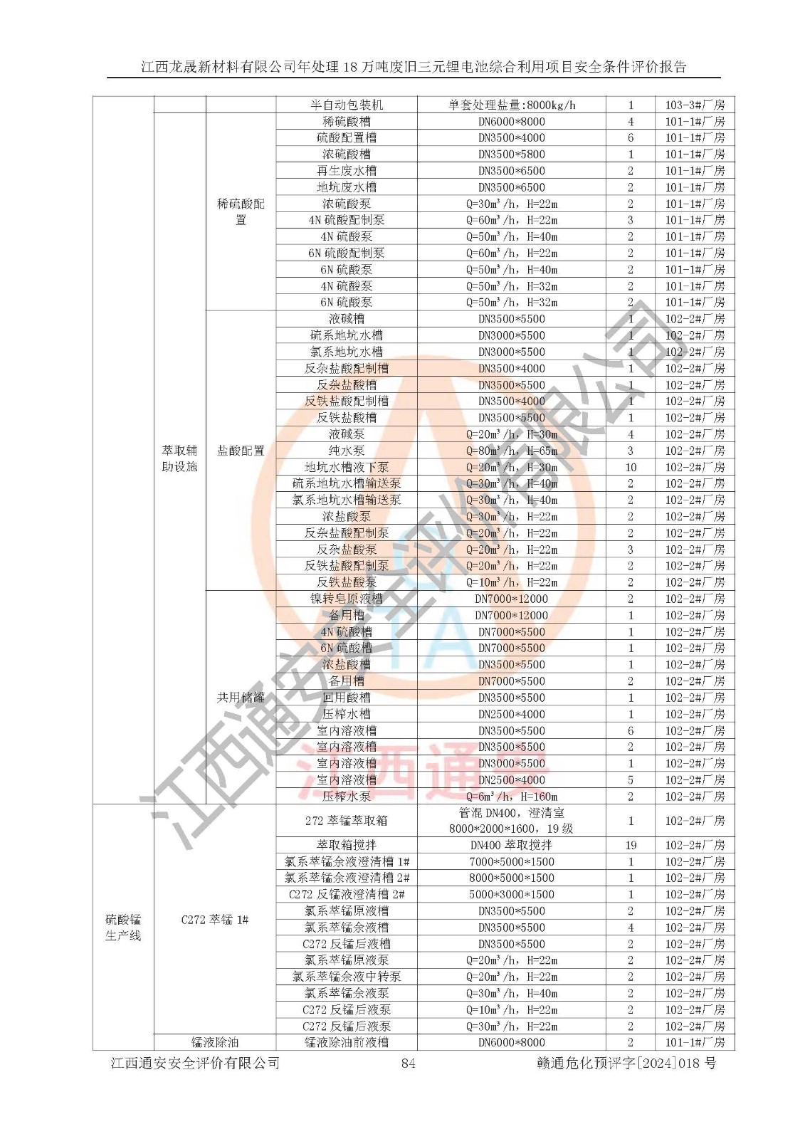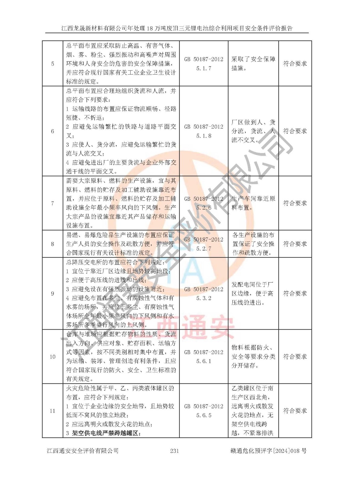 评价结论 | 江西龙晟新材料有限公司年处理18万吨废旧三元锂电池综合利用项目在以后的初步设计、施工图设计和建设施工、安装调试及生产运行中,如能严格执行**有关安全生产的法律法规、规章、标准、规范,认真落实项目可行性研究报告提出的安全对策措施,并合理采纳本报告中提出的安全对策措施及建议,真正做到安全设施与主体工程同时设计、同时施工、同时投入生产和使用,则工程潜在的危险、有害因素可得到**控制,风险在**控制和可接受范围内。 | |||