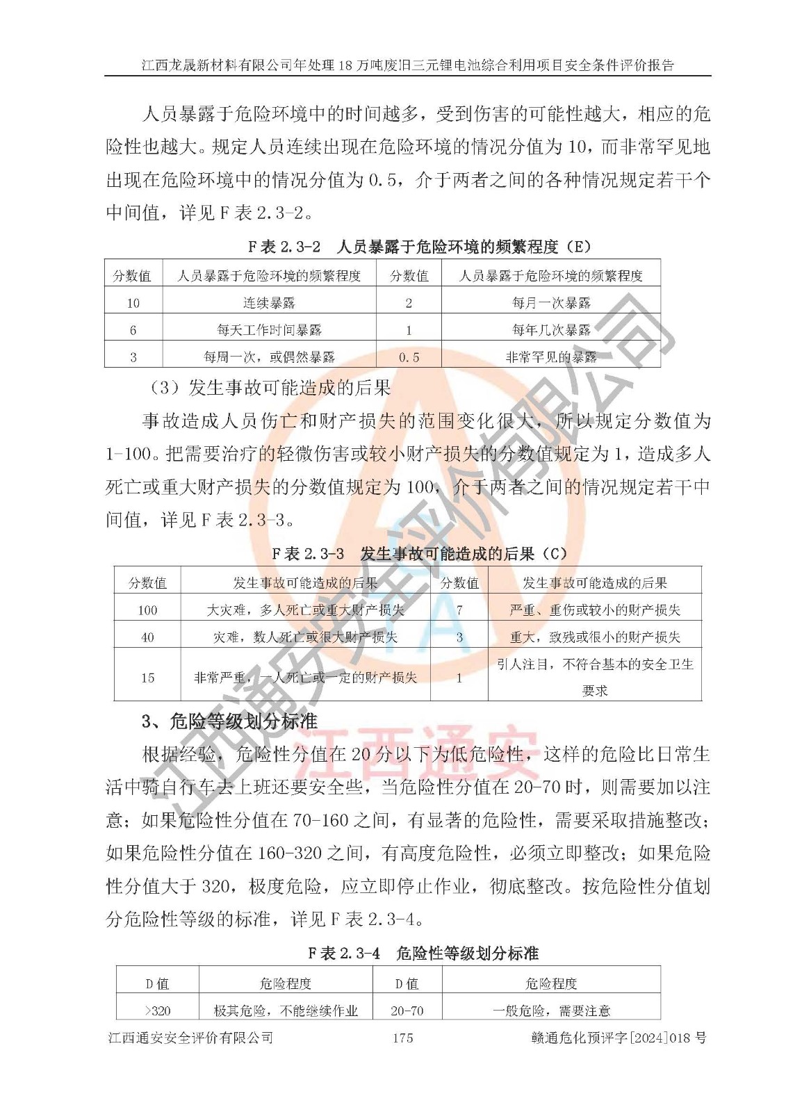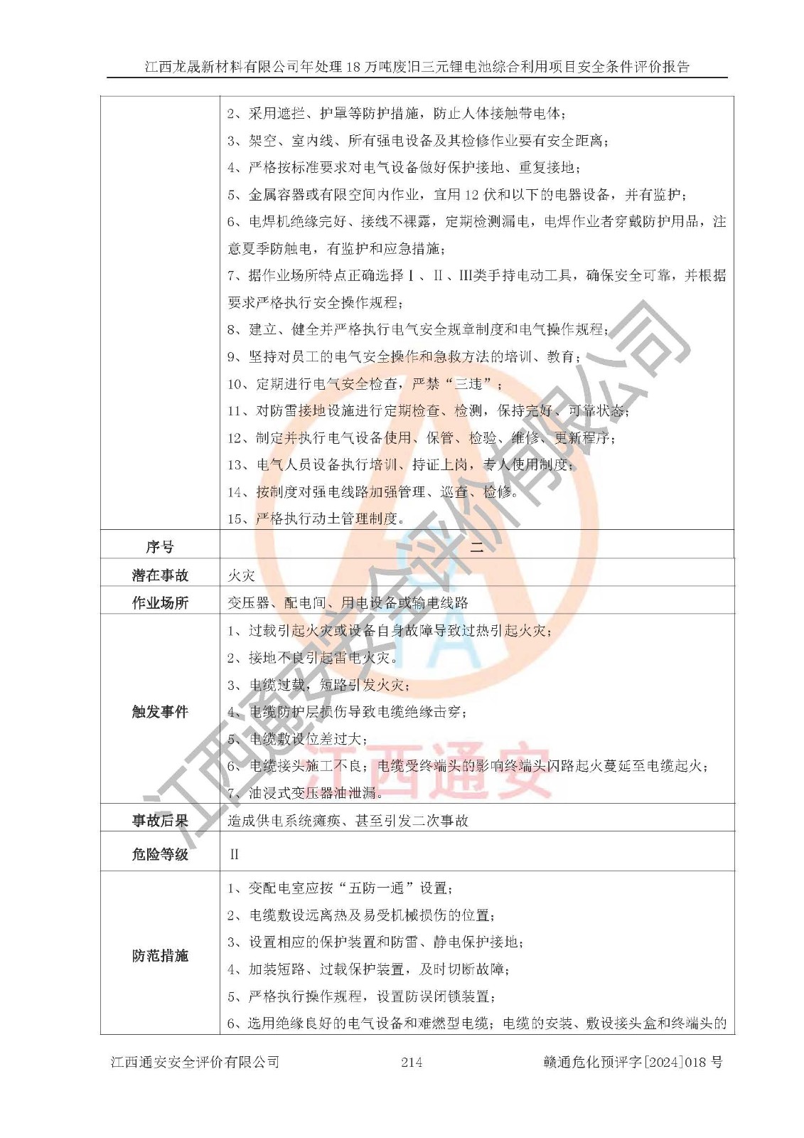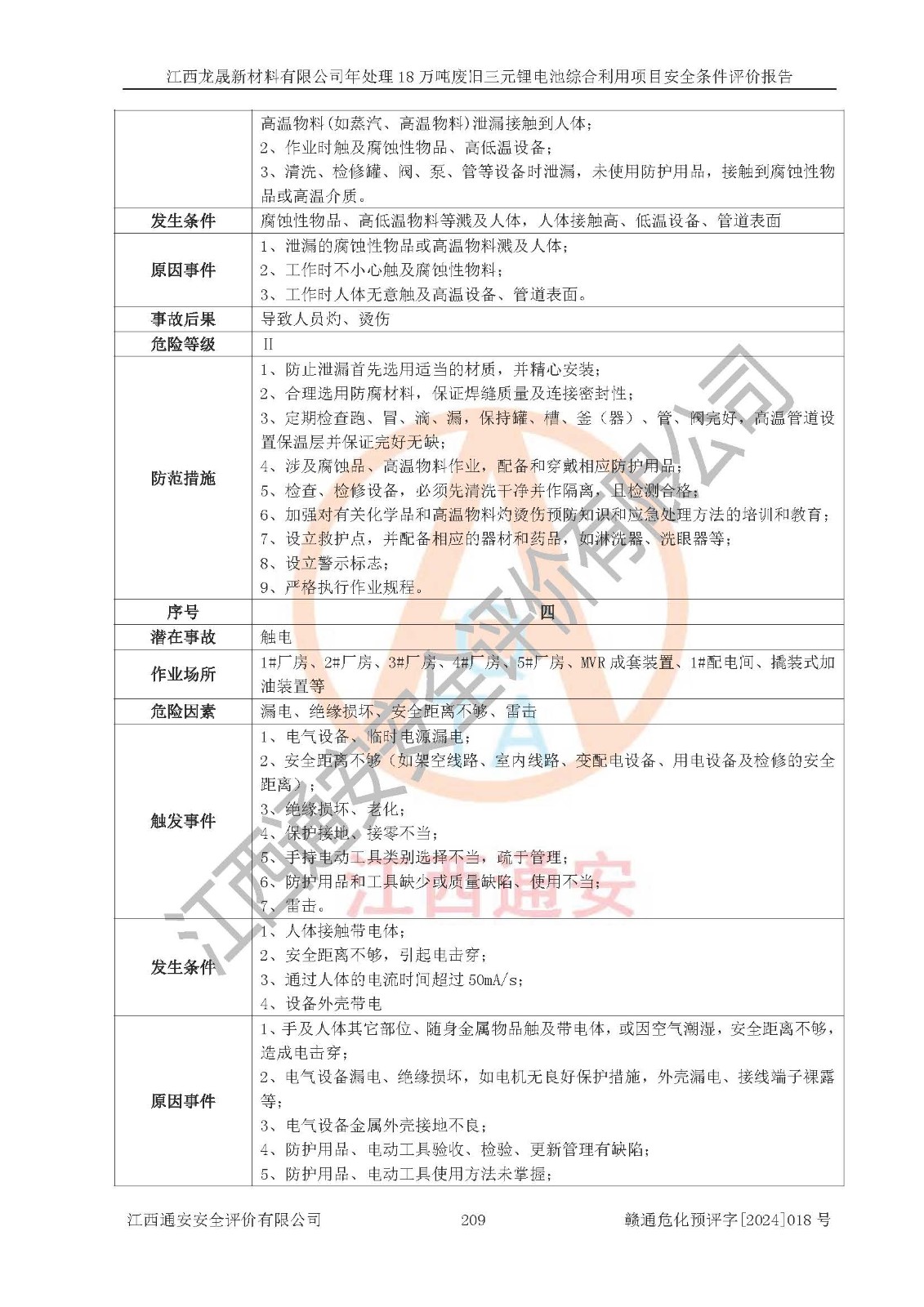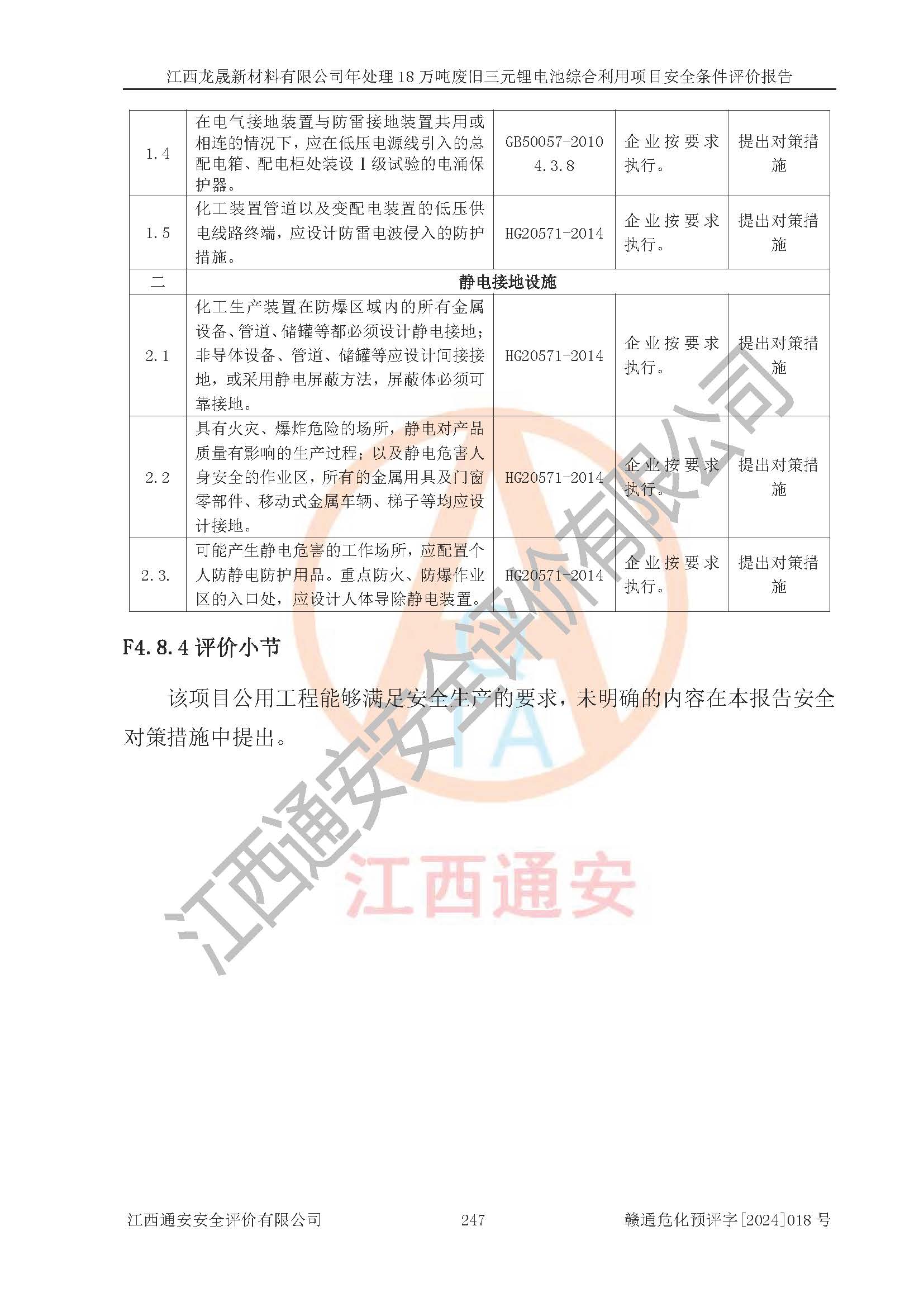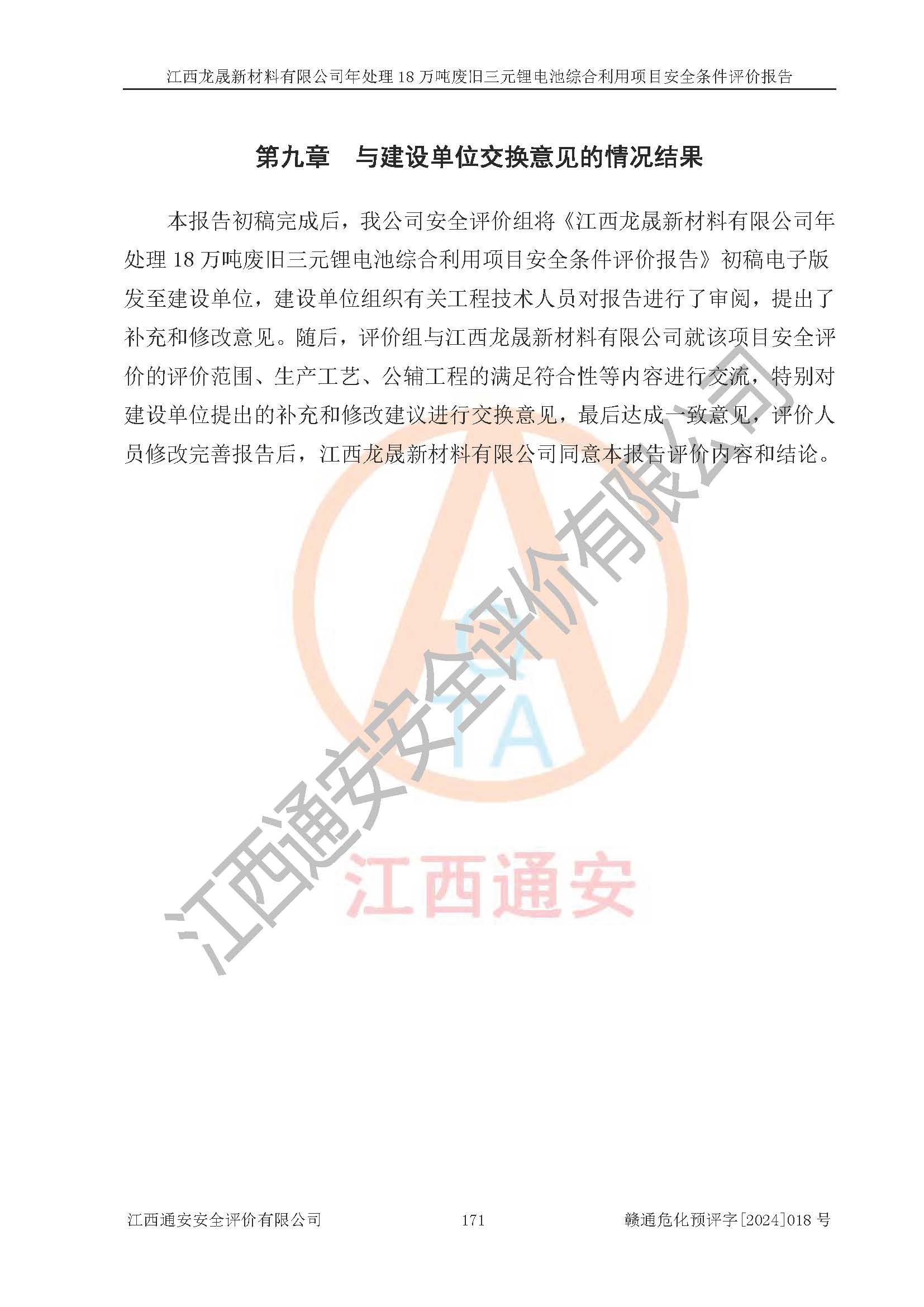 评价结论 | 江西龙晟新材料有限公司年处理18万吨废旧三元锂电池综合利用项目在以后的初步设计、施工图设计和建设施工、安装调试及生产运行中,如能严格执行**有关安全生产的法律法规、规章、标准、规范,认真落实项目可行性研究报告提出的安全对策措施,并合理采纳本报告中提出的安全对策措施及建议,真正做到安全设施与主体工程同时设计、同时施工、同时投入生产和使用,则工程潜在的危险、有害因素可得到**控制,风险在**控制和可接受范围内。 | |||
