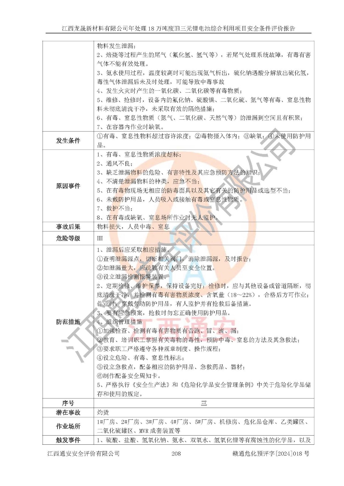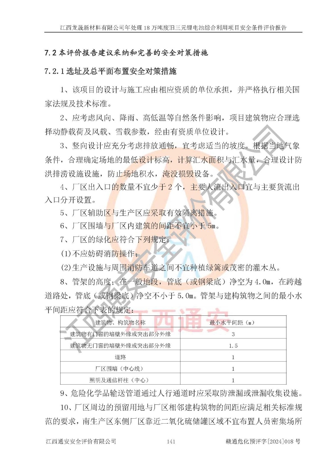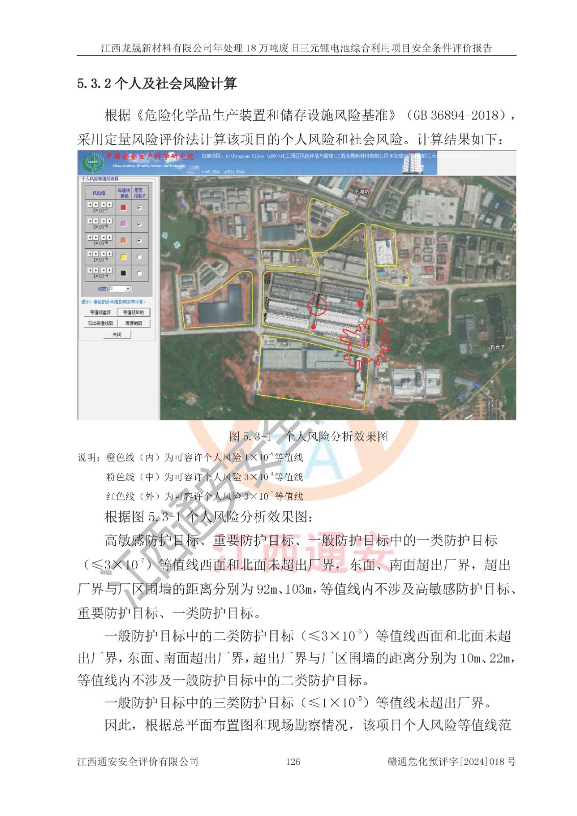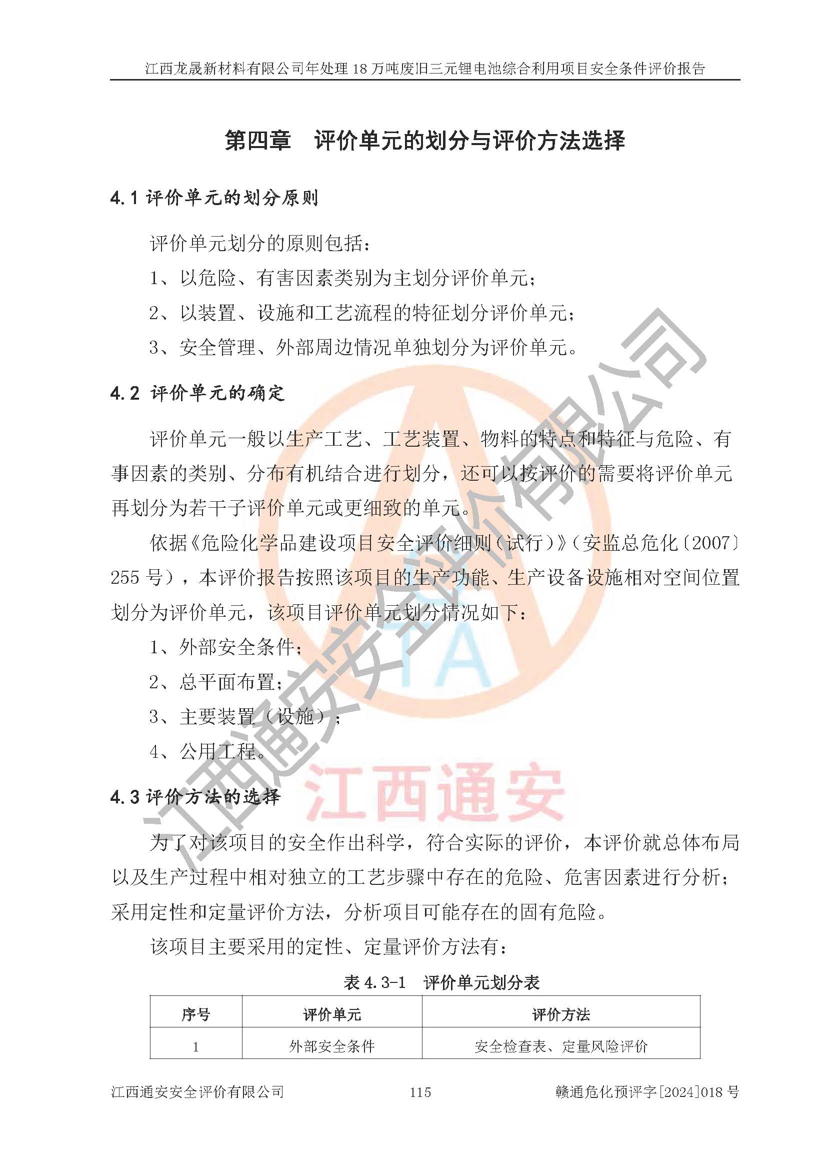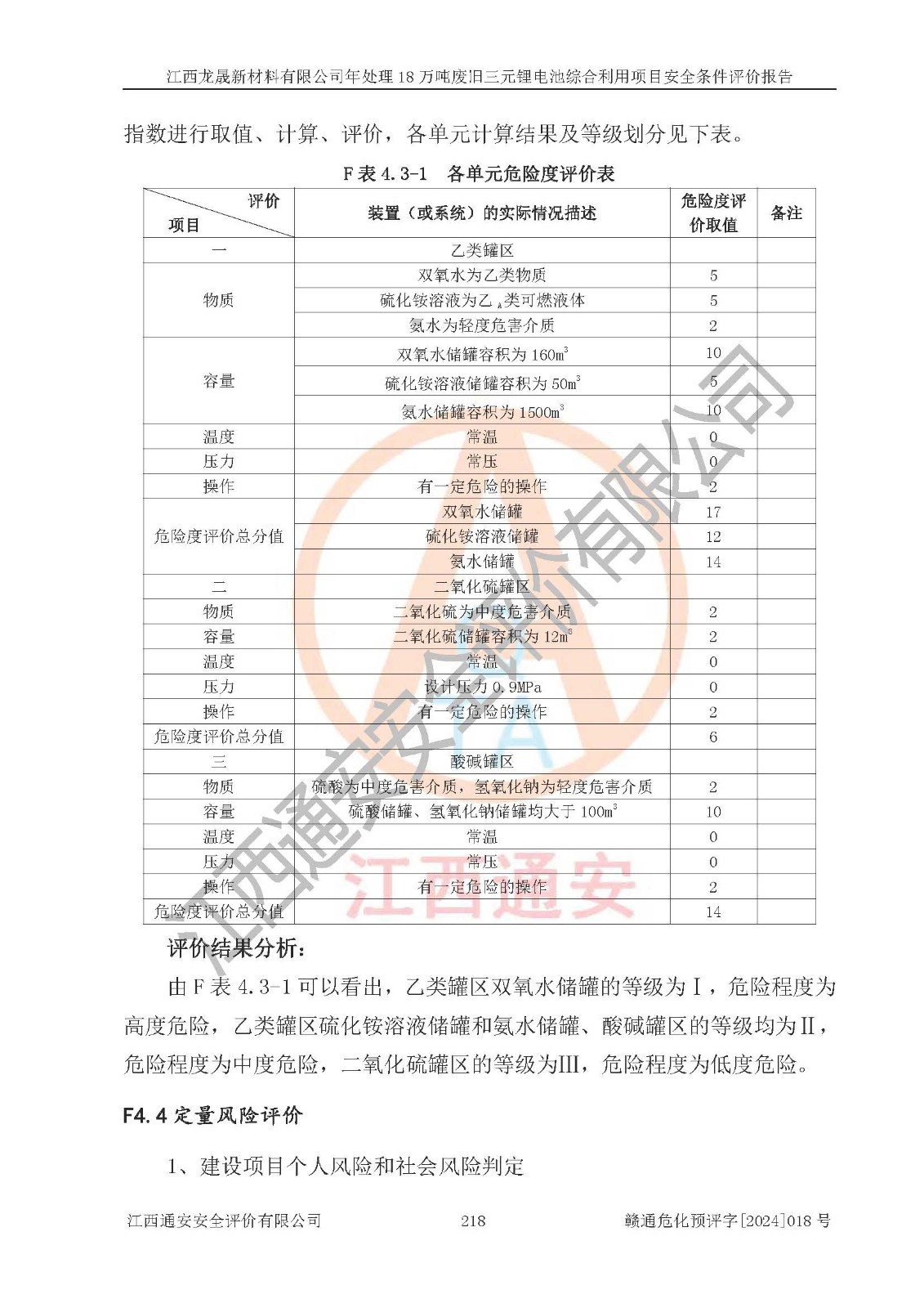 评价结论 | 江西龙晟新材料有限公司年处理18万吨废旧三元锂电池综合利用项目在以后的初步设计、施工图设计和建设施工、安装调试及生产运行中,如能严格执行**有关安全生产的法律法规、规章、标准、规范,认真落实项目可行性研究报告提出的安全对策措施,并合理采纳本报告中提出的安全对策措施及建议,真正做到安全设施与主体工程同时设计、同时施工、同时投入生产和使用,则工程潜在的危险、有害因素可得到**控制,风险在**控制和可接受范围内。 | |||