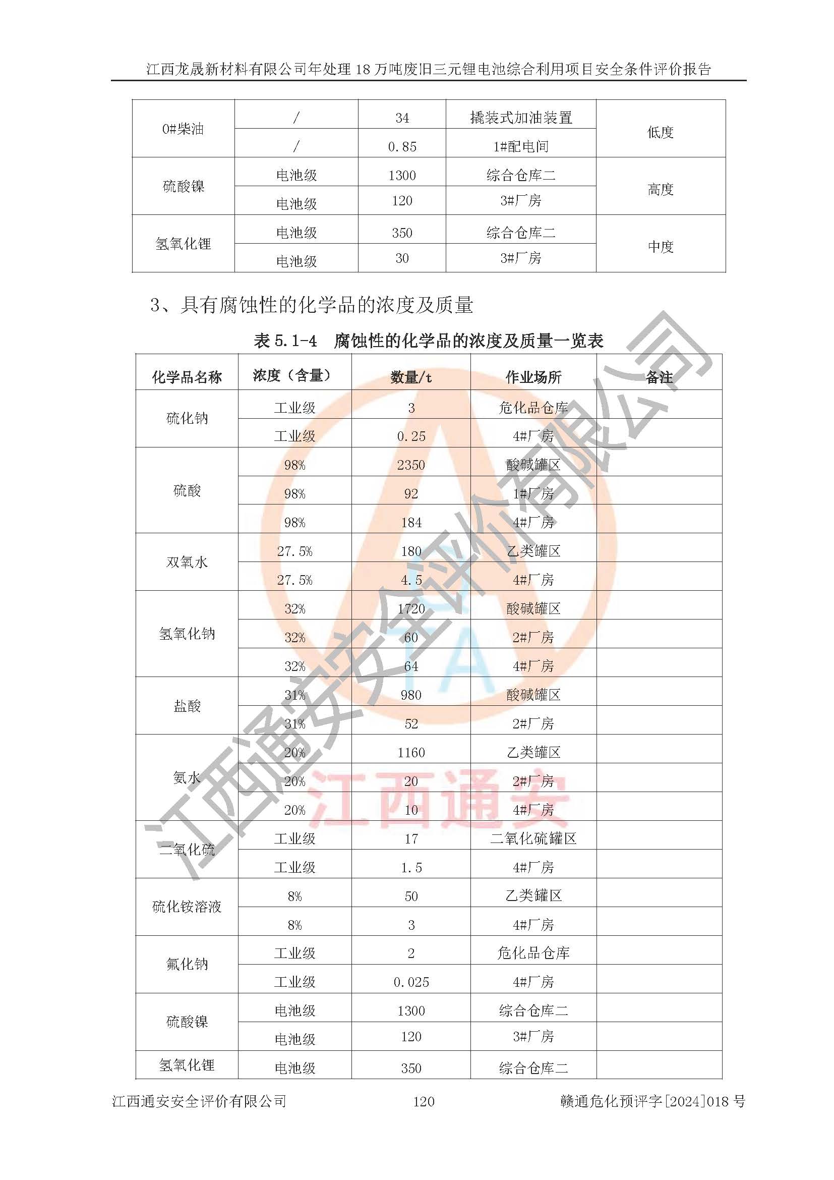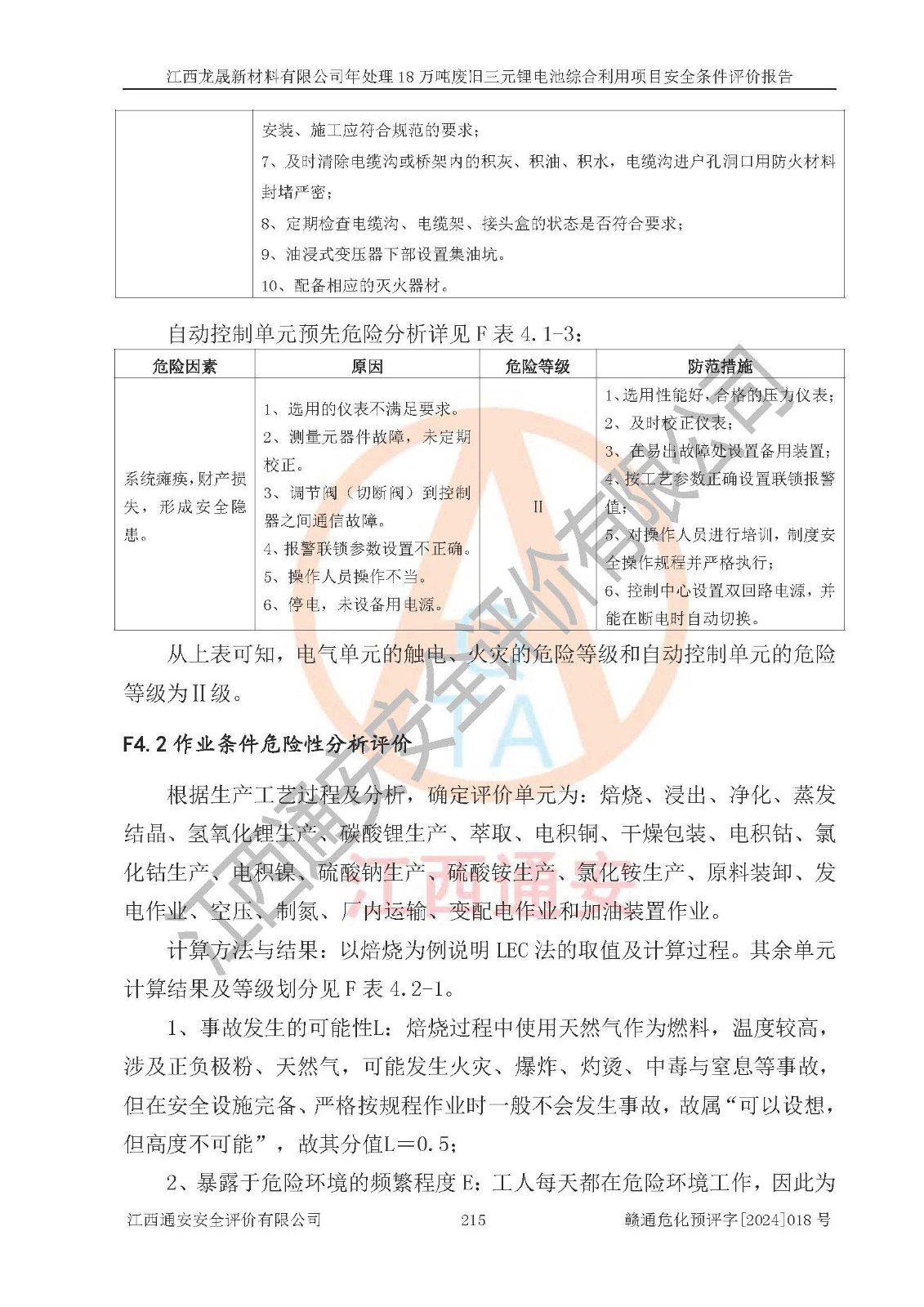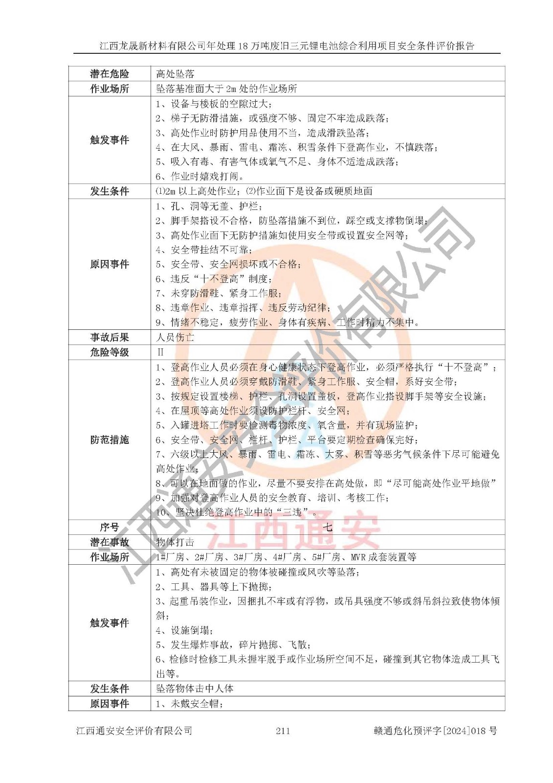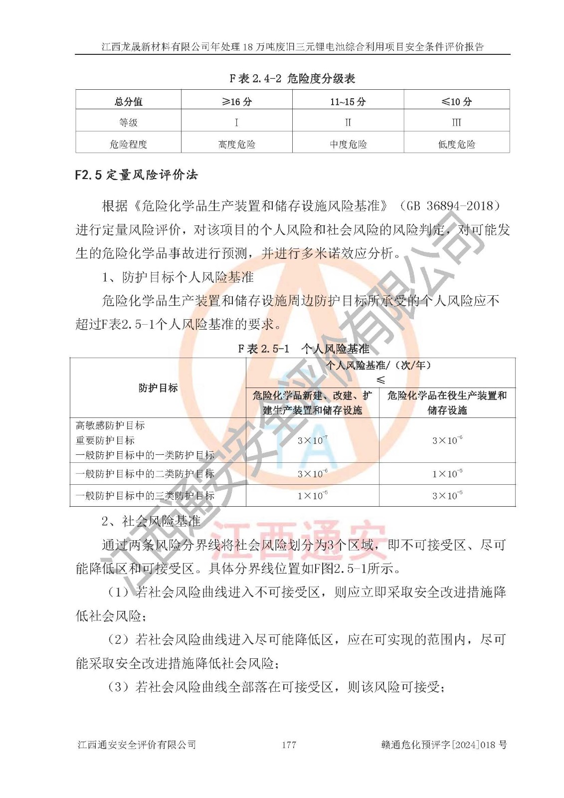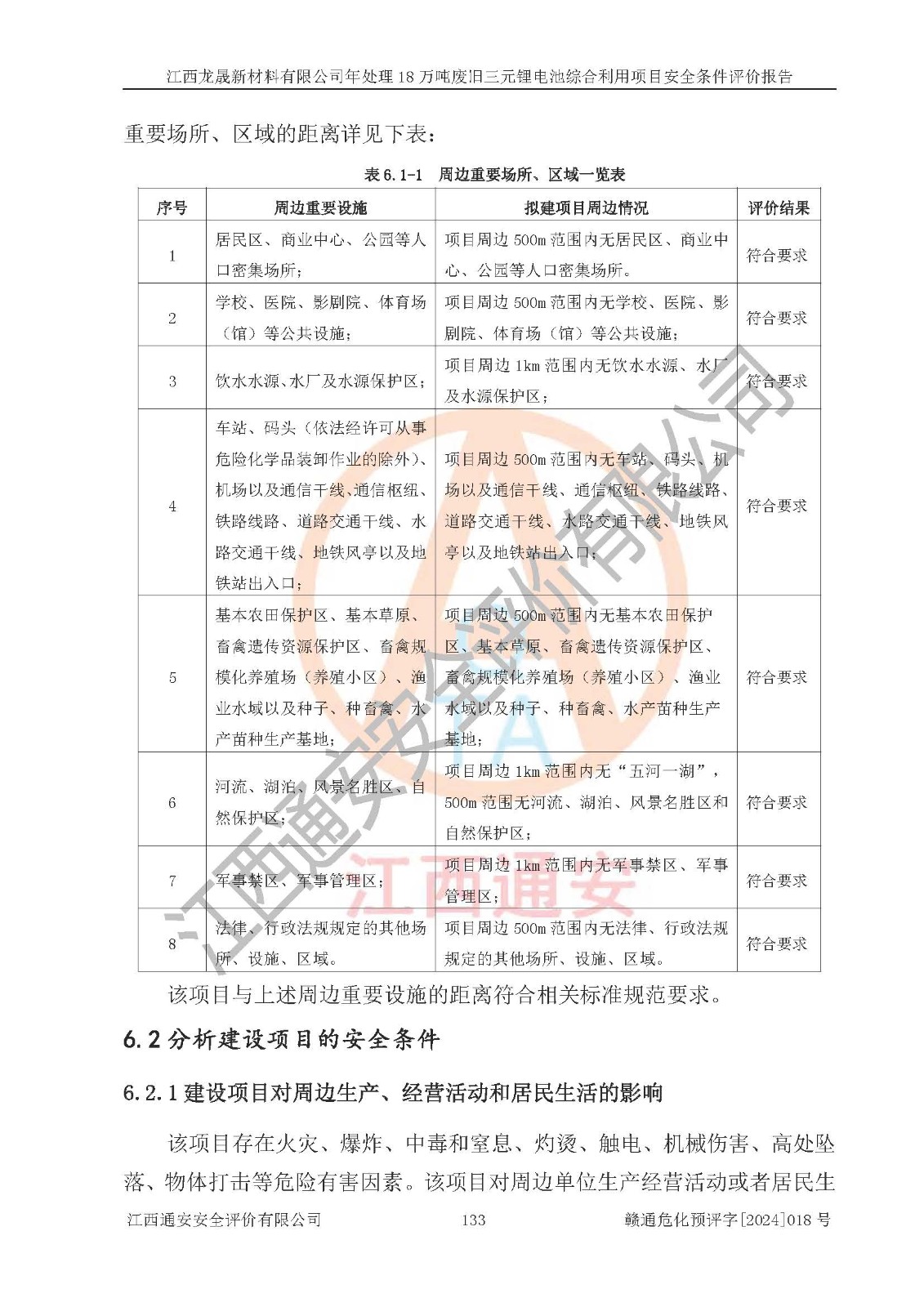 评价结论 | 江西龙晟新材料有限公司年处理18万吨废旧三元锂电池综合利用项目在以后的初步设计、施工图设计和建设施工、安装调试及生产运行中,如能严格执行**有关安全生产的法律法规、规章、标准、规范,认真落实项目可行性研究报告提出的安全对策措施,并合理采纳本报告中提出的安全对策措施及建议,真正做到安全设施与主体工程同时设计、同时施工、同时投入生产和使用,则工程潜在的危险、有害因素可得到**控制,风险在**控制和可接受范围内。 | |||