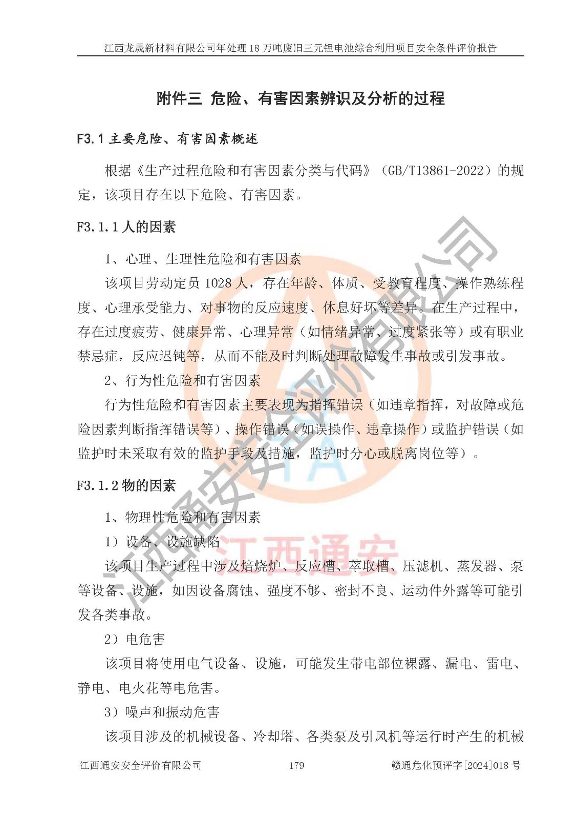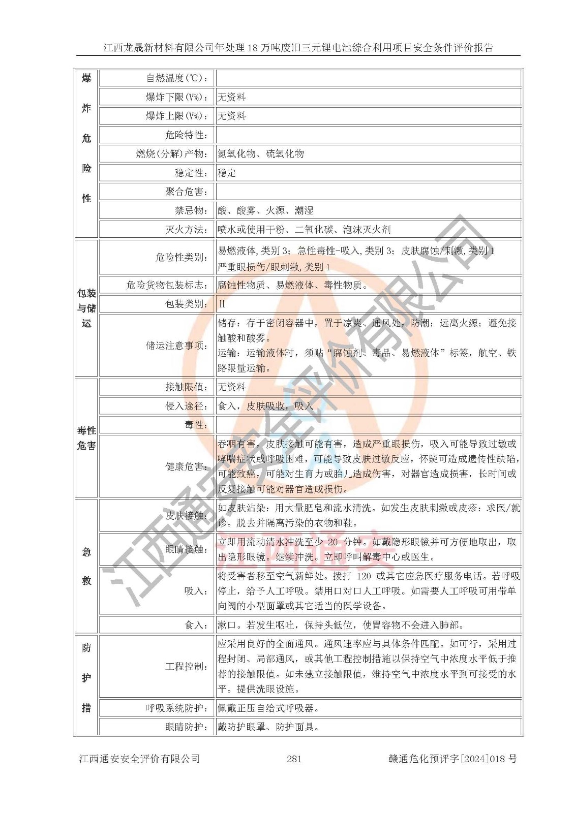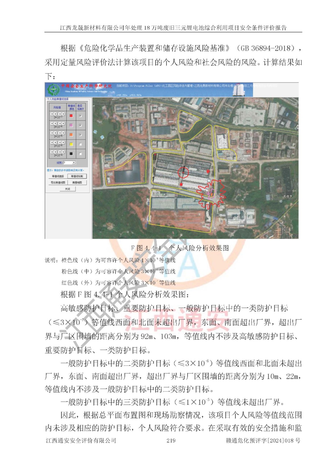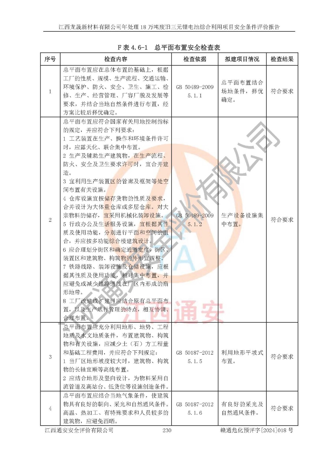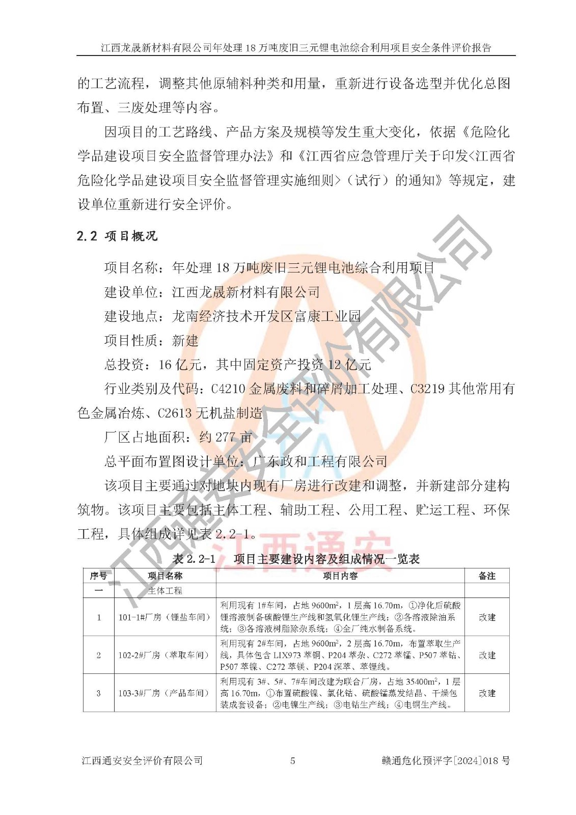 评价结论 | 江西龙晟新材料有限公司年处理18万吨废旧三元锂电池综合利用项目在以后的初步设计、施工图设计和建设施工、安装调试及生产运行中,如能严格执行**有关安全生产的法律法规、规章、标准、规范,认真落实项目可行性研究报告提出的安全对策措施,并合理采纳本报告中提出的安全对策措施及建议,真正做到安全设施与主体工程同时设计、同时施工、同时投入生产和使用,则工程潜在的危险、有害因素可得到**控制,风险在**控制和可接受范围内。 | |||