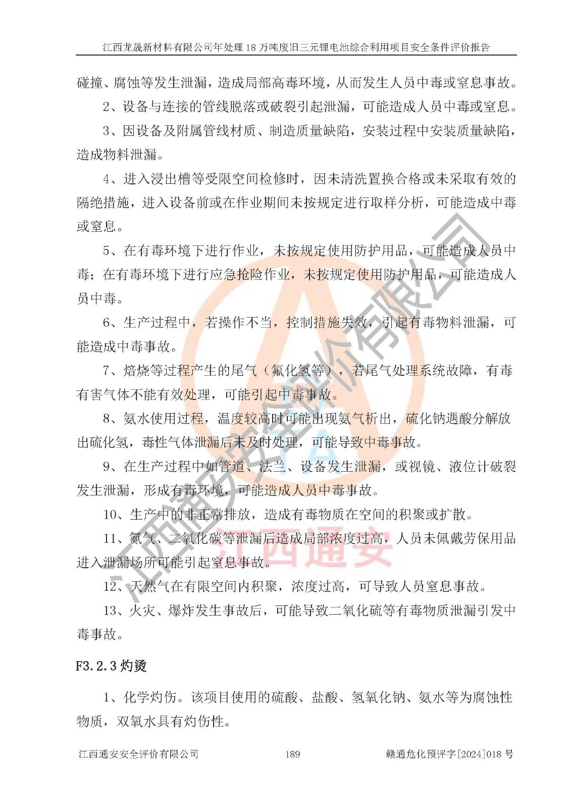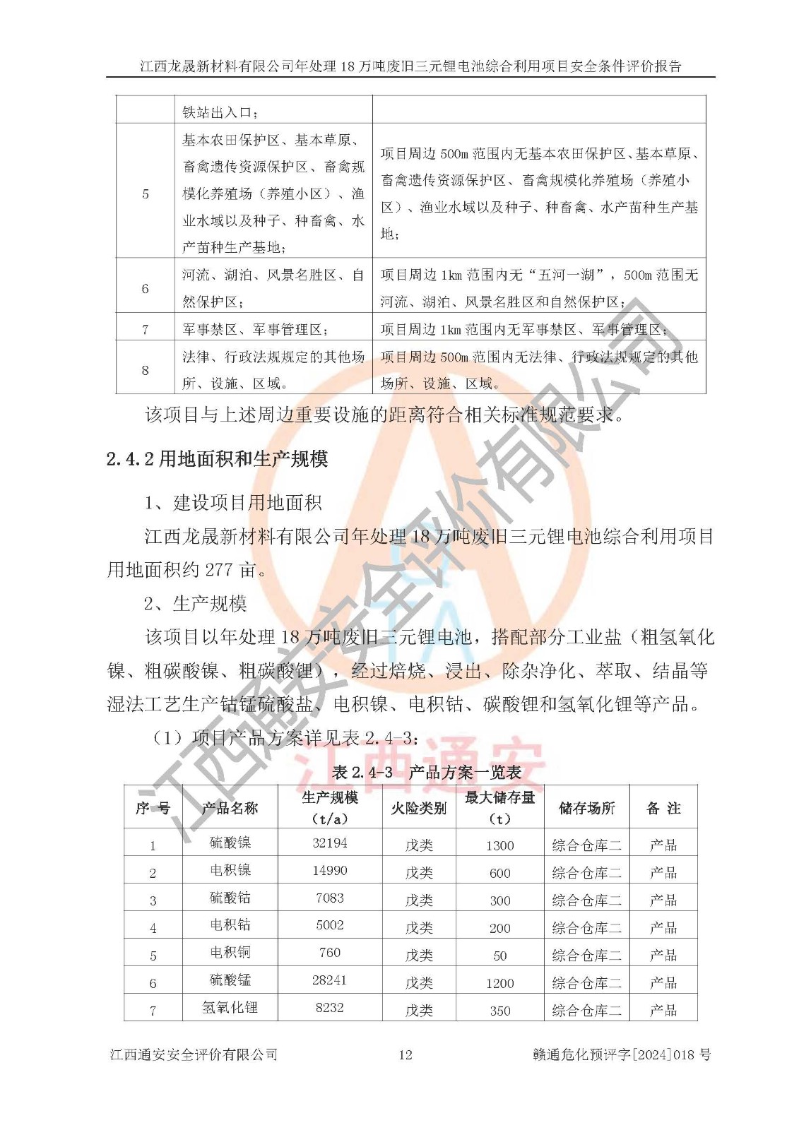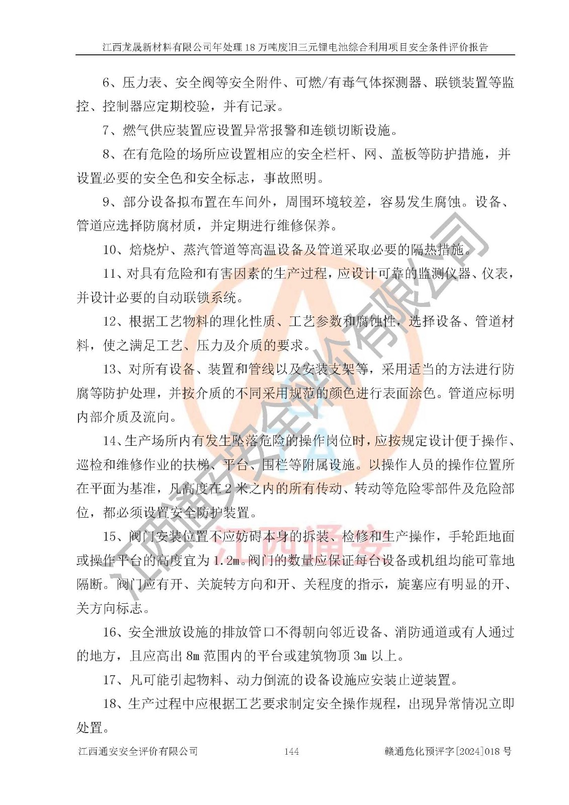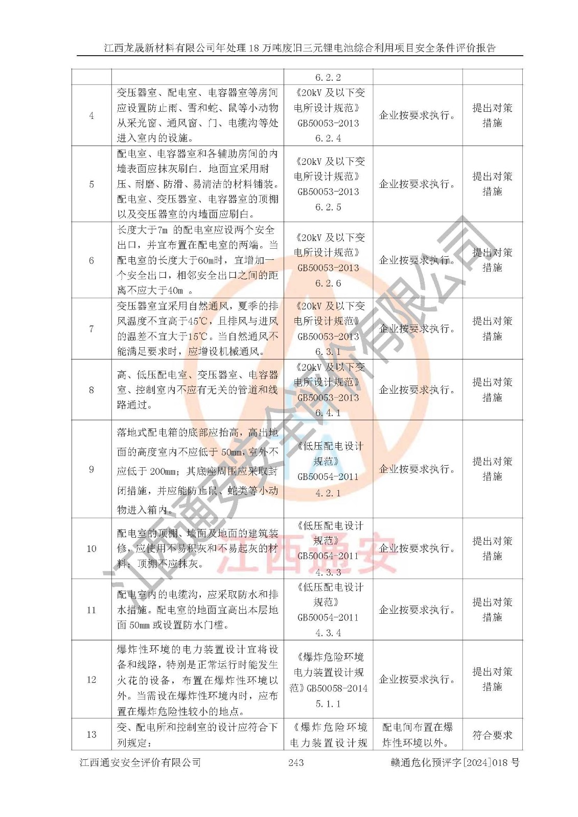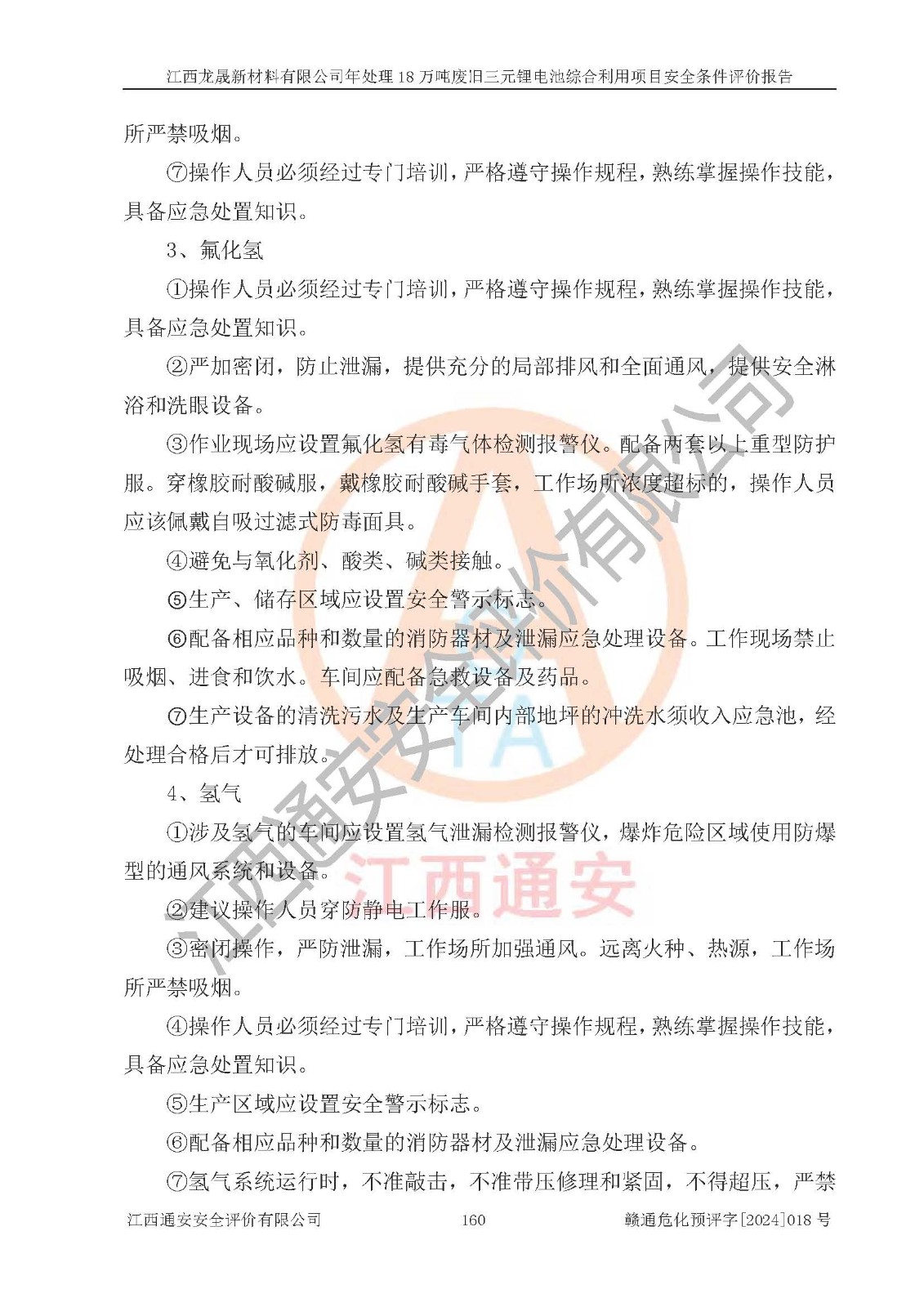 评价结论 | 江西龙晟新材料有限公司年处理18万吨废旧三元锂电池综合利用项目在以后的初步设计、施工图设计和建设施工、安装调试及生产运行中,如能严格执行**有关安全生产的法律法规、规章、标准、规范,认真落实项目可行性研究报告提出的安全对策措施,并合理采纳本报告中提出的安全对策措施及建议,真正做到安全设施与主体工程同时设计、同时施工、同时投入生产和使用,则工程潜在的危险、有害因素可得到**控制,风险在**控制和可接受范围内。 | |||