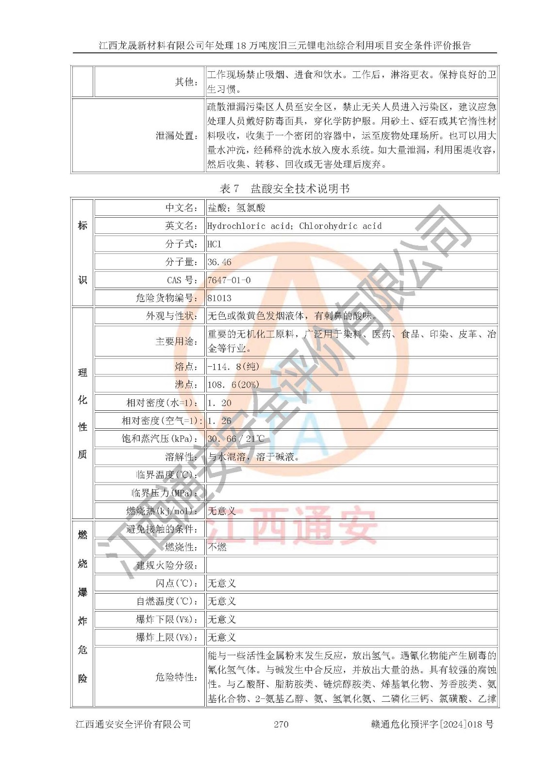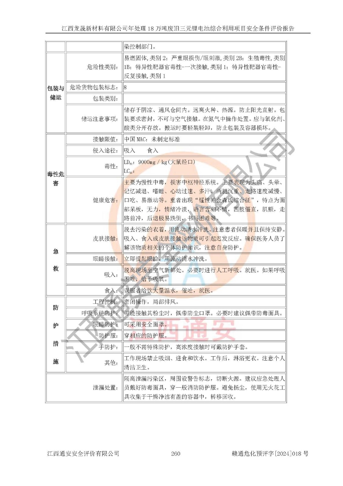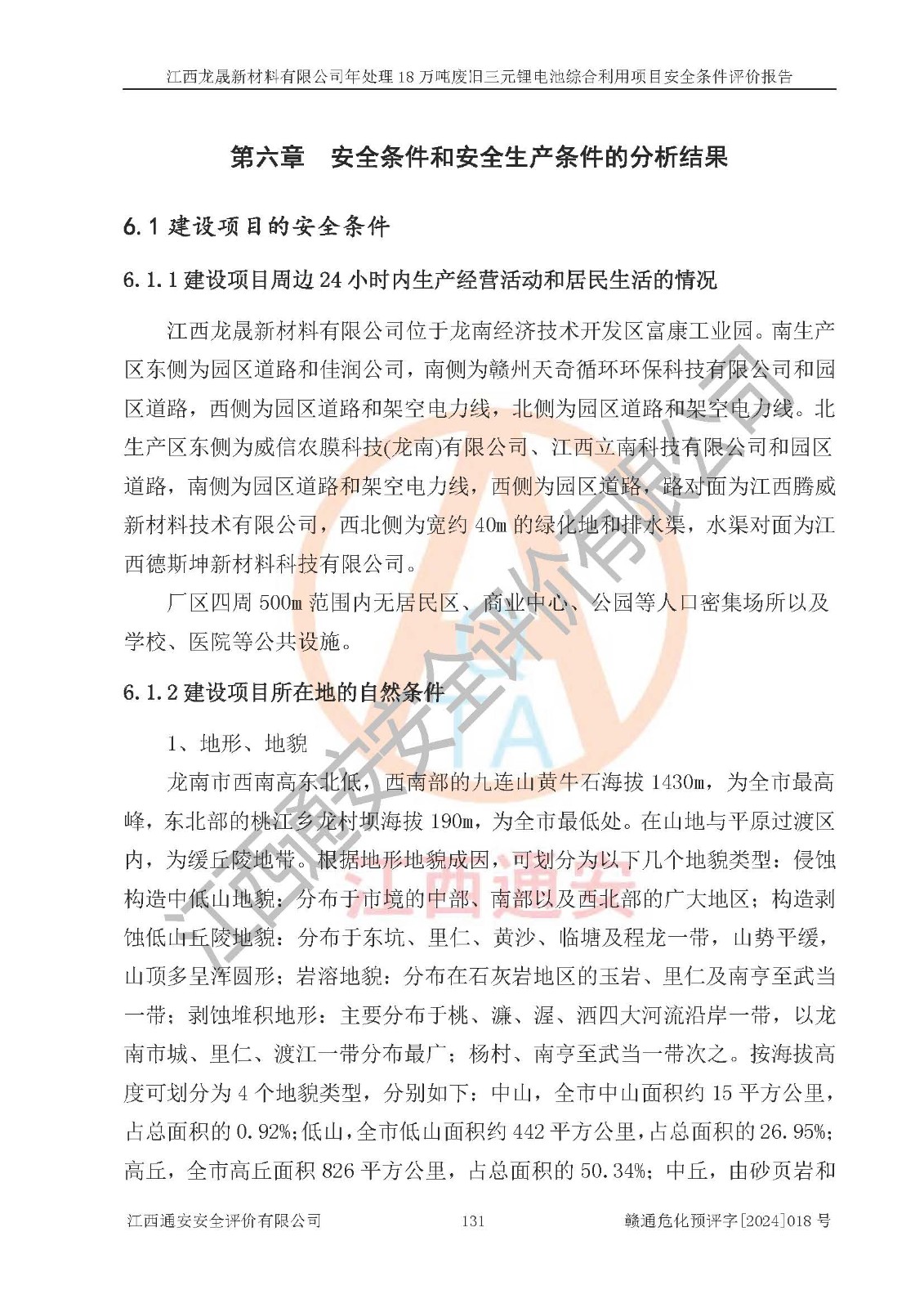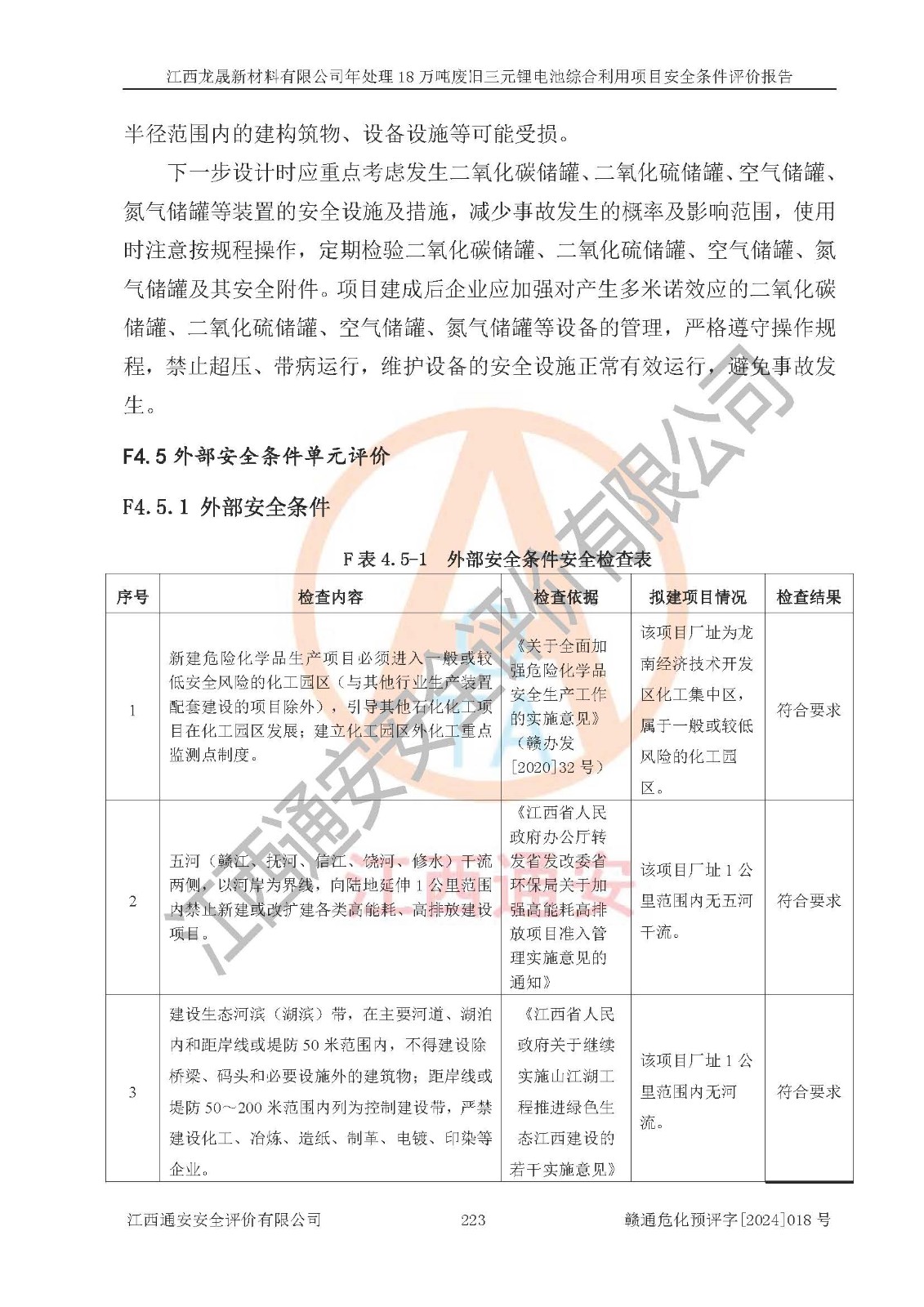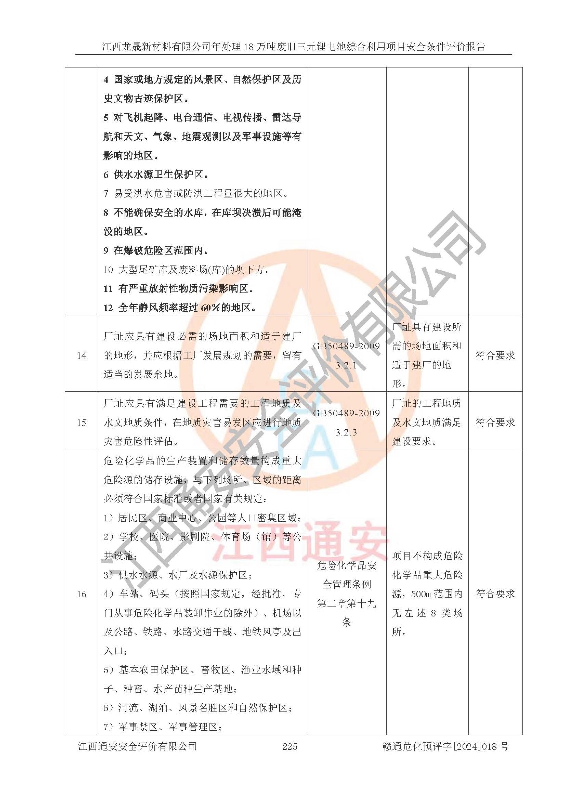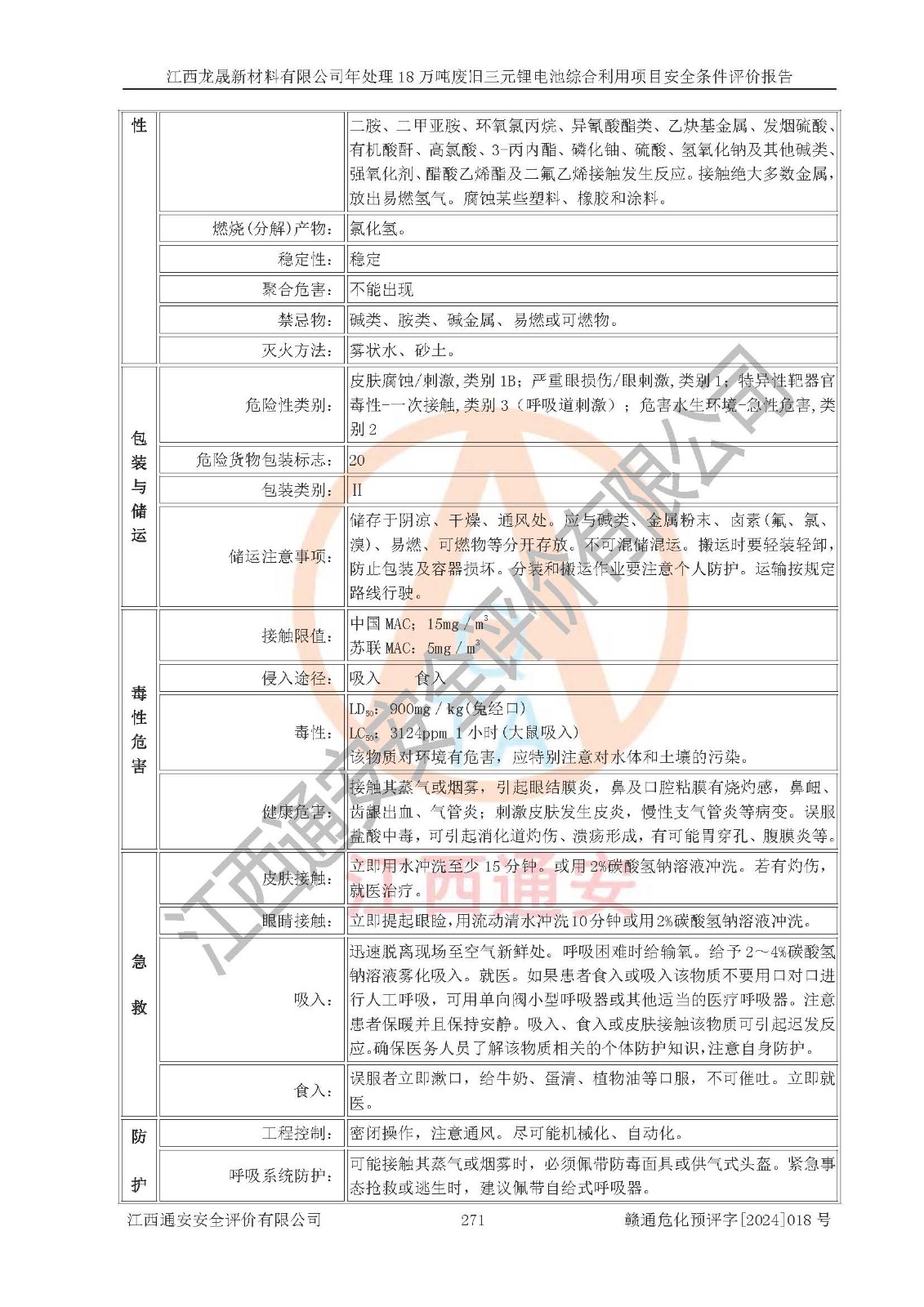 评价结论 | 江西龙晟新材料有限公司年处理18万吨废旧三元锂电池综合利用项目在以后的初步设计、施工图设计和建设施工、安装调试及生产运行中,如能严格执行**有关安全生产的法律法规、规章、标准、规范,认真落实项目可行性研究报告提出的安全对策措施,并合理采纳本报告中提出的安全对策措施及建议,真正做到安全设施与主体工程同时设计、同时施工、同时投入生产和使用,则工程潜在的危险、有害因素可得到**控制,风险在**控制和可接受范围内。 | |||