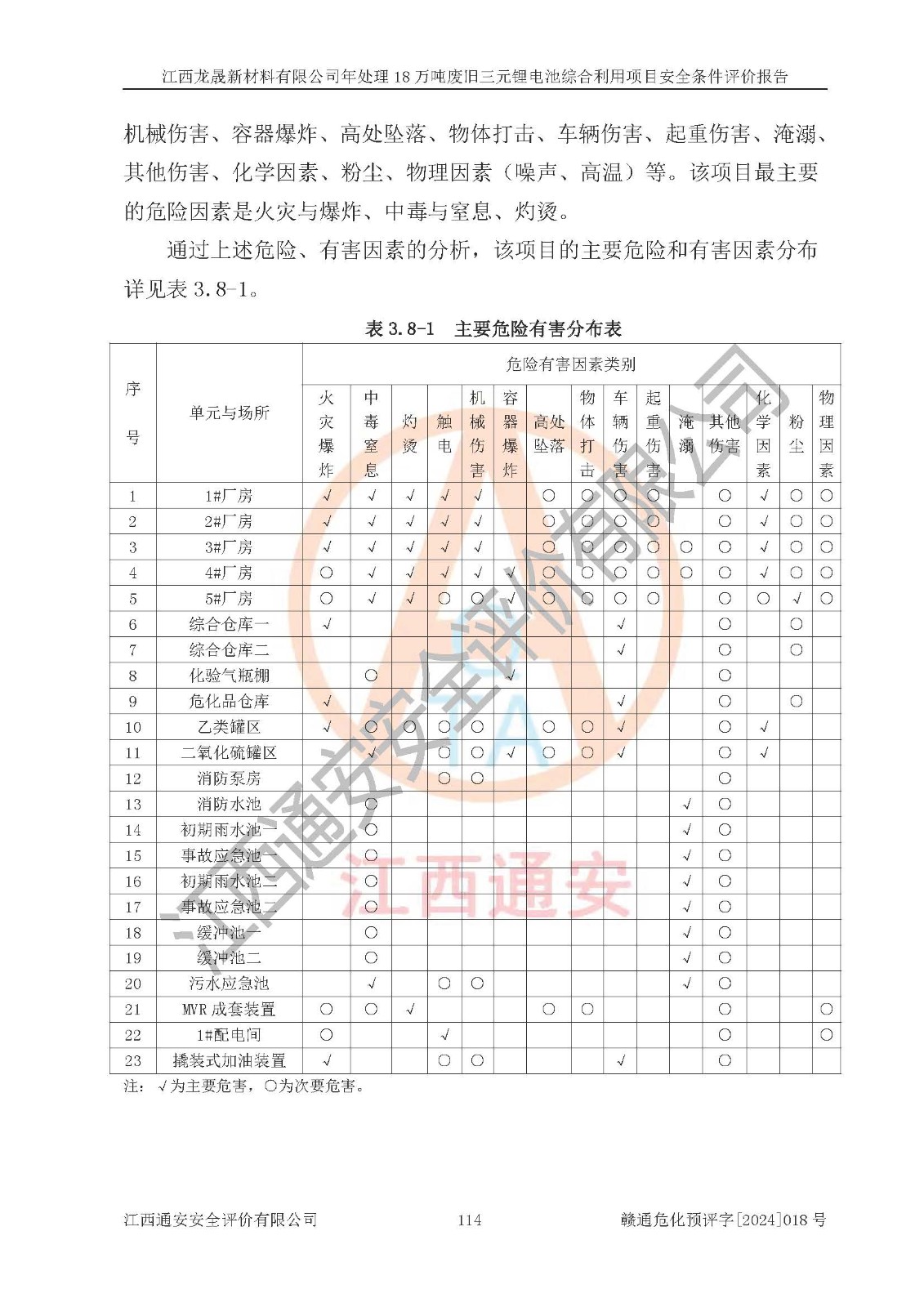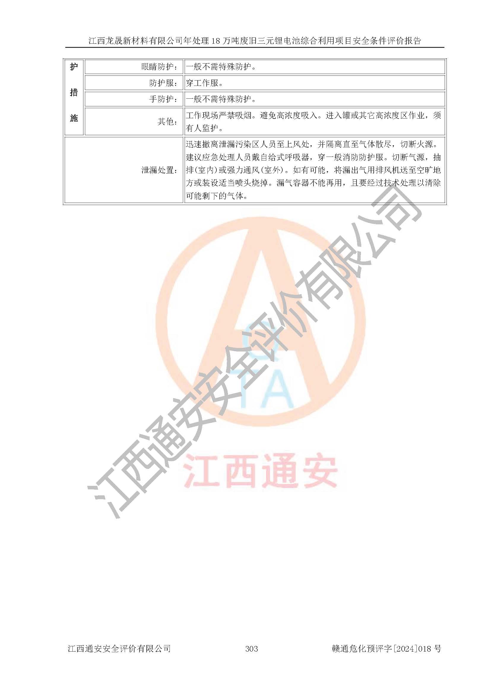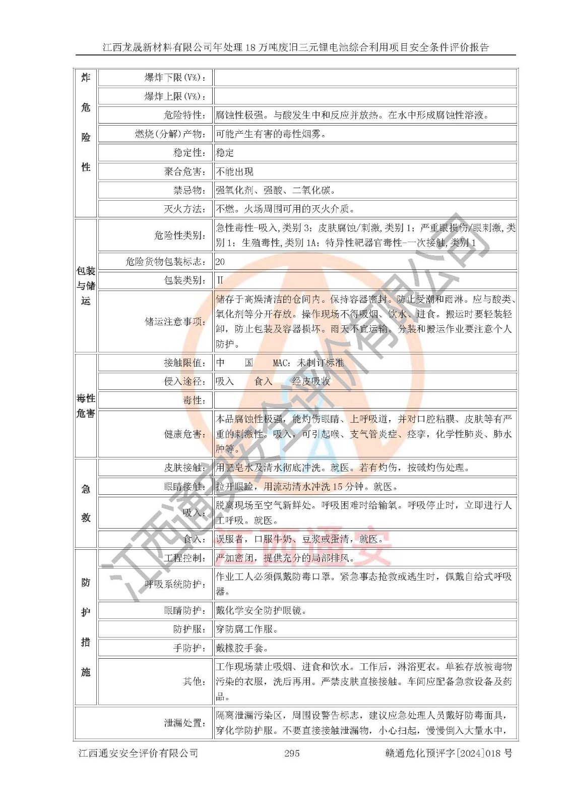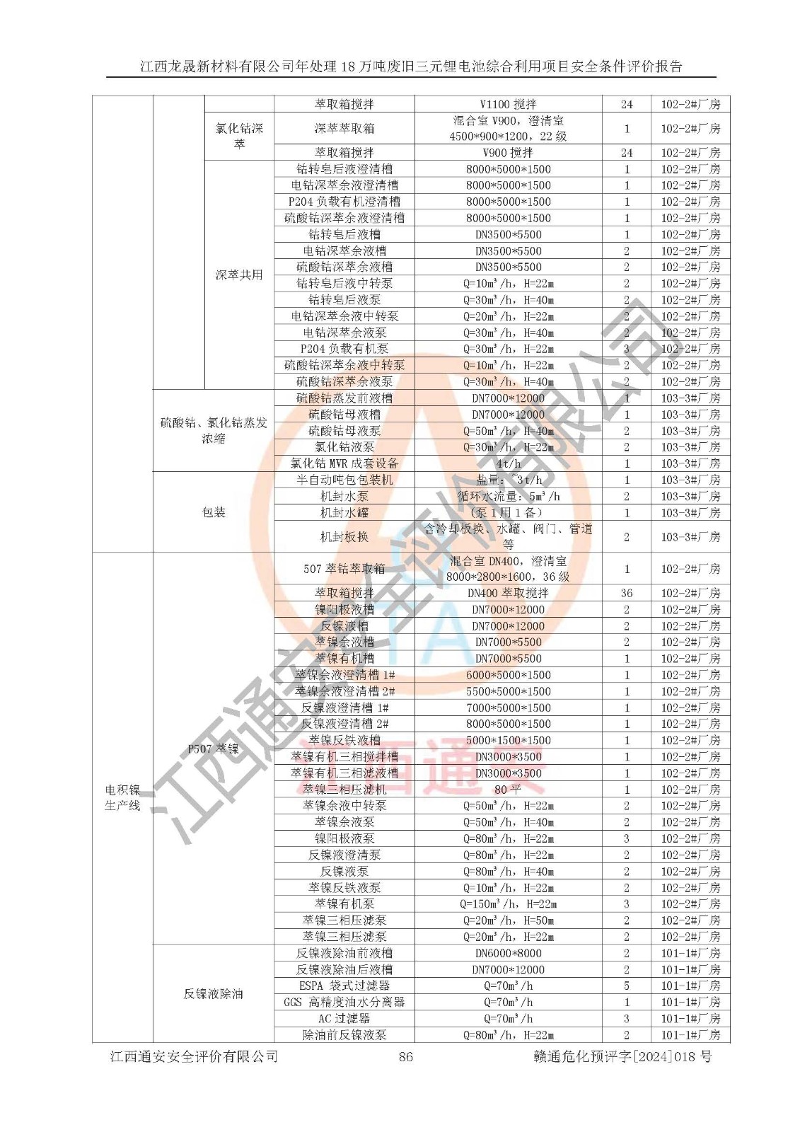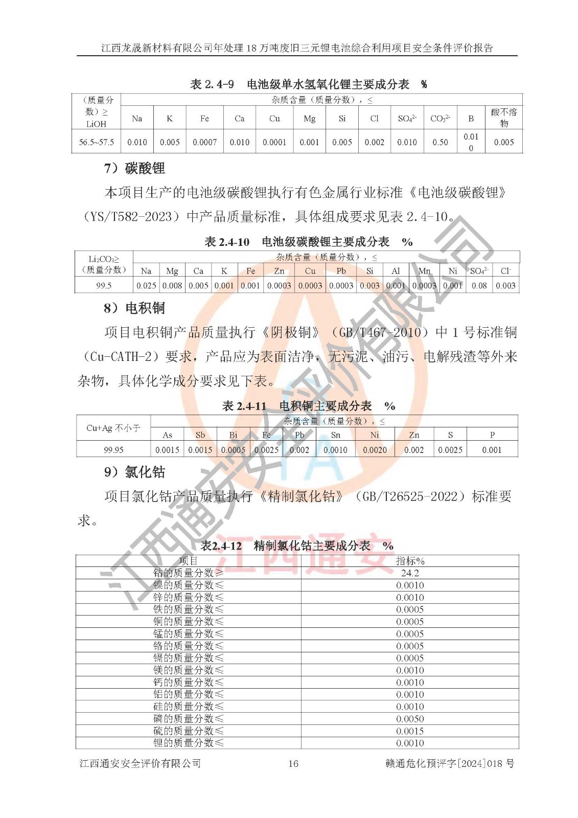 评价结论 | 江西龙晟新材料有限公司年处理18万吨废旧三元锂电池综合利用项目在以后的初步设计、施工图设计和建设施工、安装调试及生产运行中,如能严格执行**有关安全生产的法律法规、规章、标准、规范,认真落实项目可行性研究报告提出的安全对策措施,并合理采纳本报告中提出的安全对策措施及建议,真正做到安全设施与主体工程同时设计、同时施工、同时投入生产和使用,则工程潜在的危险、有害因素可得到**控制,风险在**控制和可接受范围内。 | |||
