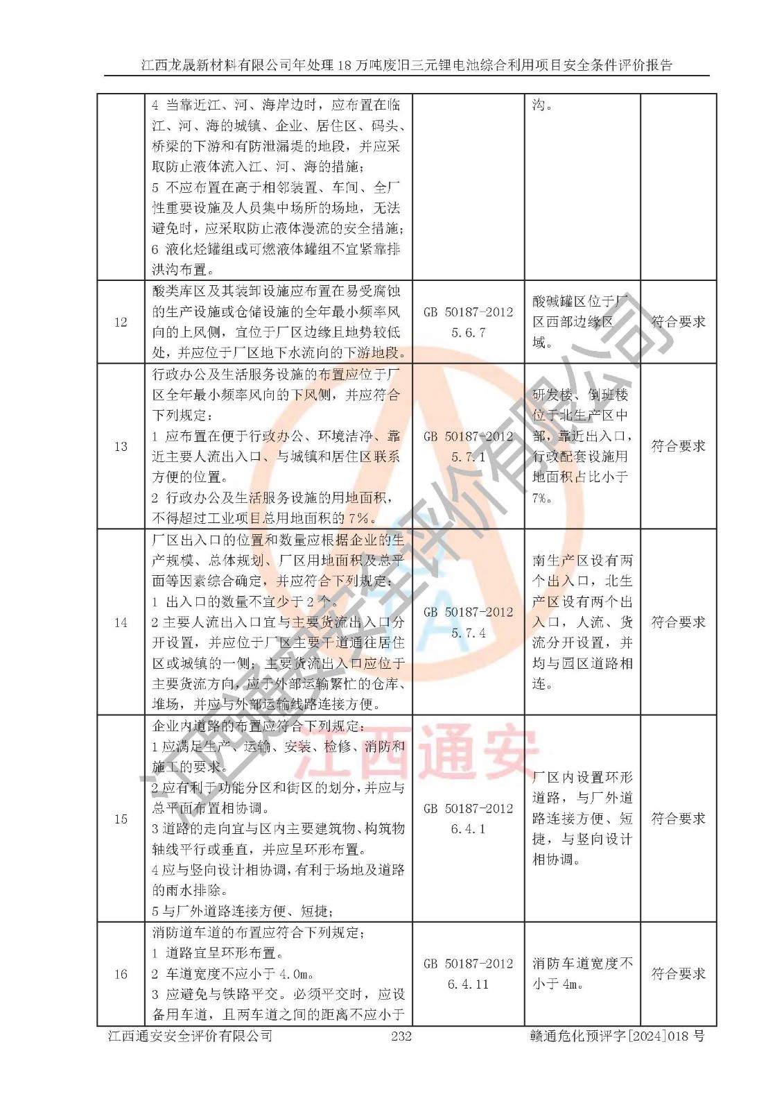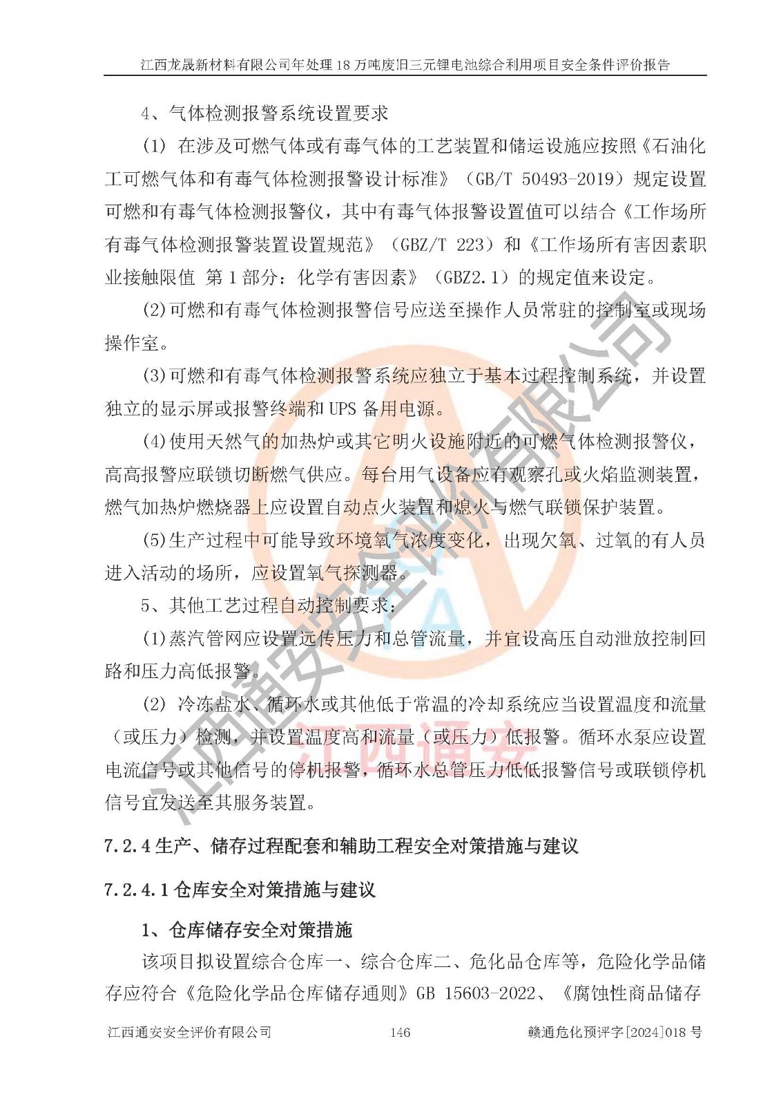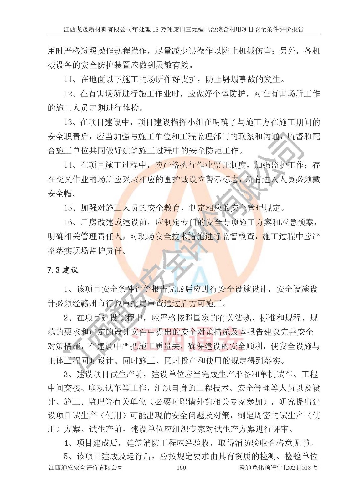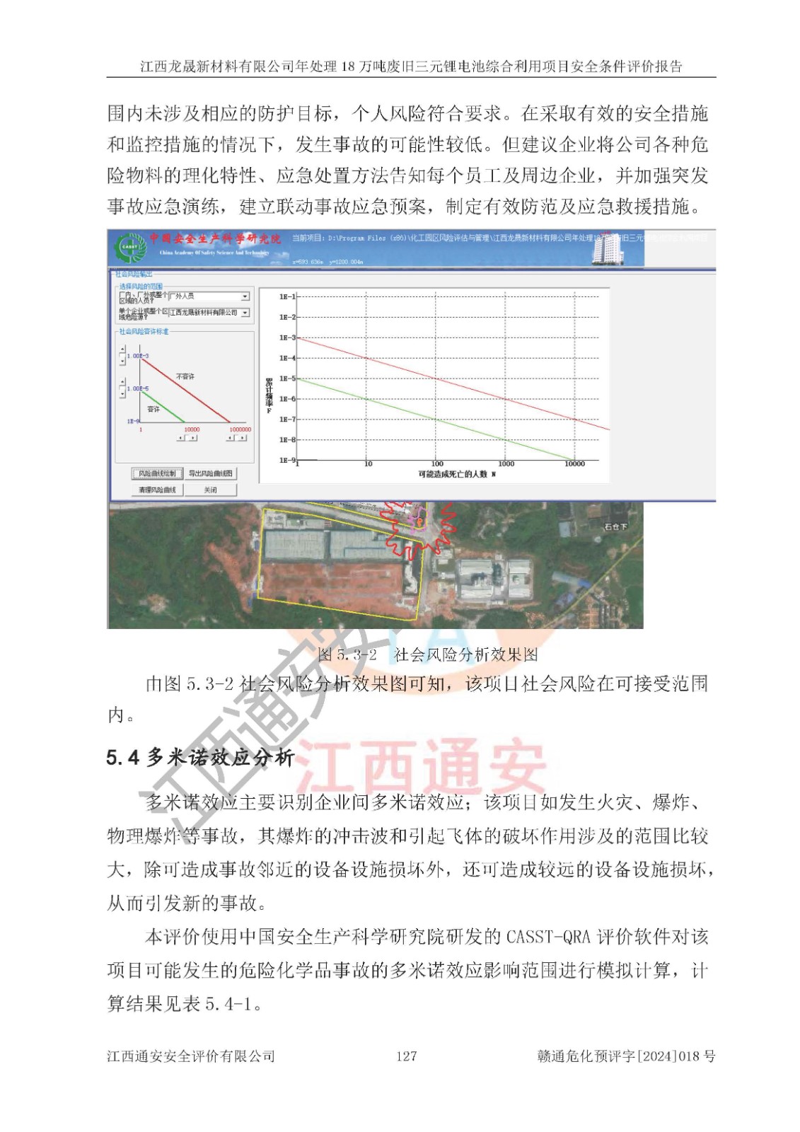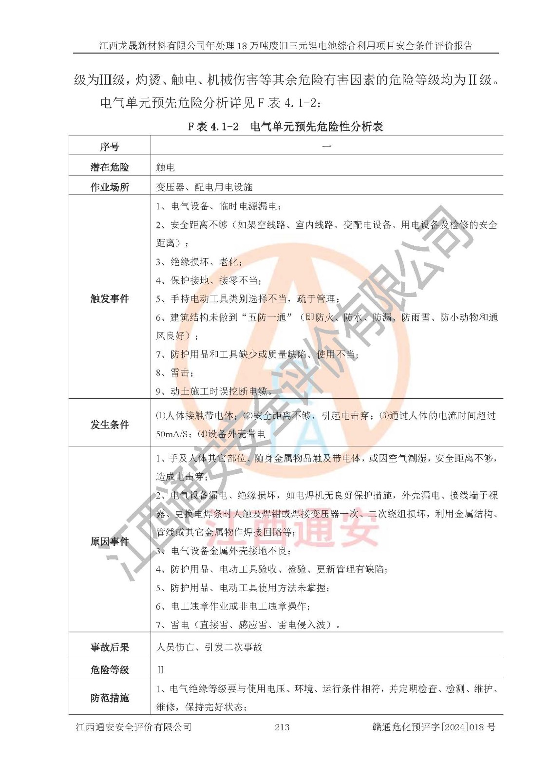 评价结论 | 江西龙晟新材料有限公司年处理18万吨废旧三元锂电池综合利用项目在以后的初步设计、施工图设计和建设施工、安装调试及生产运行中,如能严格执行**有关安全生产的法律法规、规章、标准、规范,认真落实项目可行性研究报告提出的安全对策措施,并合理采纳本报告中提出的安全对策措施及建议,真正做到安全设施与主体工程同时设计、同时施工、同时投入生产和使用,则工程潜在的危险、有害因素可得到**控制,风险在**控制和可接受范围内。 | |||