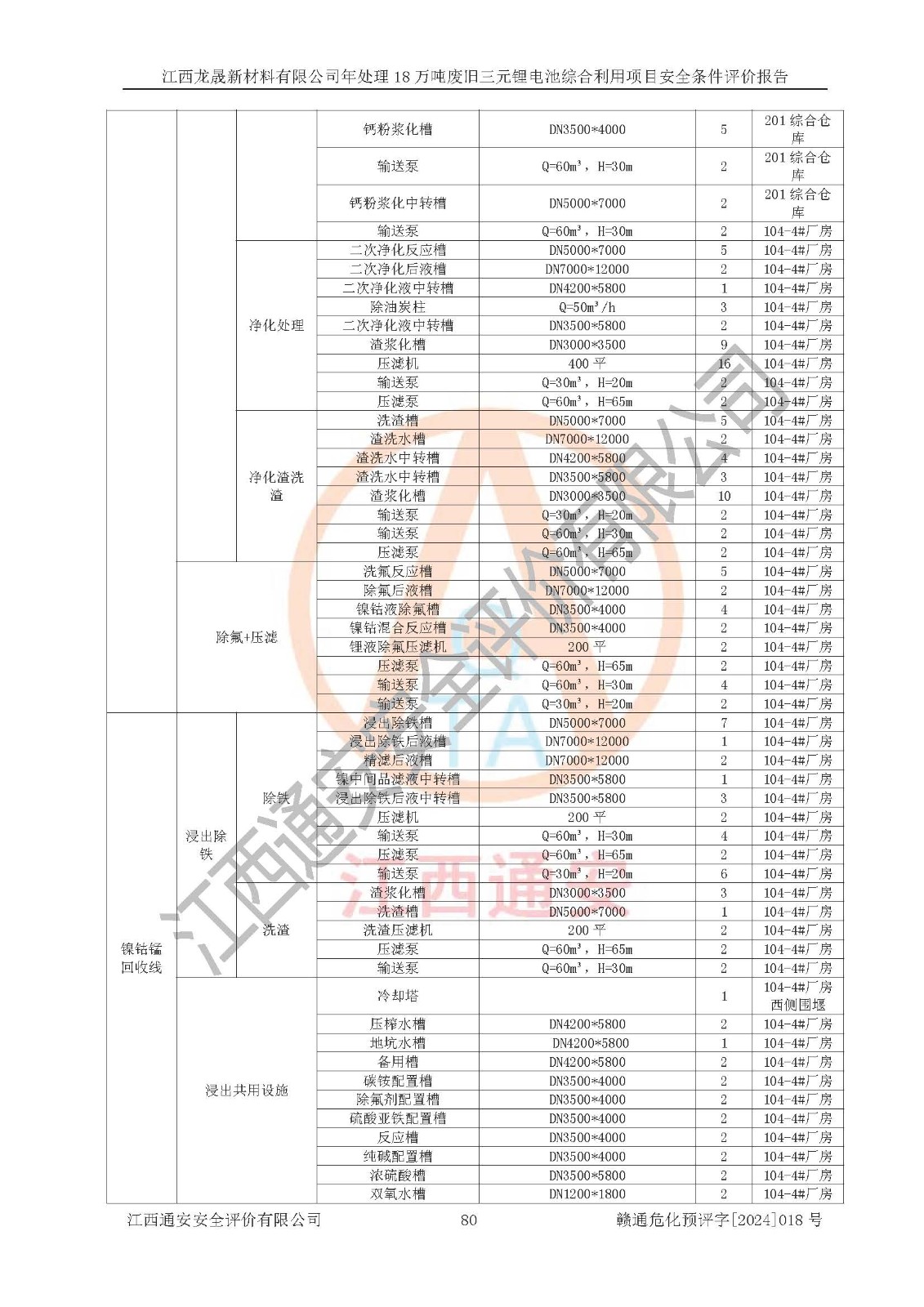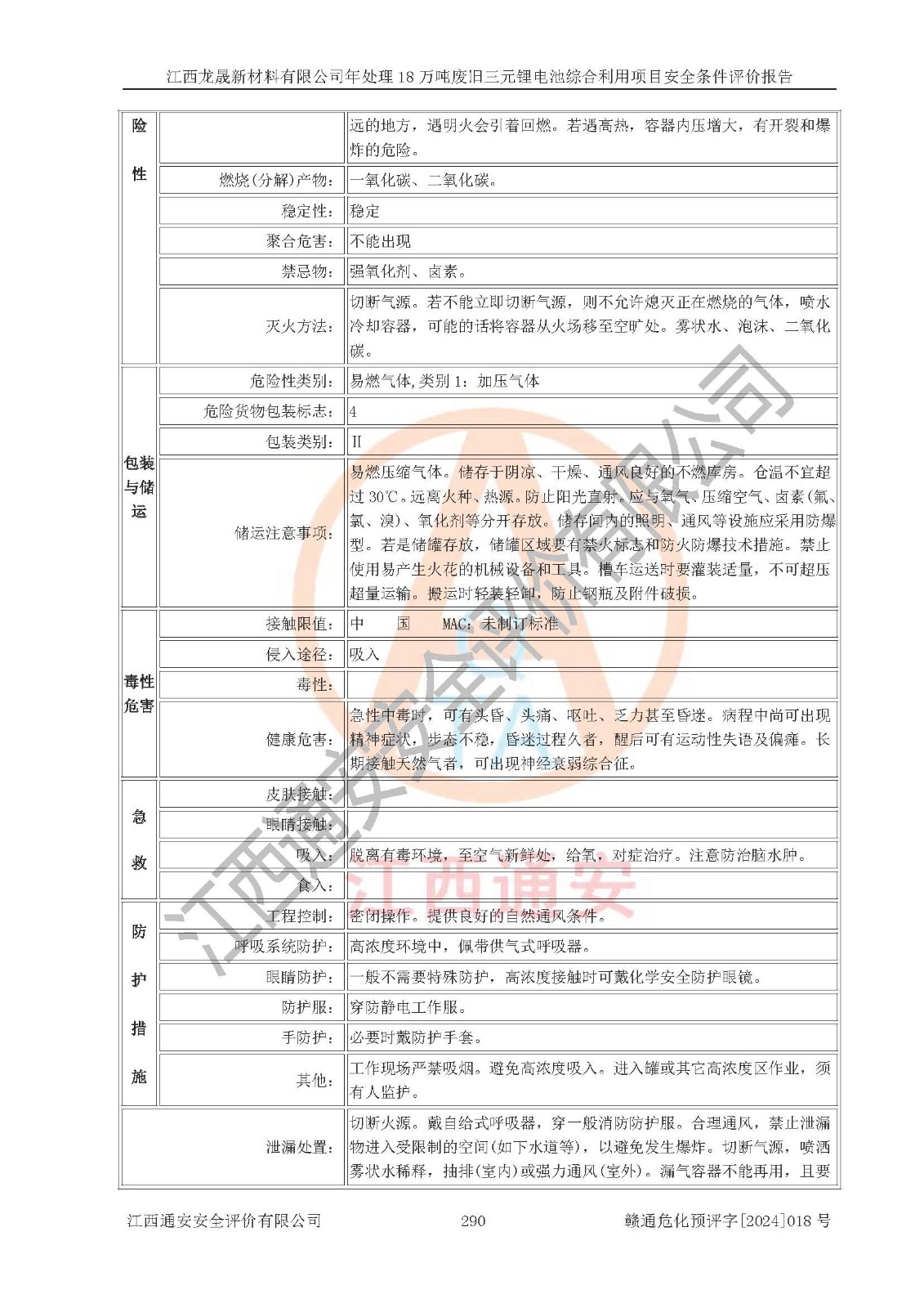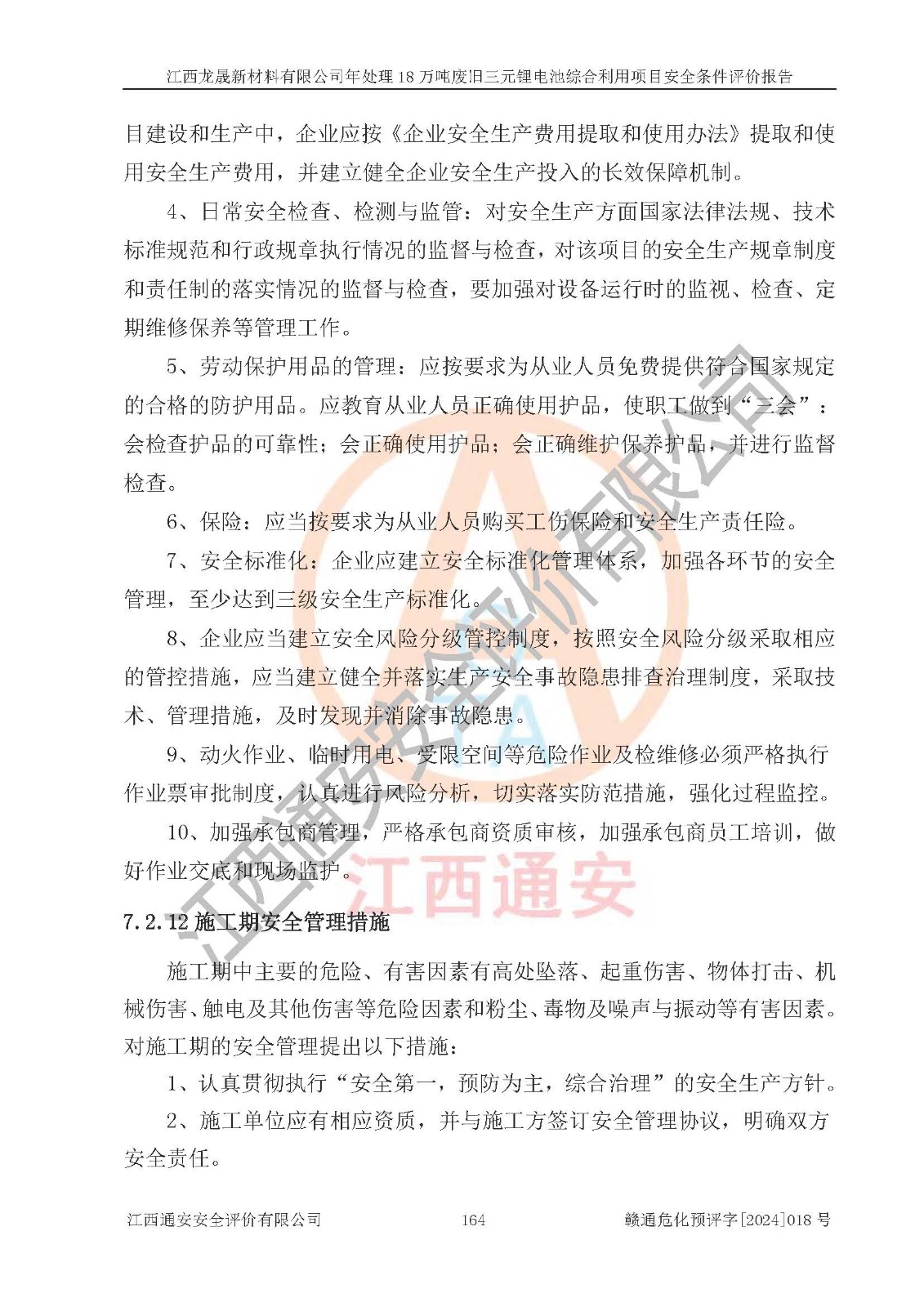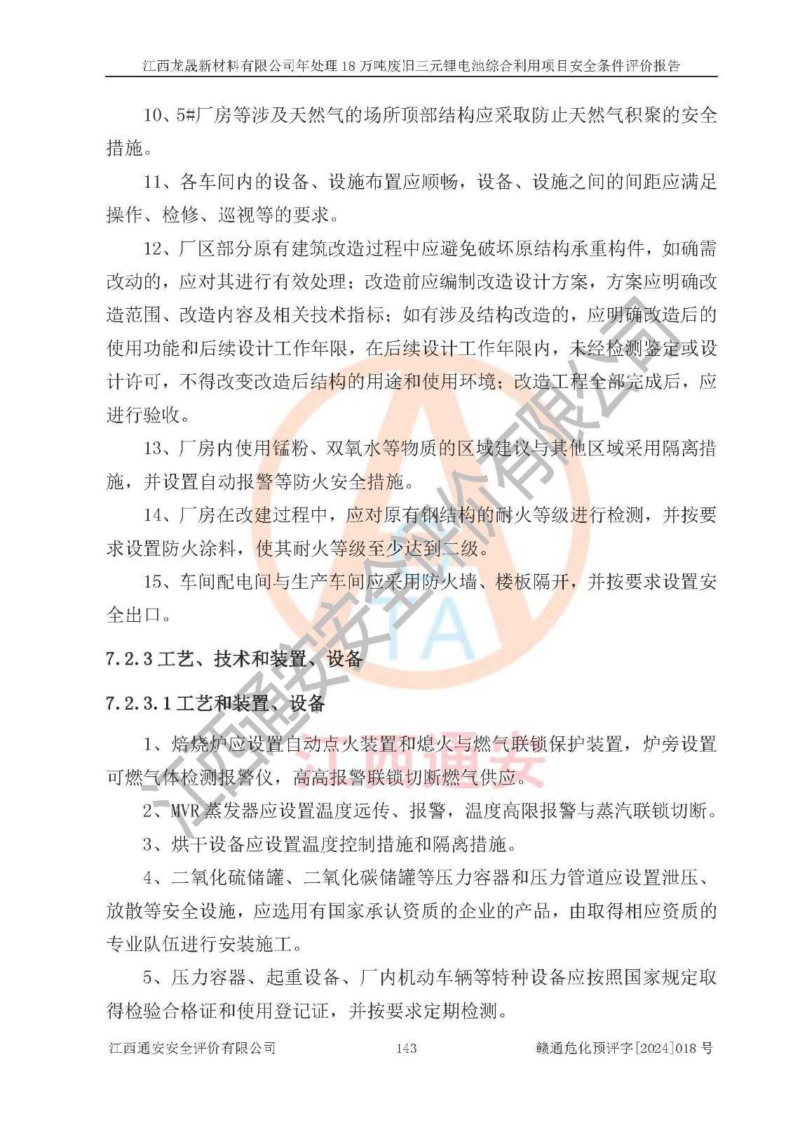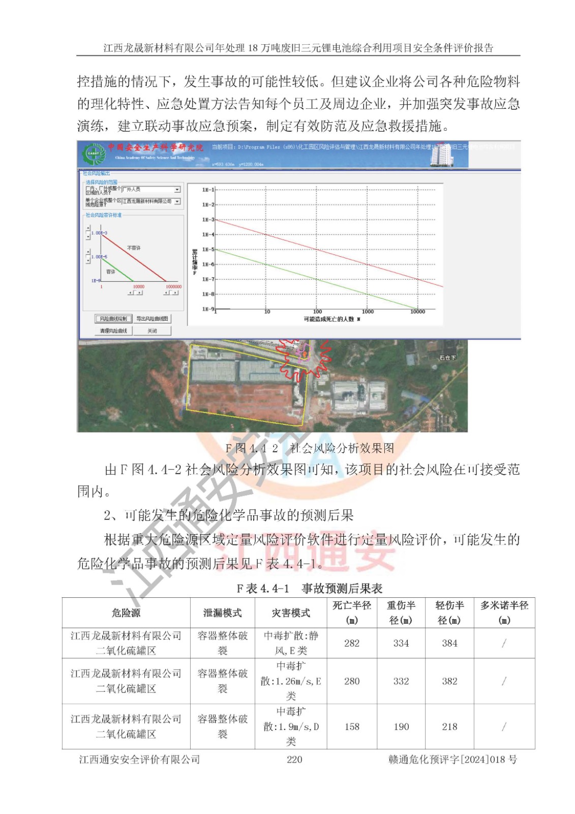 评价结论 | 江西龙晟新材料有限公司年处理18万吨废旧三元锂电池综合利用项目在以后的初步设计、施工图设计和建设施工、安装调试及生产运行中,如能严格执行**有关安全生产的法律法规、规章、标准、规范,认真落实项目可行性研究报告提出的安全对策措施,并合理采纳本报告中提出的安全对策措施及建议,真正做到安全设施与主体工程同时设计、同时施工、同时投入生产和使用,则工程潜在的危险、有害因素可得到**控制,风险在**控制和可接受范围内。 | |||
