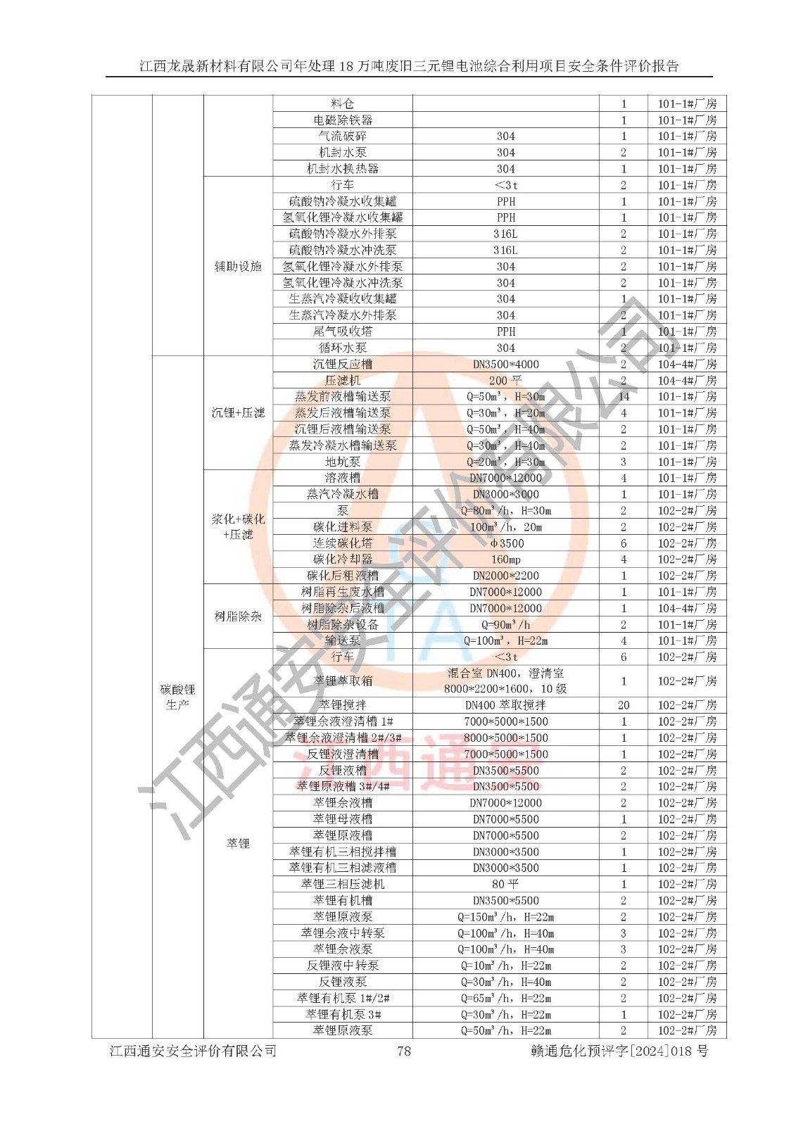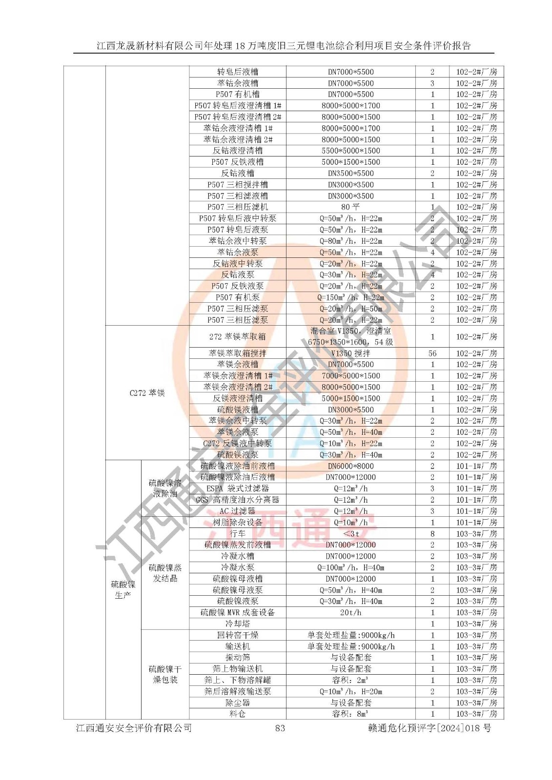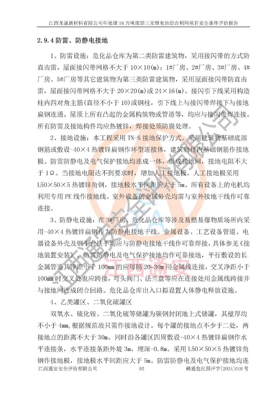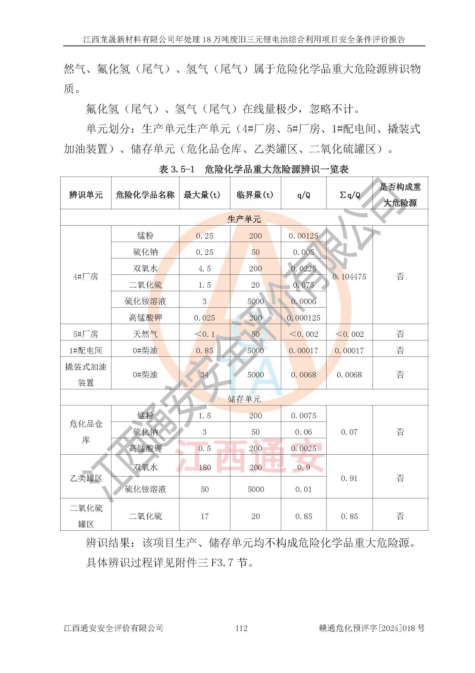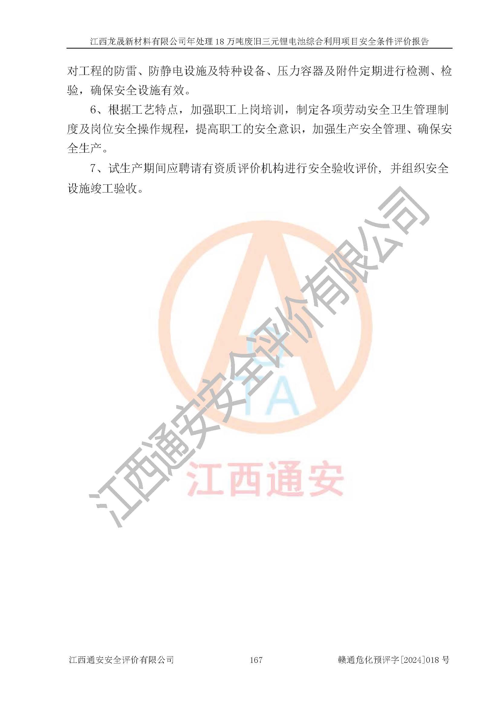 评价结论 | 江西龙晟新材料有限公司年处理18万吨废旧三元锂电池综合利用项目在以后的初步设计、施工图设计和建设施工、安装调试及生产运行中,如能严格执行**有关安全生产的法律法规、规章、标准、规范,认真落实项目可行性研究报告提出的安全对策措施,并合理采纳本报告中提出的安全对策措施及建议,真正做到安全设施与主体工程同时设计、同时施工、同时投入生产和使用,则工程潜在的危险、有害因素可得到**控制,风险在**控制和可接受范围内。 | |||