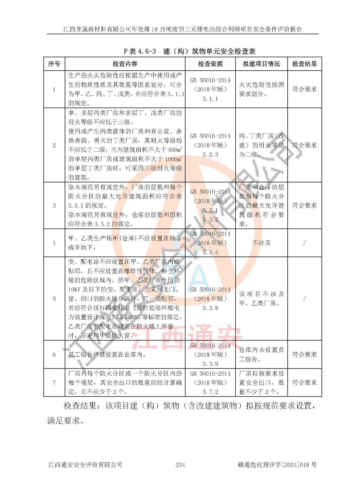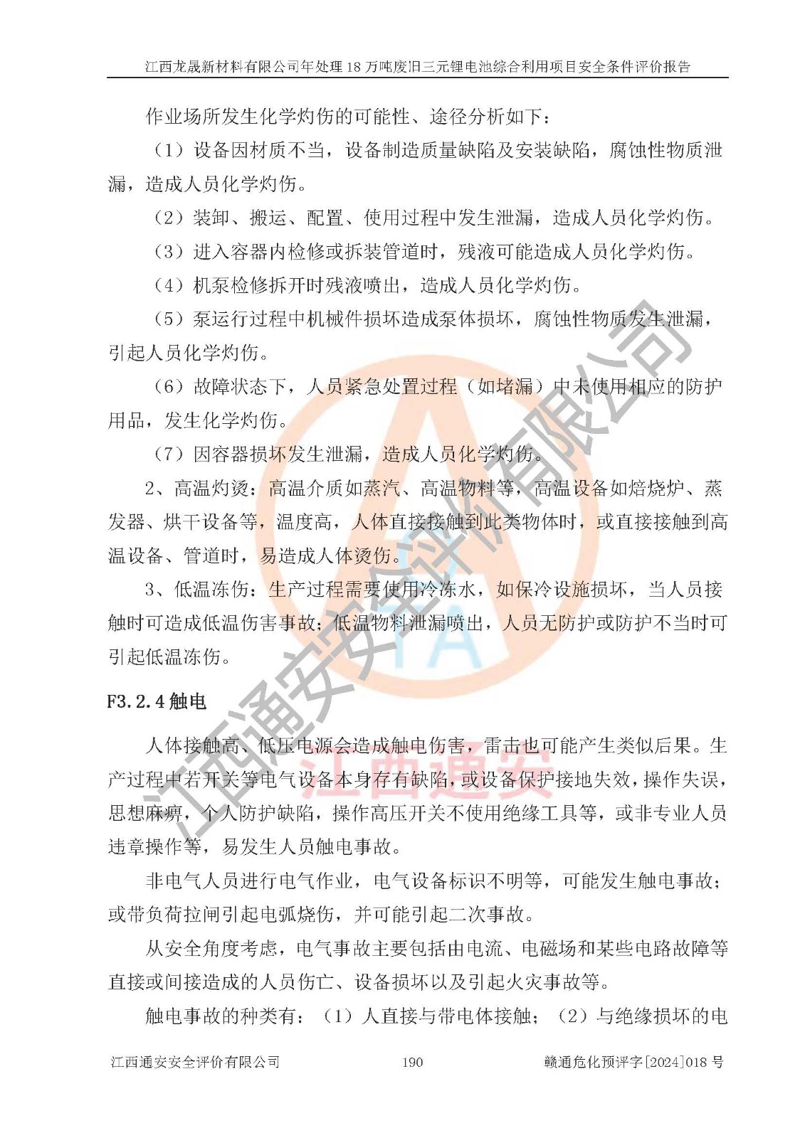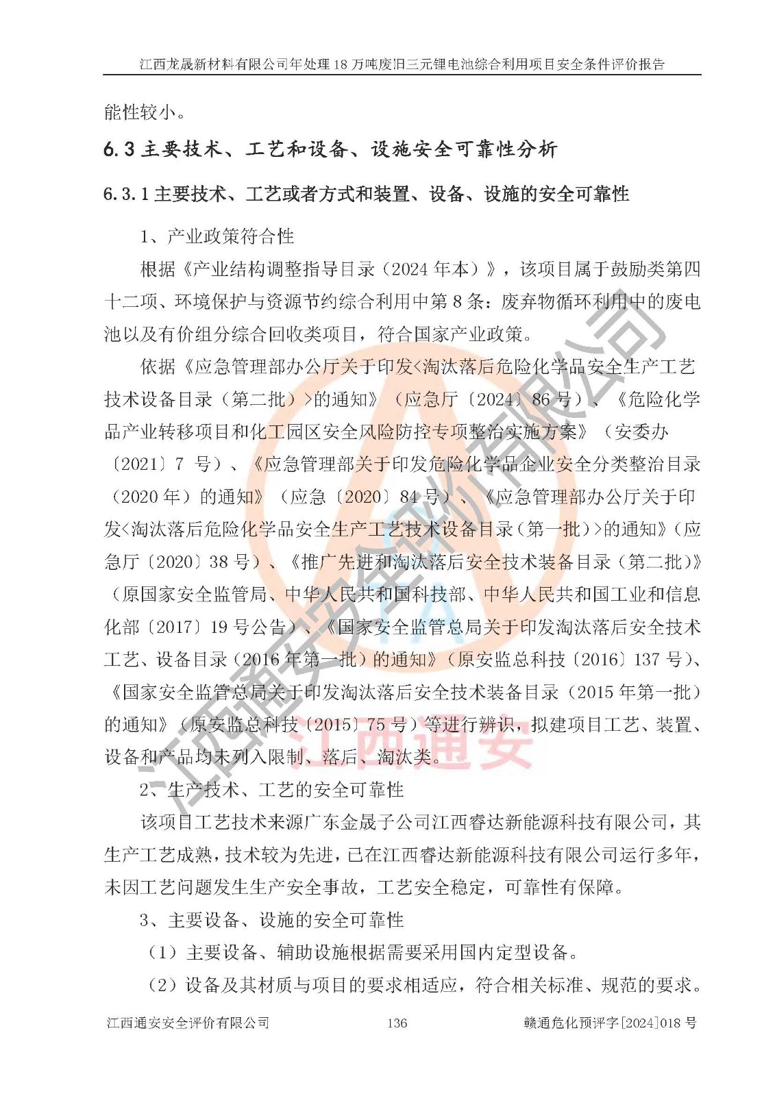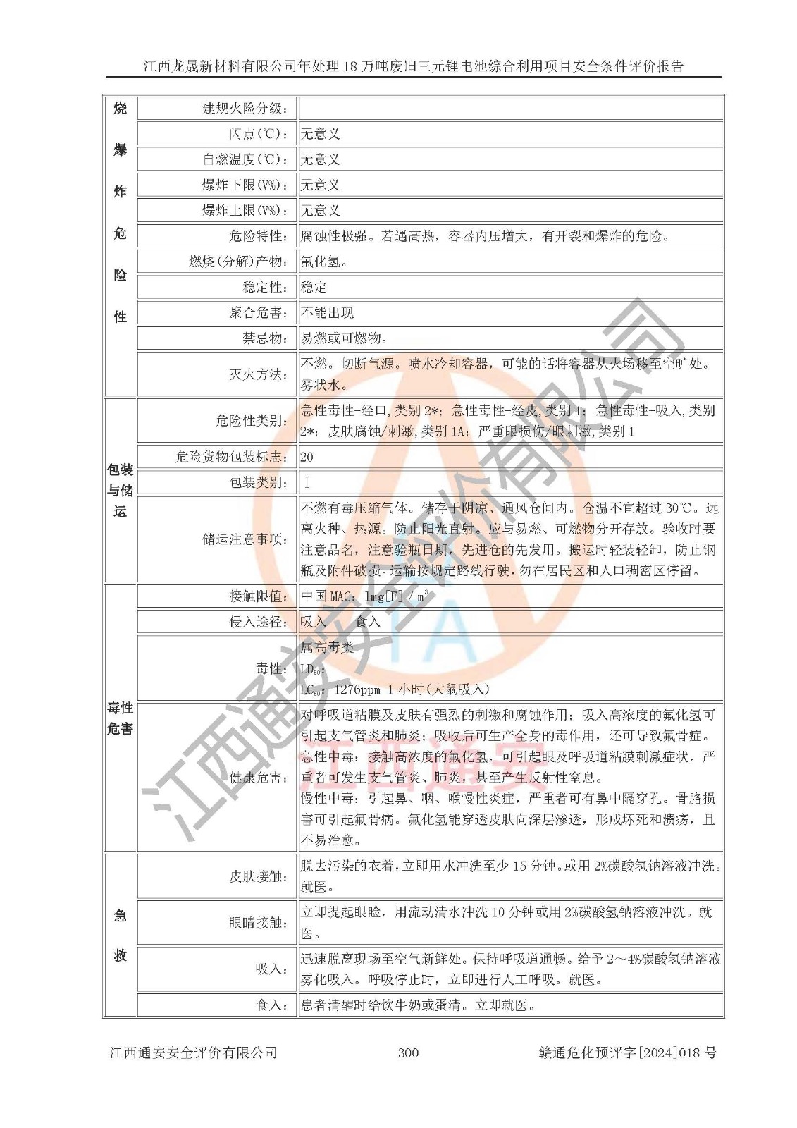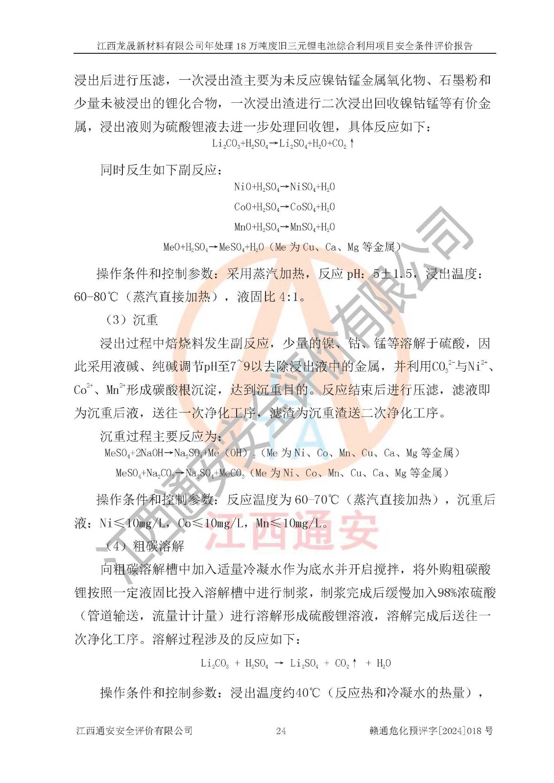 评价结论 | 江西龙晟新材料有限公司年处理18万吨废旧三元锂电池综合利用项目在以后的初步设计、施工图设计和建设施工、安装调试及生产运行中,如能严格执行**有关安全生产的法律法规、规章、标准、规范,认真落实项目可行性研究报告提出的安全对策措施,并合理采纳本报告中提出的安全对策措施及建议,真正做到安全设施与主体工程同时设计、同时施工、同时投入生产和使用,则工程潜在的危险、有害因素可得到**控制,风险在**控制和可接受范围内。 | |||