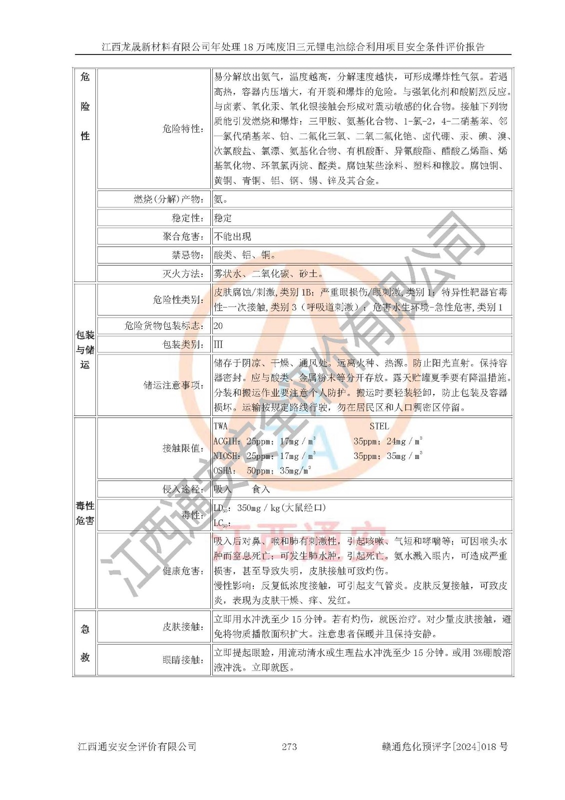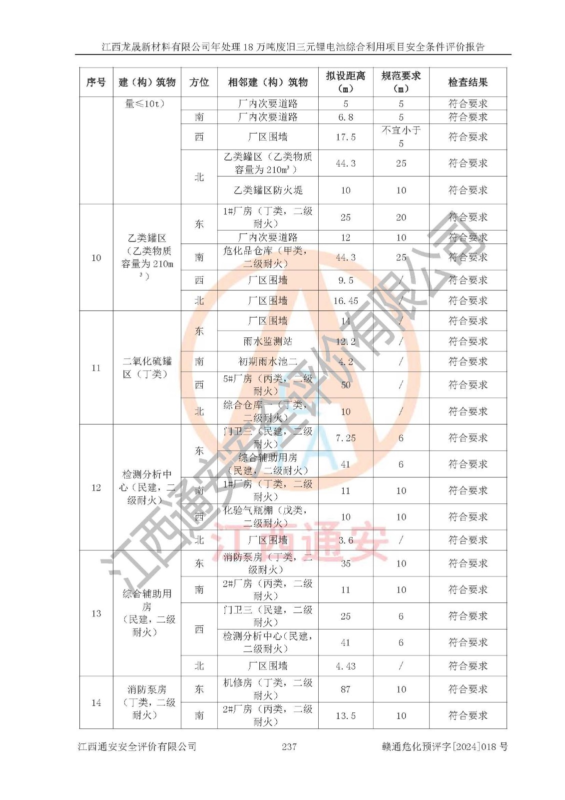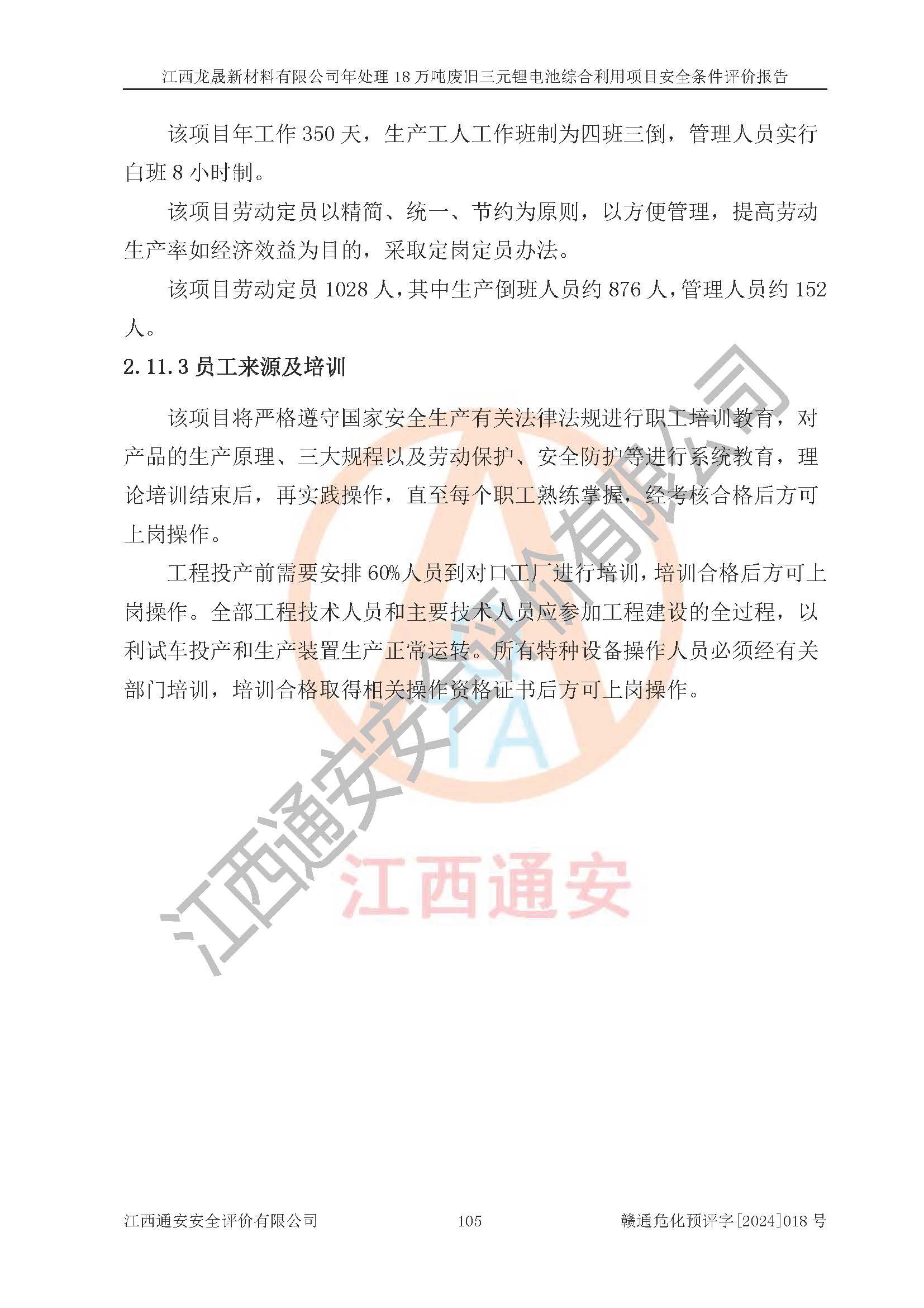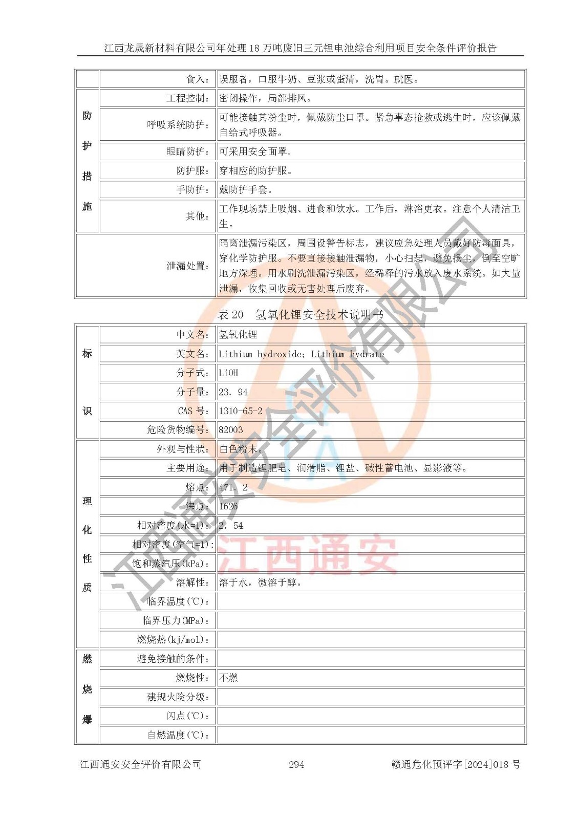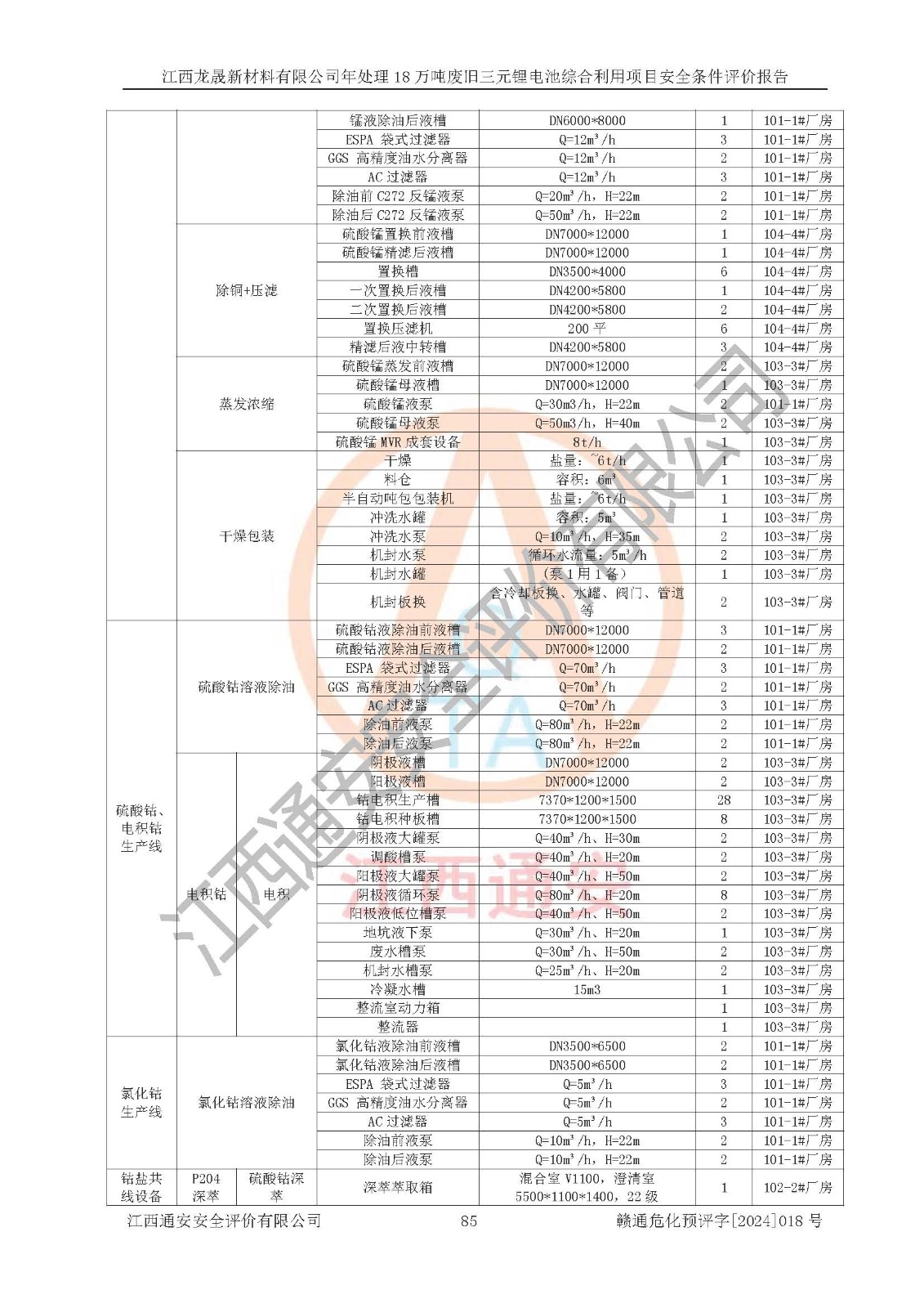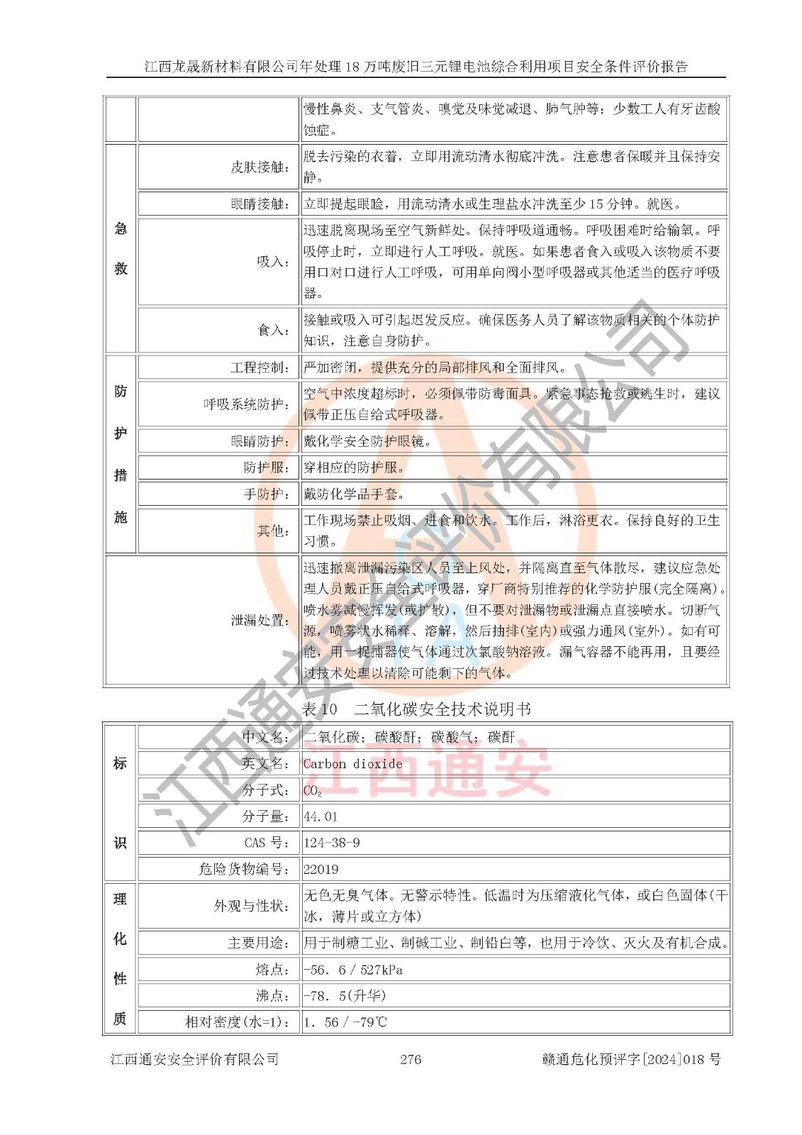 评价结论 | 江西龙晟新材料有限公司年处理18万吨废旧三元锂电池综合利用项目在以后的初步设计、施工图设计和建设施工、安装调试及生产运行中,如能严格执行**有关安全生产的法律法规、规章、标准、规范,认真落实项目可行性研究报告提出的安全对策措施,并合理采纳本报告中提出的安全对策措施及建议,真正做到安全设施与主体工程同时设计、同时施工、同时投入生产和使用,则工程潜在的危险、有害因素可得到**控制,风险在**控制和可接受范围内。 | |||