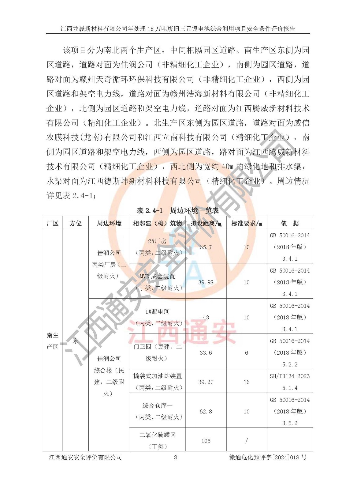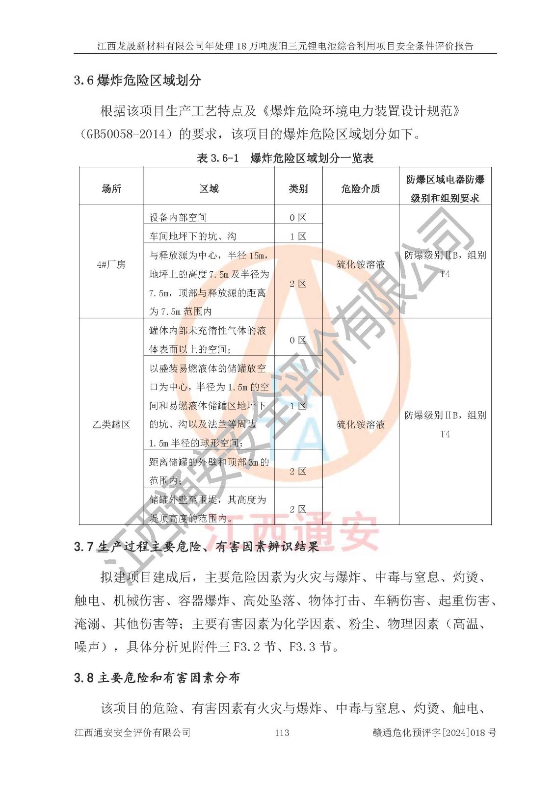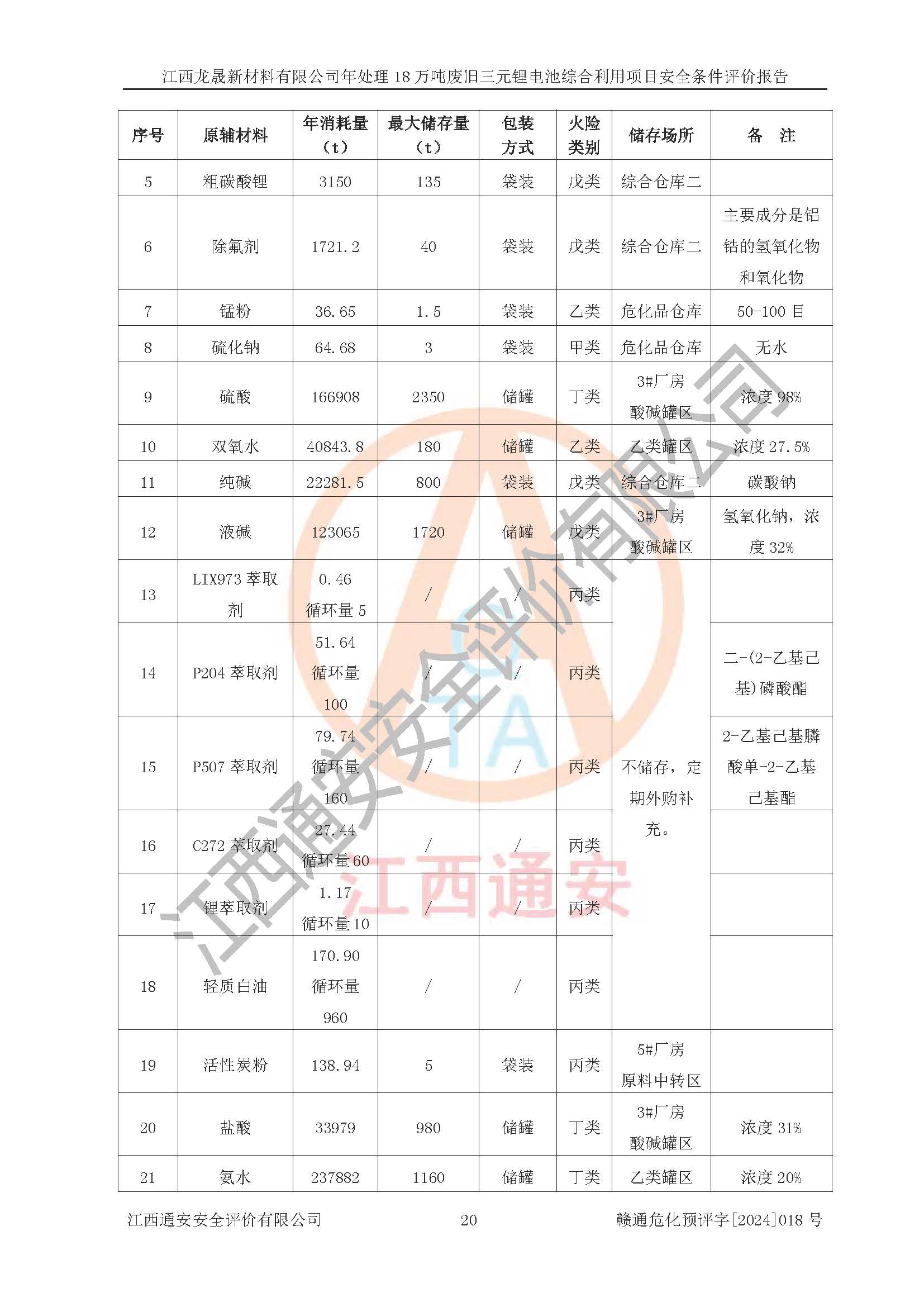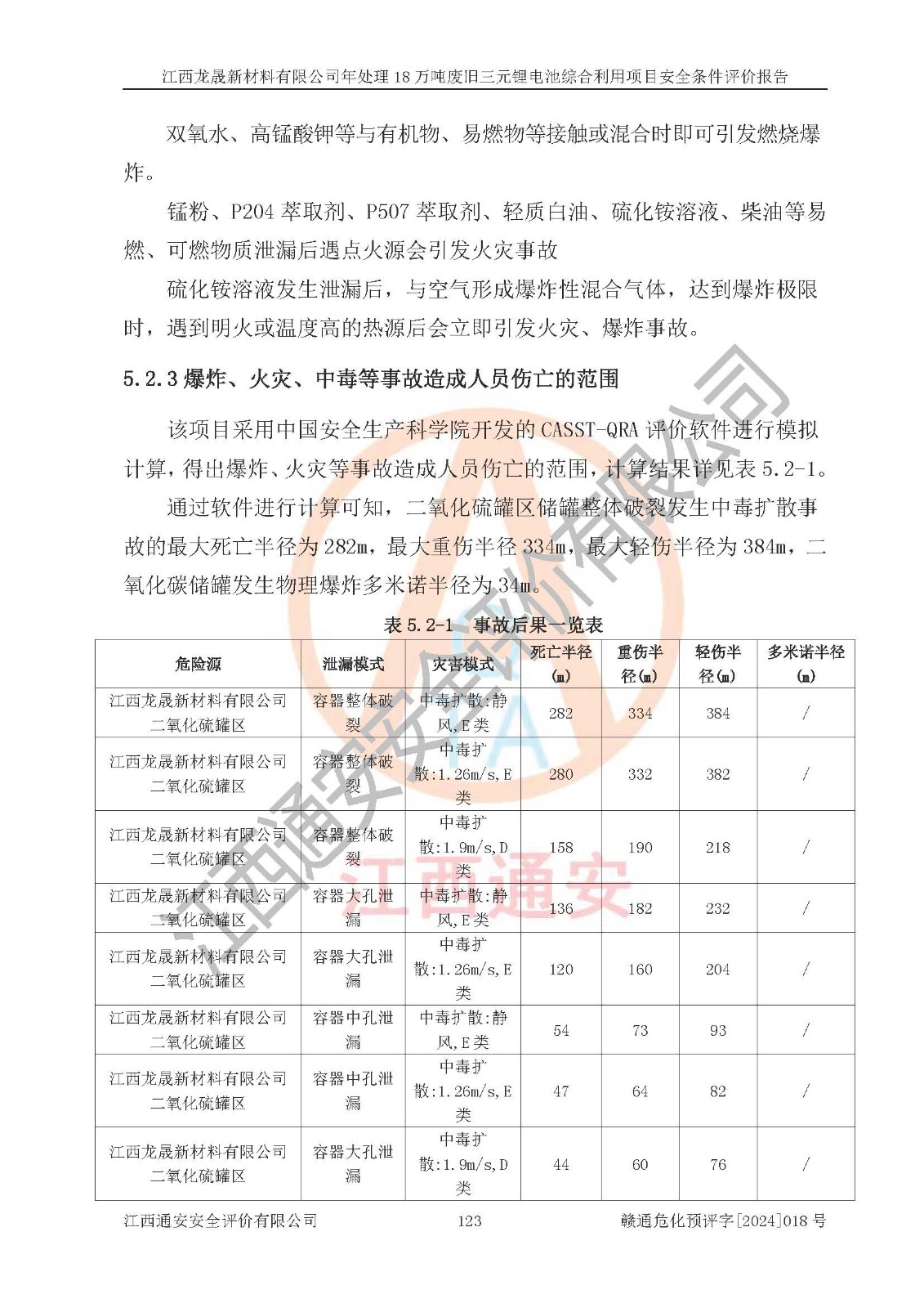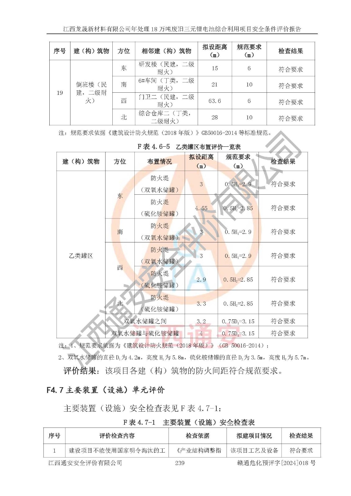 评价结论 | 江西龙晟新材料有限公司年处理18万吨废旧三元锂电池综合利用项目在以后的初步设计、施工图设计和建设施工、安装调试及生产运行中,如能严格执行**有关安全生产的法律法规、规章、标准、规范,认真落实项目可行性研究报告提出的安全对策措施,并合理采纳本报告中提出的安全对策措施及建议,真正做到安全设施与主体工程同时设计、同时施工、同时投入生产和使用,则工程潜在的危险、有害因素可得到**控制,风险在**控制和可接受范围内。 | |||