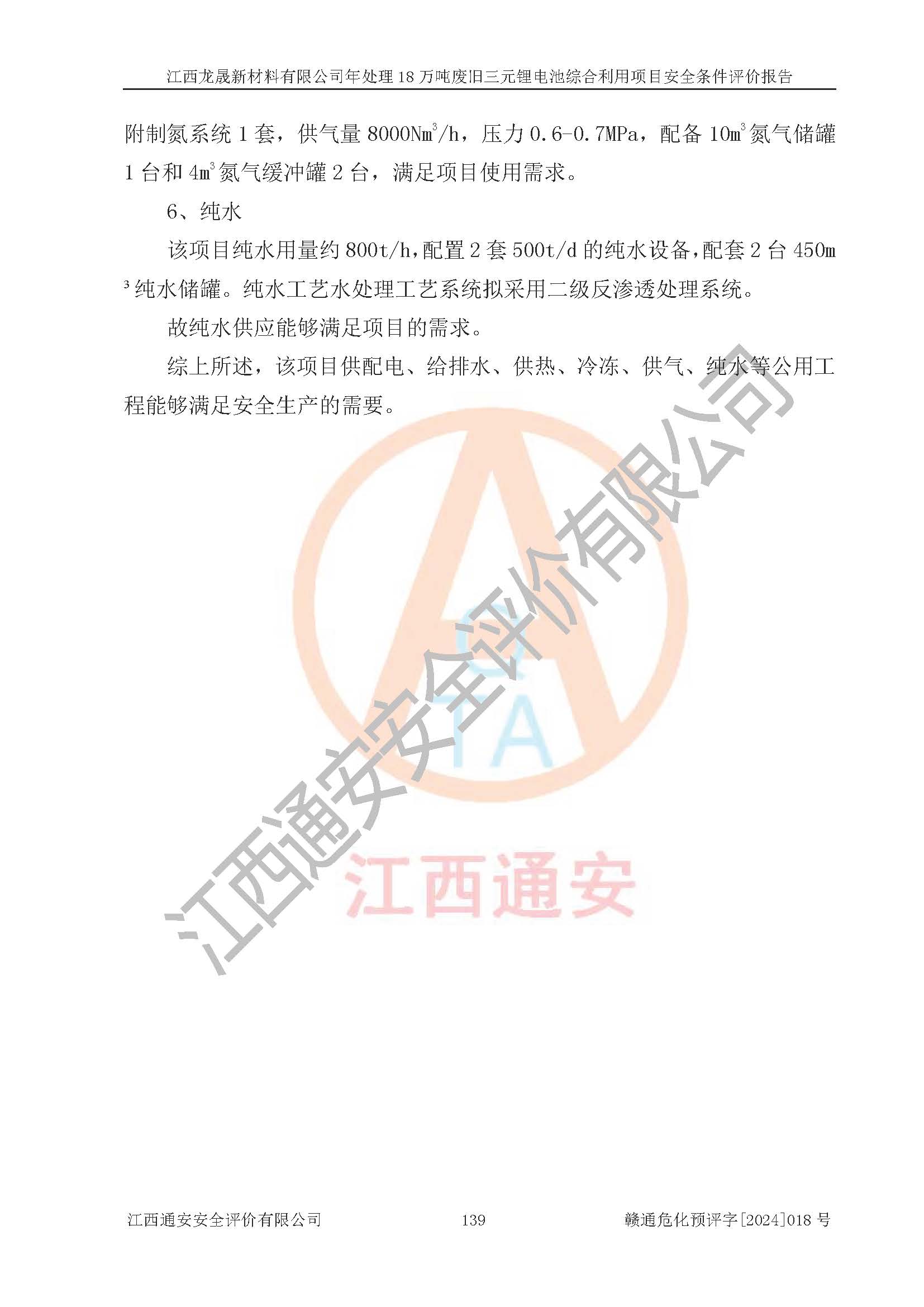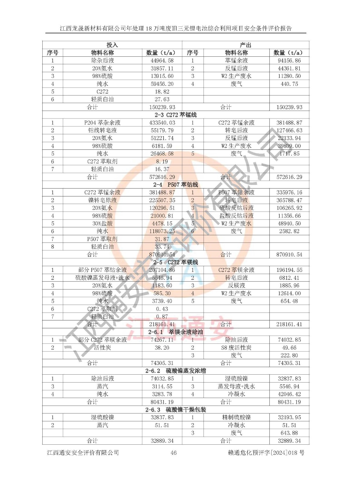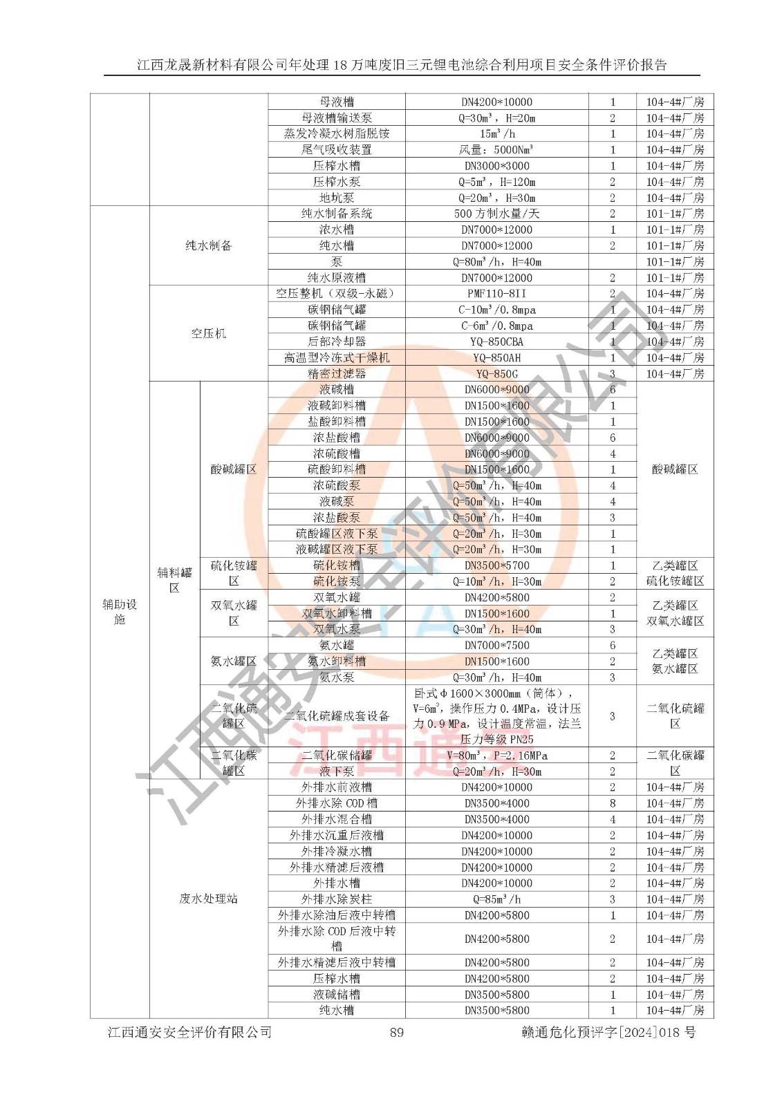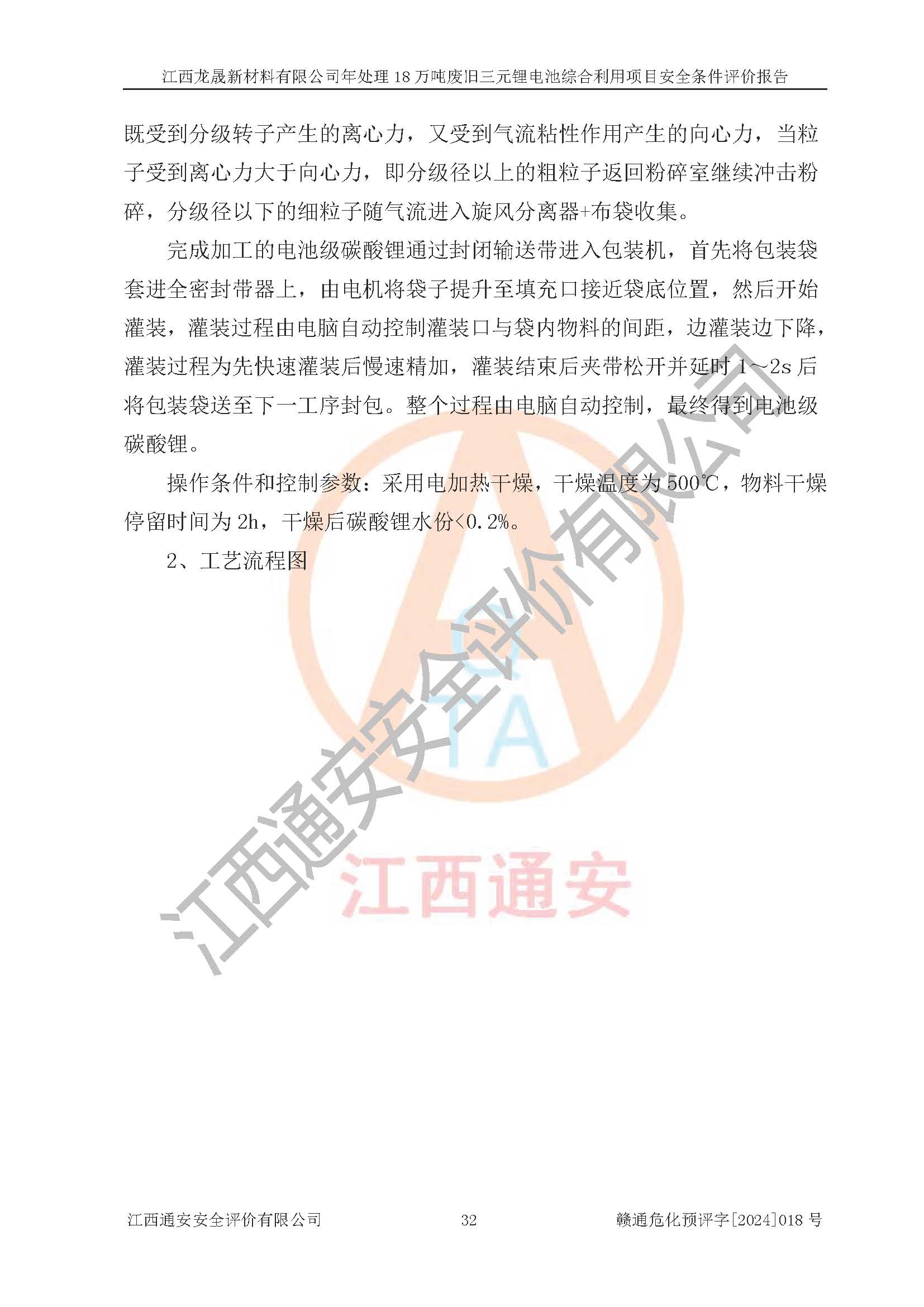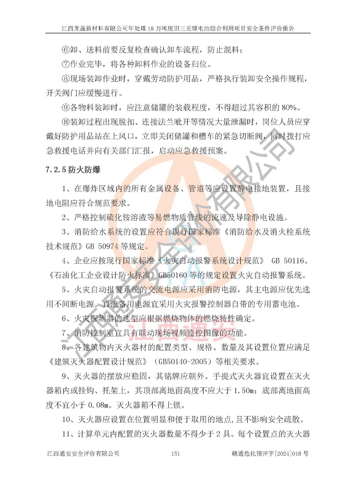 评价结论 | 江西龙晟新材料有限公司年处理18万吨废旧三元锂电池综合利用项目在以后的初步设计、施工图设计和建设施工、安装调试及生产运行中,如能严格执行**有关安全生产的法律法规、规章、标准、规范,认真落实项目可行性研究报告提出的安全对策措施,并合理采纳本报告中提出的安全对策措施及建议,真正做到安全设施与主体工程同时设计、同时施工、同时投入生产和使用,则工程潜在的危险、有害因素可得到**控制,风险在**控制和可接受范围内。 | |||