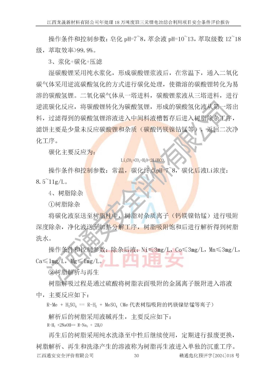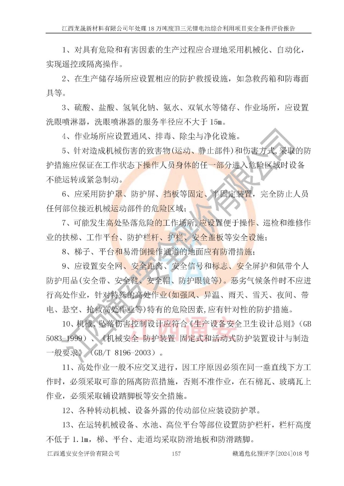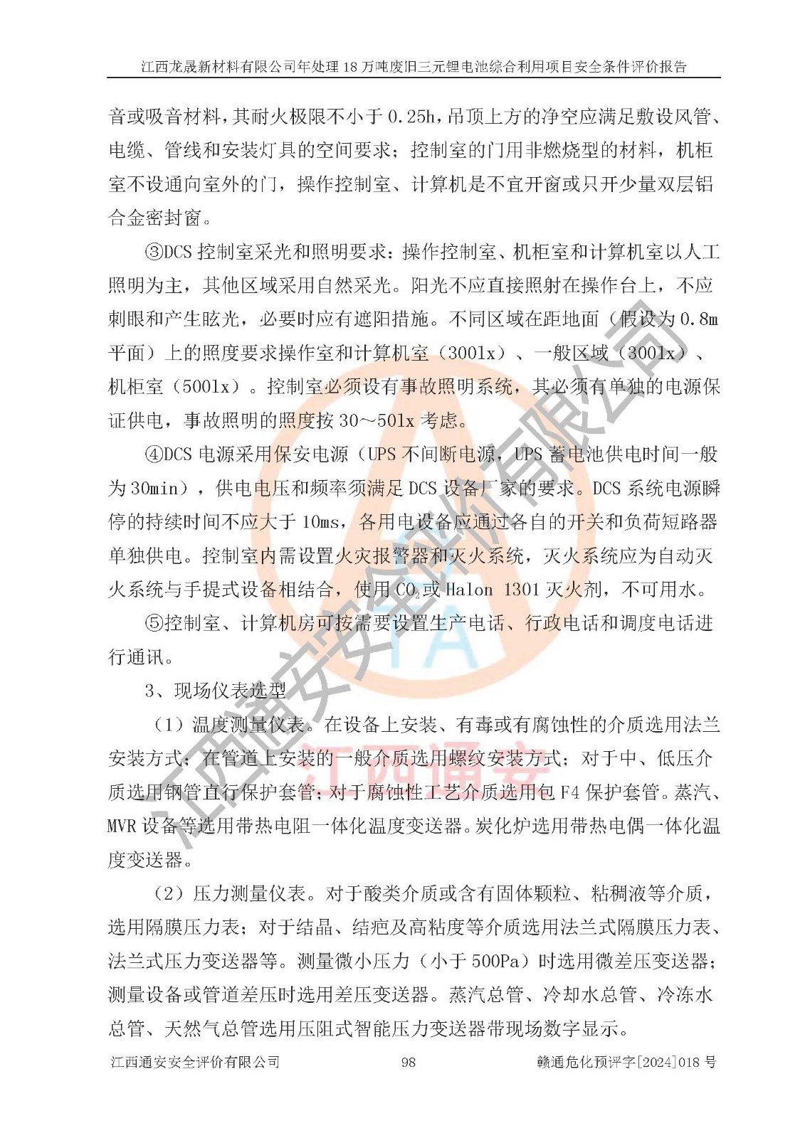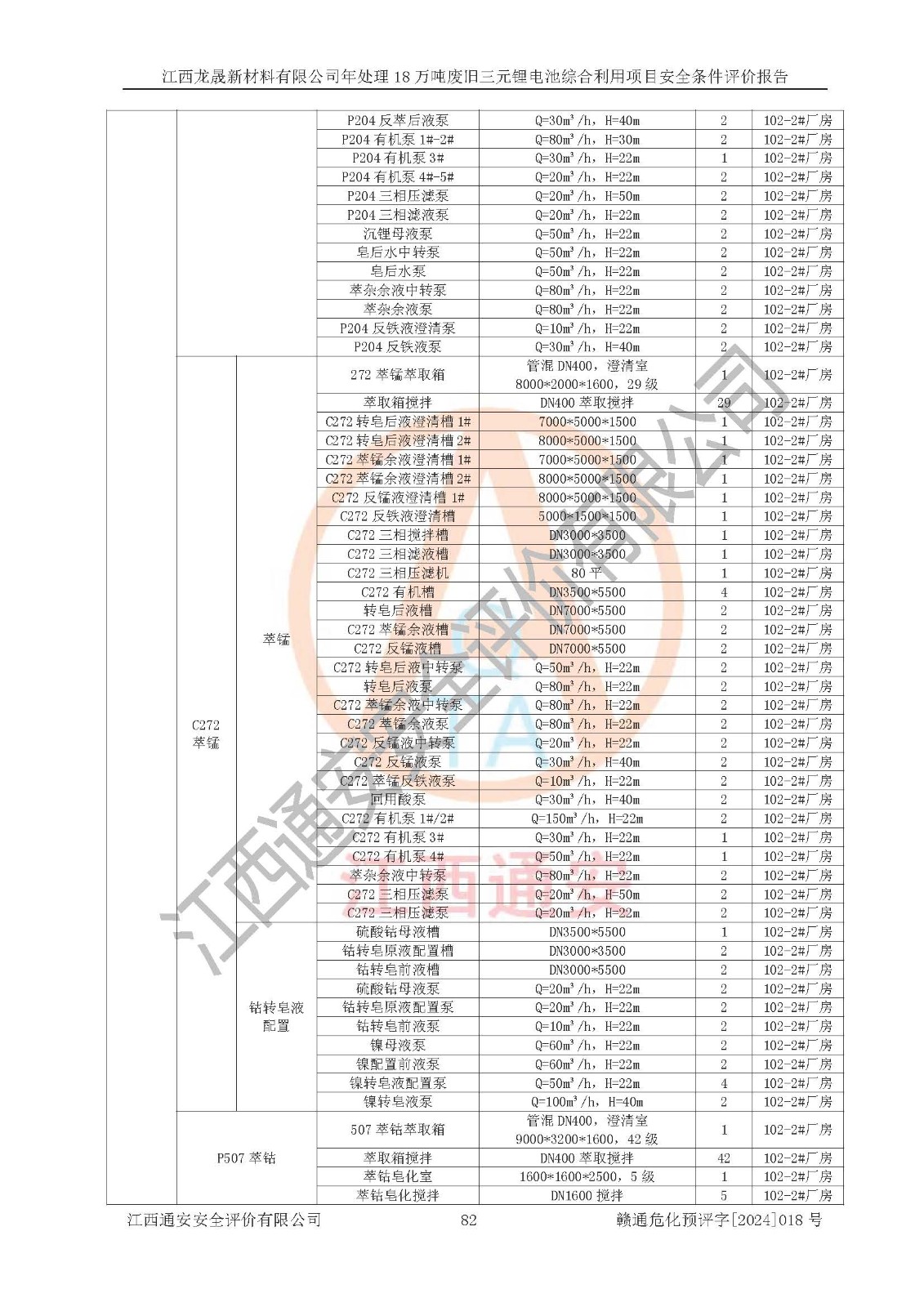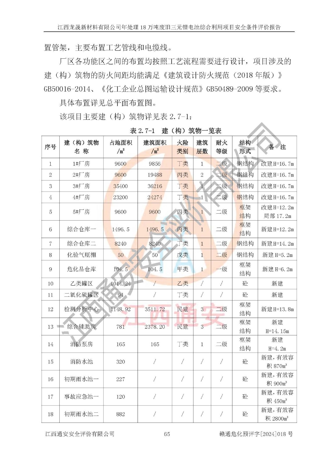 评价结论 | 江西龙晟新材料有限公司年处理18万吨废旧三元锂电池综合利用项目在以后的初步设计、施工图设计和建设施工、安装调试及生产运行中,如能严格执行**有关安全生产的法律法规、规章、标准、规范,认真落实项目可行性研究报告提出的安全对策措施,并合理采纳本报告中提出的安全对策措施及建议,真正做到安全设施与主体工程同时设计、同时施工、同时投入生产和使用,则工程潜在的危险、有害因素可得到**控制,风险在**控制和可接受范围内。 | |||