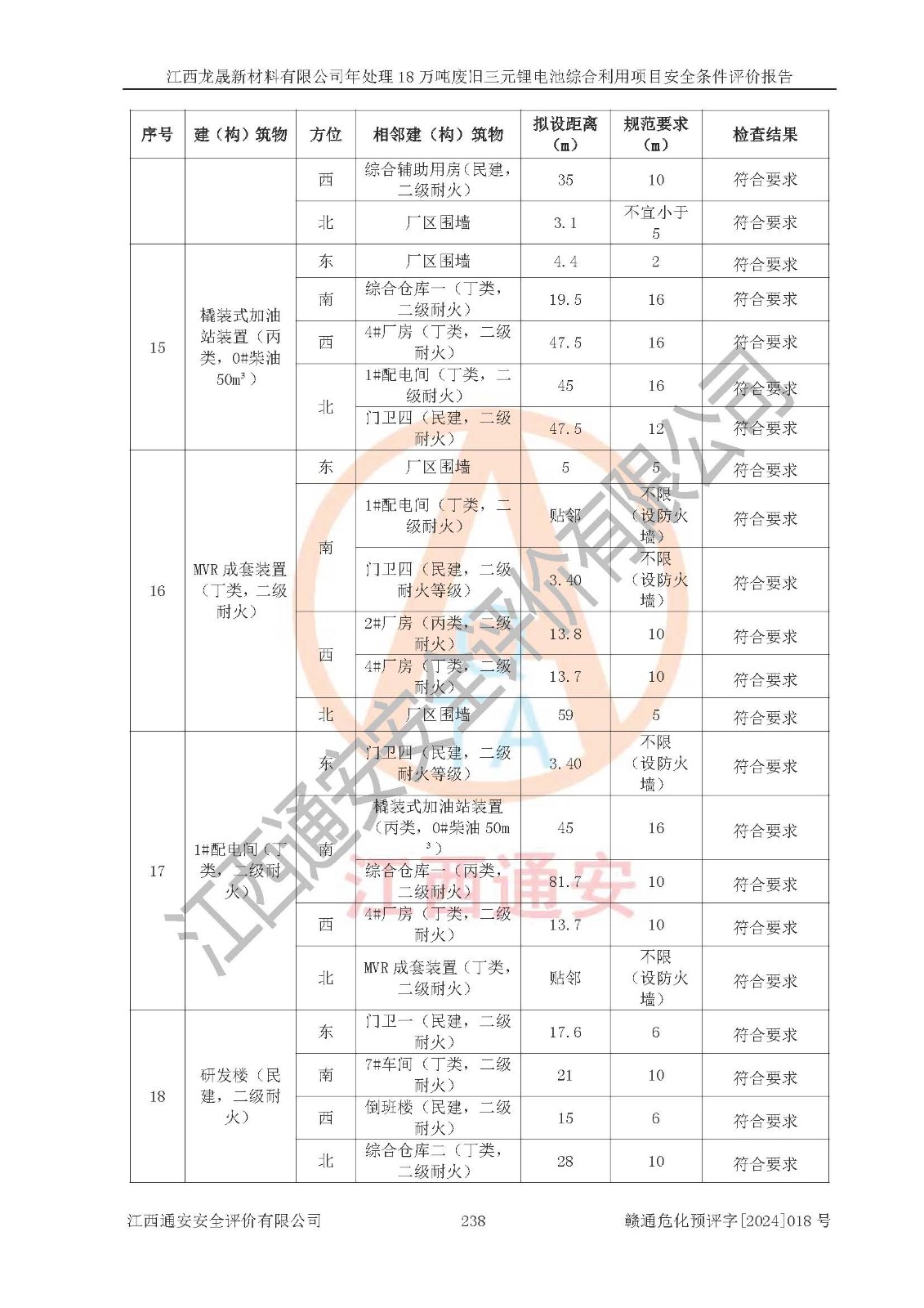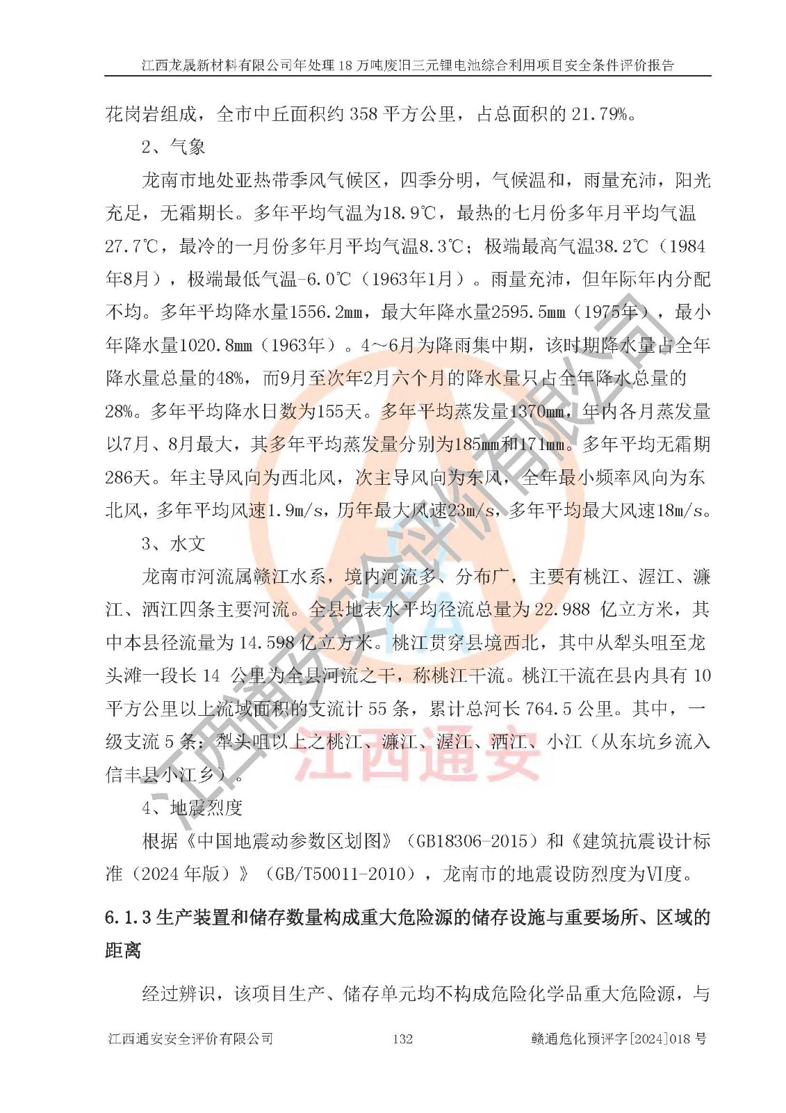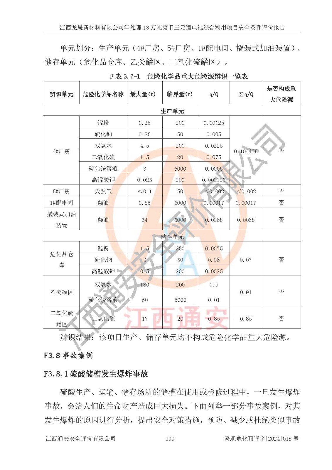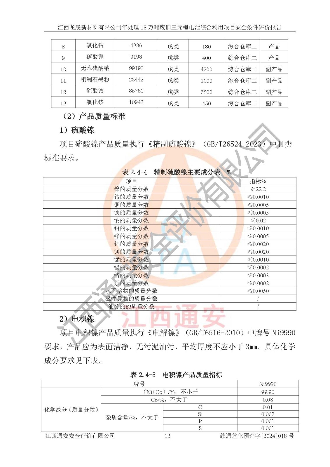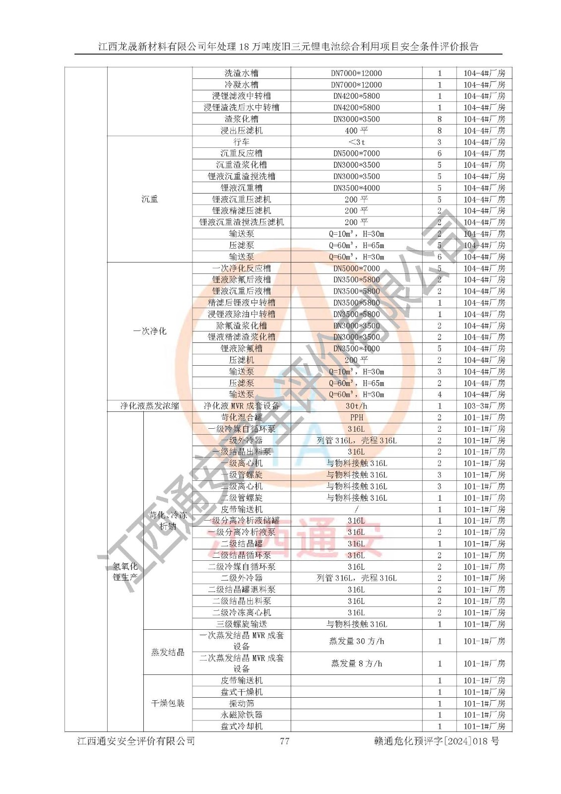 评价结论 | 江西龙晟新材料有限公司年处理18万吨废旧三元锂电池综合利用项目在以后的初步设计、施工图设计和建设施工、安装调试及生产运行中,如能严格执行**有关安全生产的法律法规、规章、标准、规范,认真落实项目可行性研究报告提出的安全对策措施,并合理采纳本报告中提出的安全对策措施及建议,真正做到安全设施与主体工程同时设计、同时施工、同时投入生产和使用,则工程潜在的危险、有害因素可得到**控制,风险在**控制和可接受范围内。 | |||