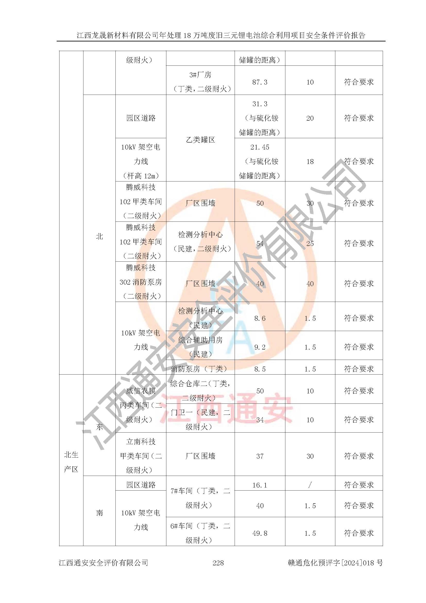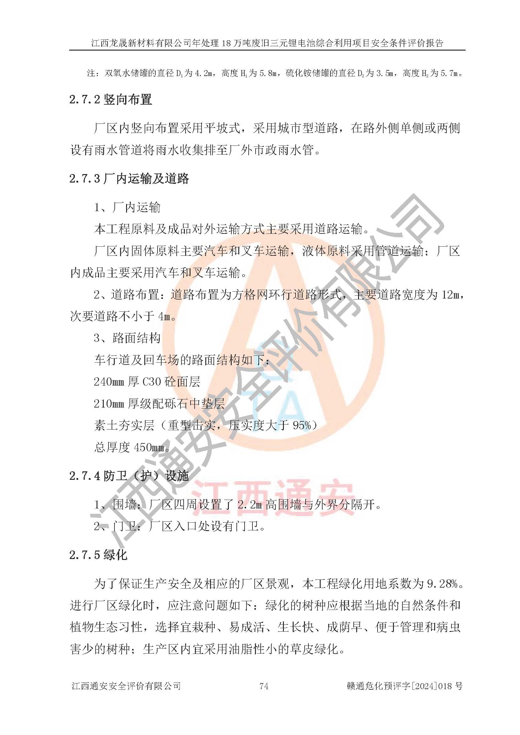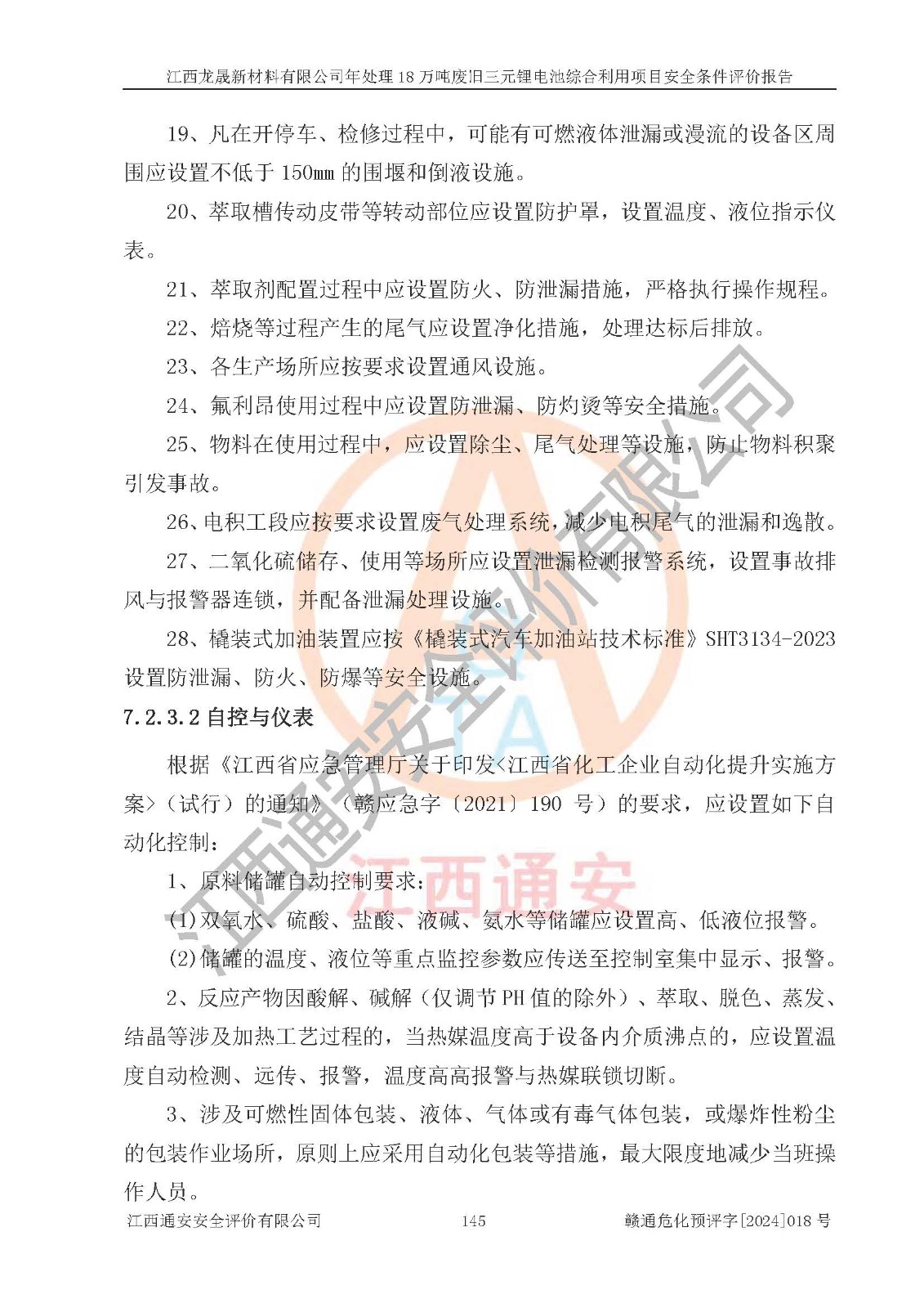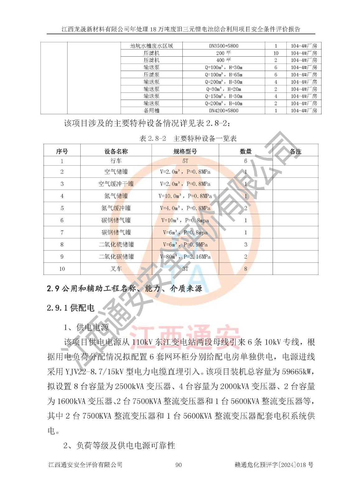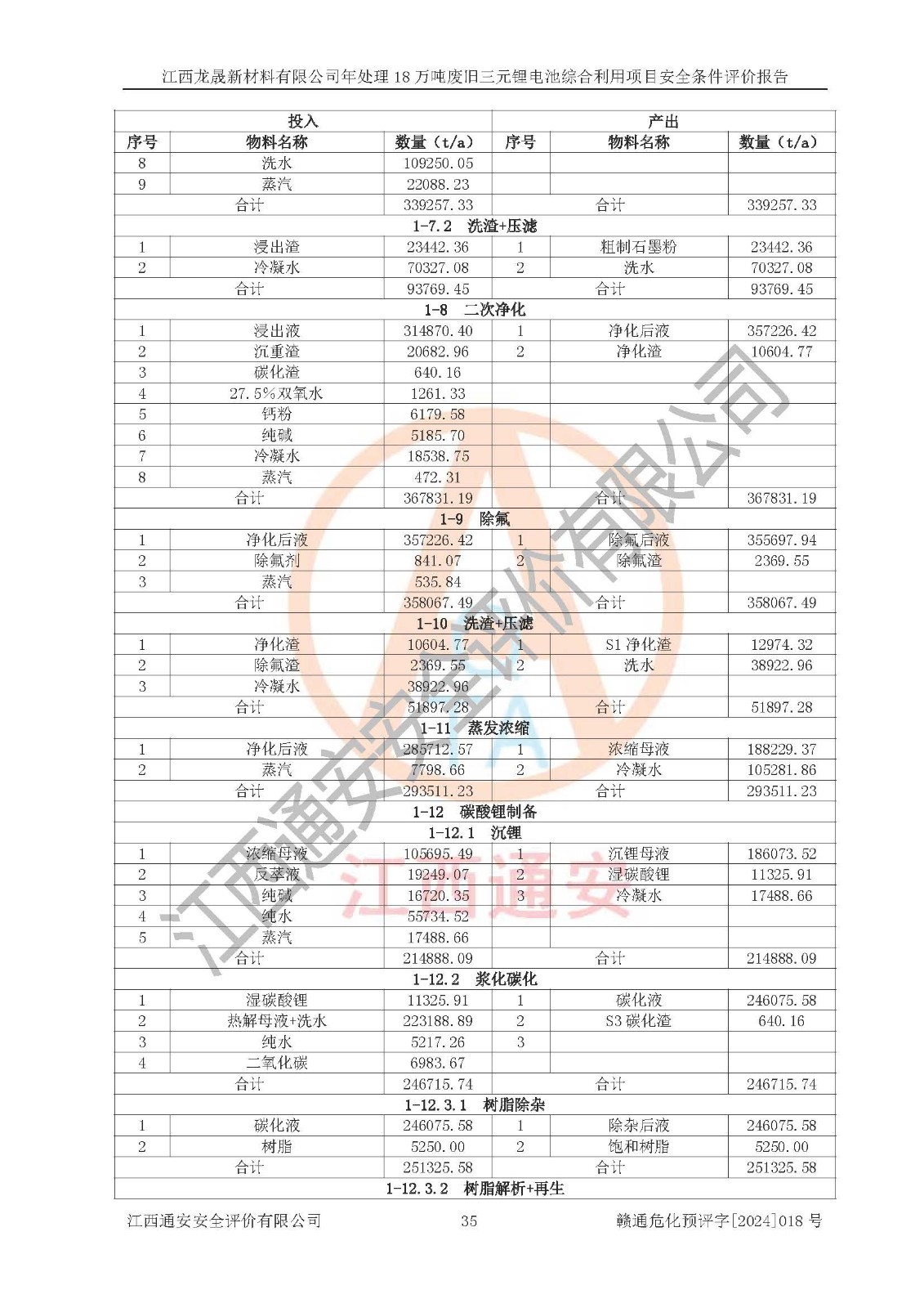 评价结论 | 江西龙晟新材料有限公司年处理18万吨废旧三元锂电池综合利用项目在以后的初步设计、施工图设计和建设施工、安装调试及生产运行中,如能严格执行**有关安全生产的法律法规、规章、标准、规范,认真落实项目可行性研究报告提出的安全对策措施,并合理采纳本报告中提出的安全对策措施及建议,真正做到安全设施与主体工程同时设计、同时施工、同时投入生产和使用,则工程潜在的危险、有害因素可得到**控制,风险在**控制和可接受范围内。 | |||